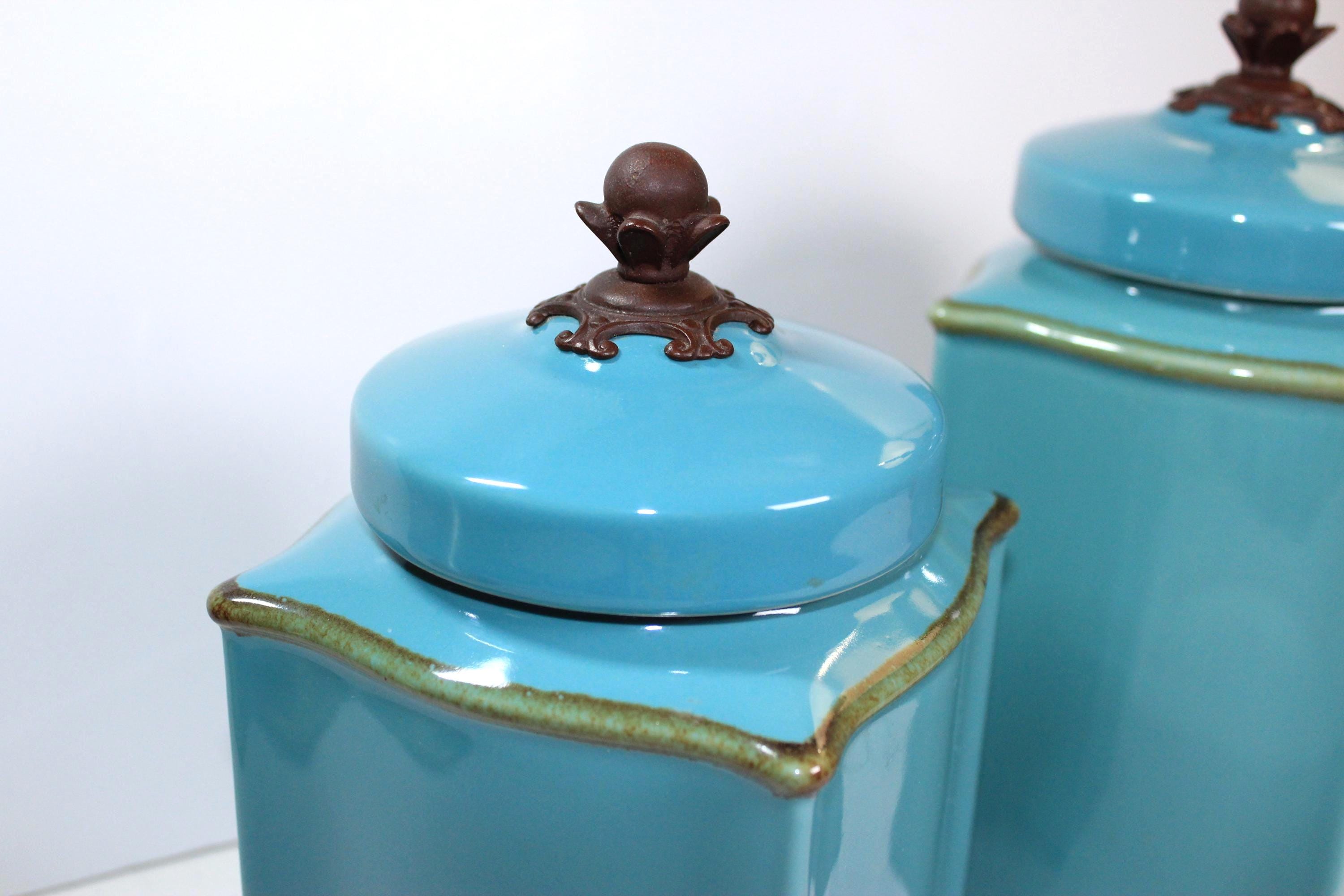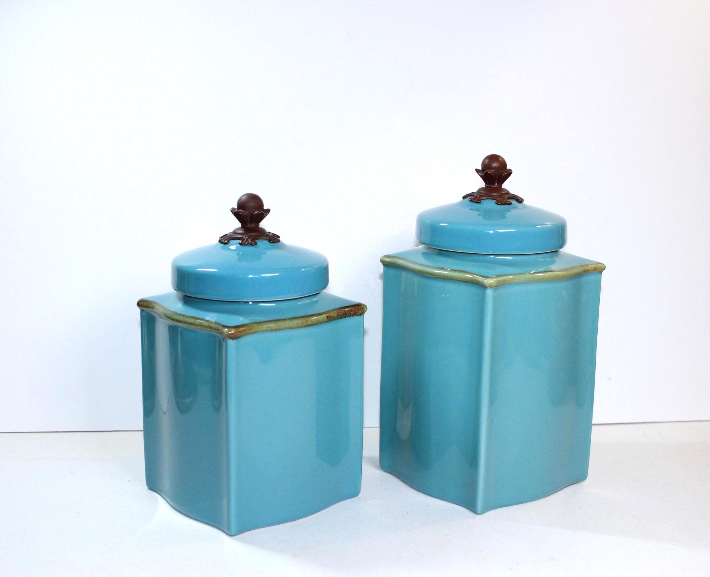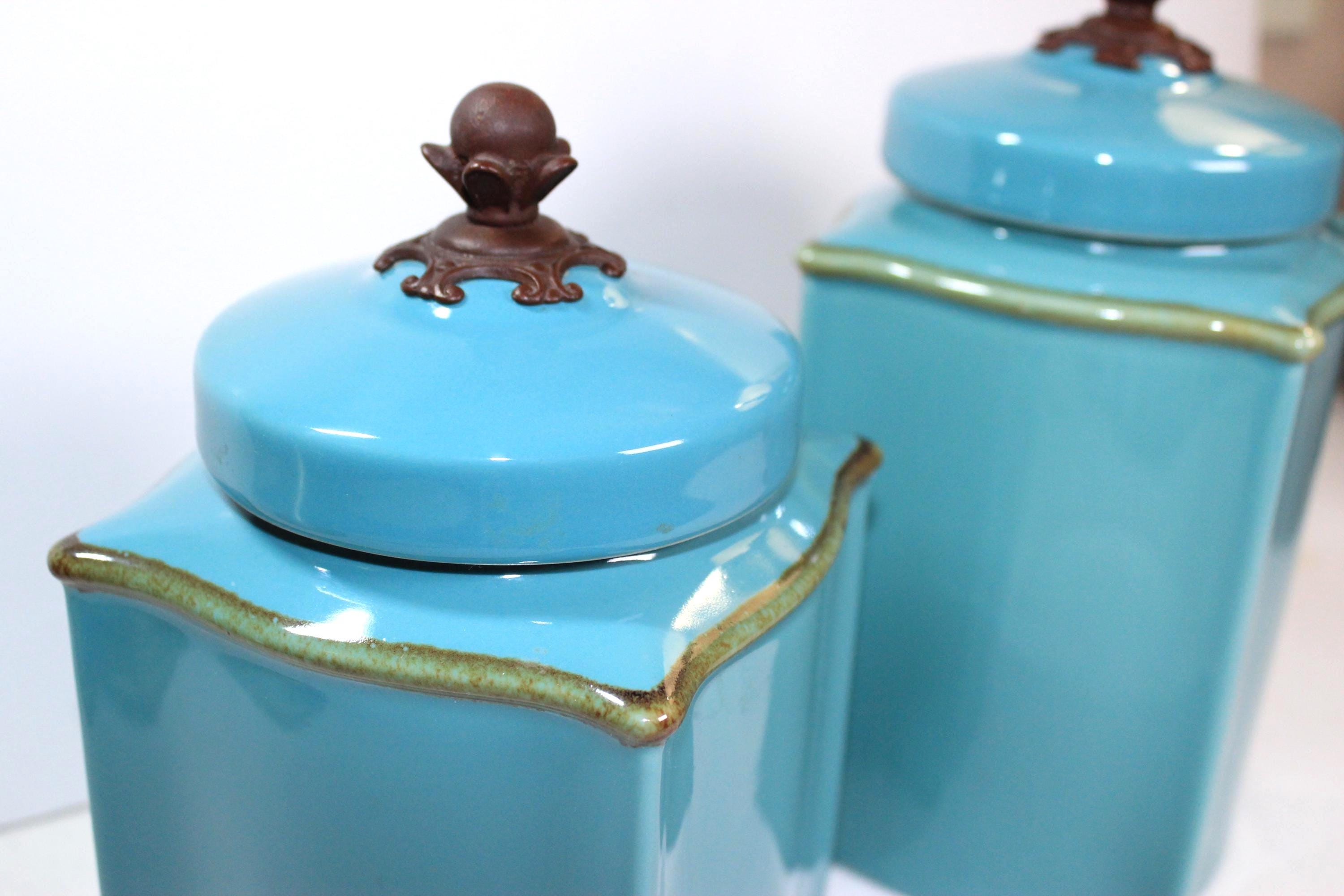 Crafted in Brazil Italy these canisters are in excellent vintage condition. They are in a very desirable color, Robins Egg Blue, in the fun Tuscan Toscana design collection, which is square but a bit curvy too. See photos to appreciate! Each canister is topped with a bronze knob and has rubber seal to keep items fresh. These are stand alone gorgeous but also quite functional.