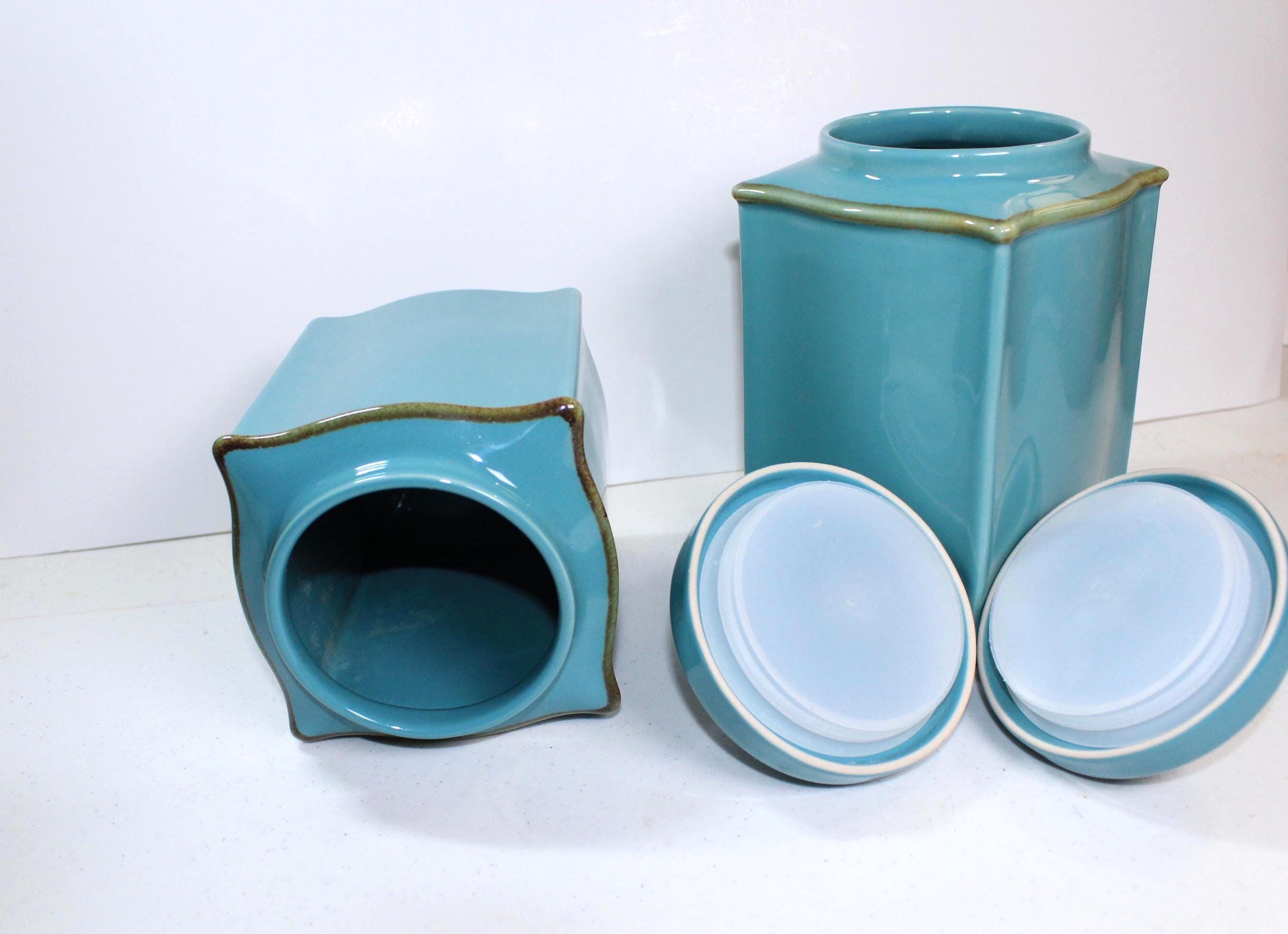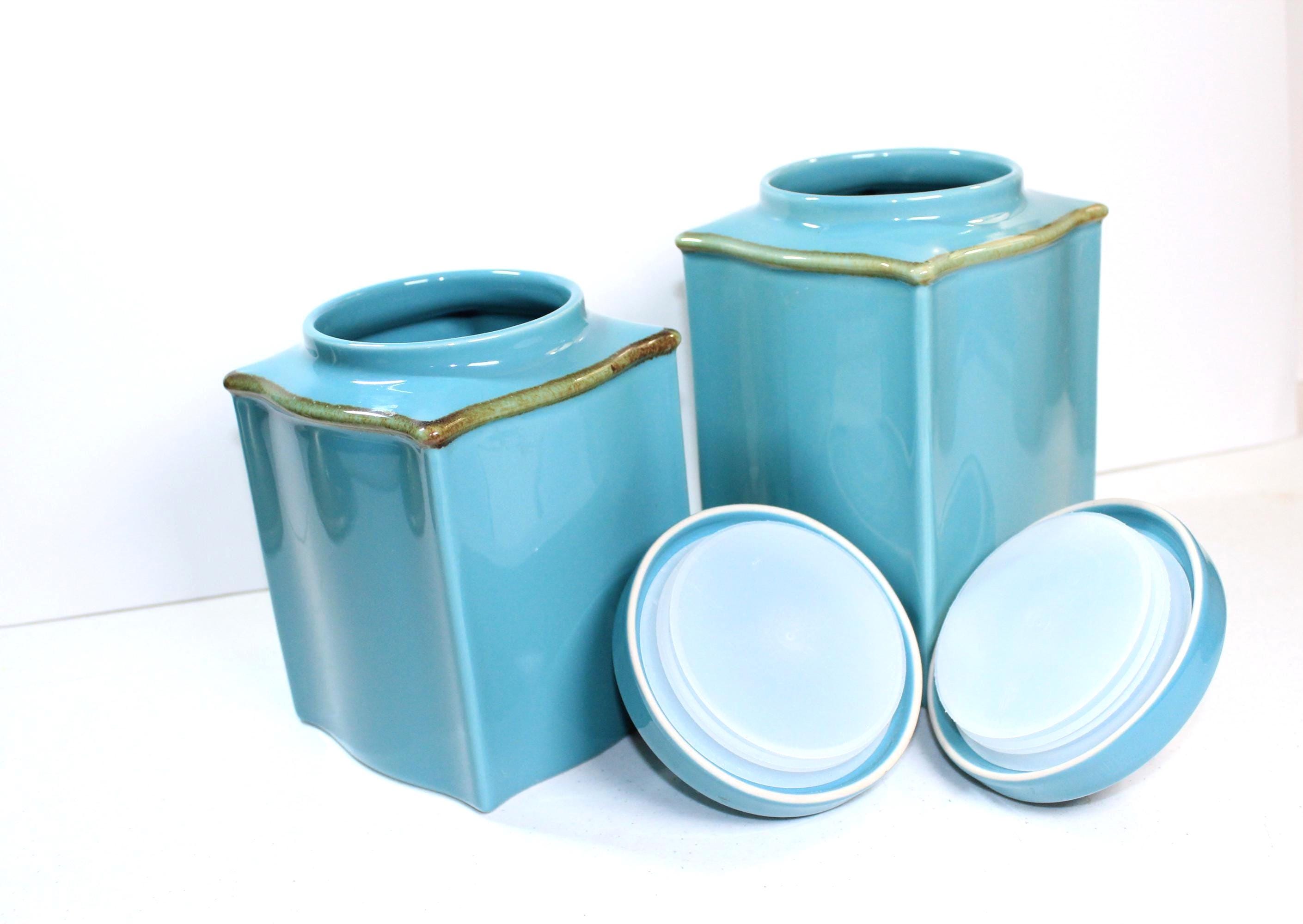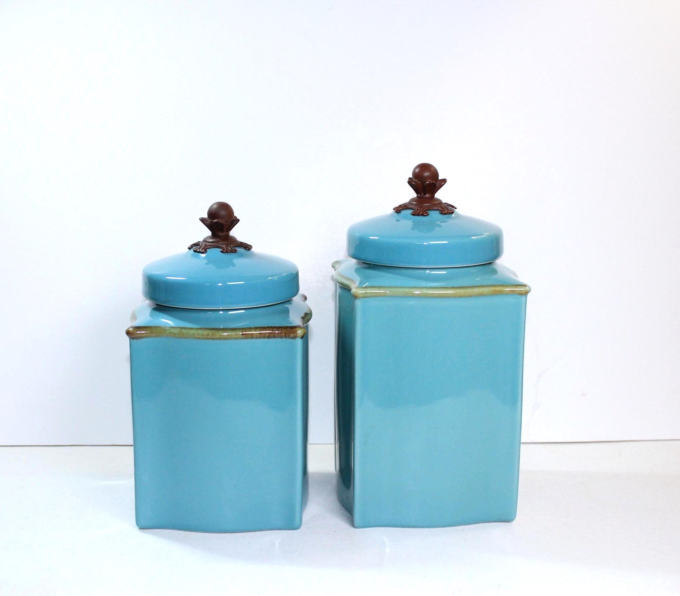 Crafted in Brazil Italy these canisters are in excellent vintage condition. They are in a very desirable color, Robins Egg Blue, in the fun Tuscan Toscana design collection, which is square but a bit curvy too. See photos to appreciate! Each canister is topped with a bronze knob and has rubber seal to keep items fresh. These are stand alone gorgeous but also quite functional.