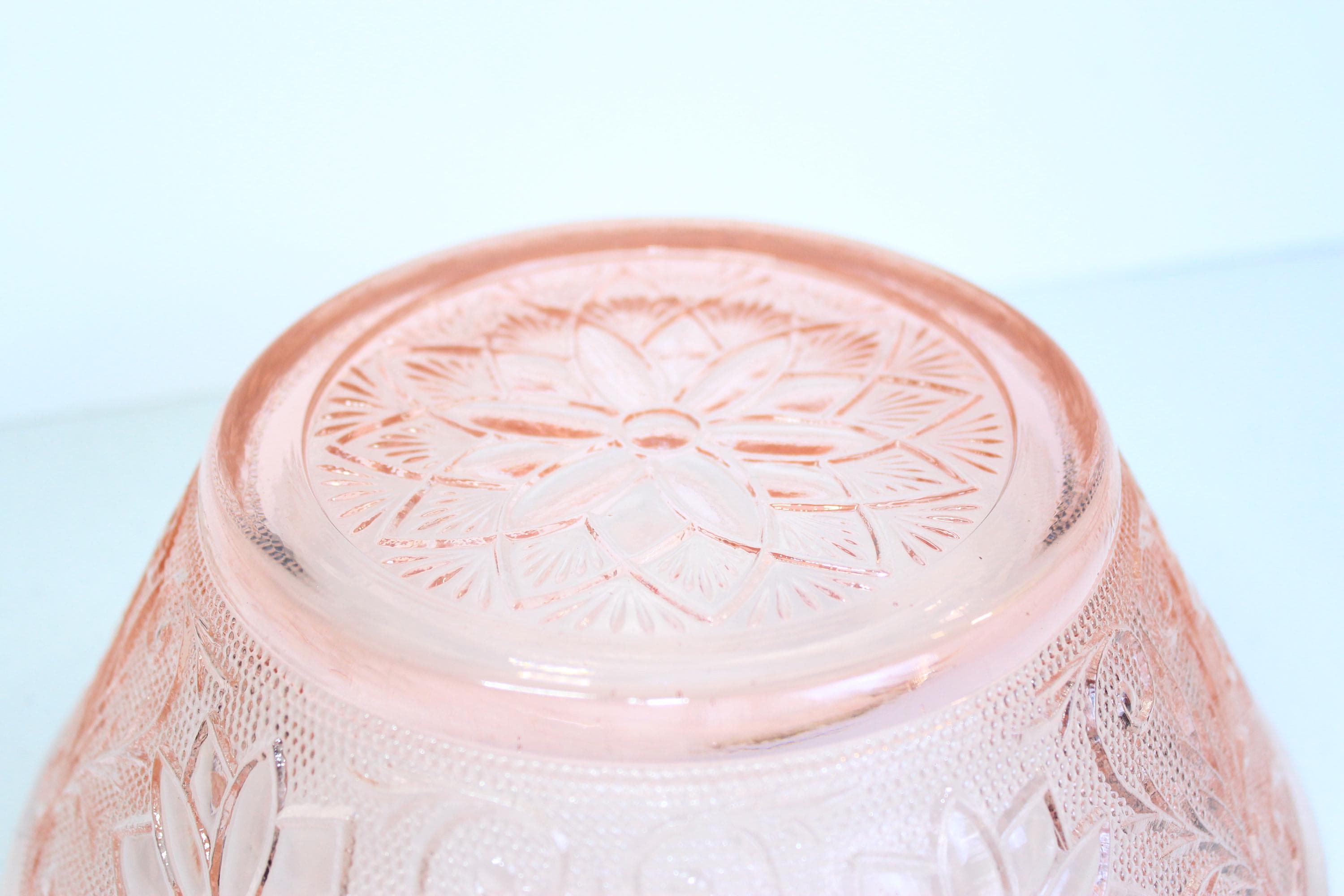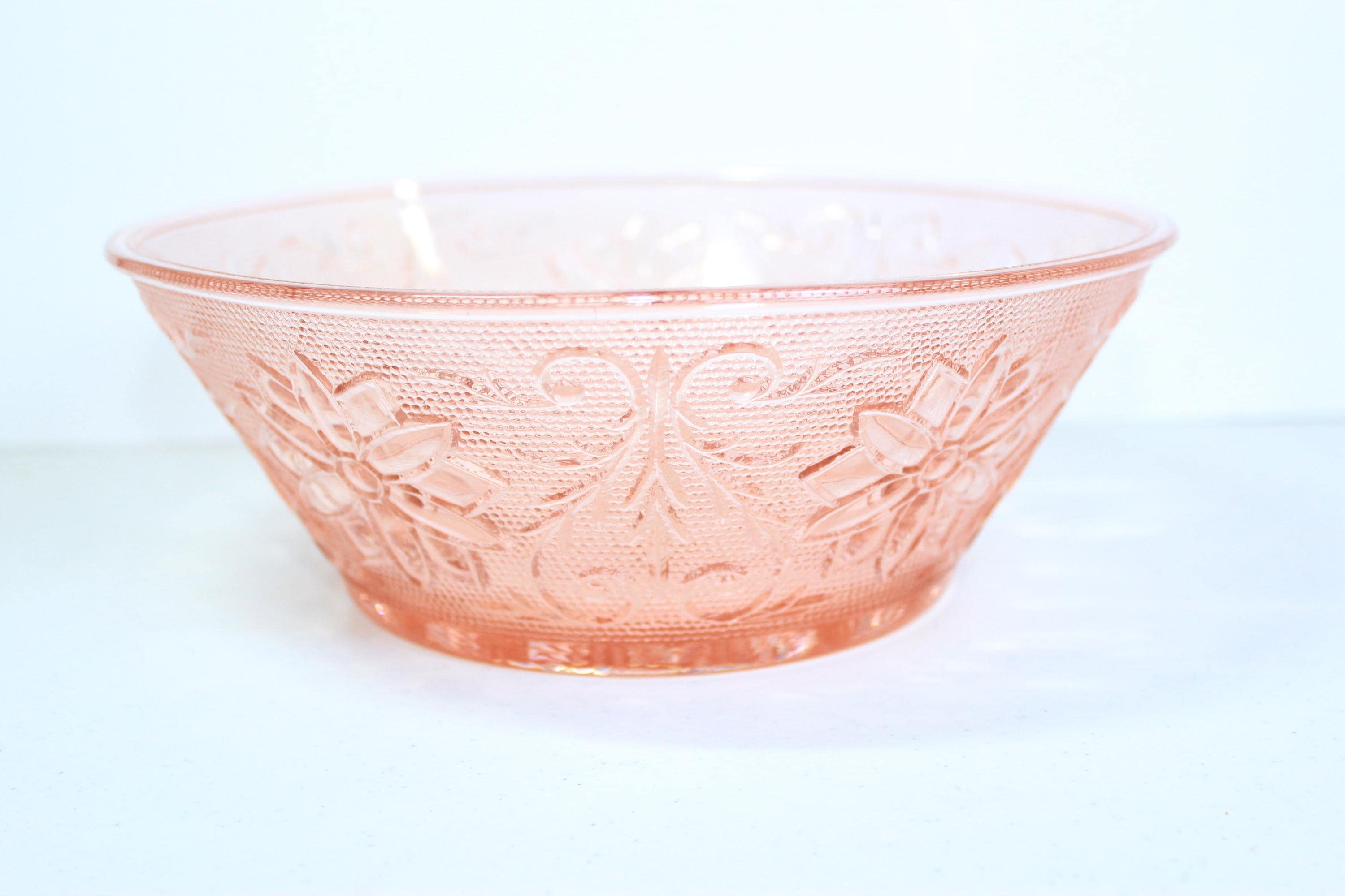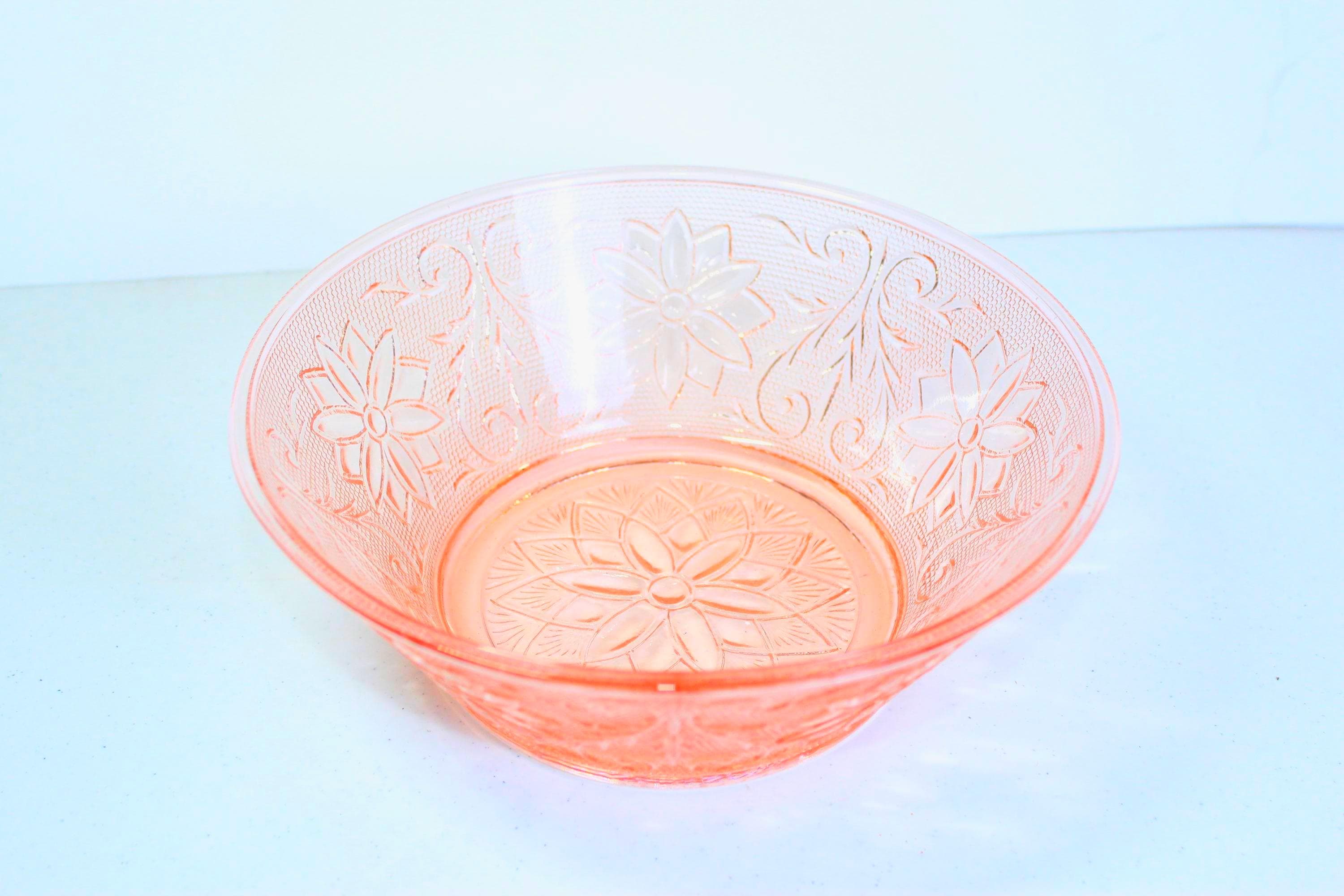 This is a popular collectible, which was produced during the Depression era It is made of pressed glass and features a floral and leaf pattern. This is in excellent condition and no chips, cracks or discernable flaws. It has very pretty external textural floral and leaf pattern and smooth interior.