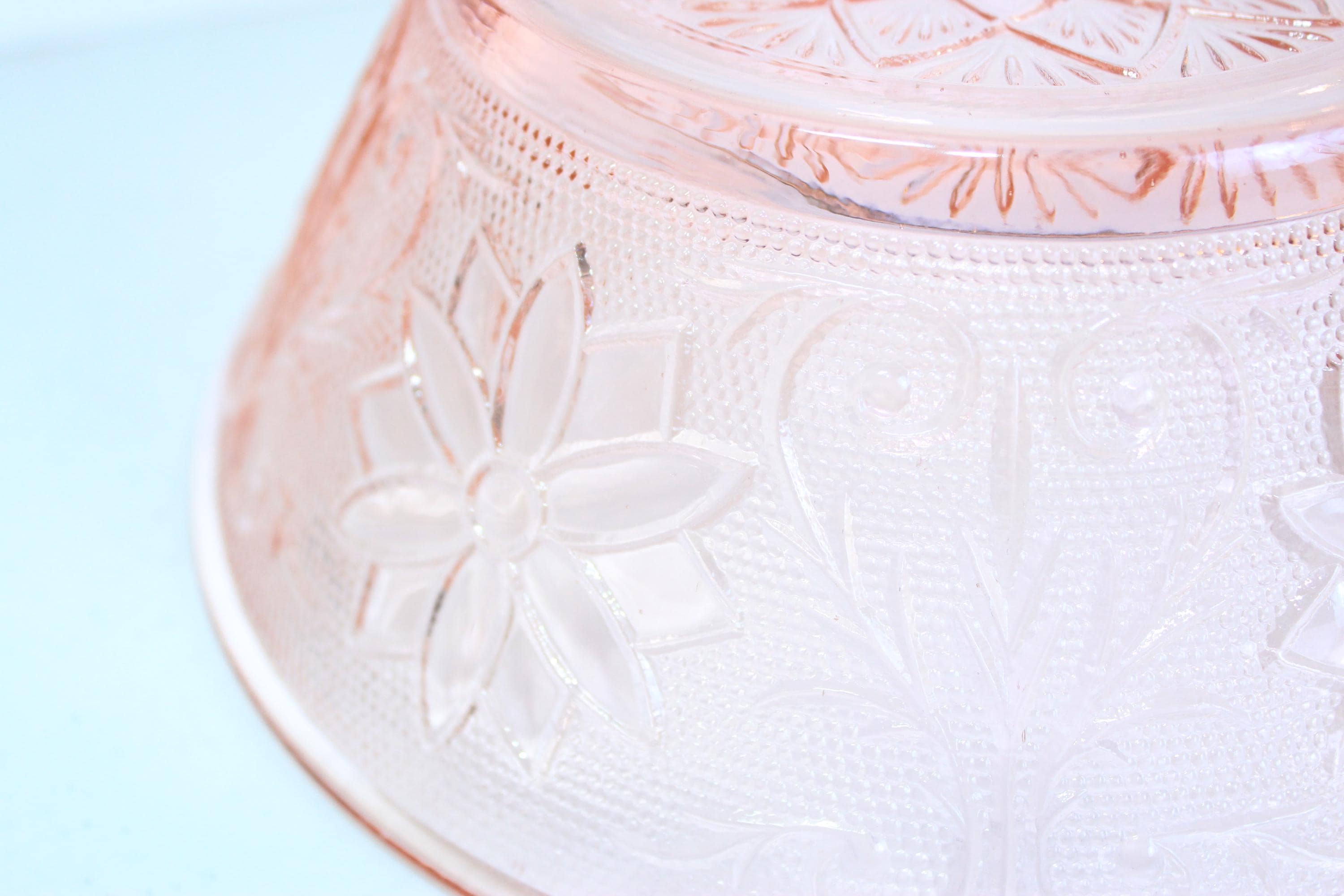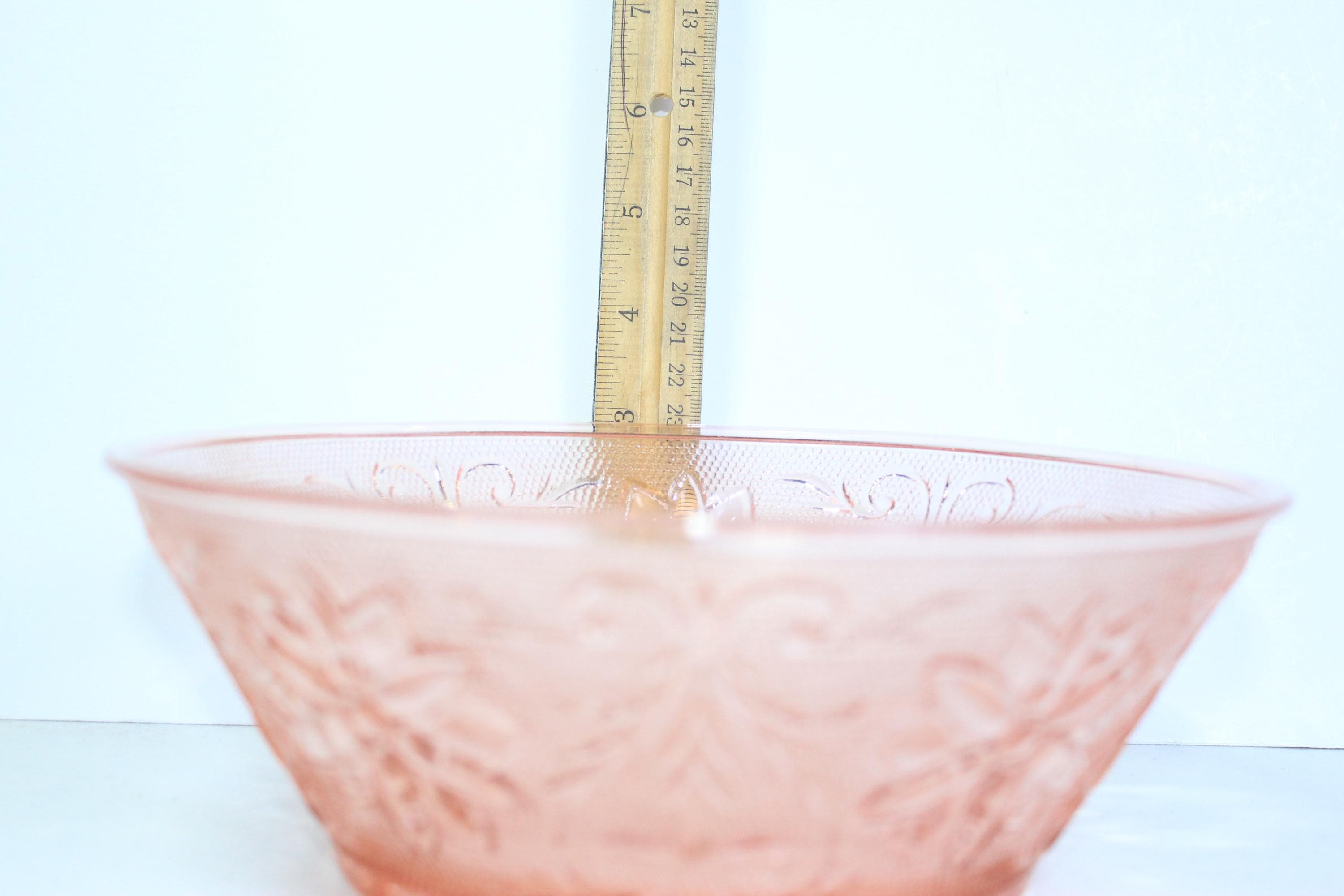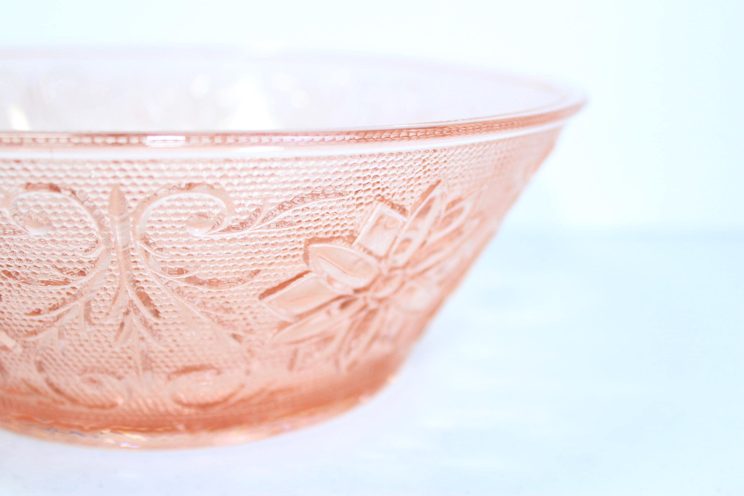 This is a popular collectible, which was produced during the Depression era It is made of pressed glass and features a floral and leaf pattern. This is in excellent condition and no chips, cracks or discernable flaws. It has very pretty external textural floral and leaf pattern and smooth interior.