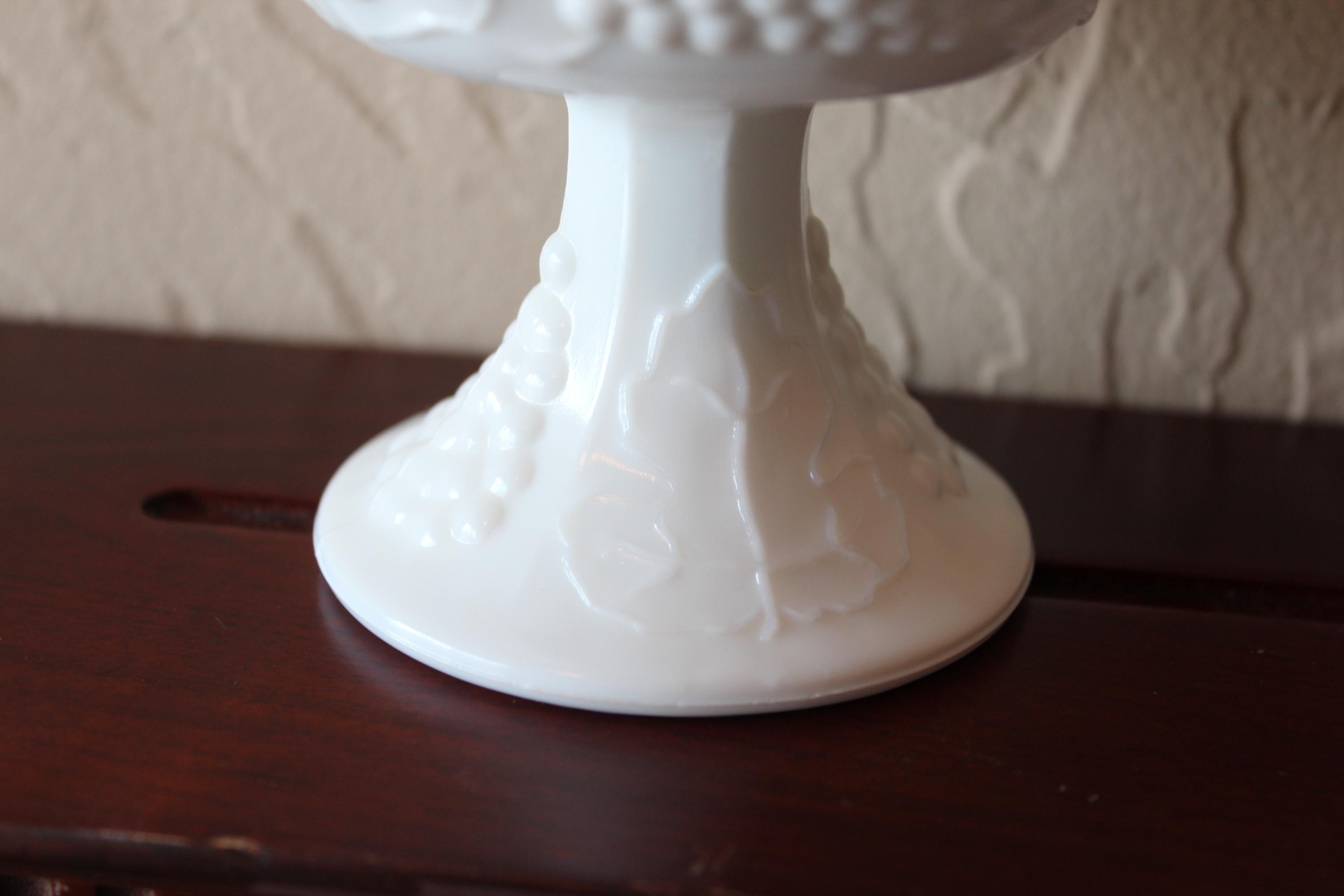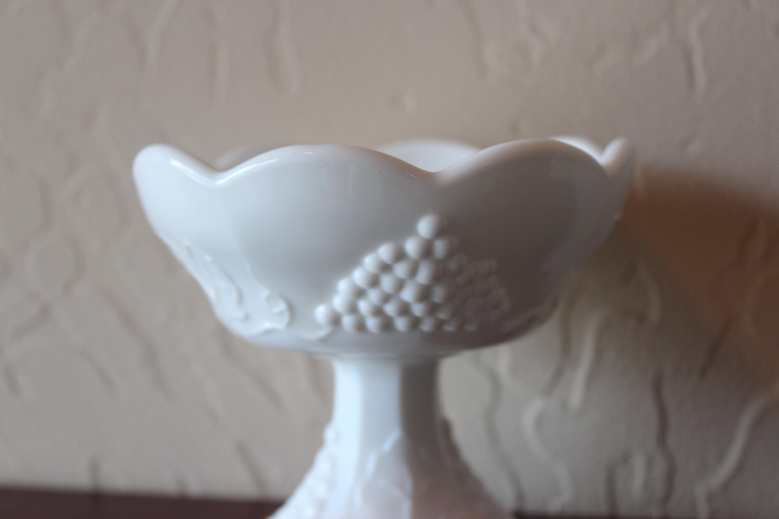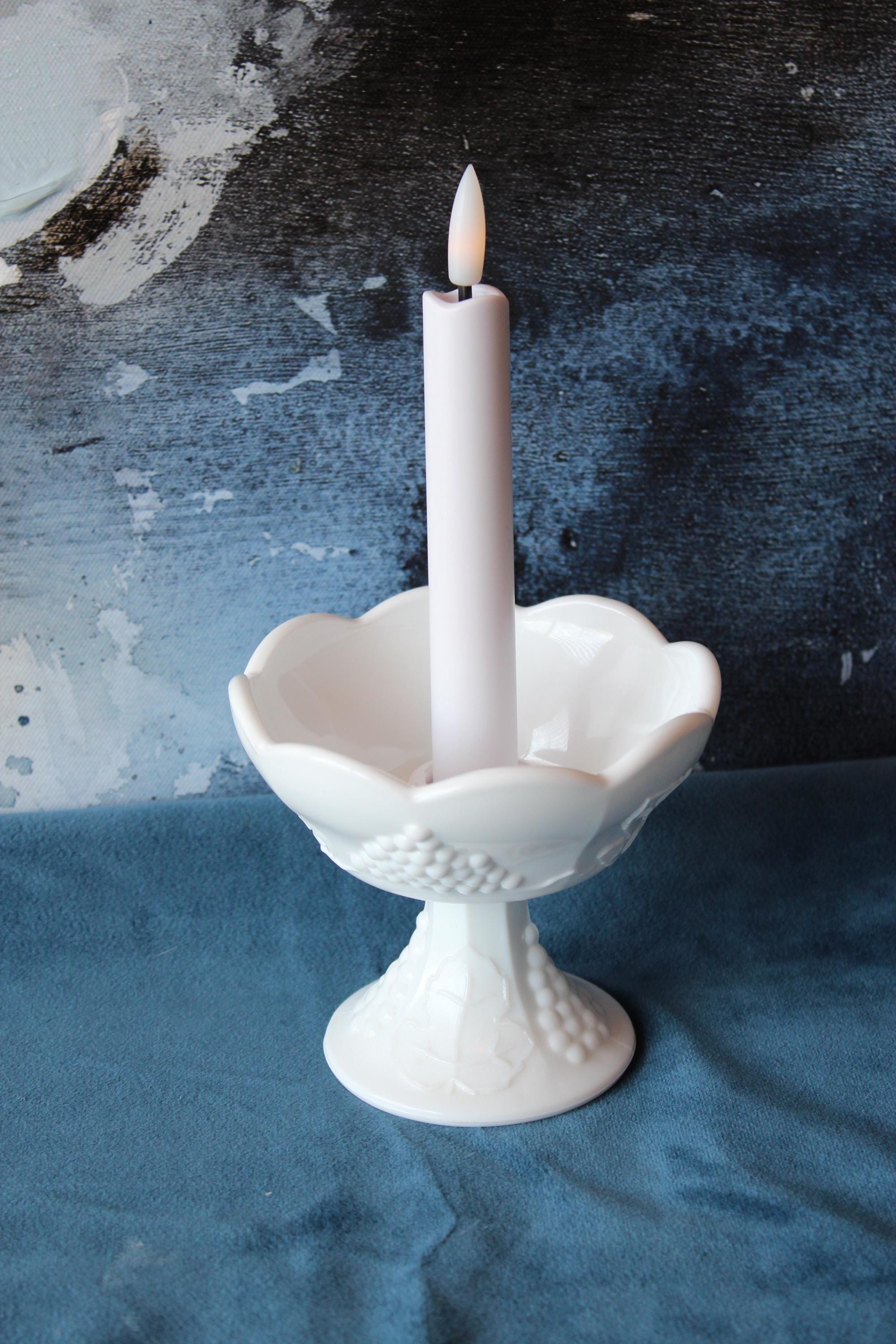 This mid century milk glass piece is in excellent condition. It features a raised grapevine and leaf pattern around the base and an attractive scalloped rim. It measures 4 inches high and is 4.5 inches in diameter. It has a formed inner space to hold a taper candle (photo for example, candle not included). This iconic style is complementary to many styles of decor.