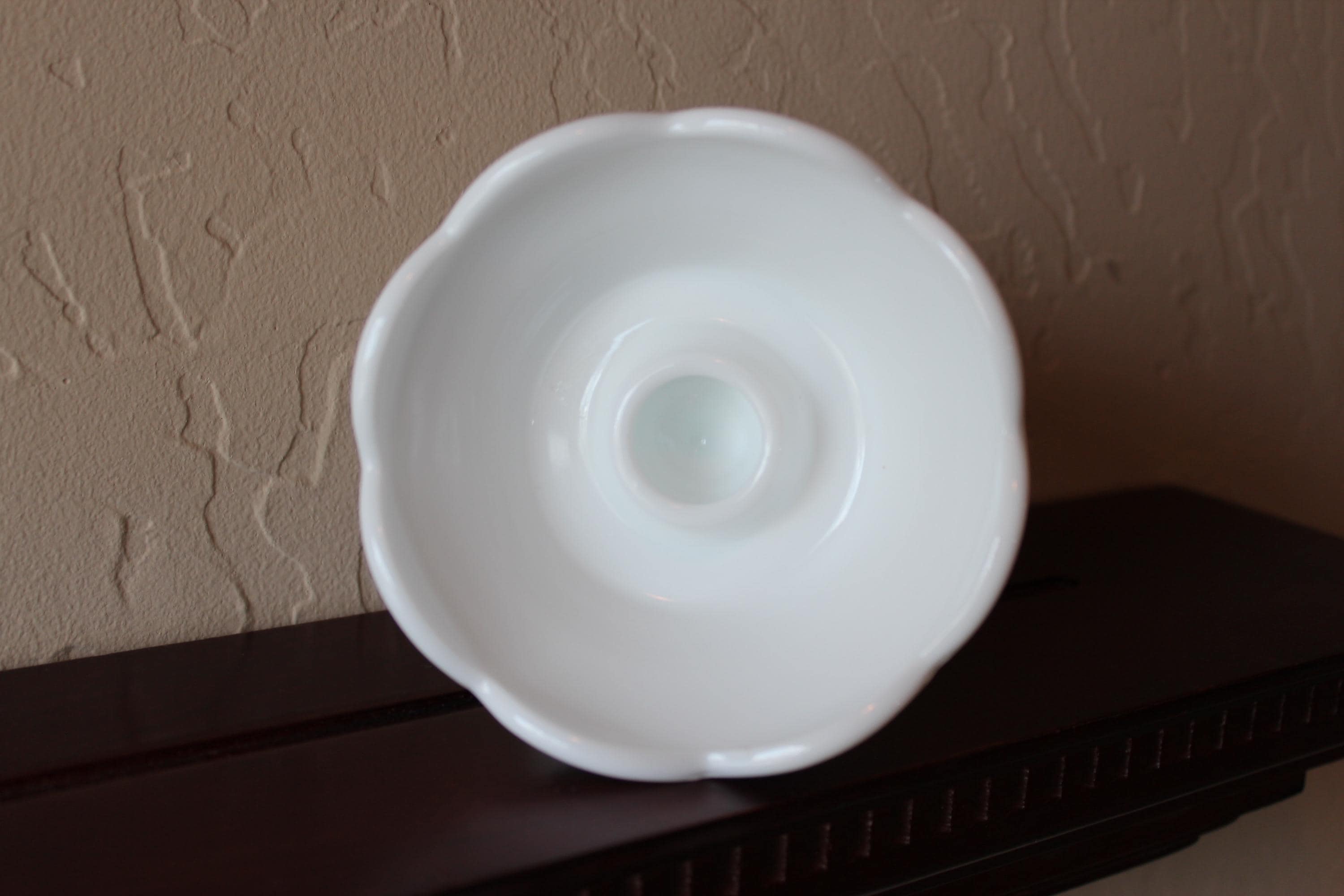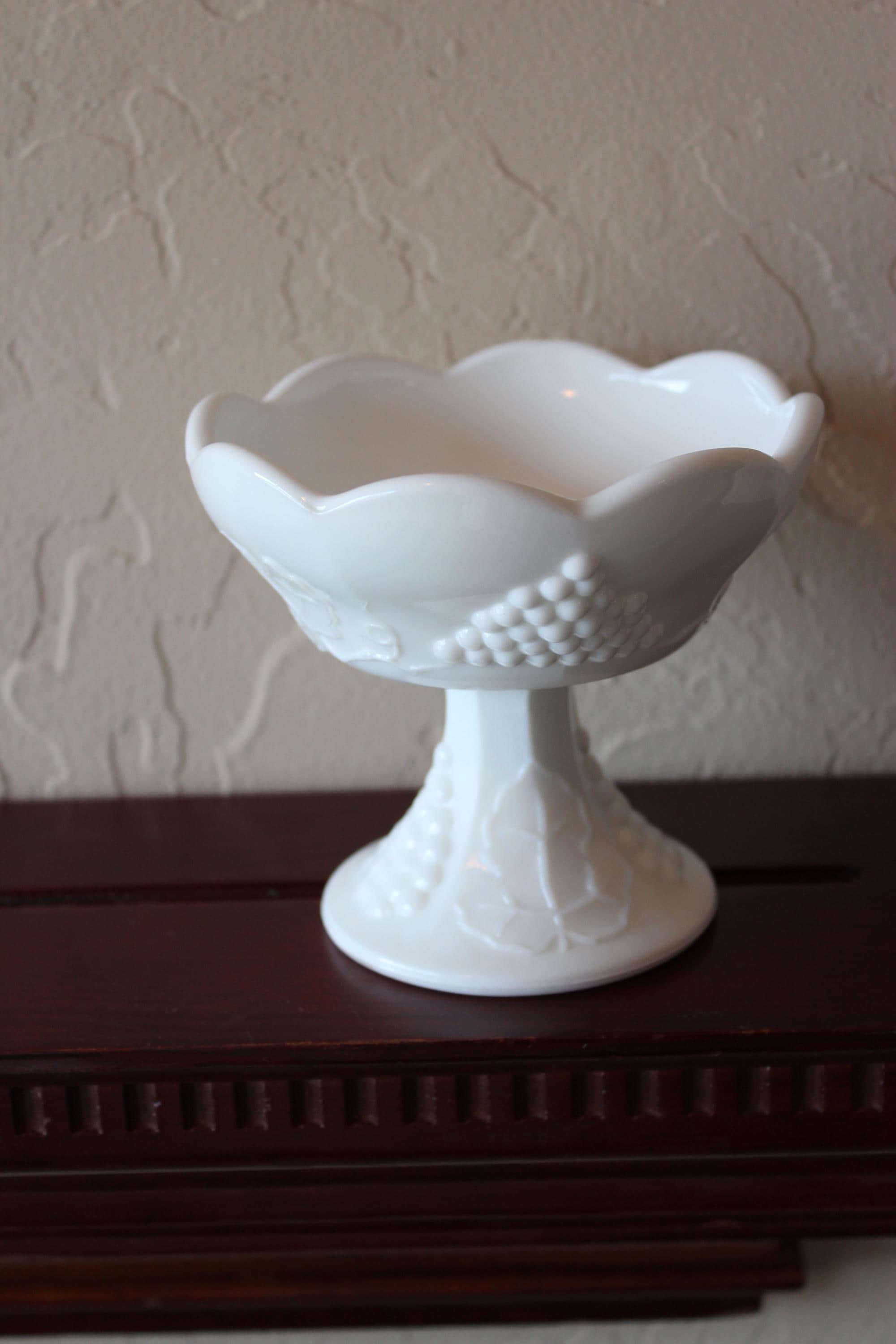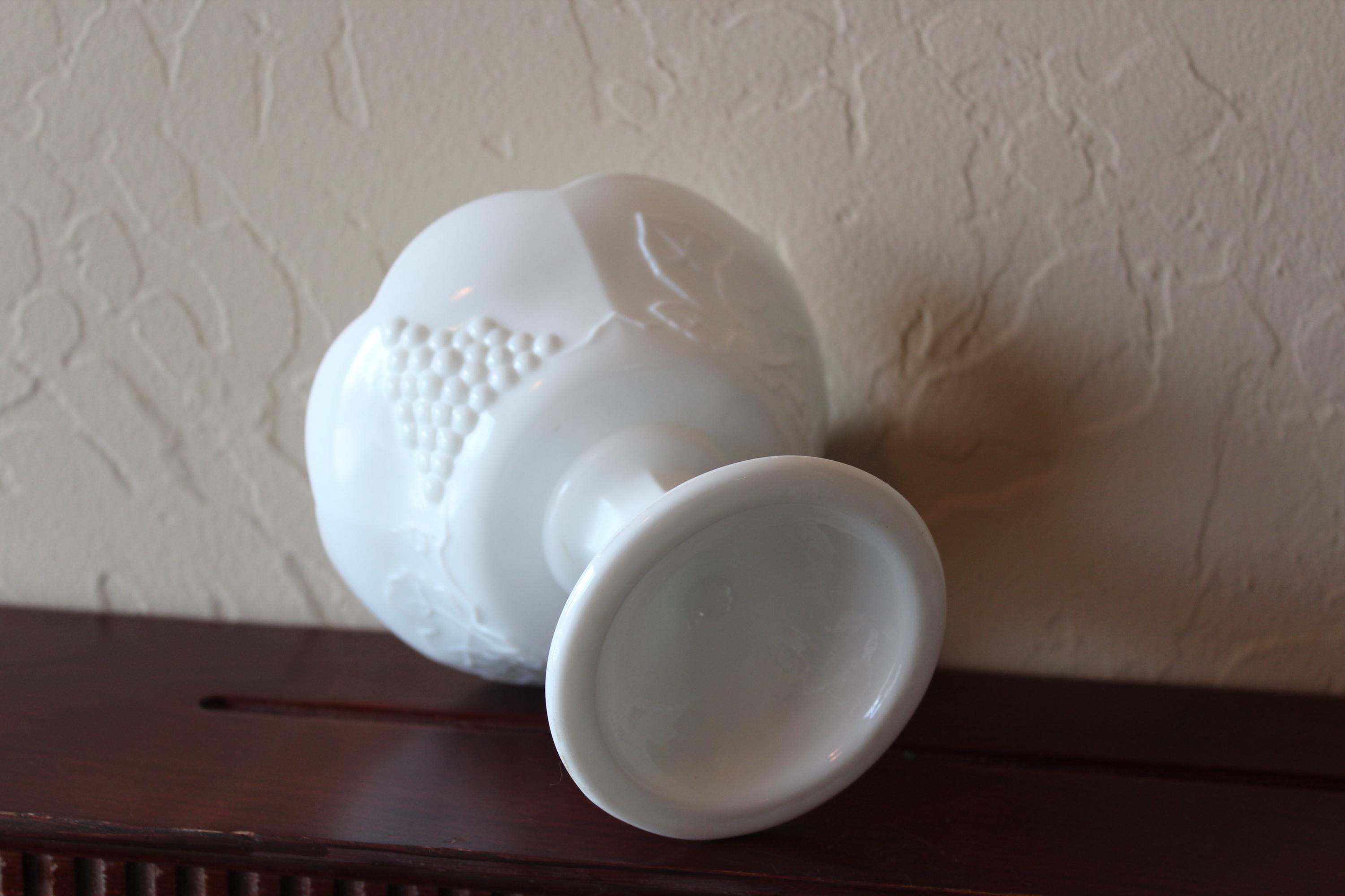 This mid century milk glass piece is in excellent condition. It features a raised grapevine and leaf pattern around the base and an attractive scalloped rim. It measures 4 inches high and is 4.5 inches in diameter. It has a formed inner space to hold a taper candle (photo for example, candle not included). This iconic style is complementary to many styles of decor.