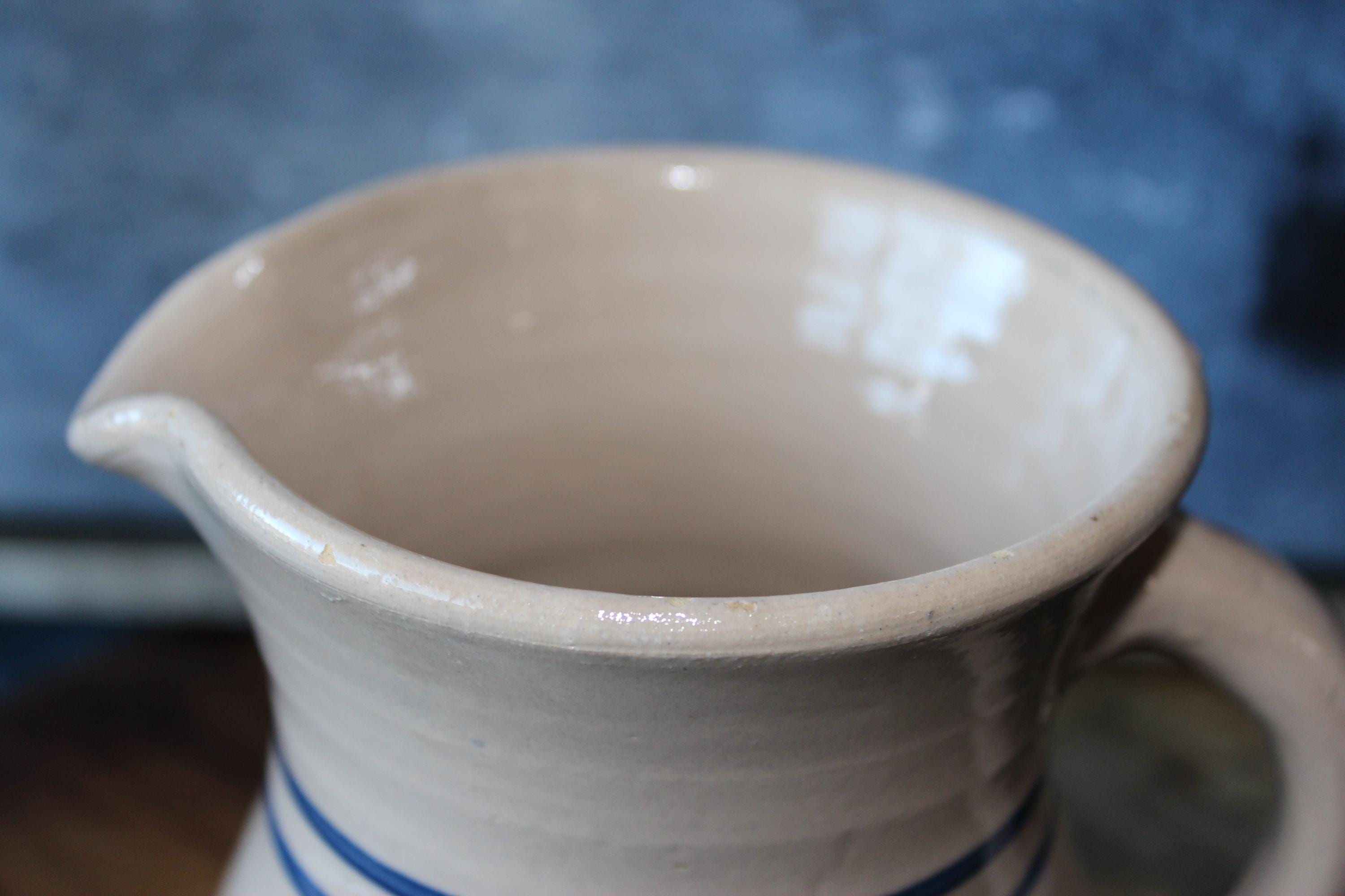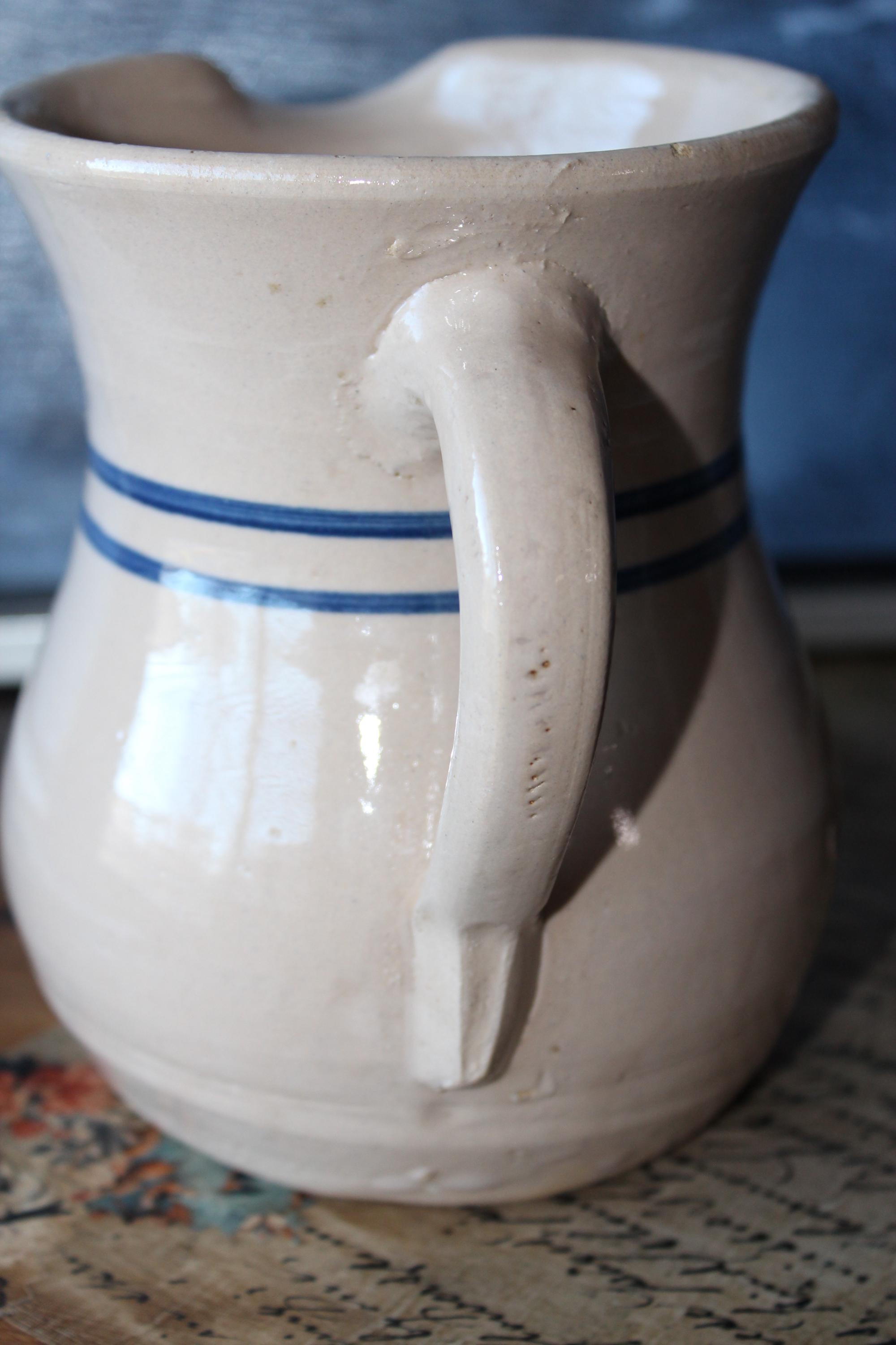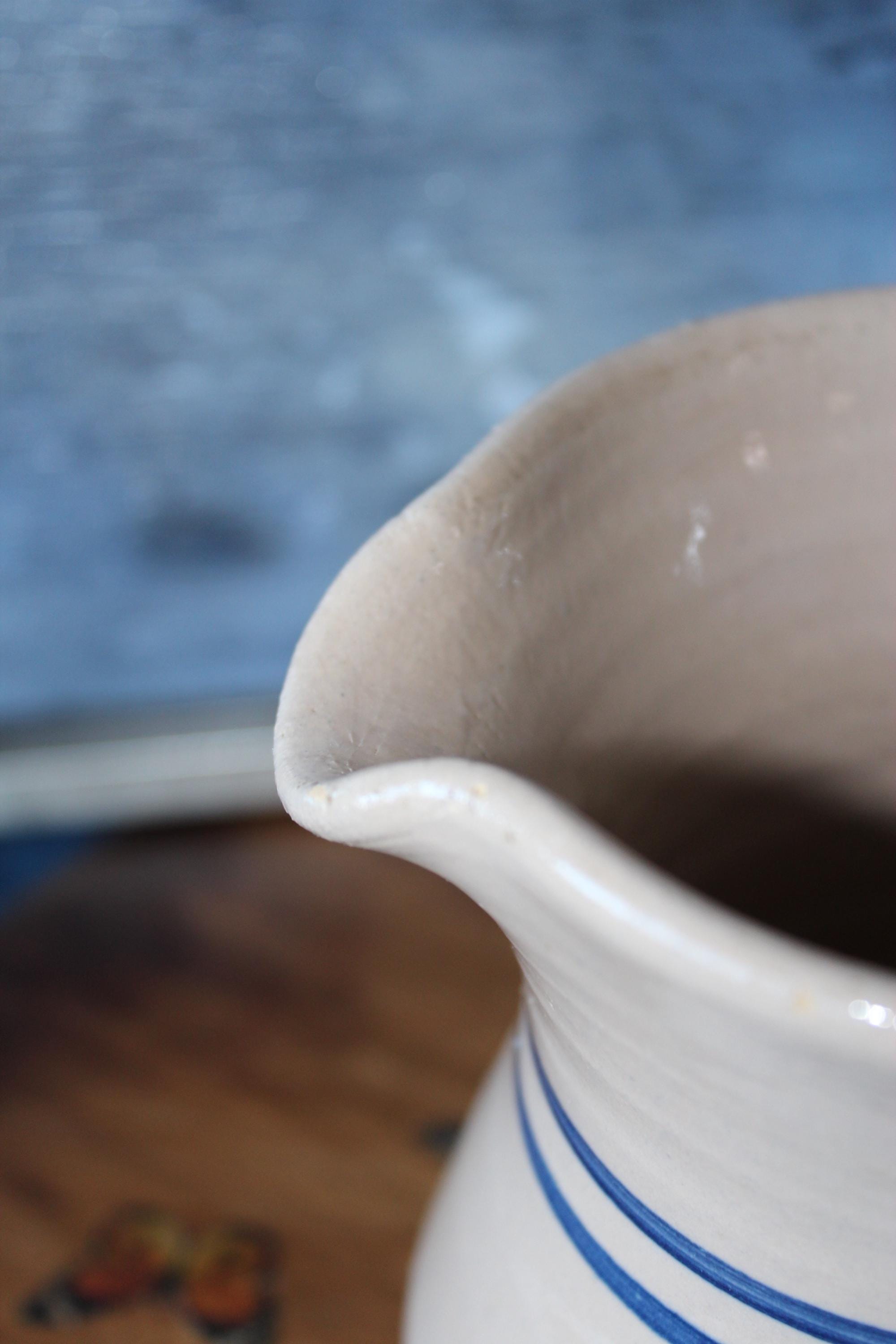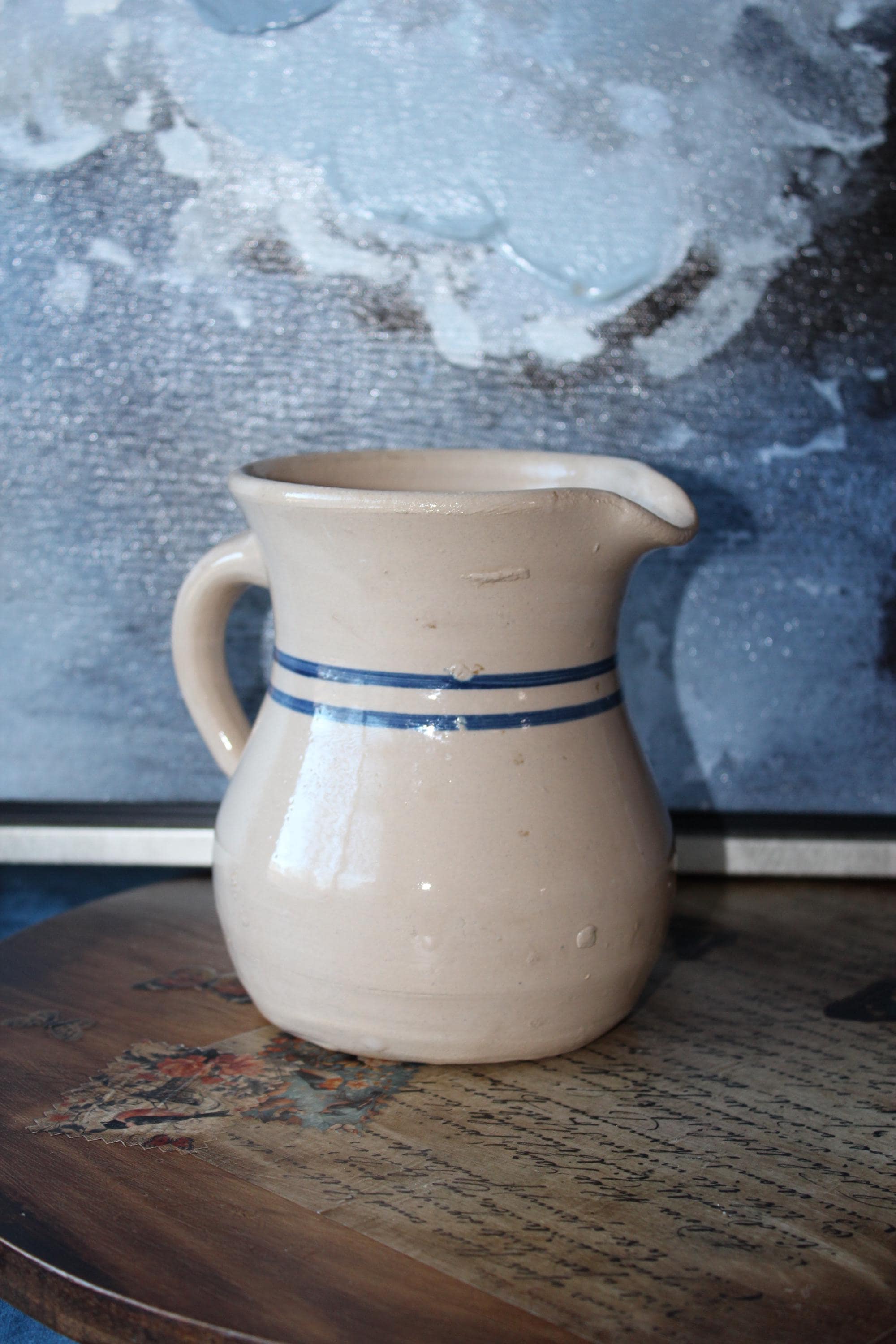 Hand Thrown Clay Stoneware Pottery Pitcher Vase Blue Stripe 6 inch x 5.5 inch. This is a cool little pitcher that has an iconic vintage appeal and the highly recognizable double blue stripe in the glaze. It has a sturdy weight and suitable for a vase, holder, pitcher, or just display. It is clearly hand thrown and the few flaws in the glaze (see photos) adds to the aesthetic appeal. It is unsigned by the artist. It is pre-loved in very good condition. Please message me before purchase if you will need a different shipping method or level. Thank you for looking!