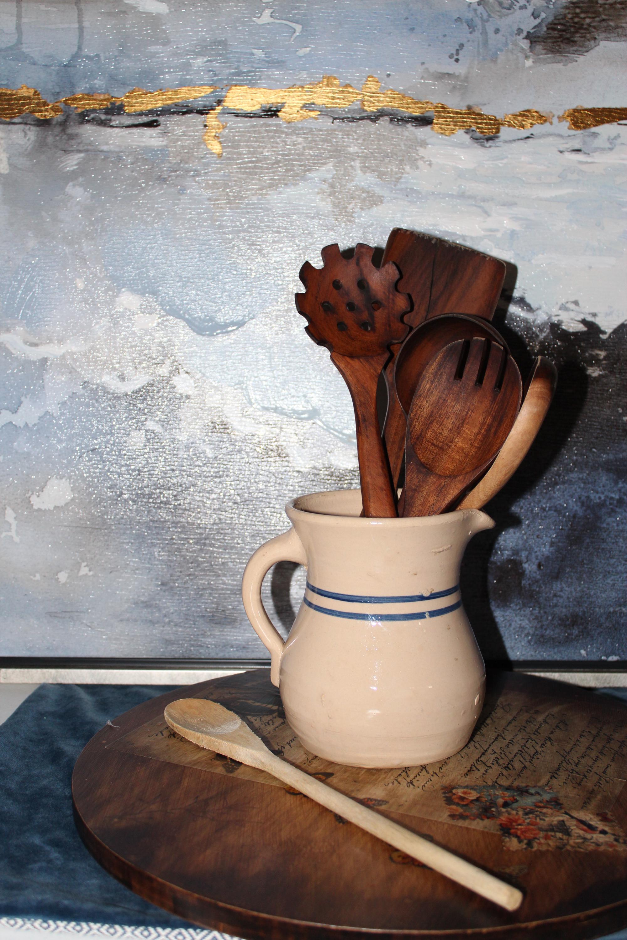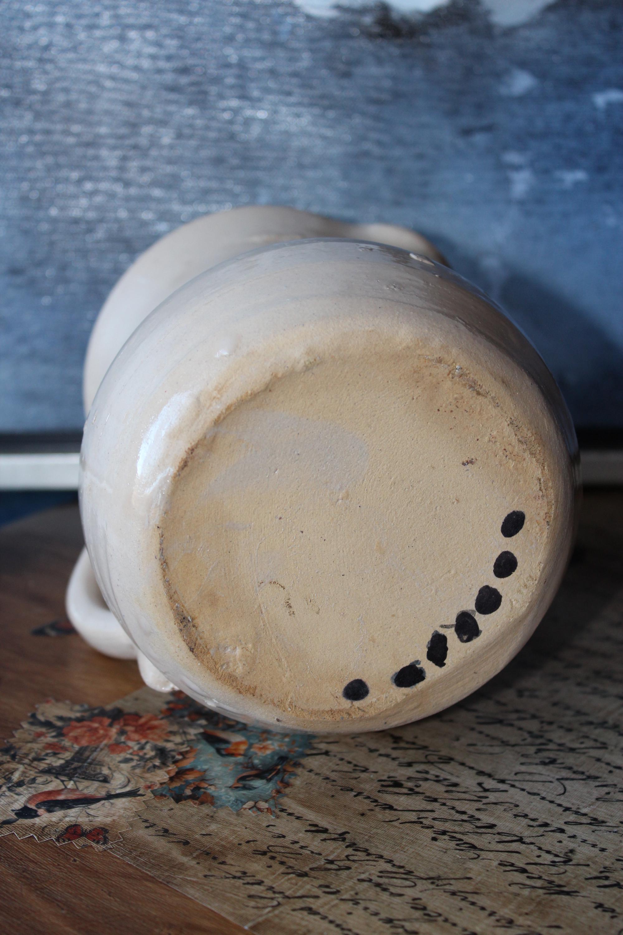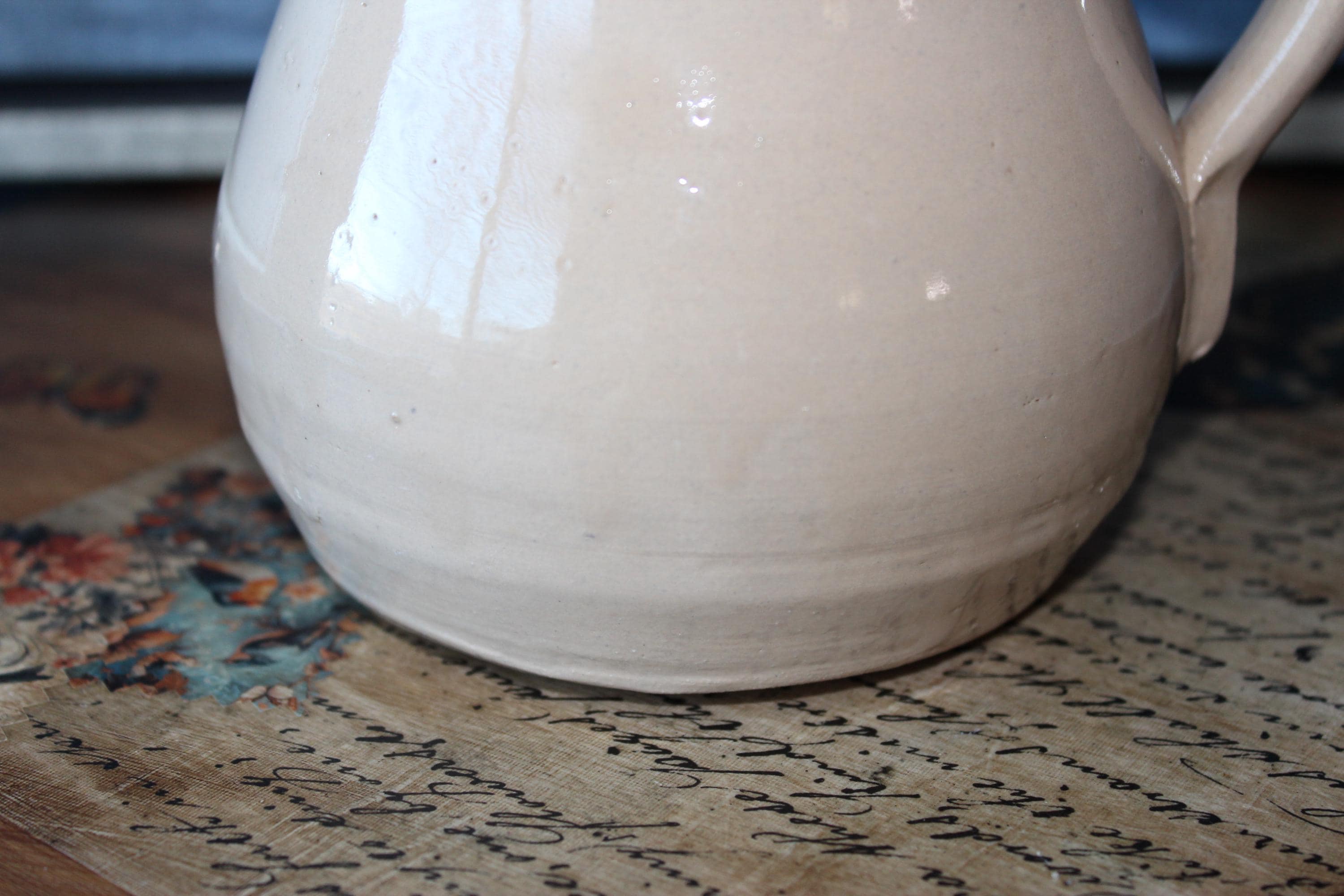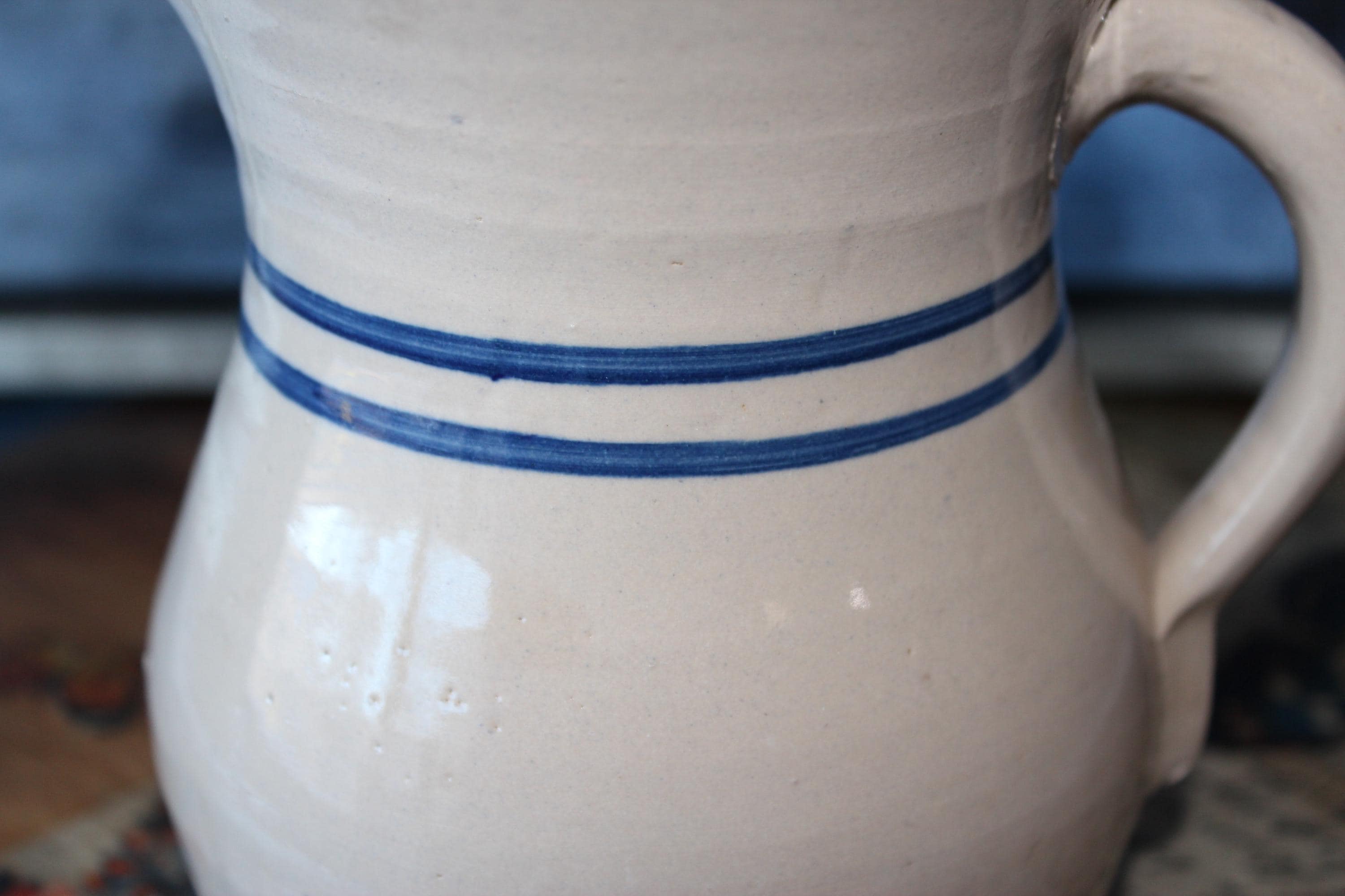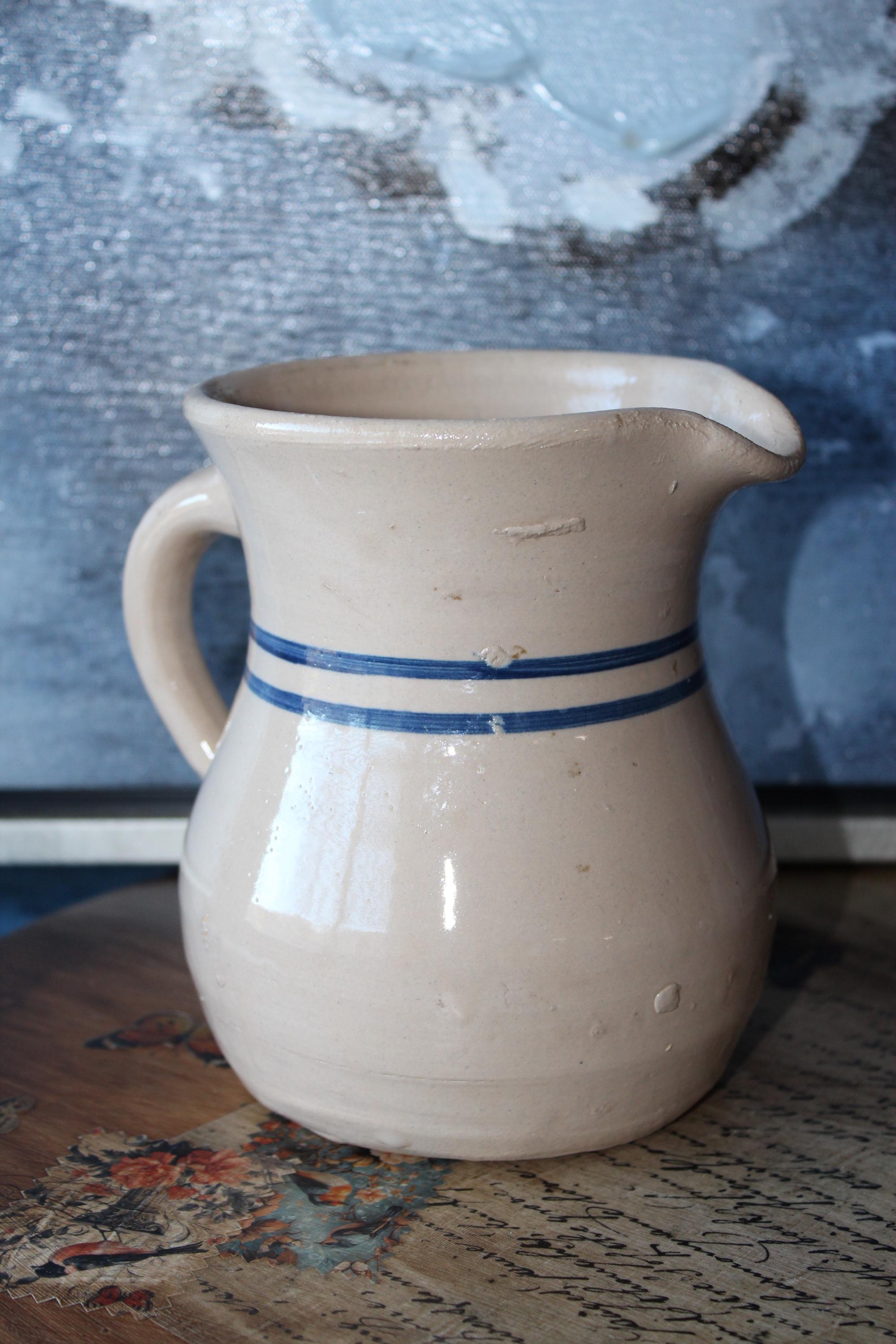 Hand Thrown Clay Stoneware Pottery Pitcher Vase Blue Stripe 6 inch x 5.5 inch. This is a cool little pitcher that has an iconic vintage appeal and the highly recognizable double blue stripe in the glaze. It has a sturdy weight and suitable for a vase, holder, pitcher, or just display. It is clearly hand thrown and the few flaws in the glaze (see photos) adds to the aesthetic appeal. It is unsigned by the artist. It is pre-loved in very good condition. Please message me before purchase if you will need a different shipping method or level. Thank you for looking!