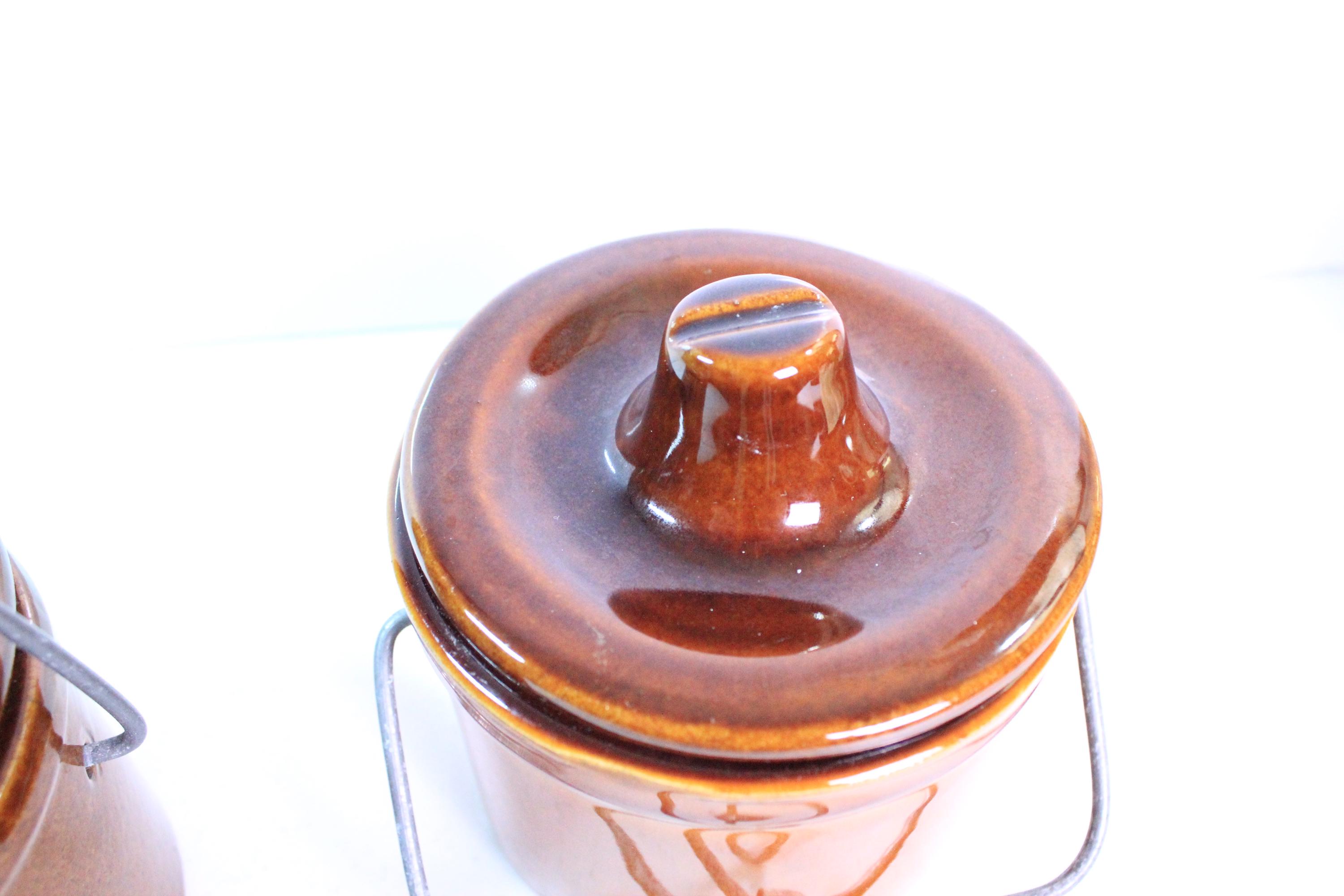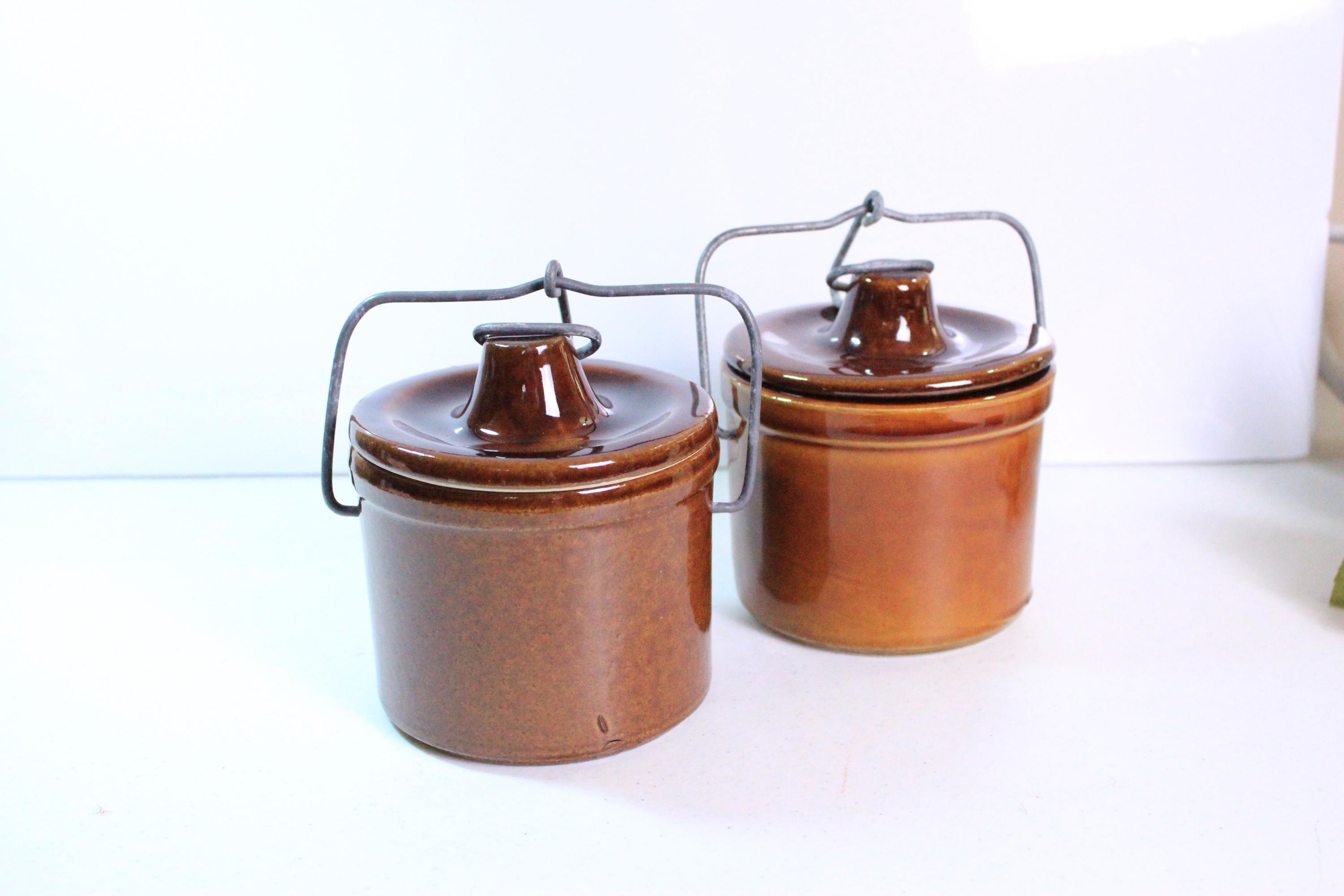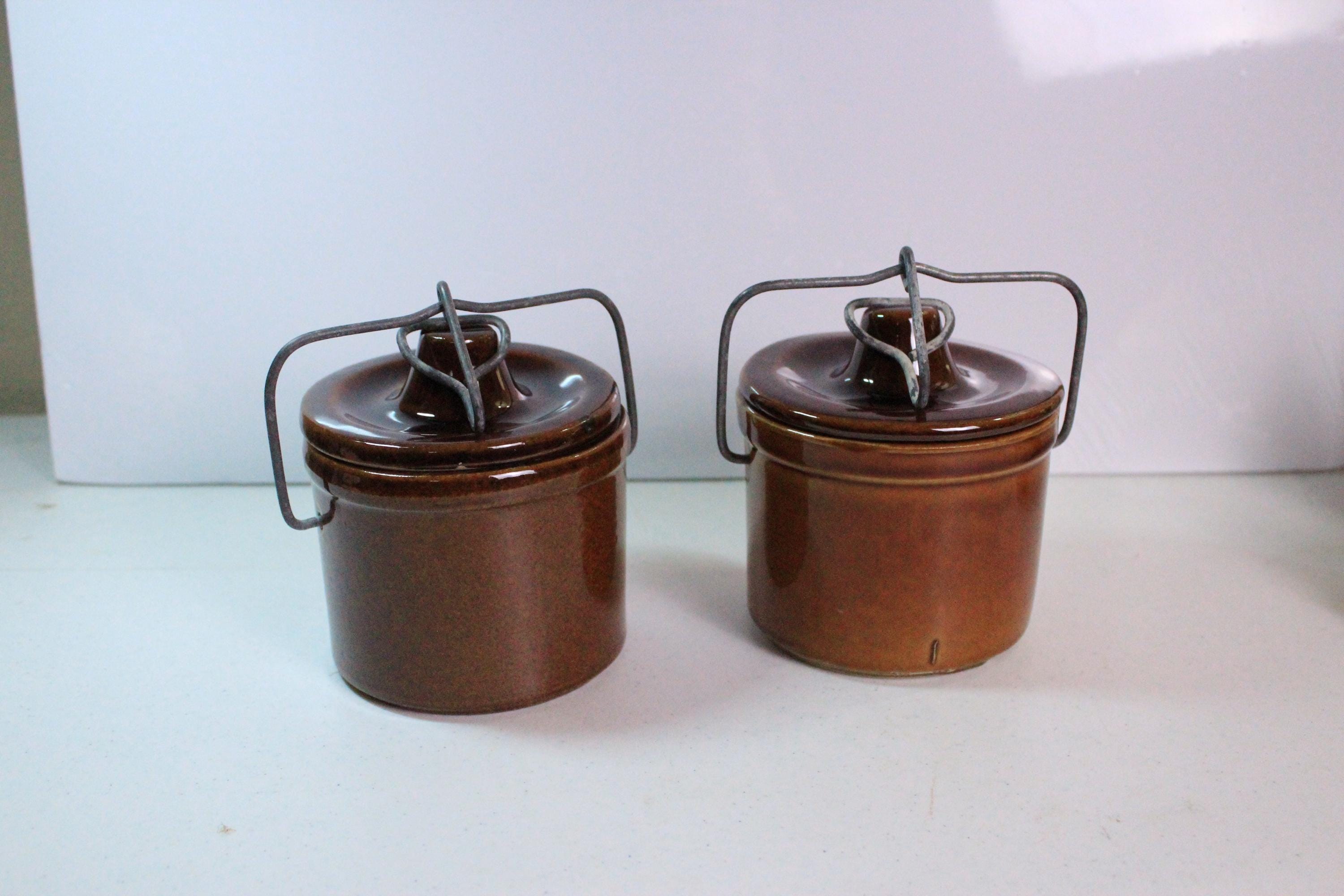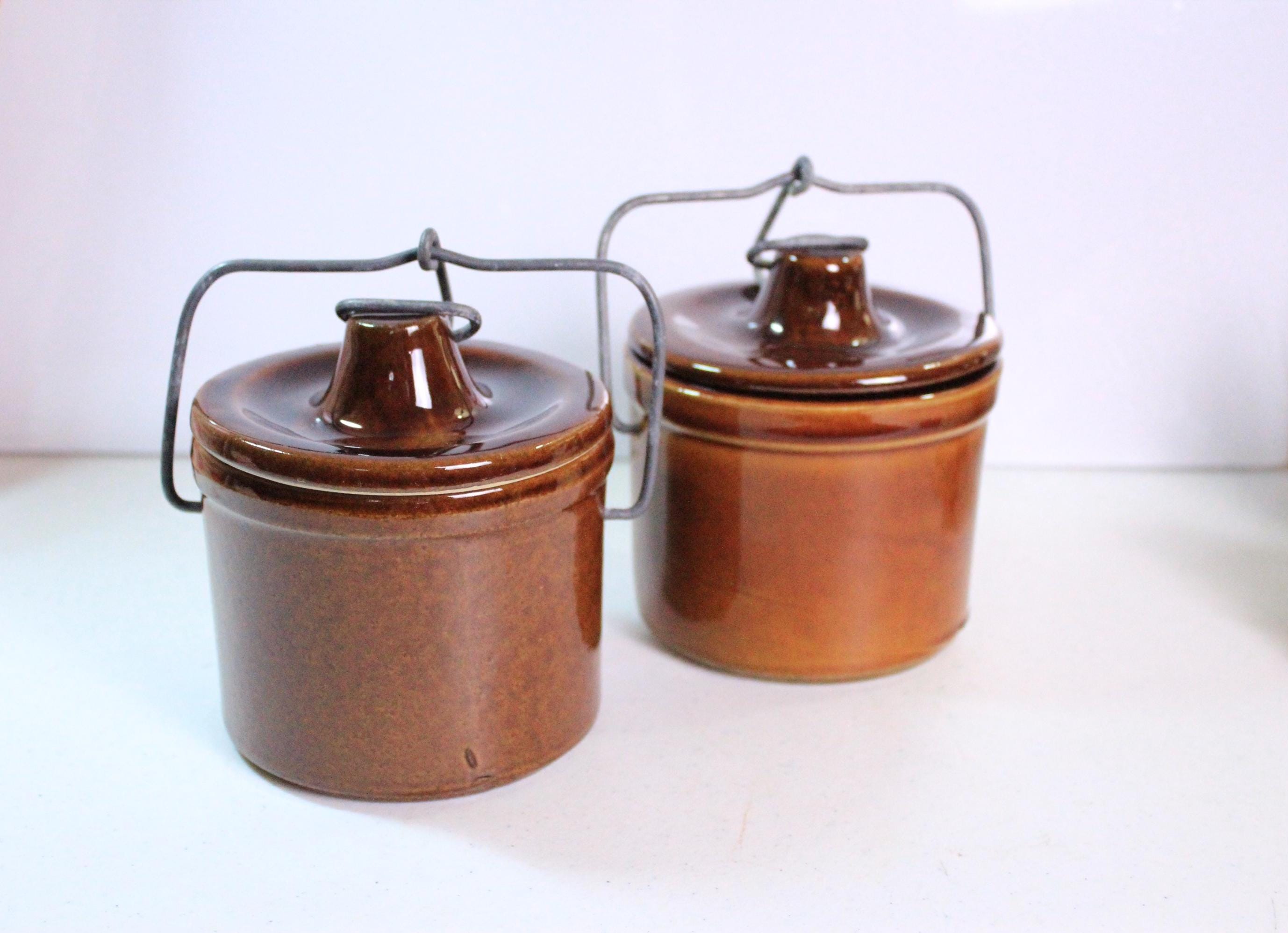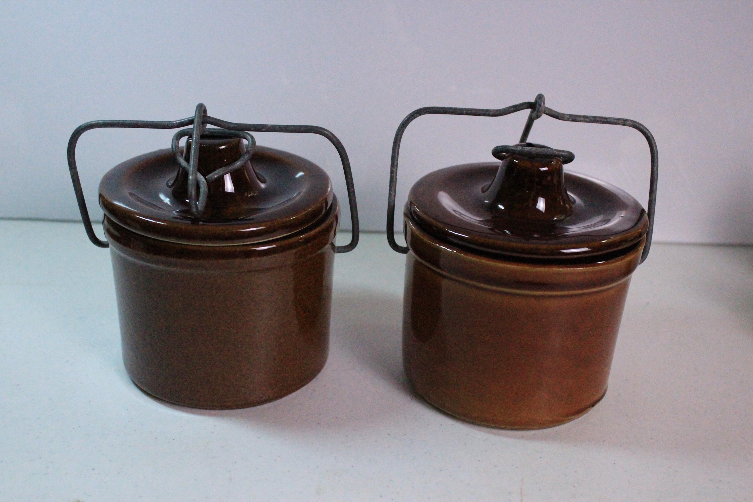 This is a pair of vintage brown stoneware crock with a wire bail lid, often used for cheese, butter, or jam. They glazed in a rich, dark brown finish. The tops have metal wire handles that fit on the knobbed lids. One of the crocks wire handle does not securely latch the crock lid, although it is all intact and will stay in place. There are no cracks, chips, or crazing. These are in very good pre-loved condition. Please message if you need a different level of shipping or carrier.