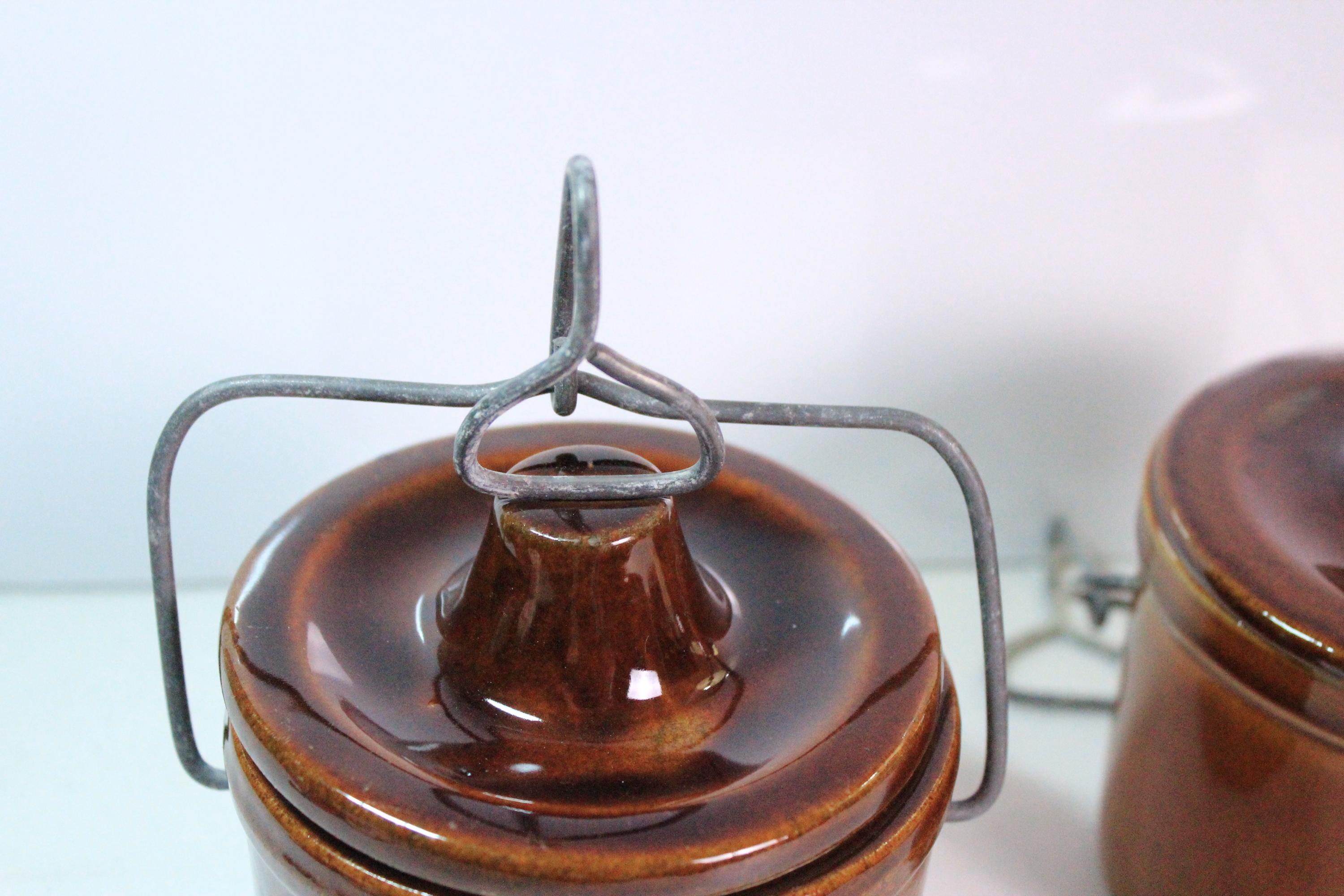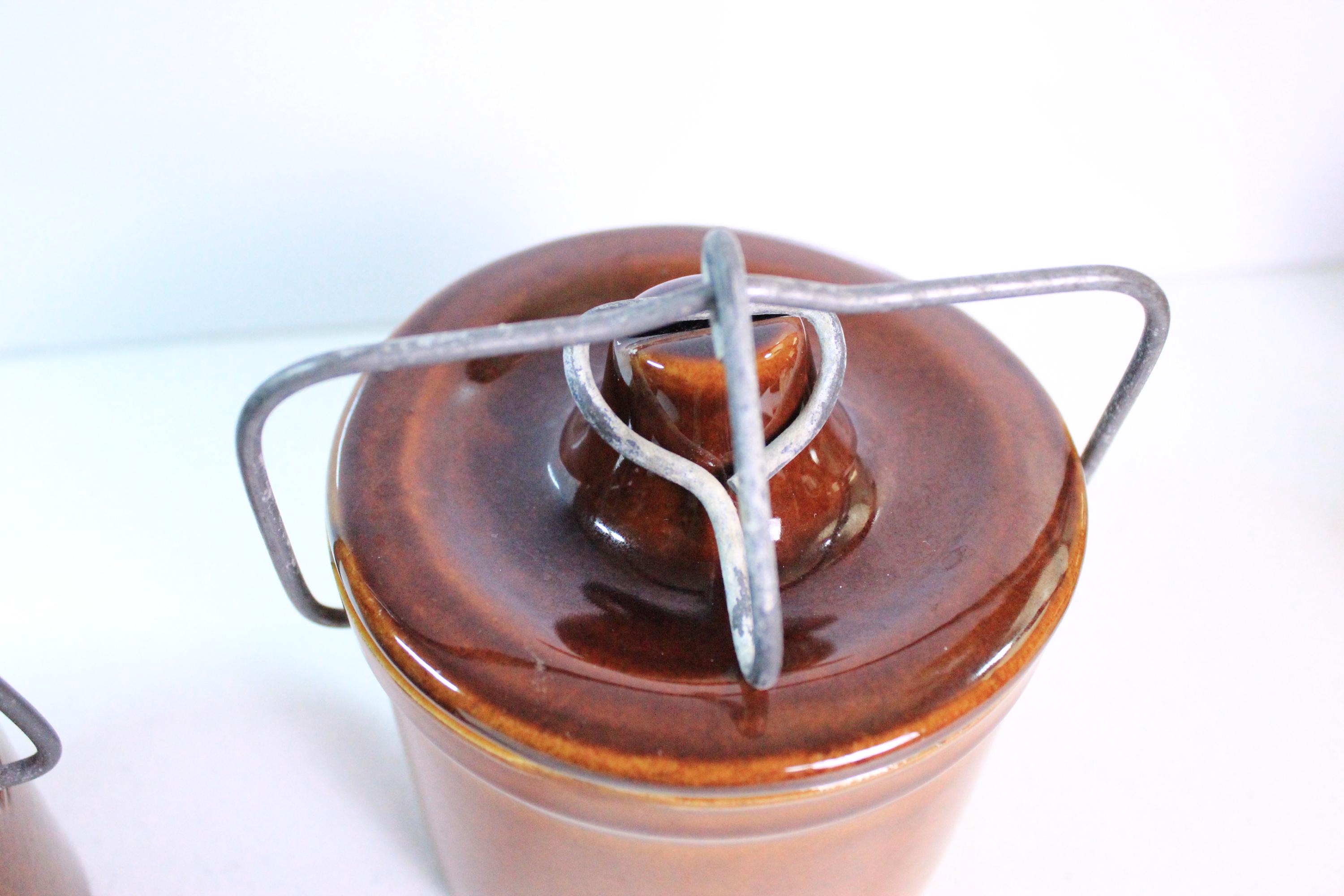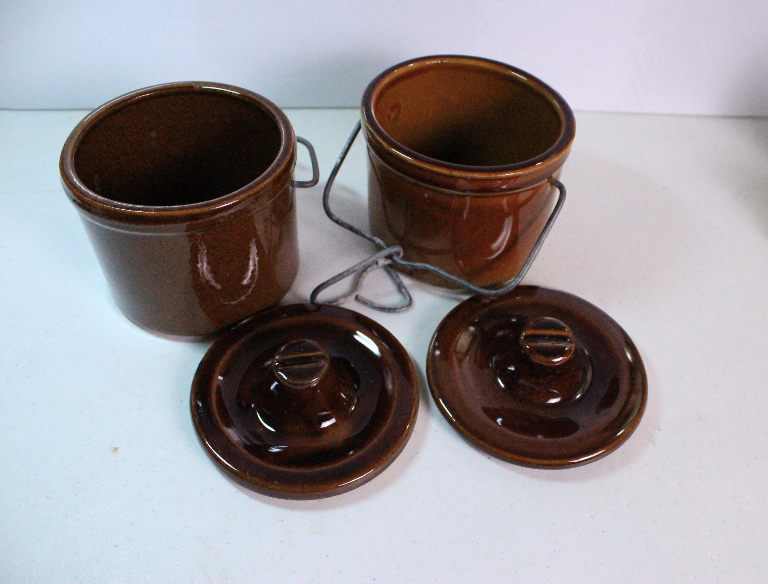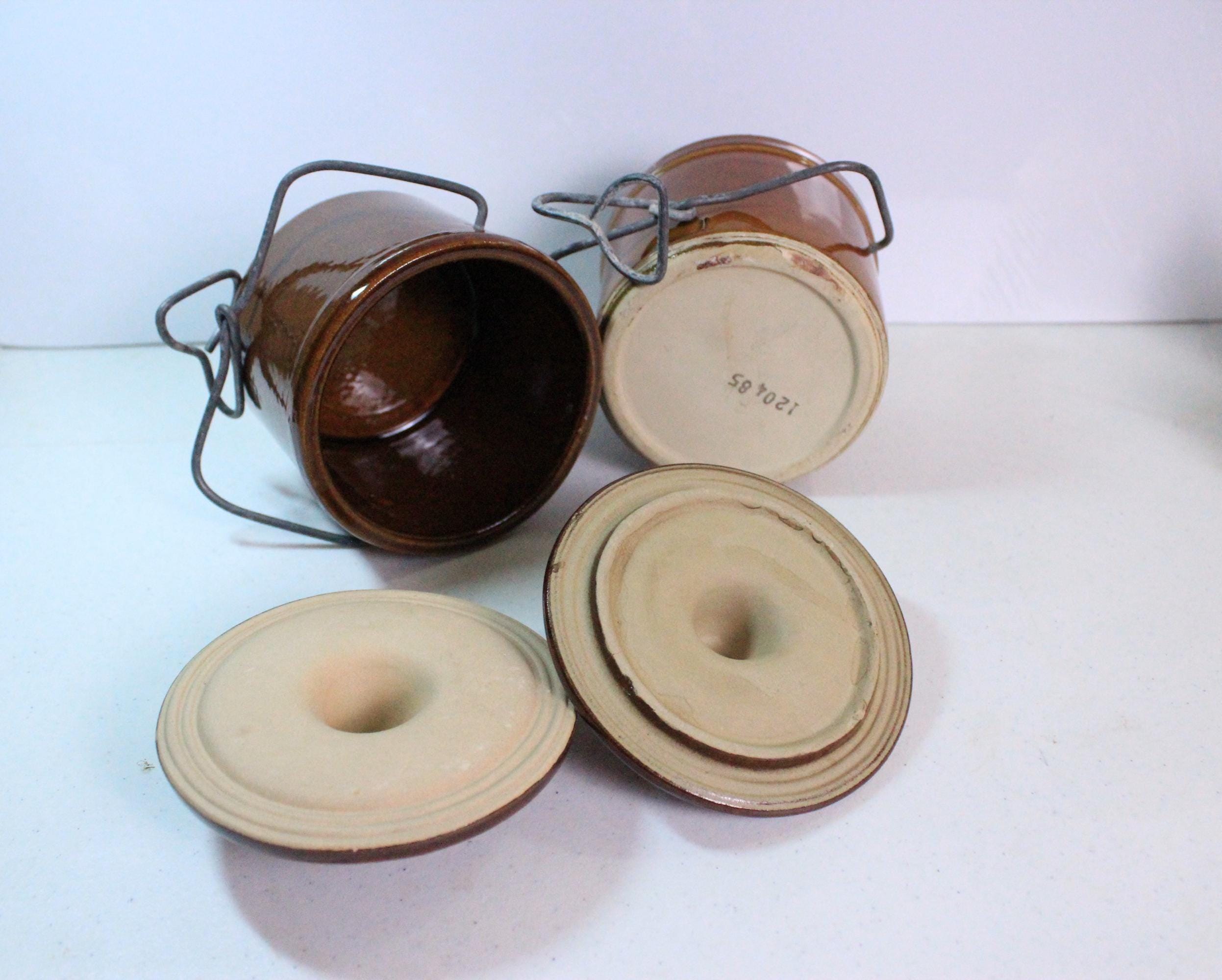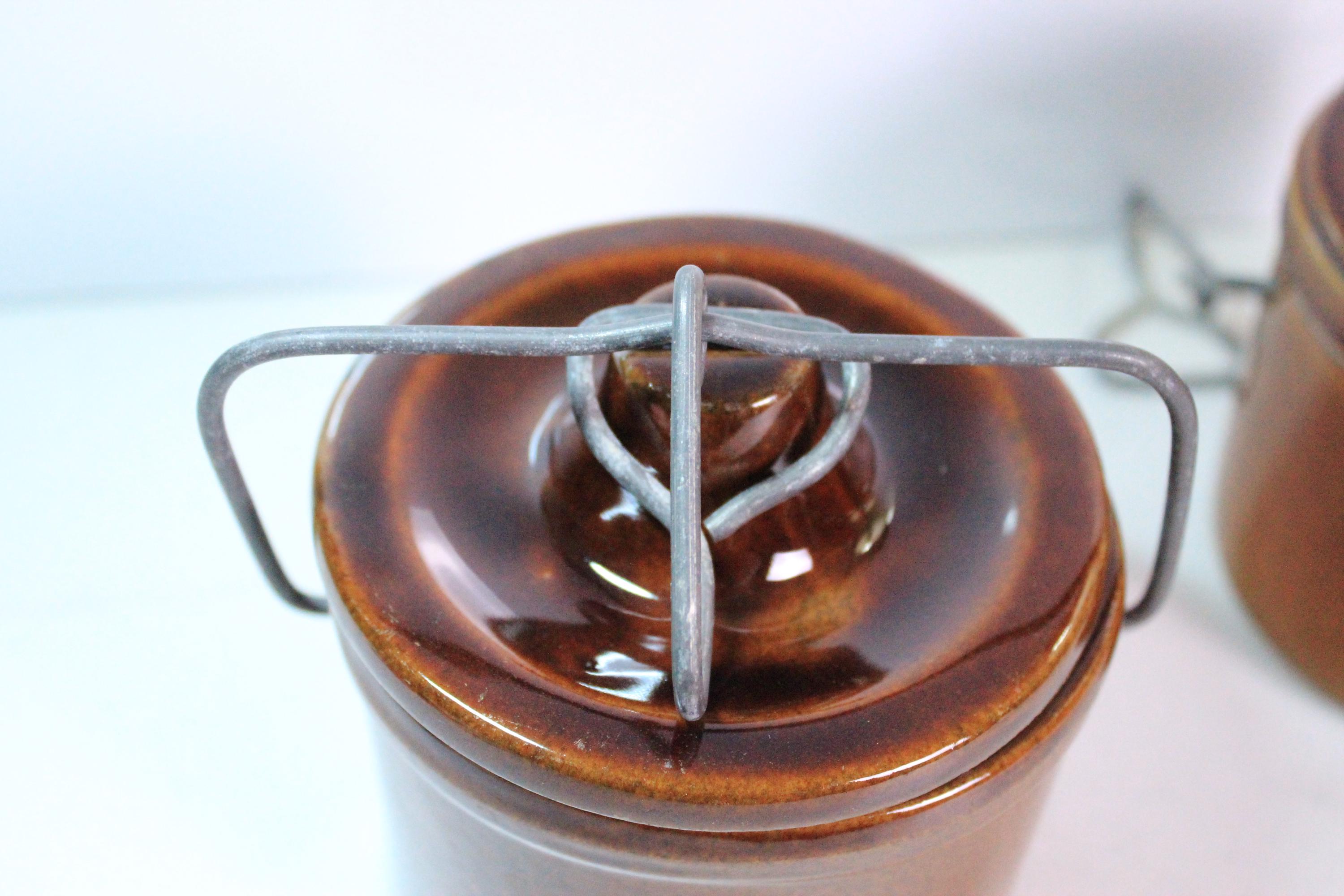 This is a pair of vintage brown stoneware crock with a wire bail lid, often used for cheese, butter, or jam. They glazed in a rich, dark brown finish. The tops have metal wire handles that fit on the knobbed lids. One of the crocks wire handle does not securely latch the crock lid, although it is all intact and will stay in place. There are no cracks, chips, or crazing. These are in very good pre-loved condition. Please message if you need a different level of shipping or carrier.