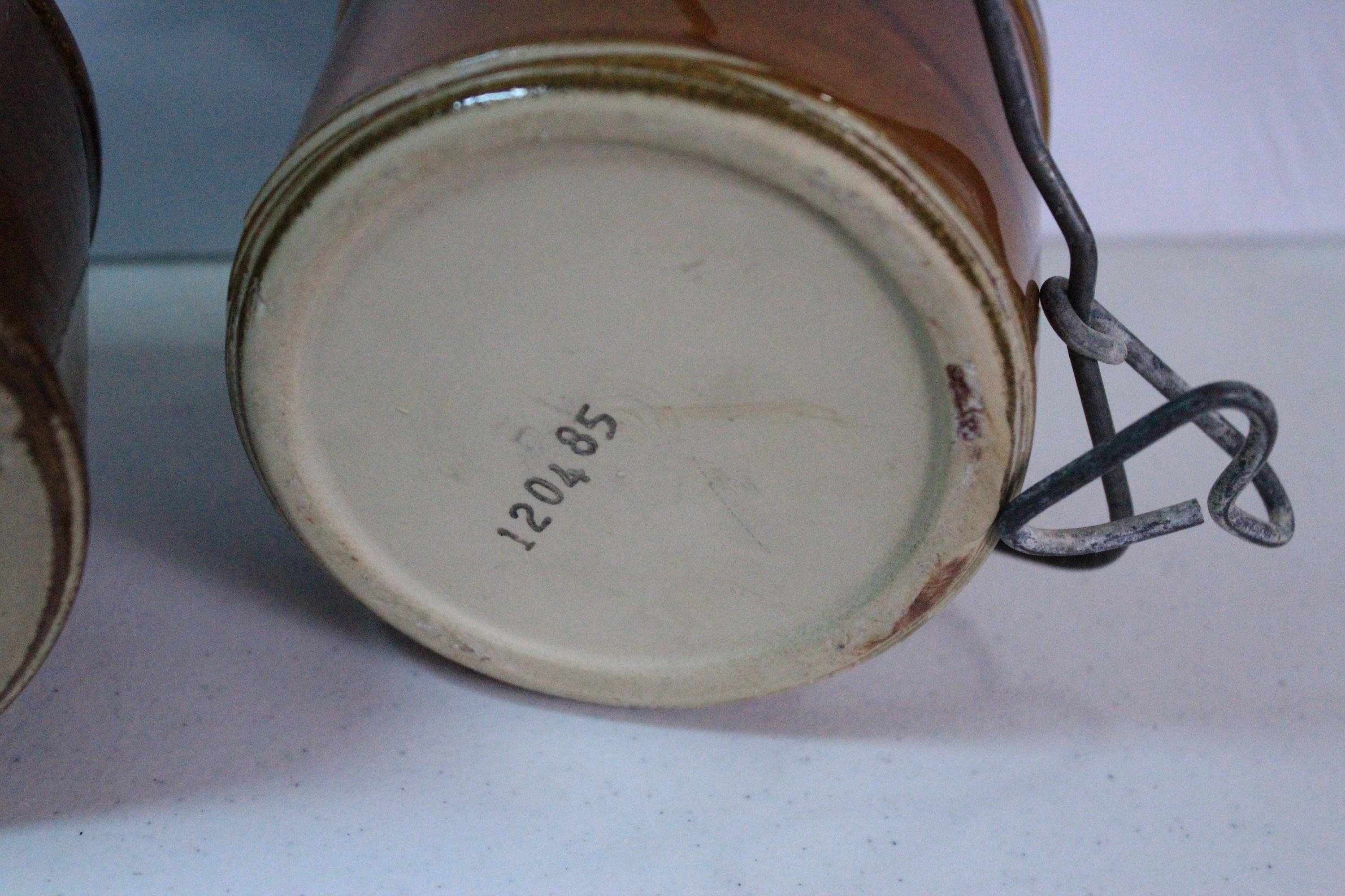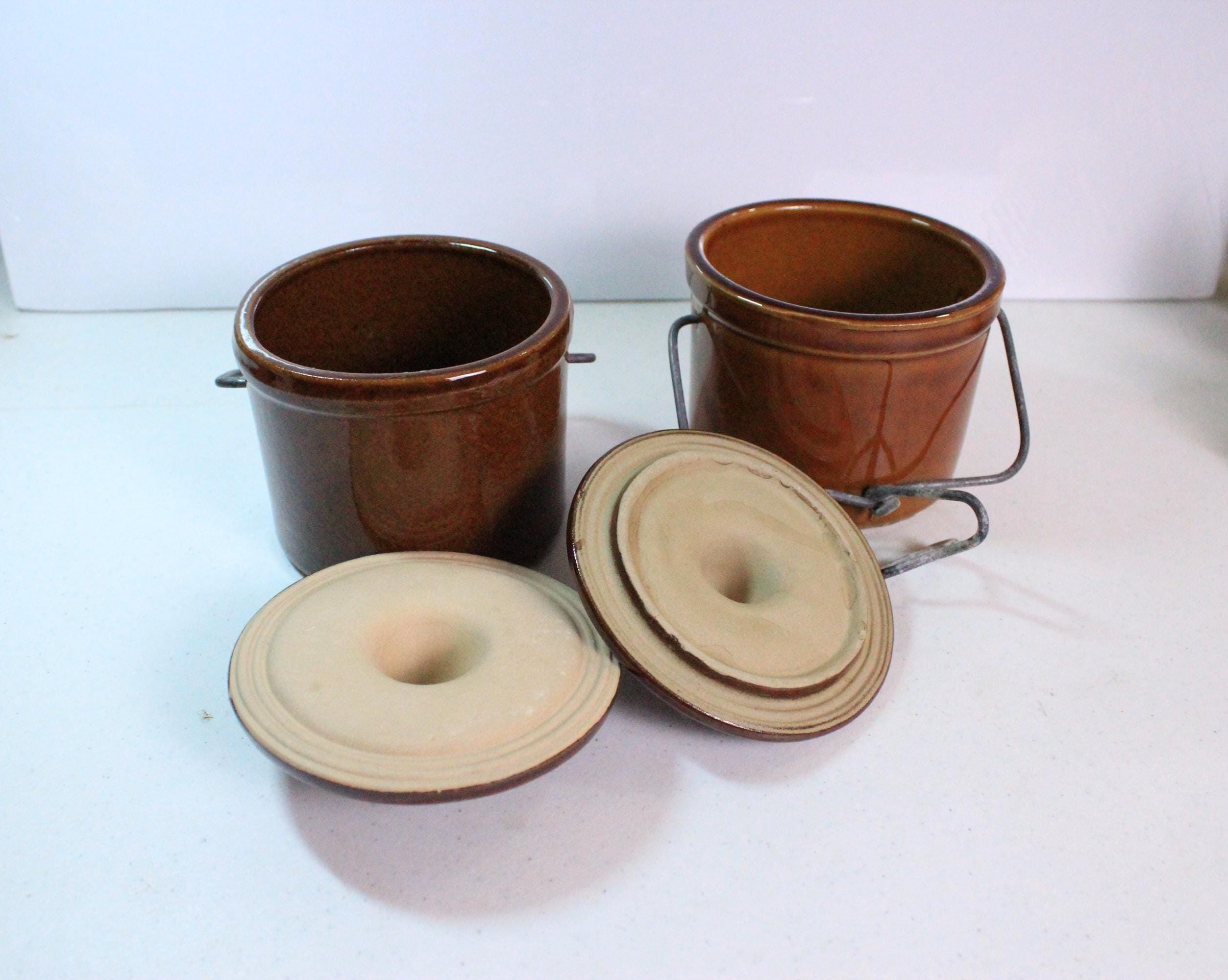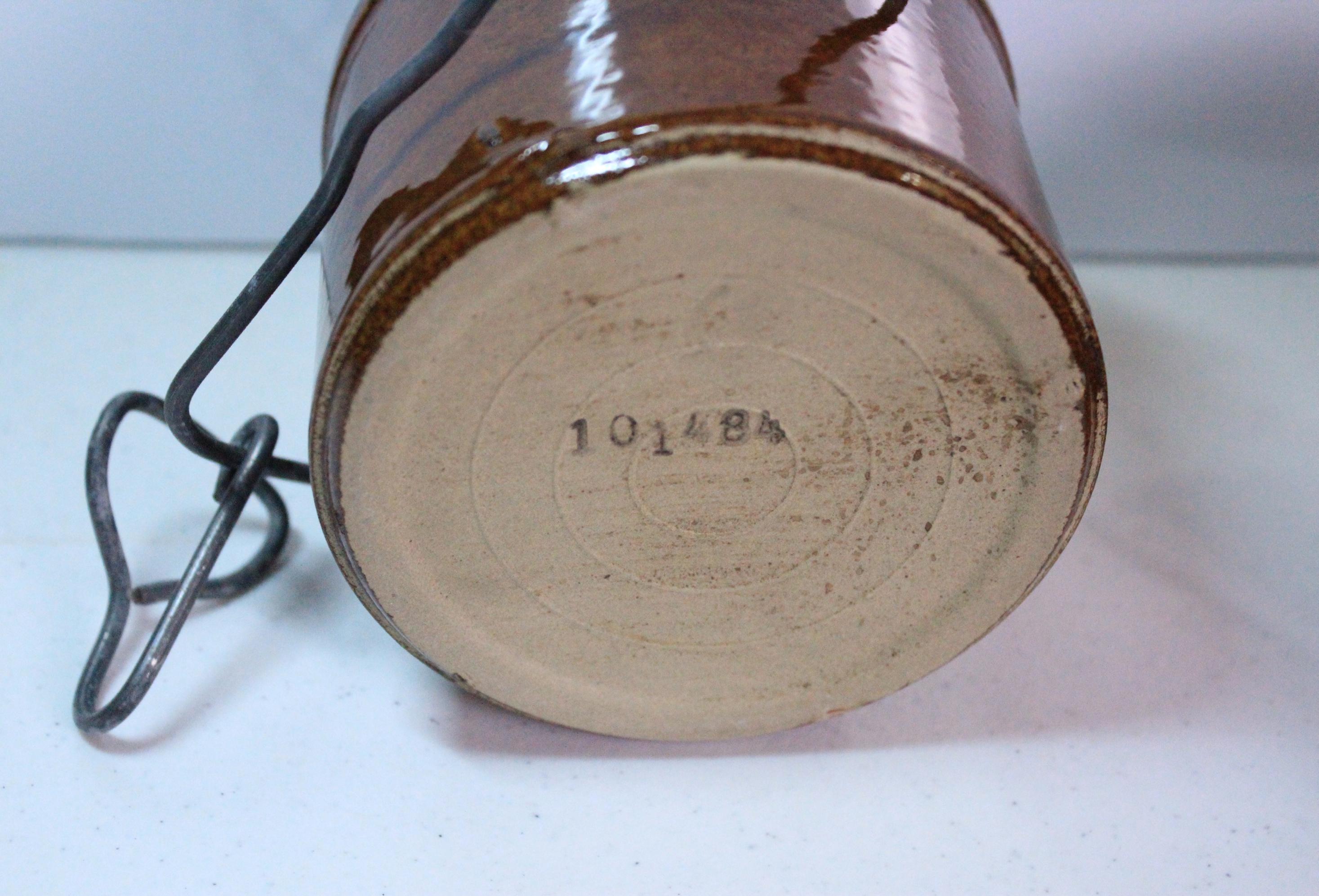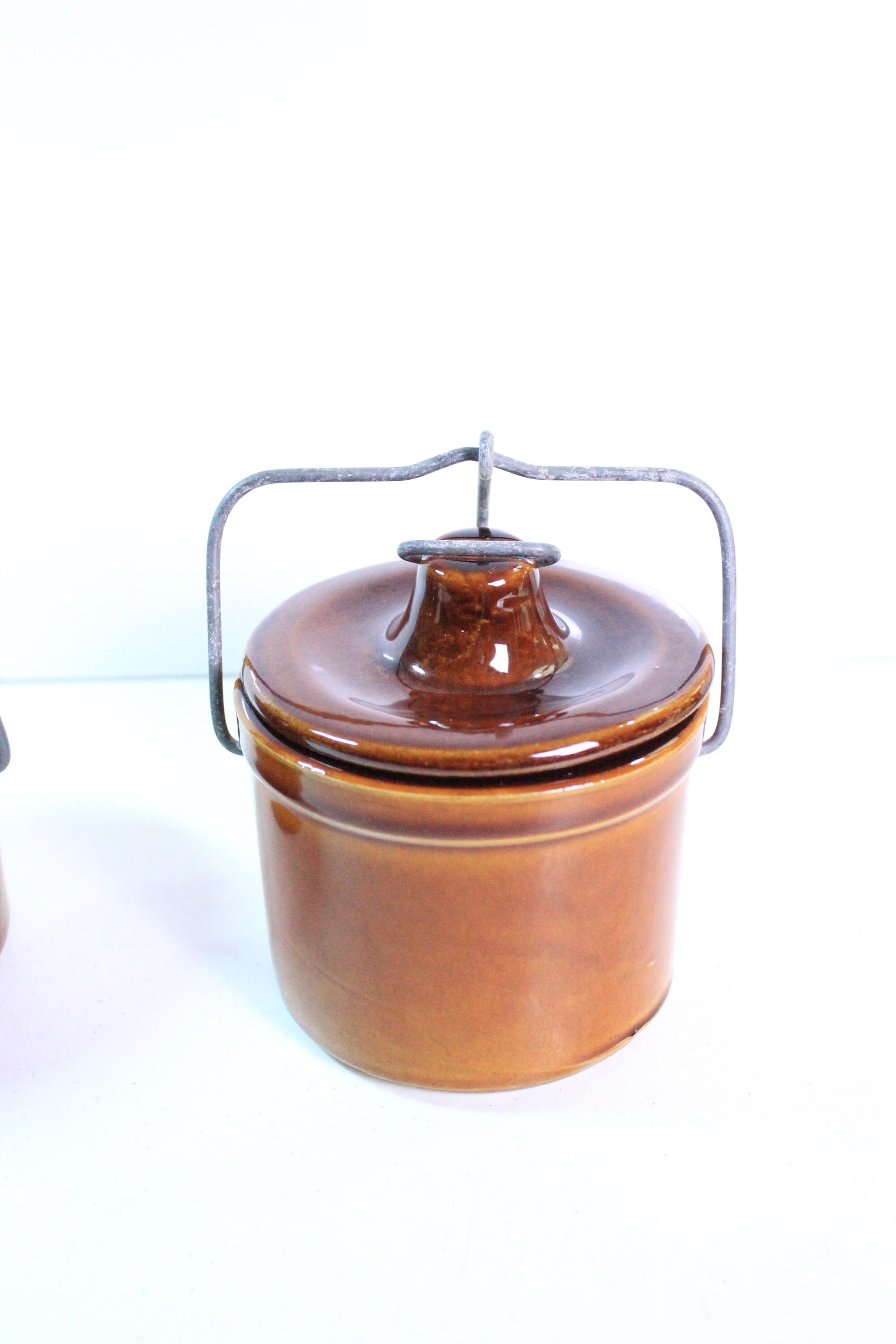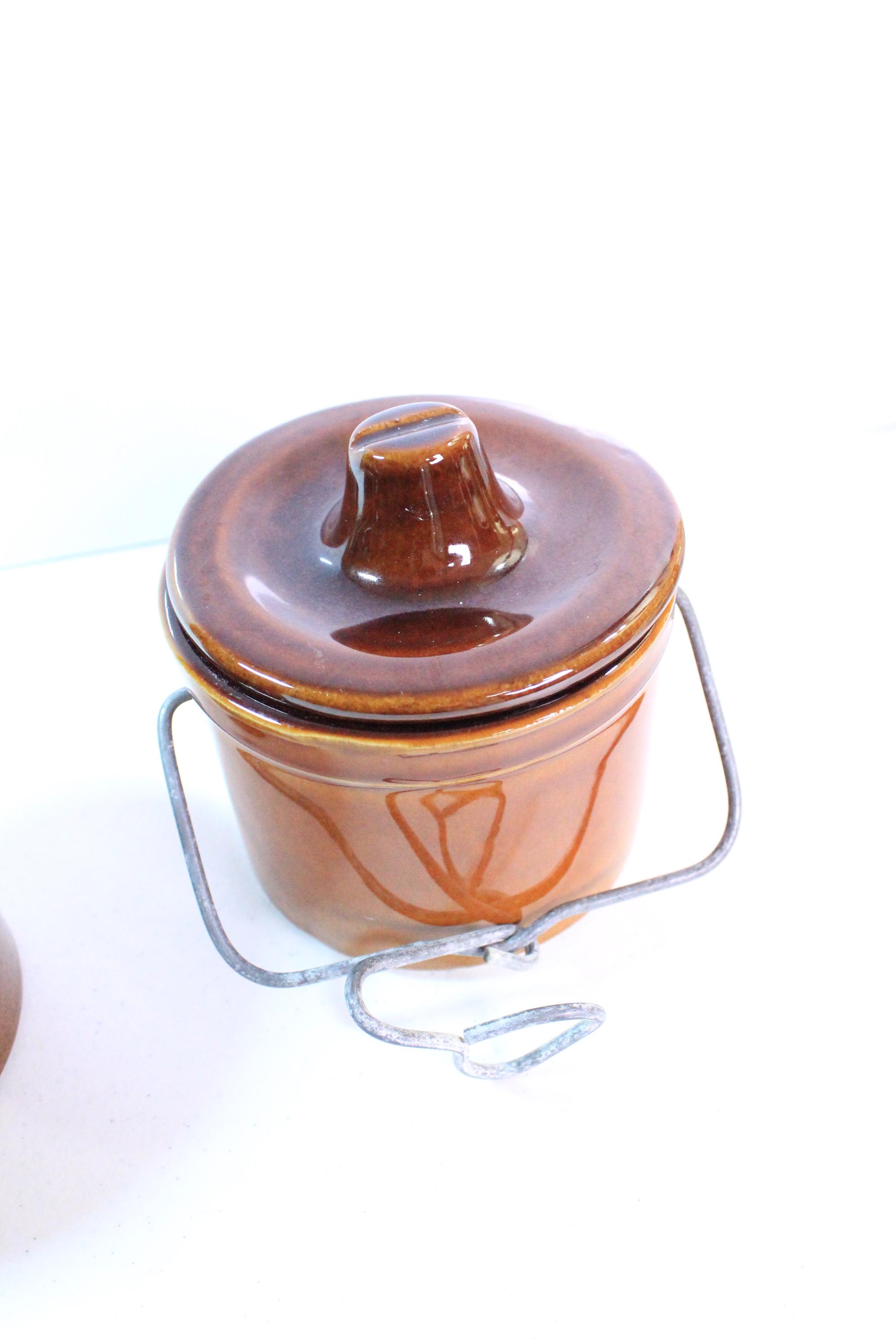 This is a pair of vintage brown stoneware crock with a wire bail lid, often used for cheese, butter, or jam. They glazed in a rich, dark brown finish. The tops have metal wire handles that fit on the knobbed lids. One of the crocks wire handle does not securely latch the crock lid, although it is all intact and will stay in place. There are no cracks, chips, or crazing. These are in very good pre-loved condition. Please message if you need a different level of shipping or carrier.