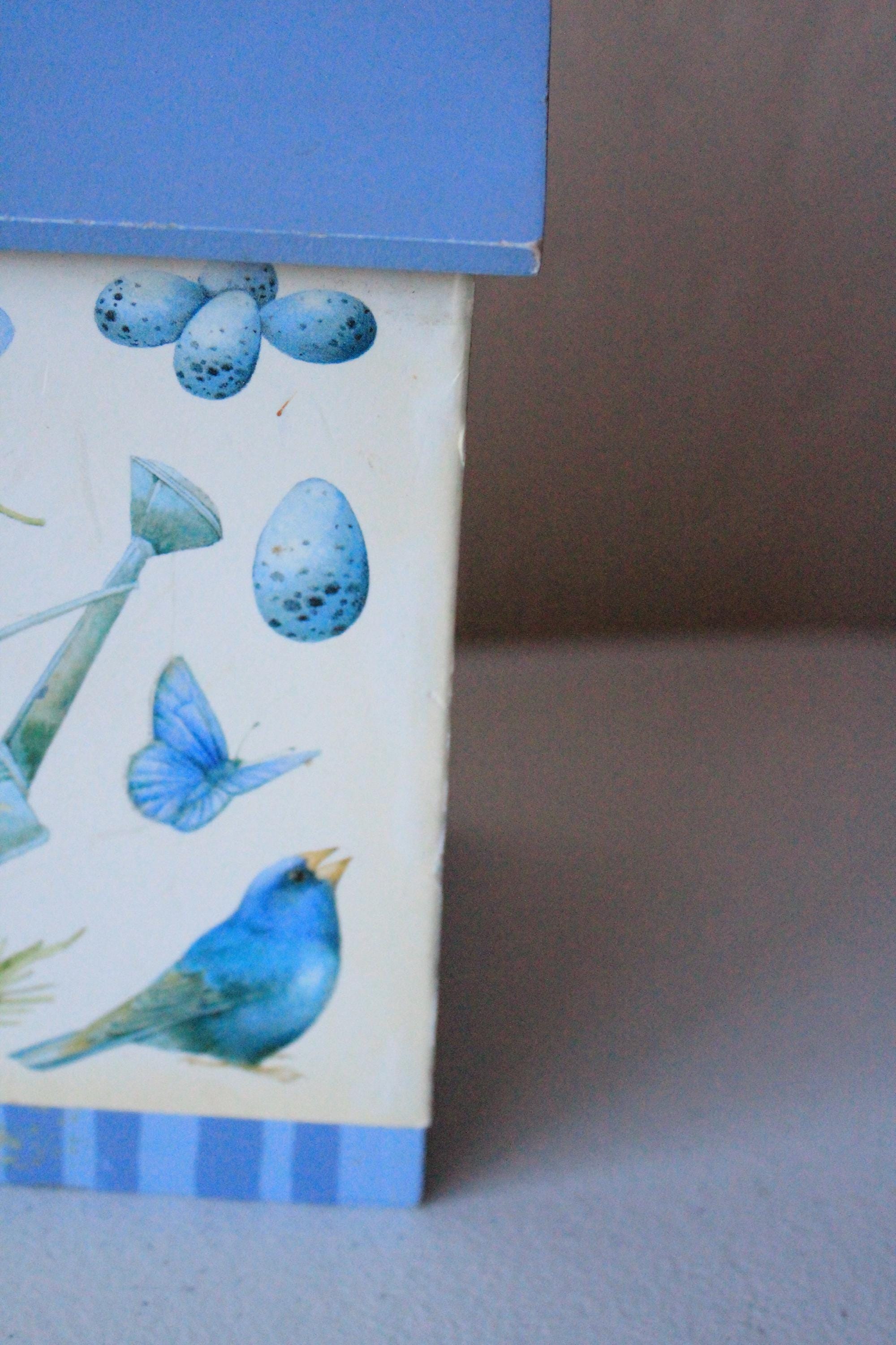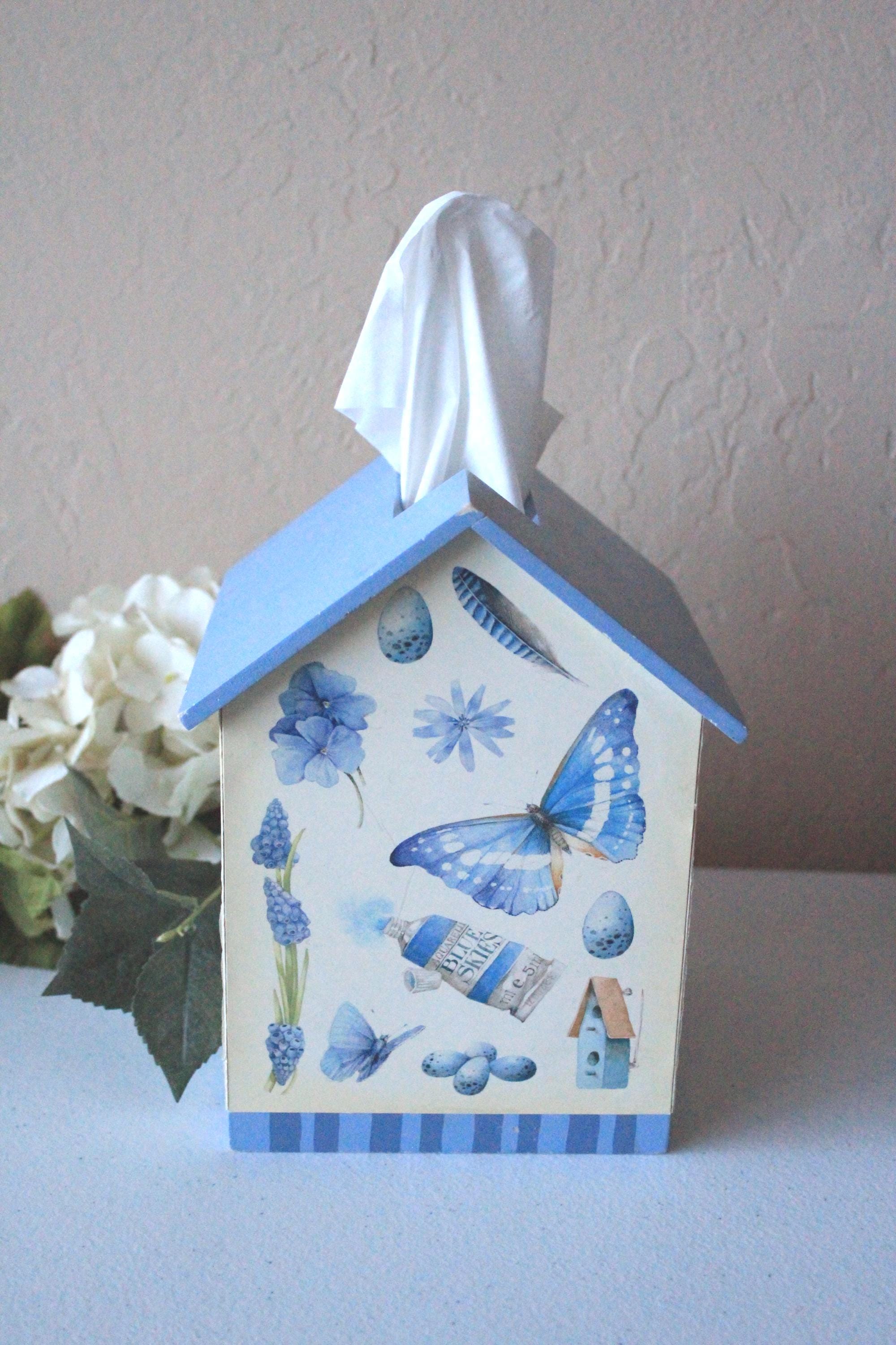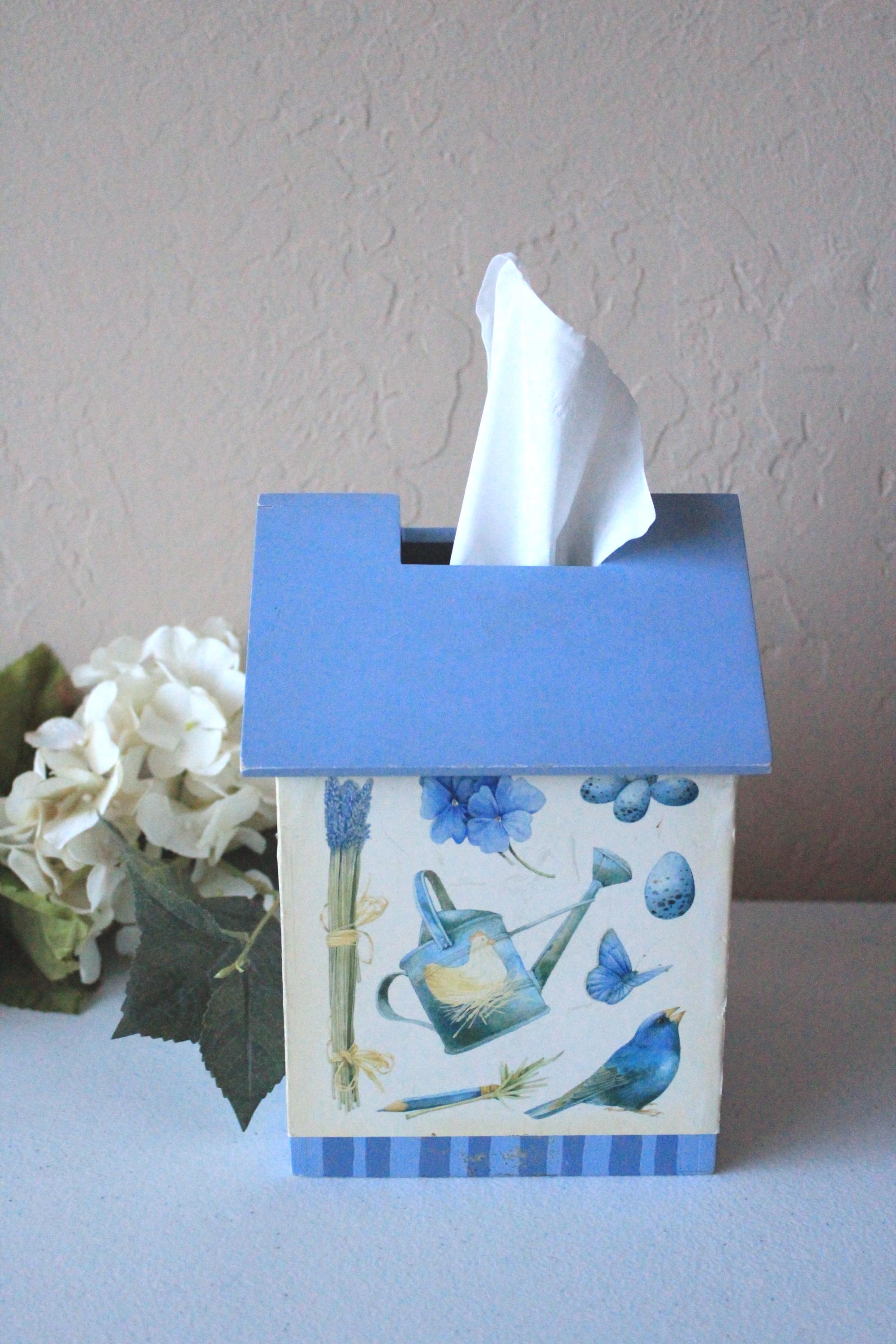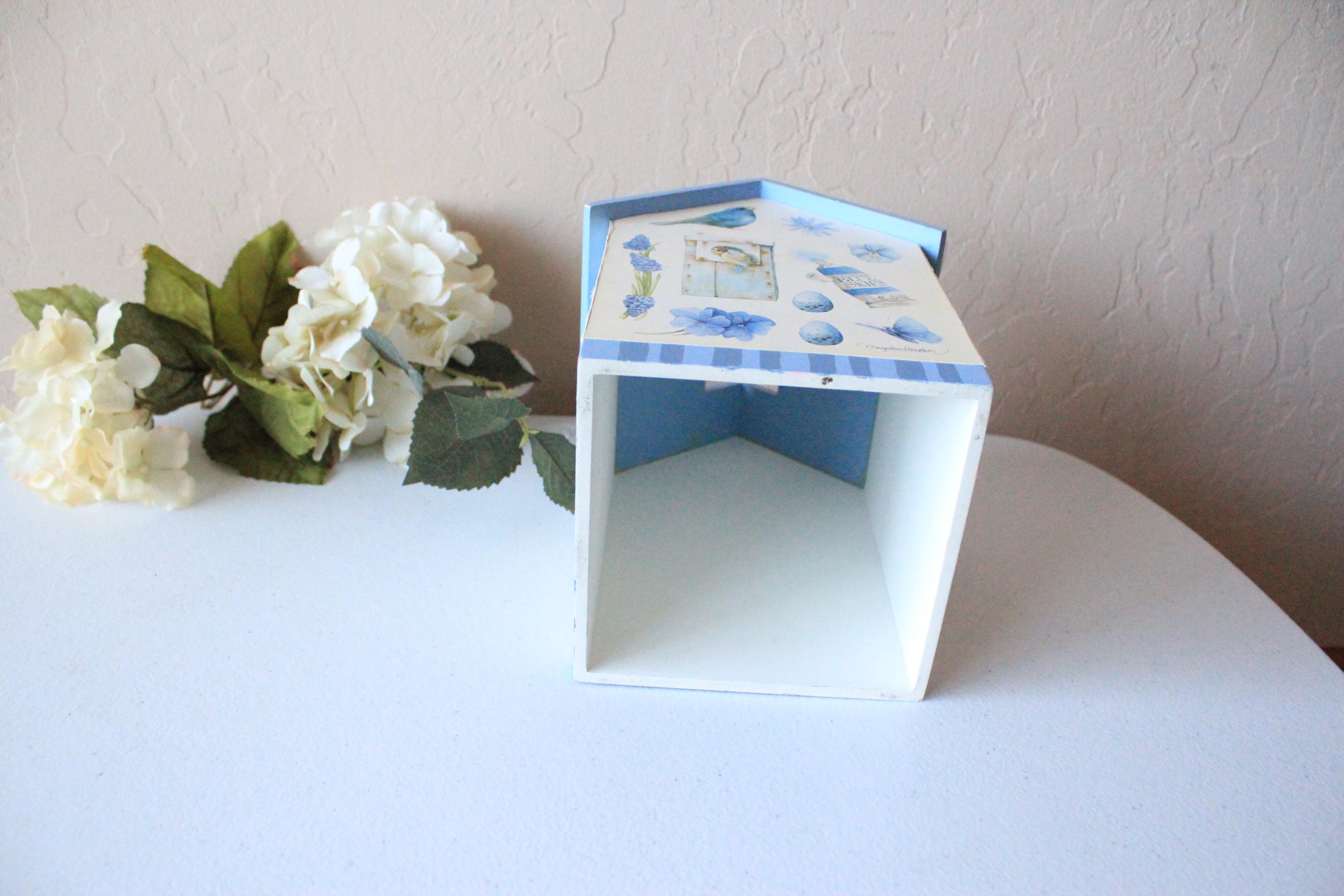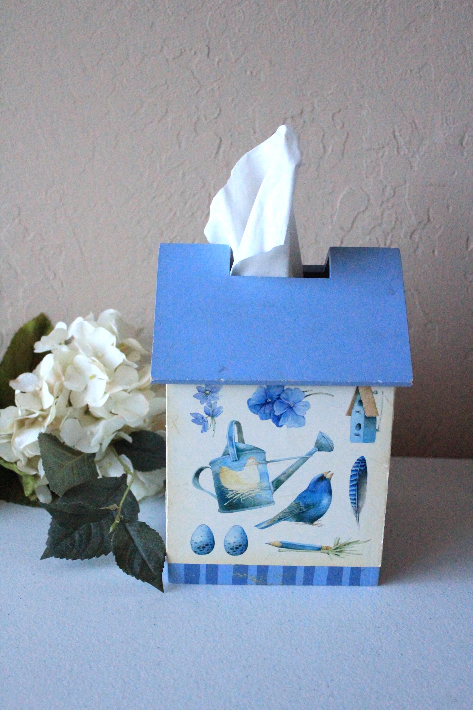 This vintage tissue box features bluebird and floral art by Marjolein Baskin. It is a wood box with designer paper and blue painted "roof". Each side has a different floral, bird, or butterfly design. It fits over a standard cube tissue box. It is in very good, display ready, but not perfect condition, due to some minor wear over the years. Please review photos and message if you have any questions or concerns.