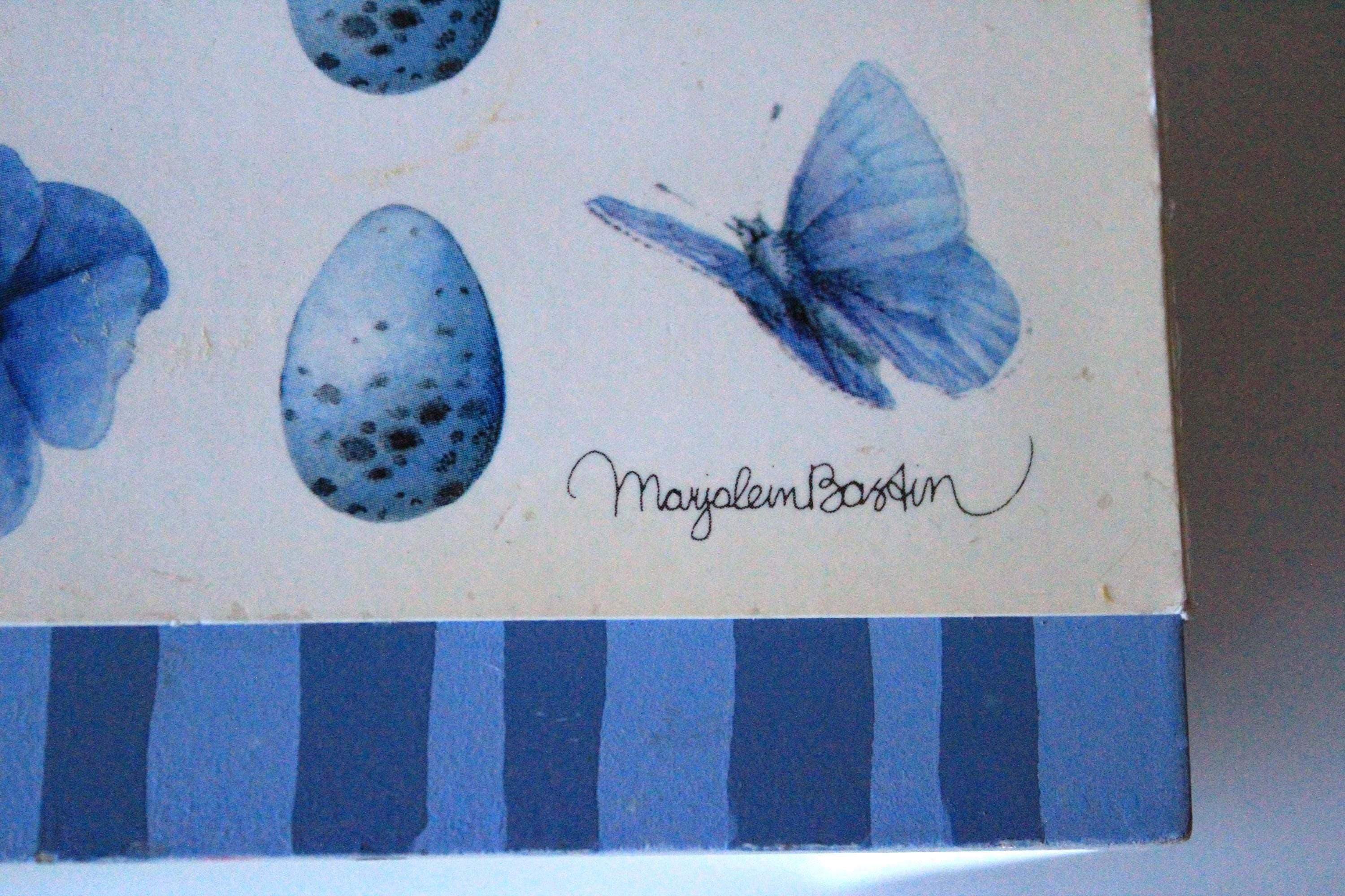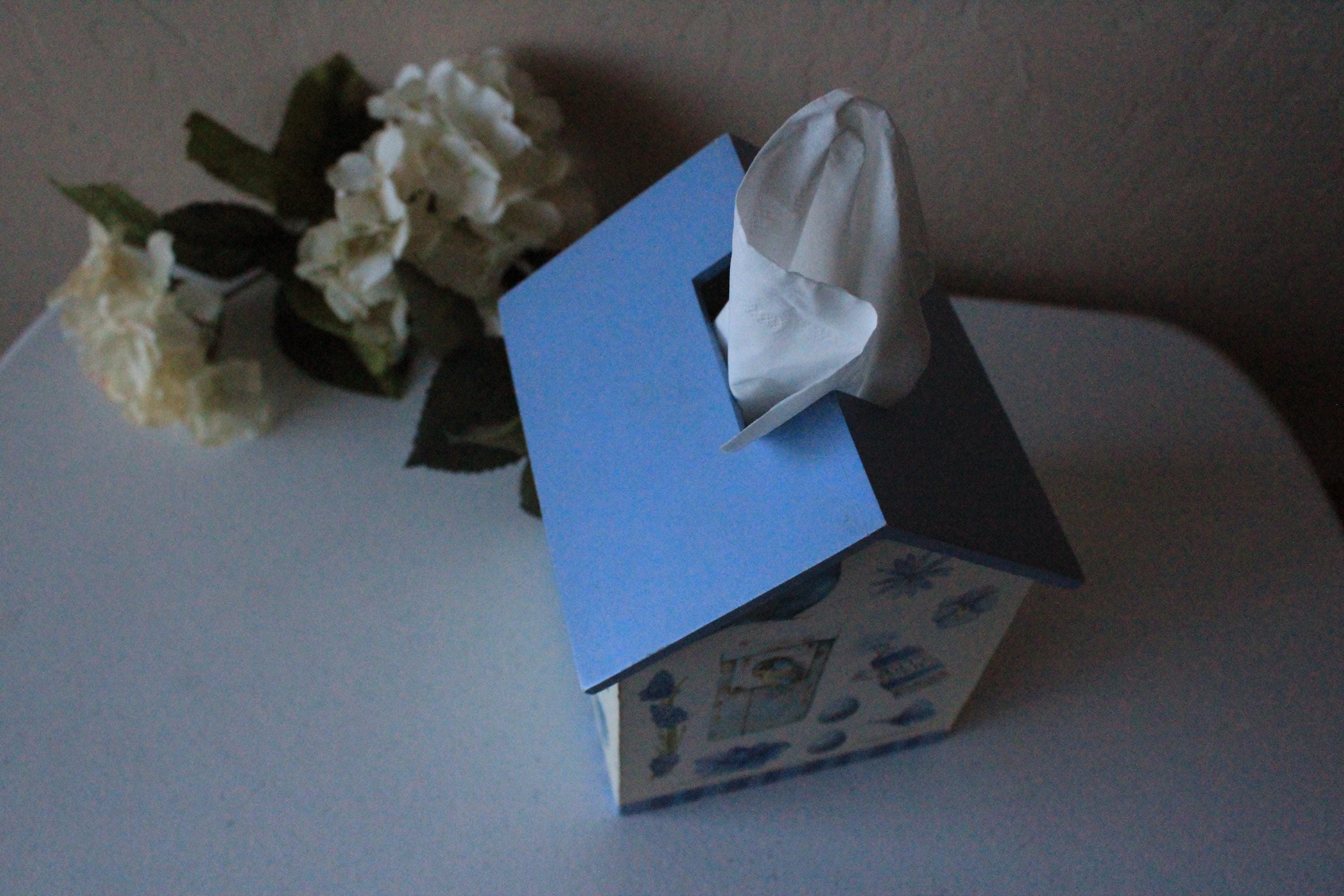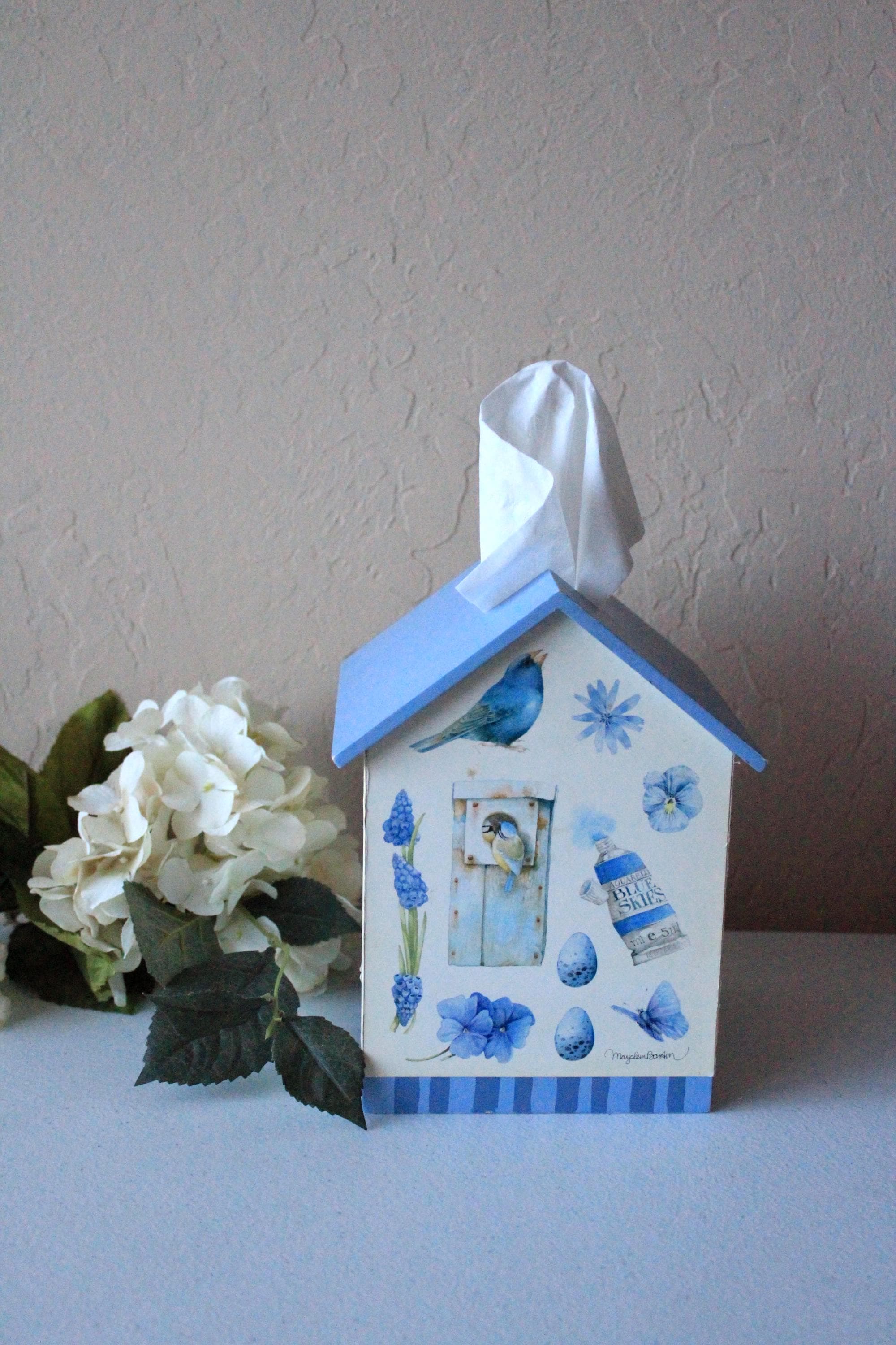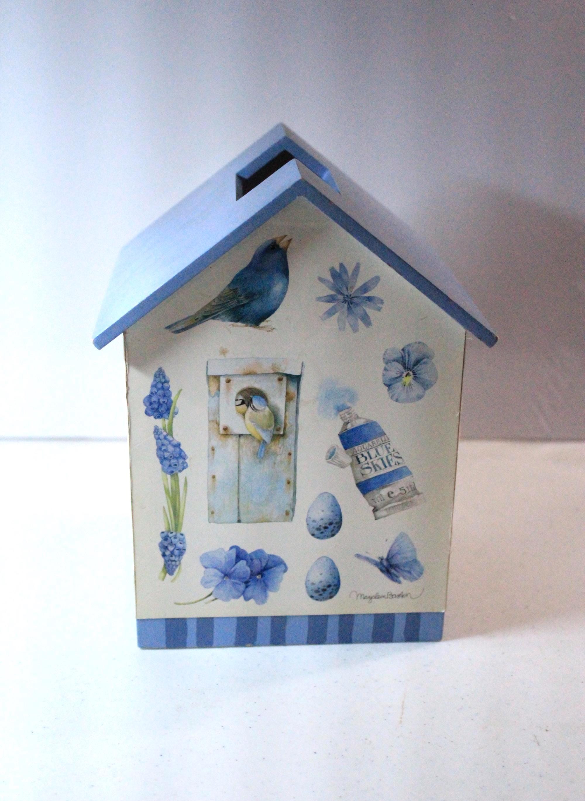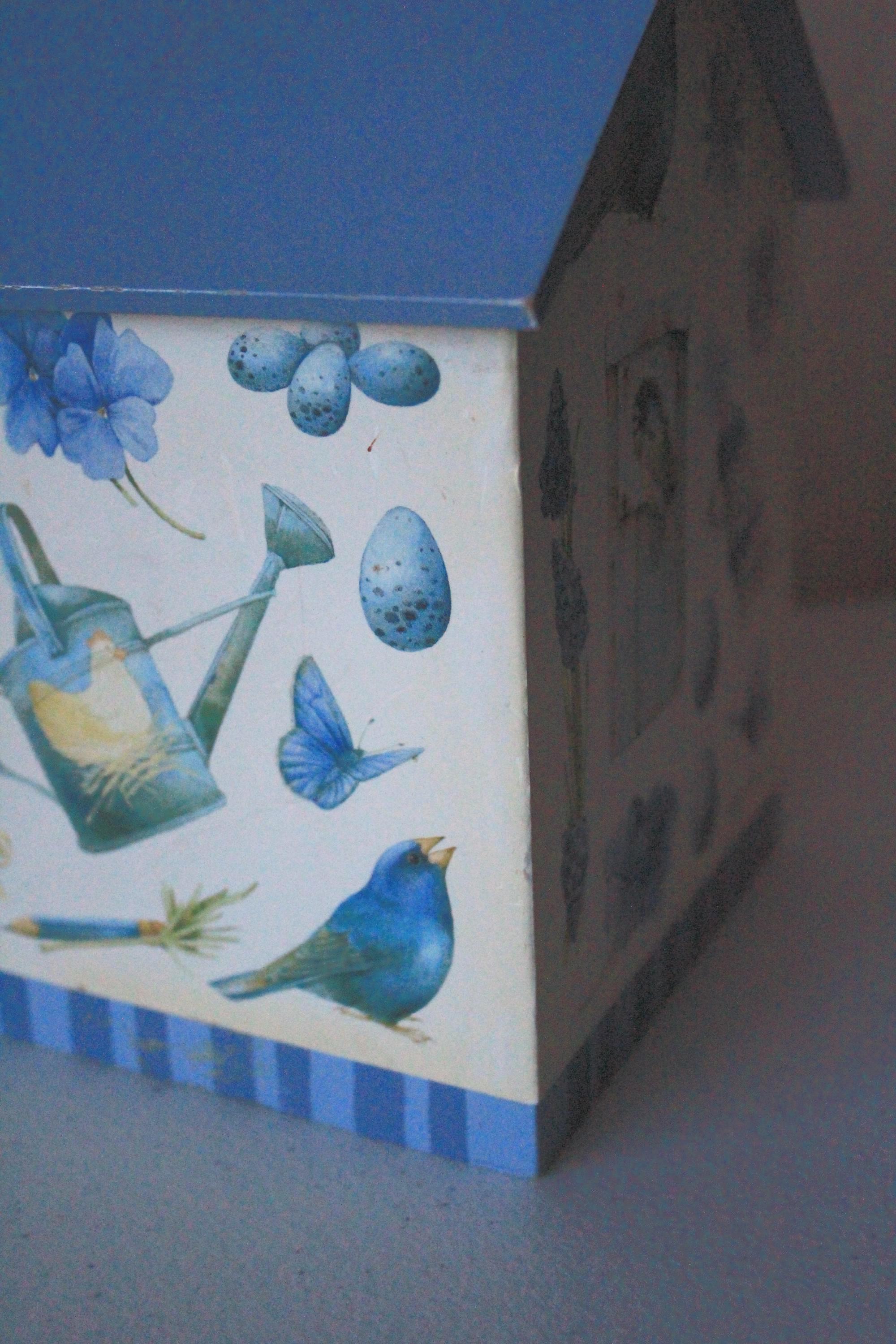 This vintage tissue box features bluebird and floral art by Marjolein Baskin. It is a wood box with designer paper and blue painted "roof". Each side has a different floral, bird, or butterfly design. It fits over a standard cube tissue box. It is in very good, display ready, but not perfect condition, due to some minor wear over the years. Please review photos and message if you have any questions or concerns.