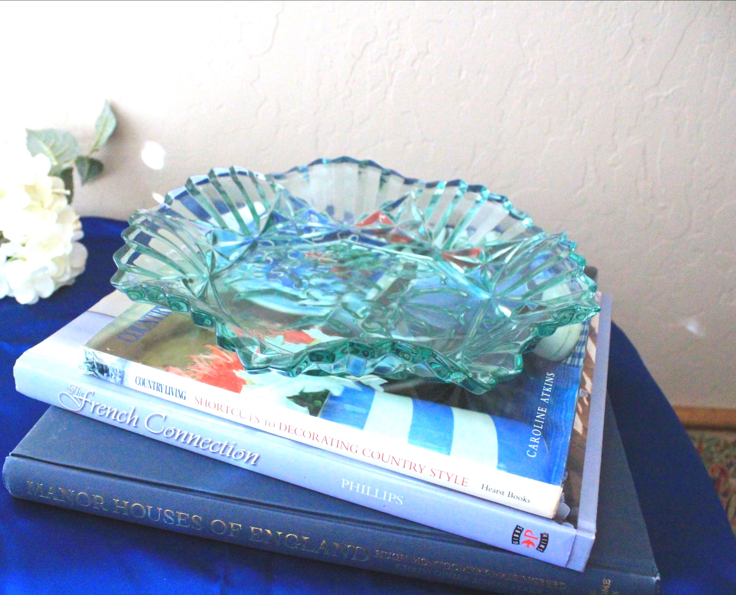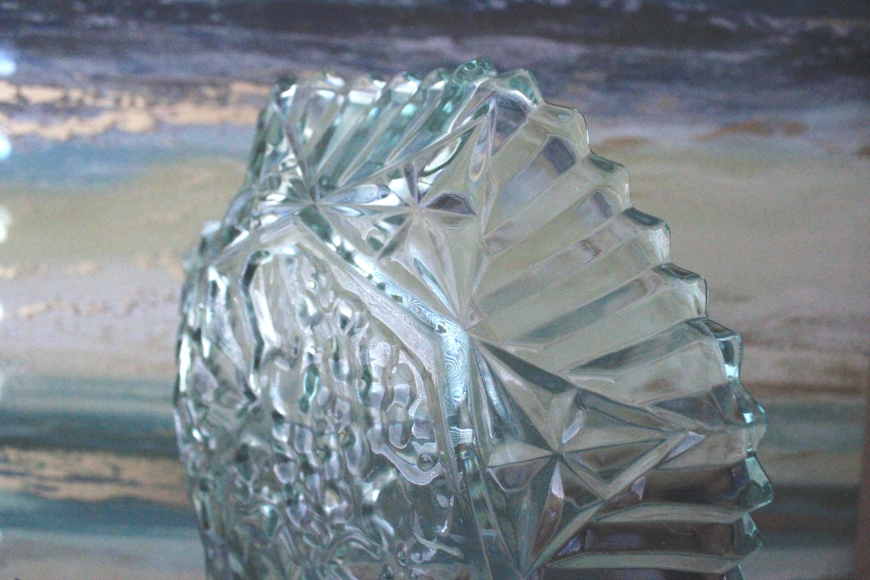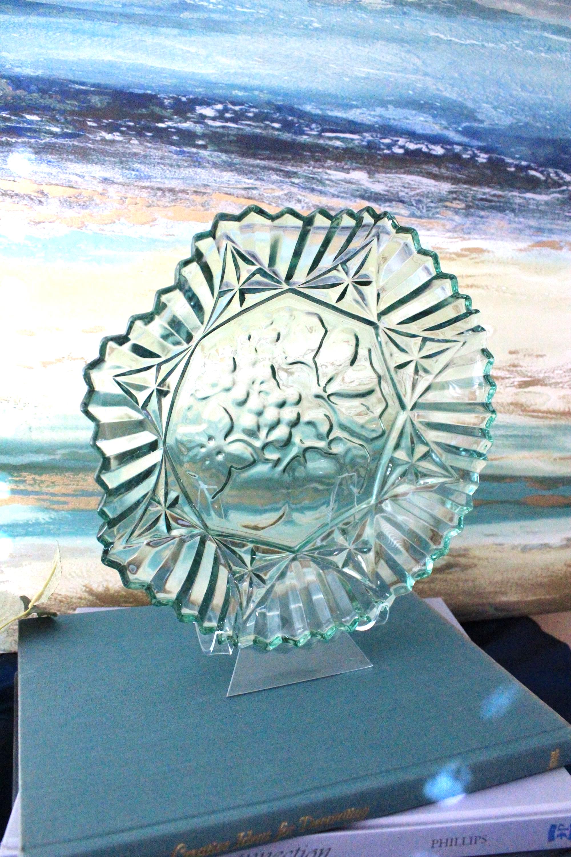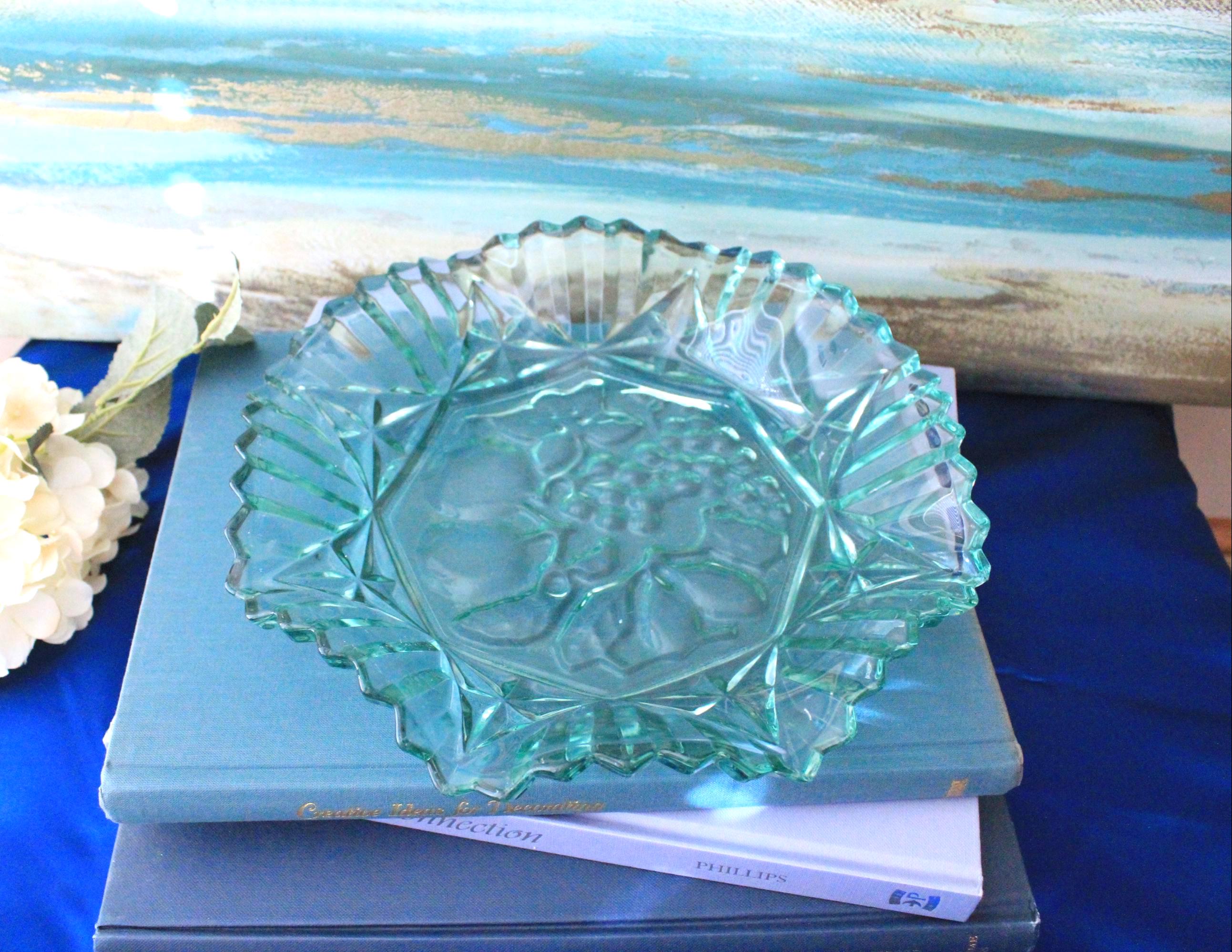 Vintage Glass Bowl with Fruit Motif is made by Federal Glass Company. It is 11 inches in diameter and a shallow 2 inches deep. Beautiful visual interest with it's ruffled pleated edges as a decor piece and is functional as a serving bowl or other use. Made in sought after light green translucent glass with wavy edges and cut design is pleasing to the eye. Has one shallow chip 3/16 of an inch on the edge but is not alter the shape or aesthetic of the edge. It is shown in the photo with white background. Please message for additional photos or questions. Very good pre-loved vintage condition.
