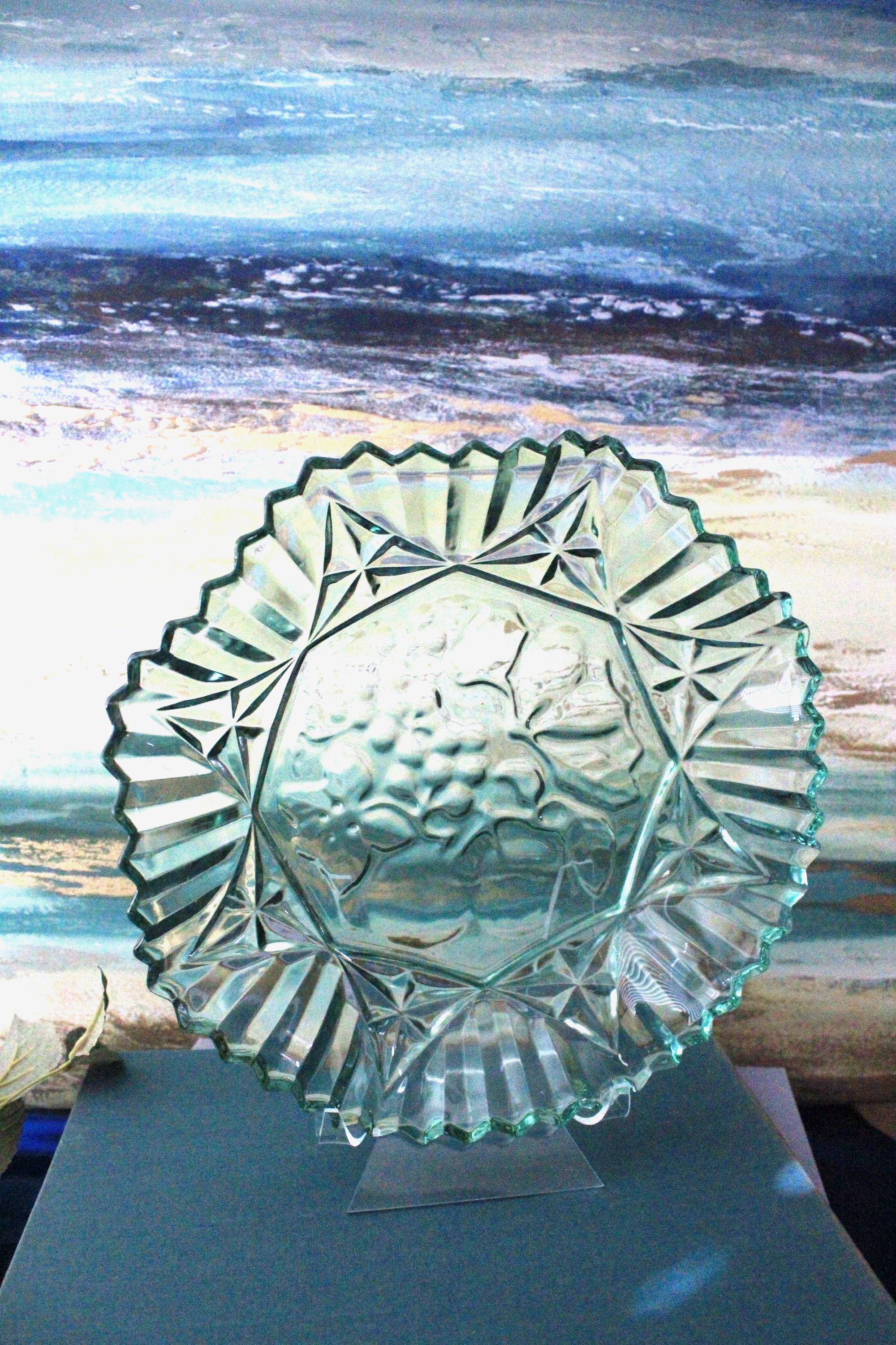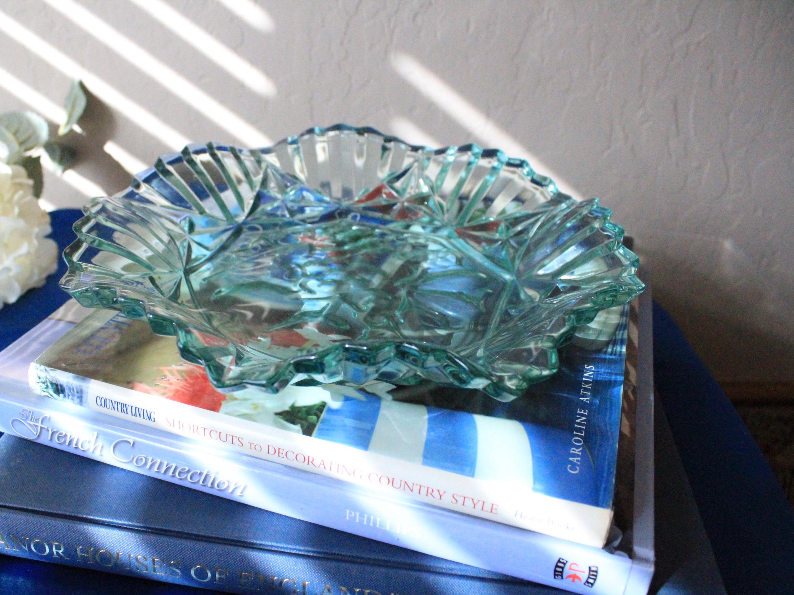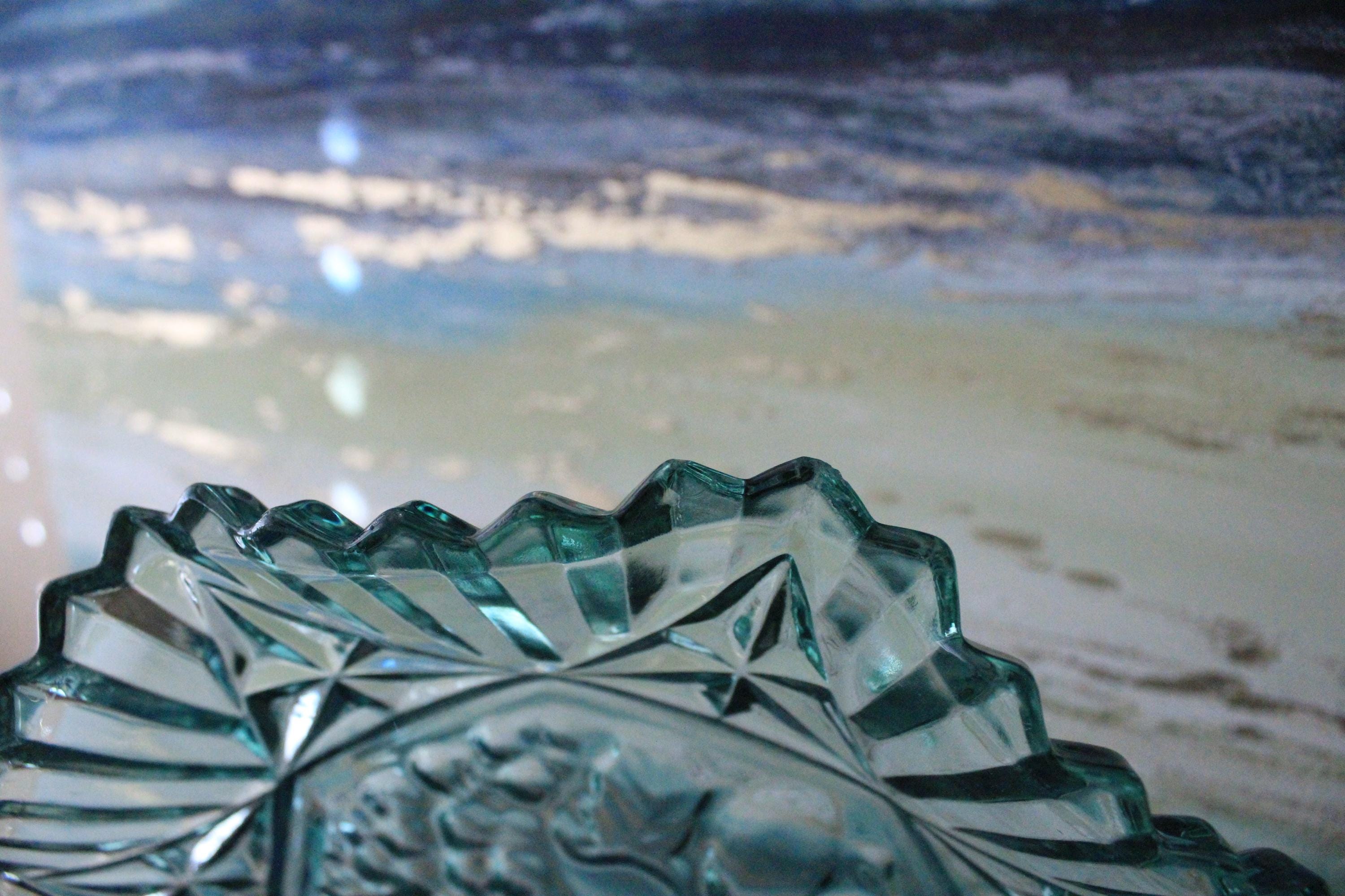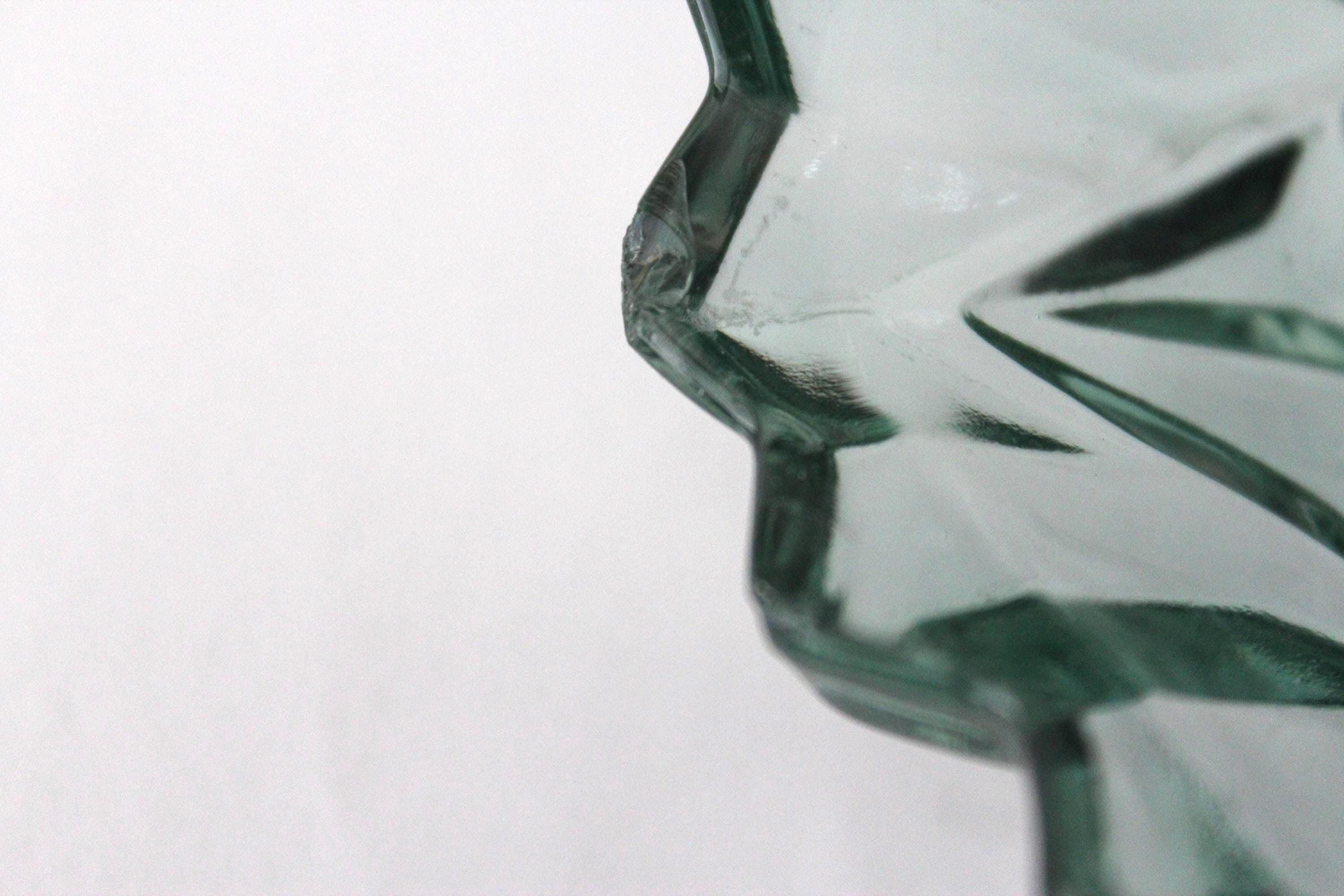 Vintage Glass Bowl with Fruit Motif is made by Federal Glass Company. It is 11 inches in diameter and a shallow 2 inches deep. Beautiful visual interest with it's ruffled pleated edges as a decor piece and is functional as a serving bowl or other use. Made in sought after light green translucent glass with wavy edges and cut design is pleasing to the eye. Has one shallow chip 3/16 of an inch on the edge but is not alter the shape or aesthetic of the edge. It is shown in the photo with white background. Please message for additional photos or questions. Very good pre-loved vintage condition.