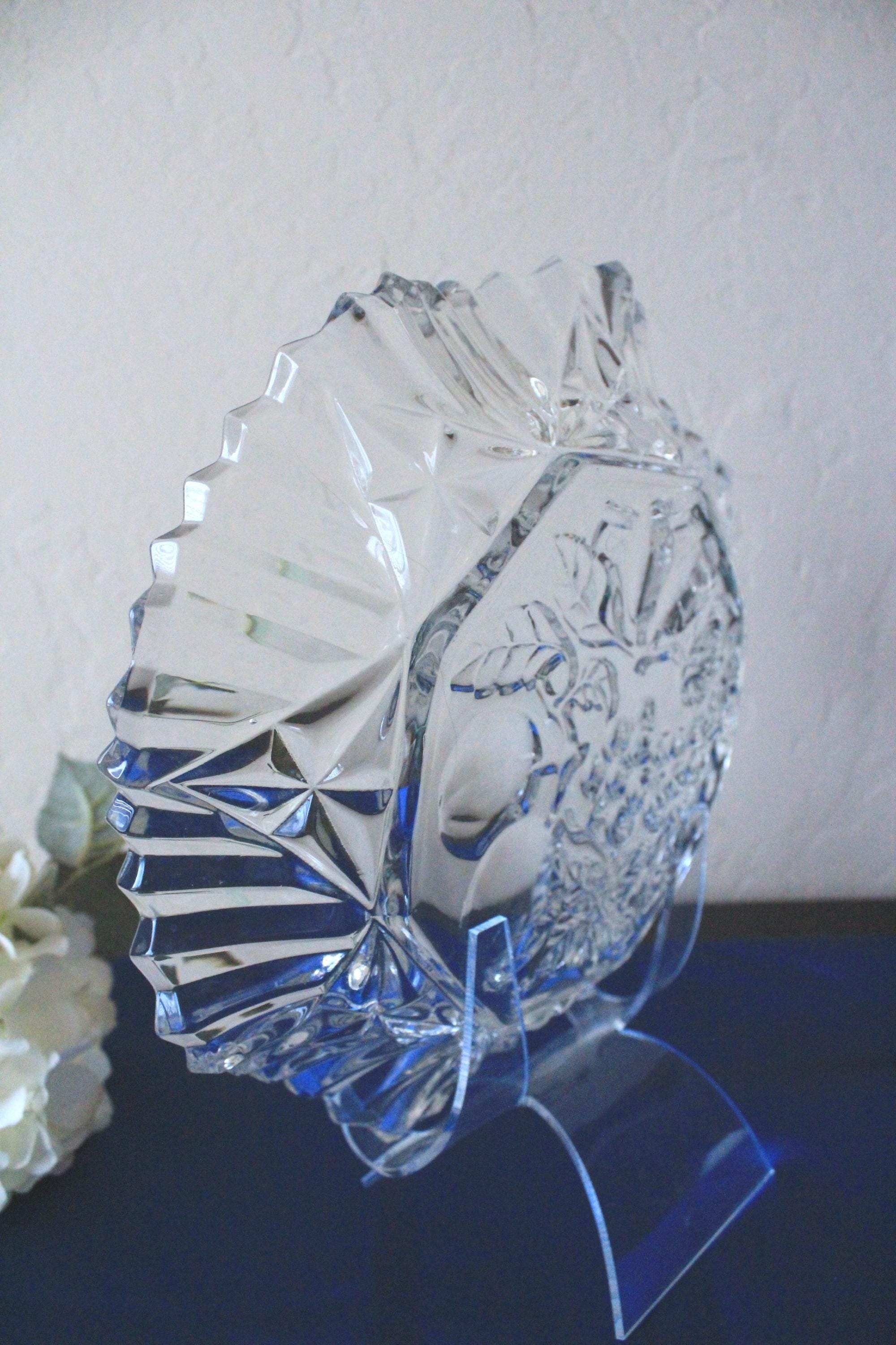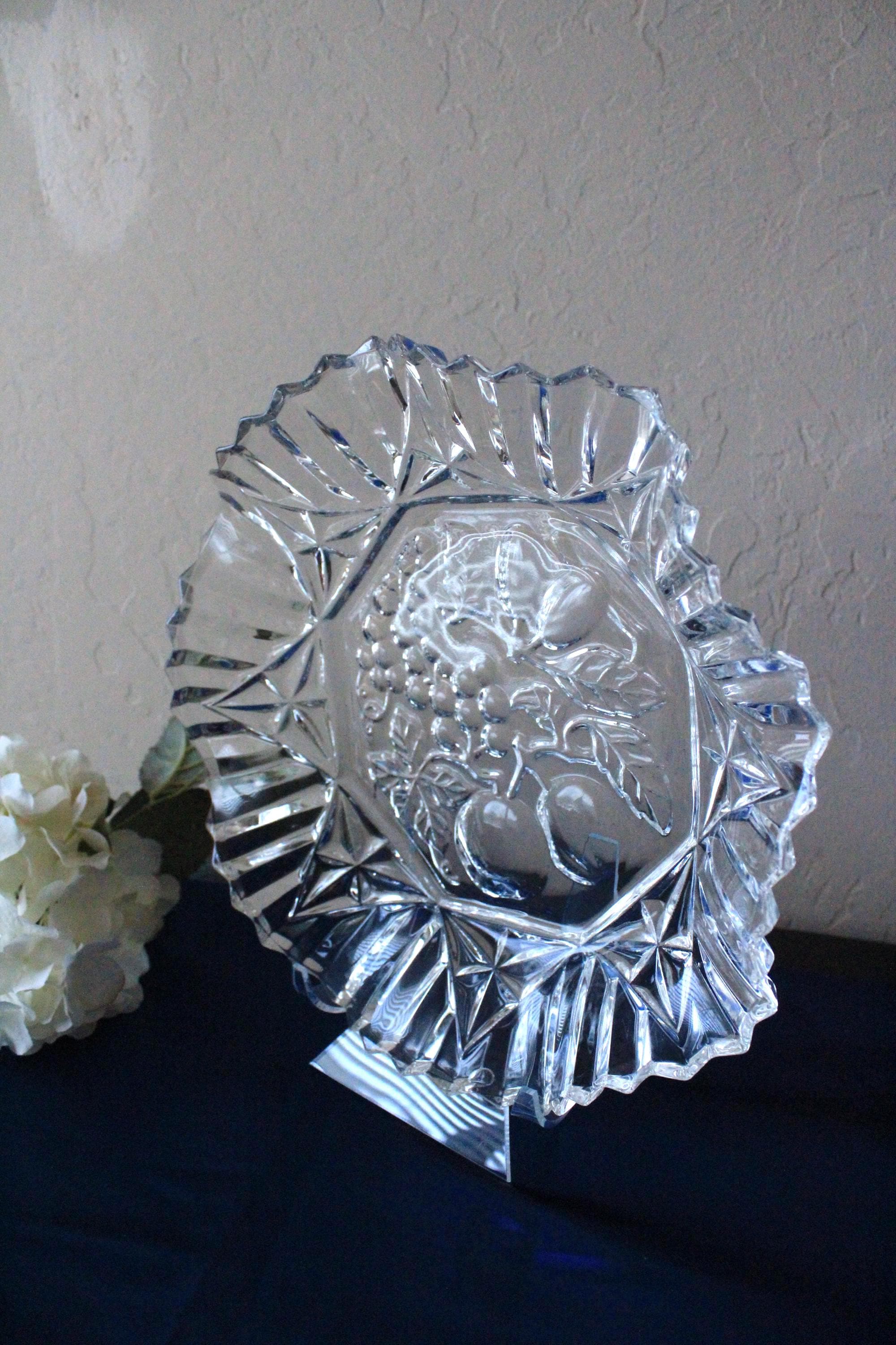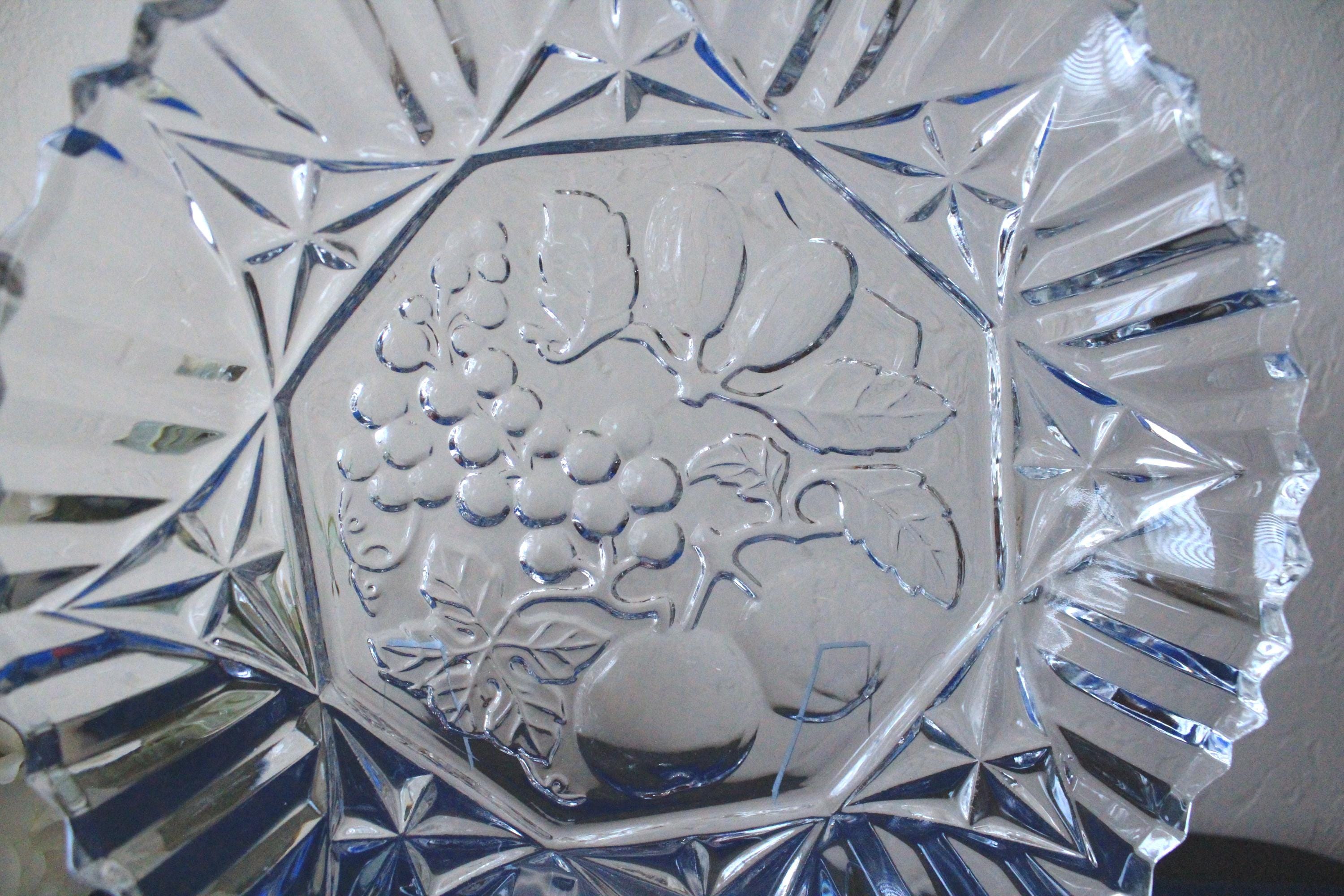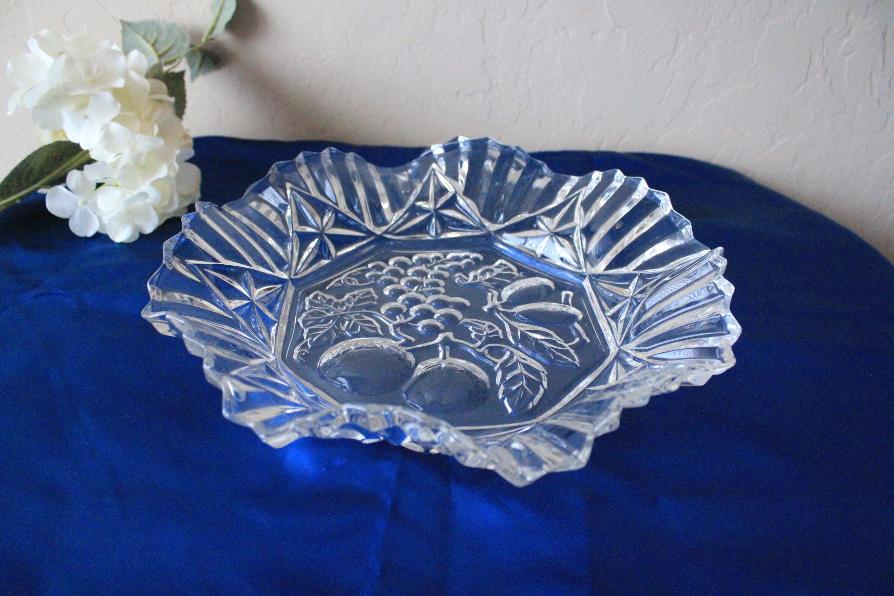Vintage Glass Bowl with Fruit Motif is made by Federal Glass Company. It is 11 inches in diameter and a shallow 2 inches deep. Beautiful visual interest with it's ruffled pleated edges as a decor piece and is functional as a serving bowl or other use. Made in clear translucent glass with wavy edges and cut design is pleasing to the eye. Please message for additional photos or questions. Very good pre-loved vintage condition.