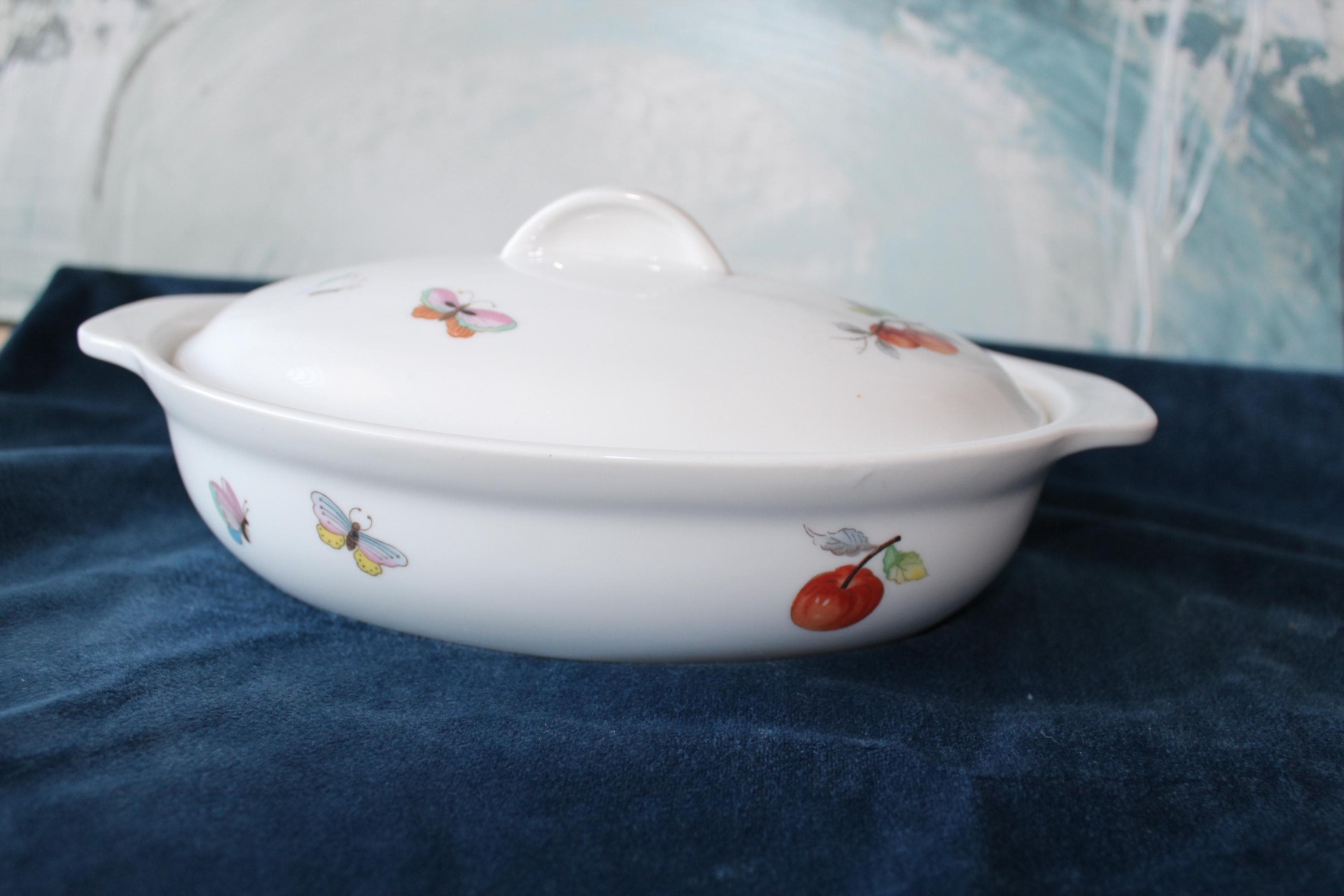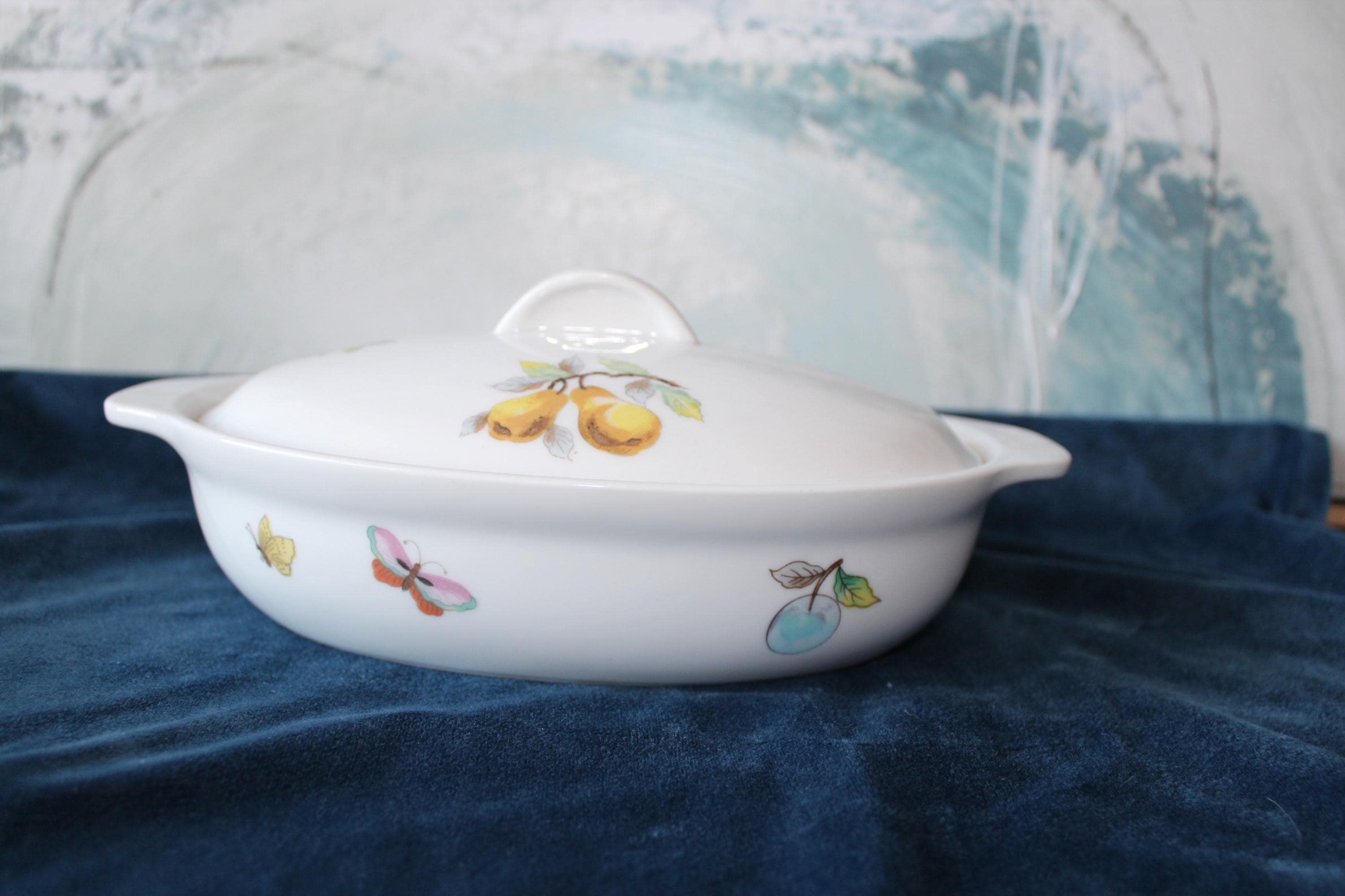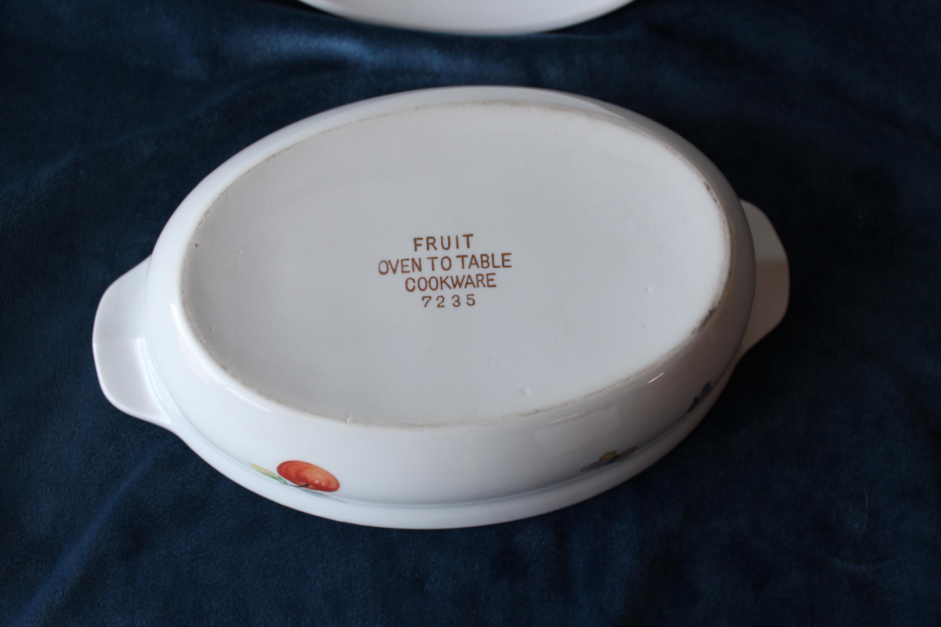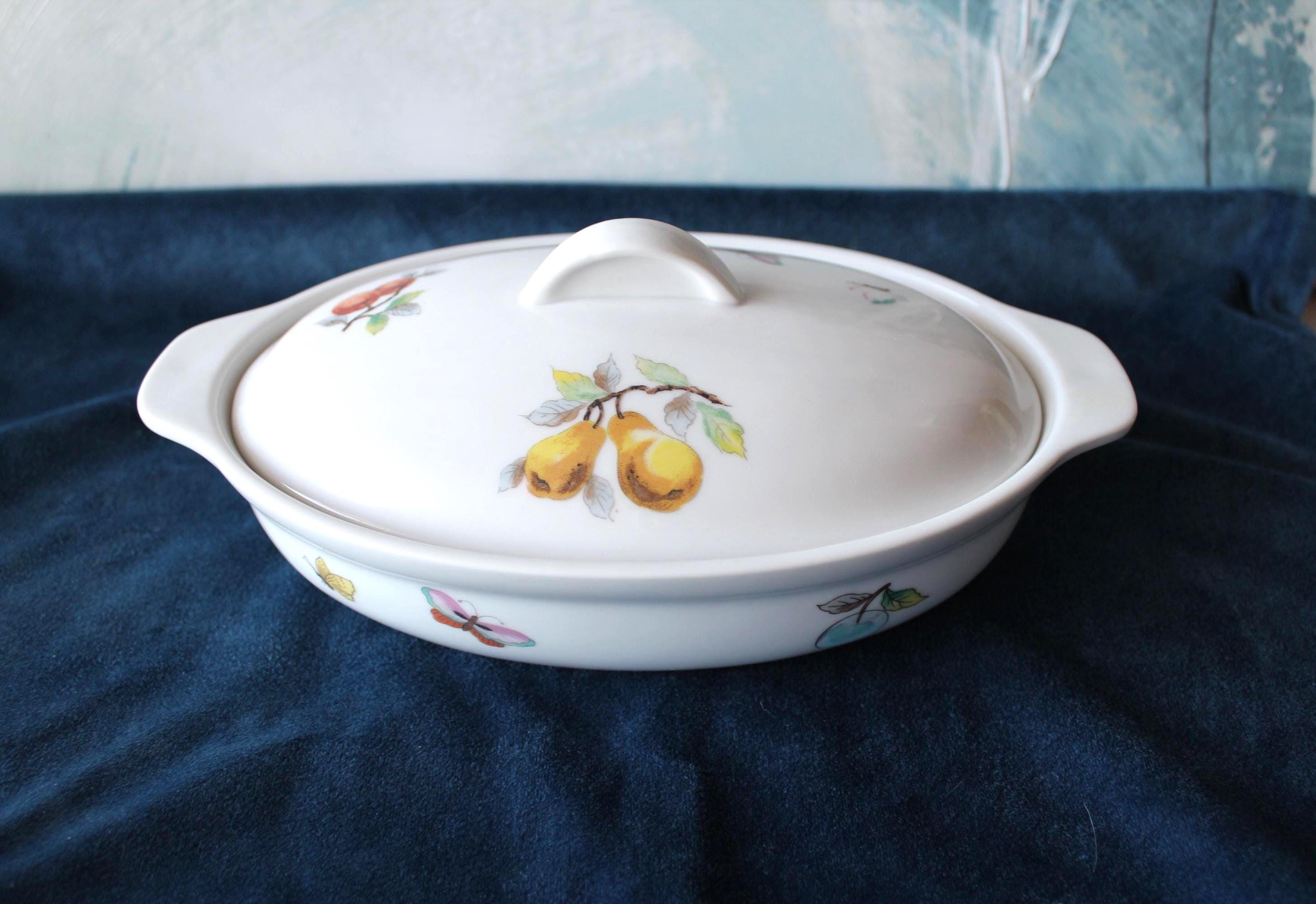Please review all photos and message for questions or additional photos. Vintage Porcelain Casserole Dish Fruit and Butterfly Pattern by Andrea by Sakek. Made in Japan in 1970's. It is designed to go from oven to table. It features a fruit and butterfly design on white background, and has handles and lid. It is numbered 7235 on the bottom. It is 9.5 Inches long and 6 inches wide. Inside is 8 inches by 5.25 inches. It is in excellent condition, no chips, cracks, or scratches that I can find.