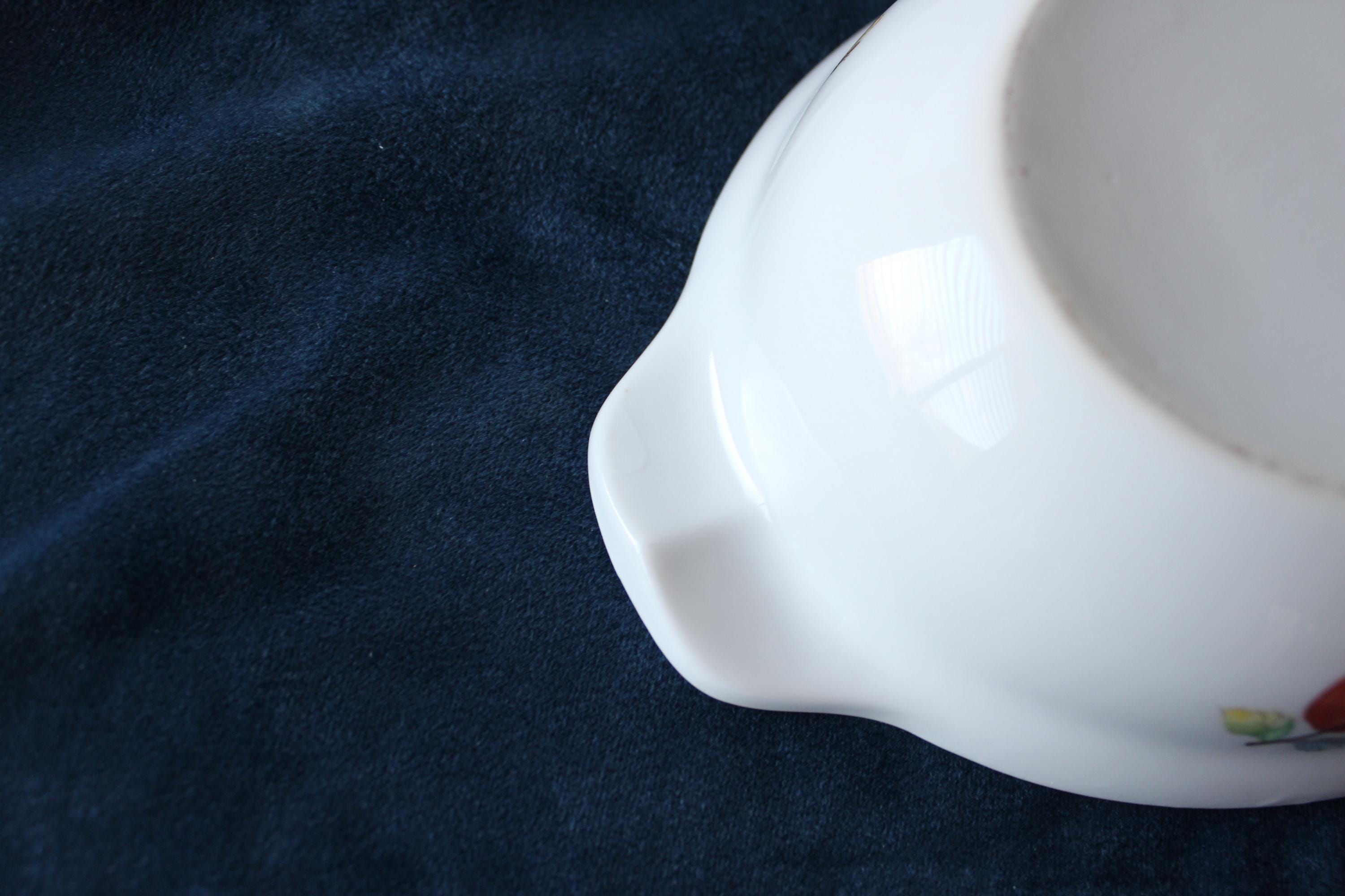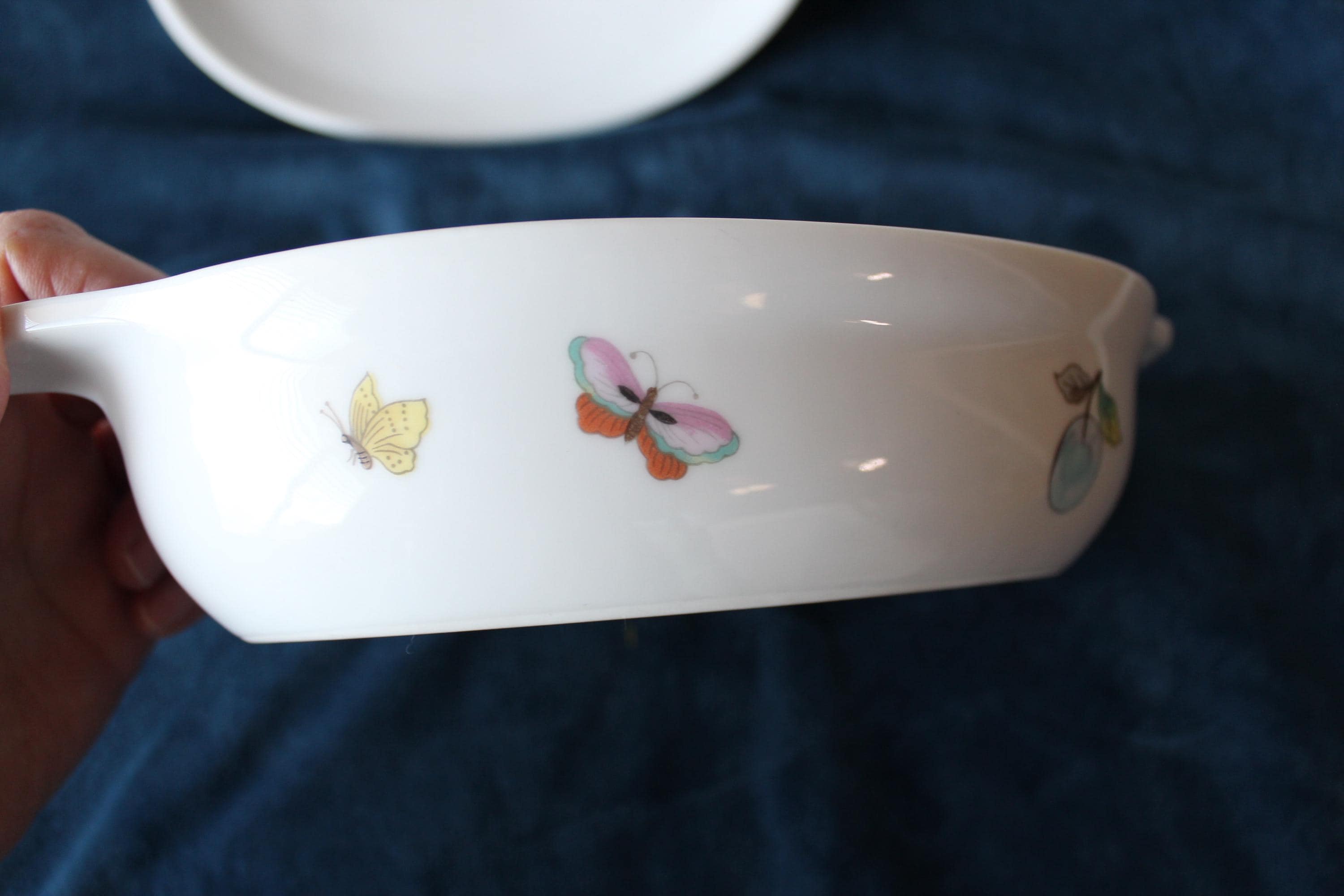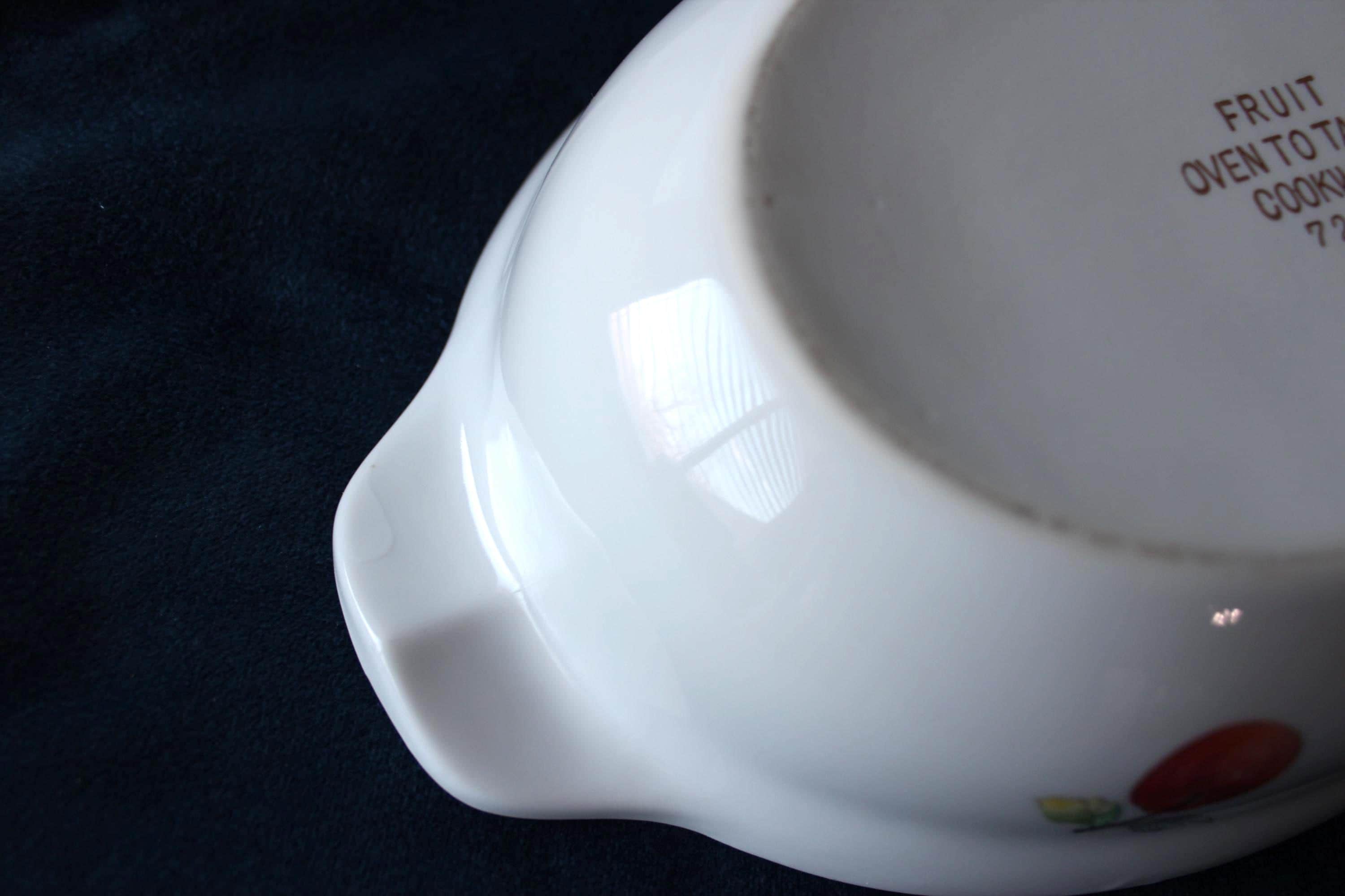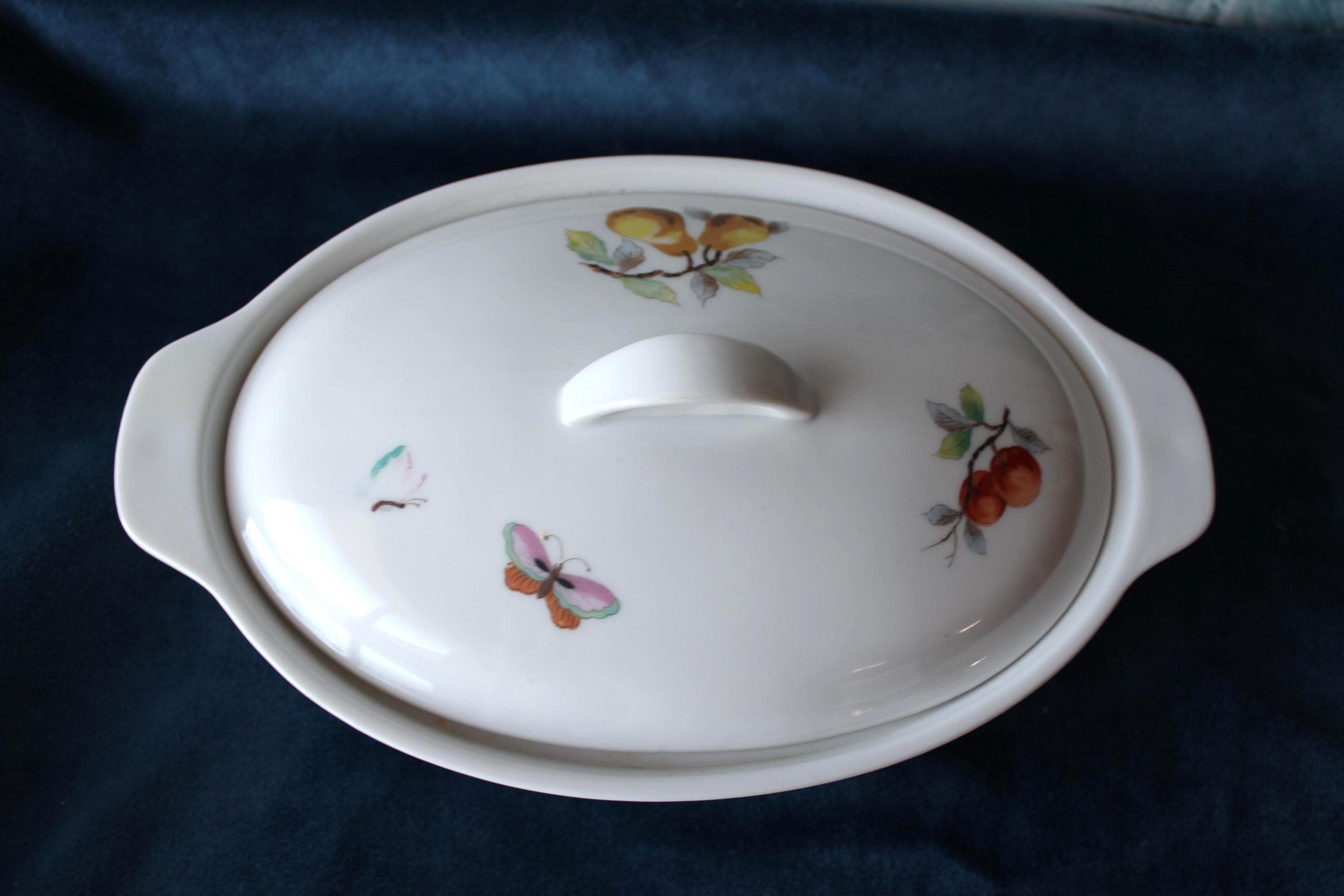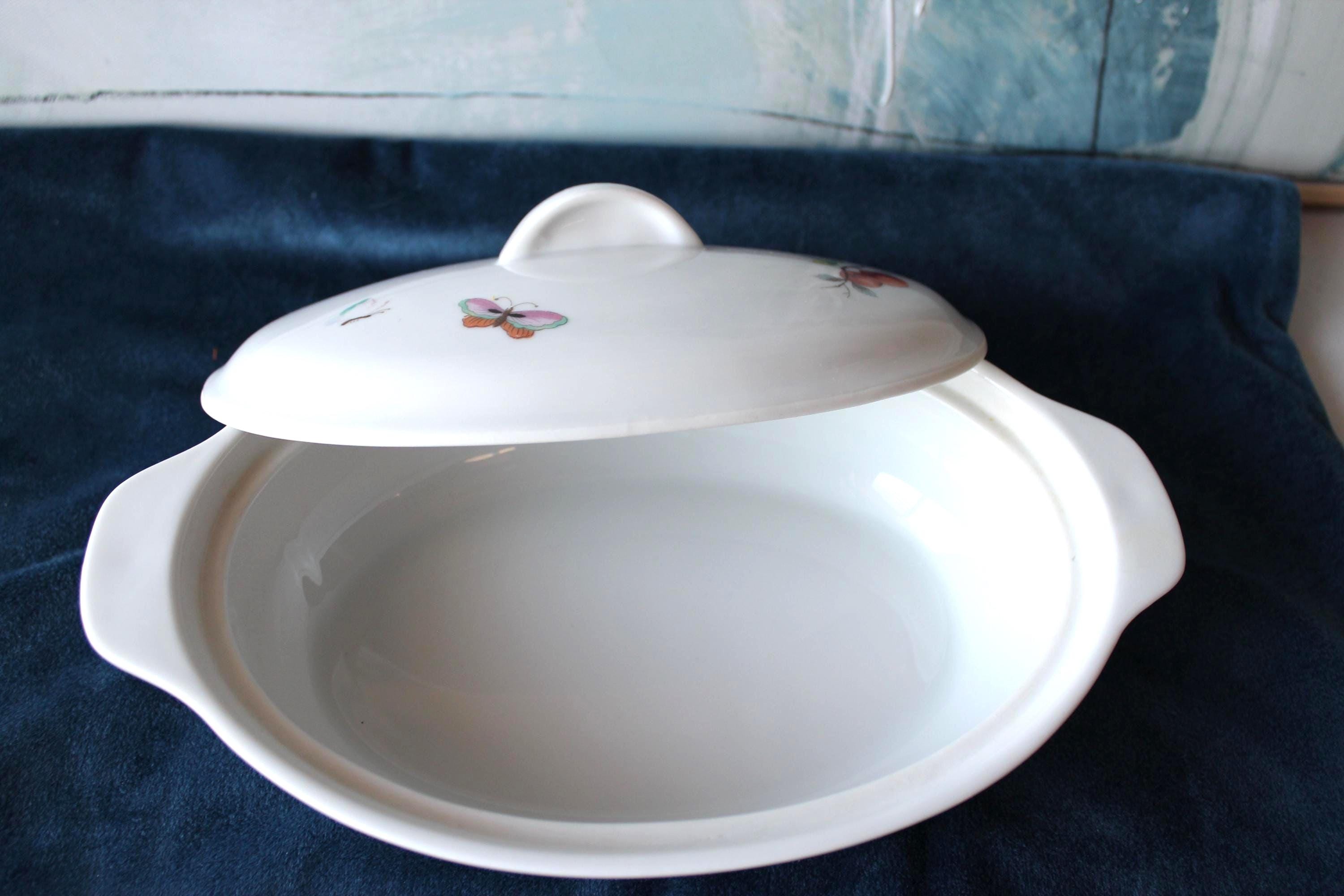 Please review all photos and message for questions or additional photos. Vintage Porcelain Casserole Dish Fruit and Butterfly Pattern by Andrea by Sakek. Made in Japan in 1970's. It is designed to go from oven to table. It features a fruit and butterfly design on white background, and has handles and lid. It is numbered 7235 on the bottom. It is 9.5 Inches long and 6 inches wide. Inside is 8 inches by 5.25 inches. It is in excellent condition, no chips, cracks, or scratches that I can find.
