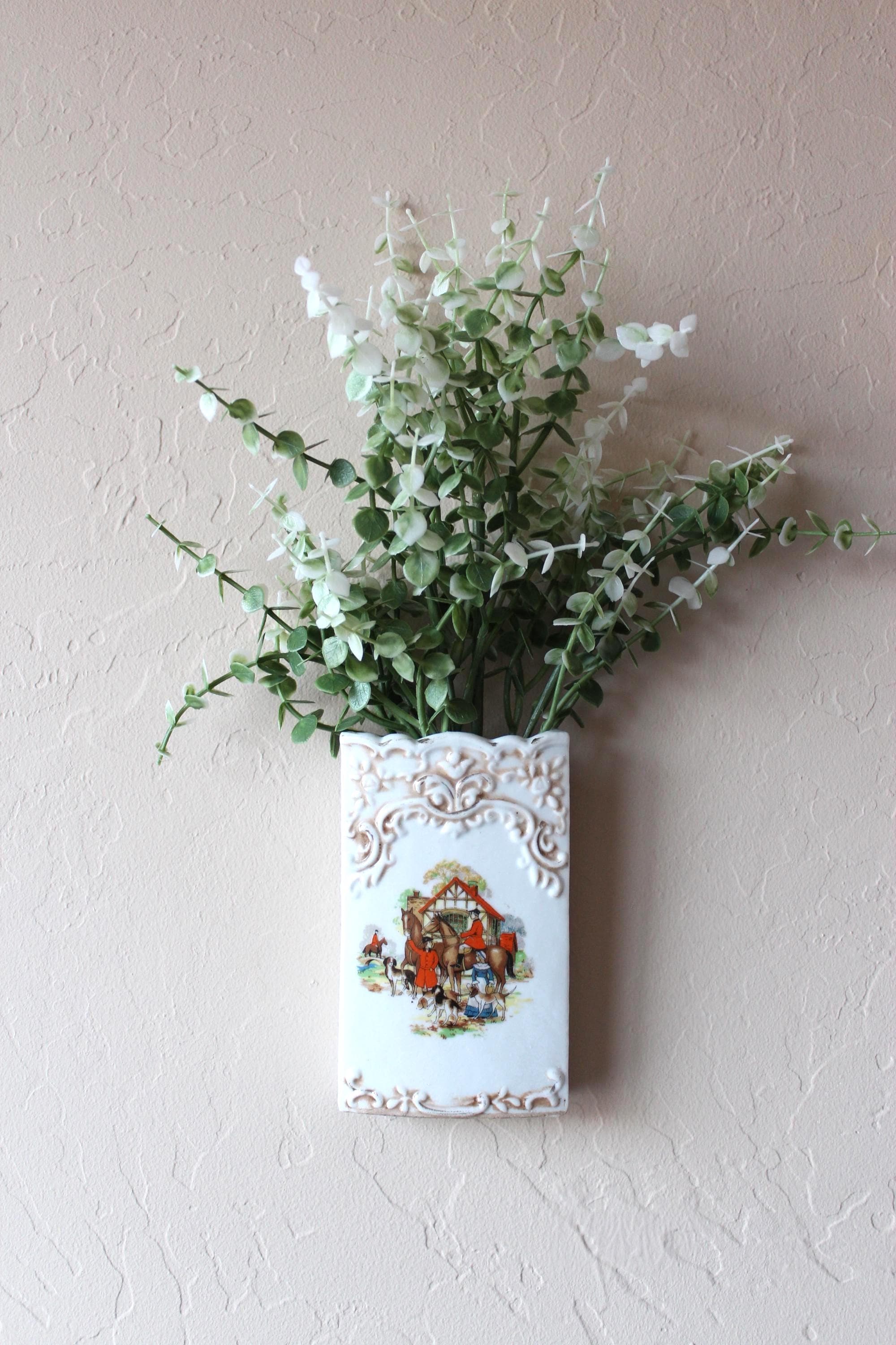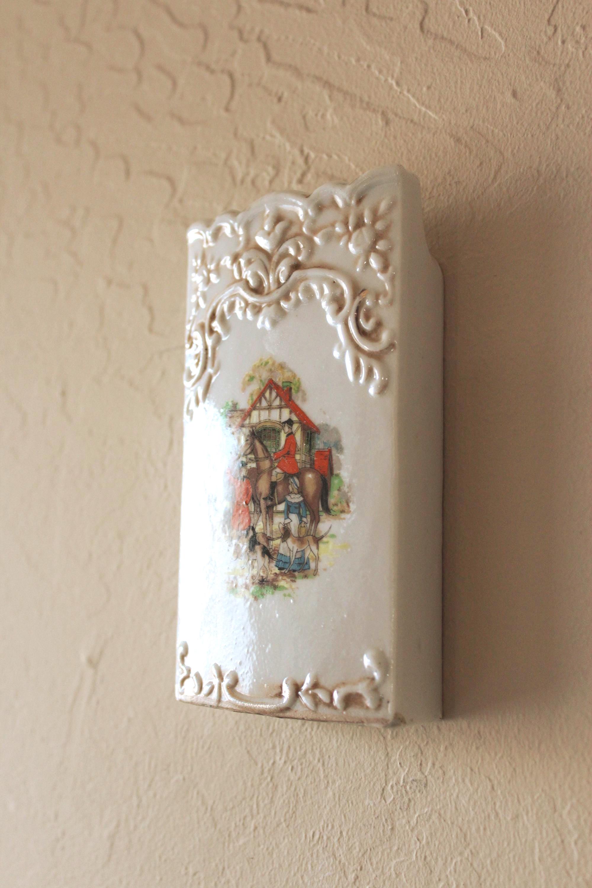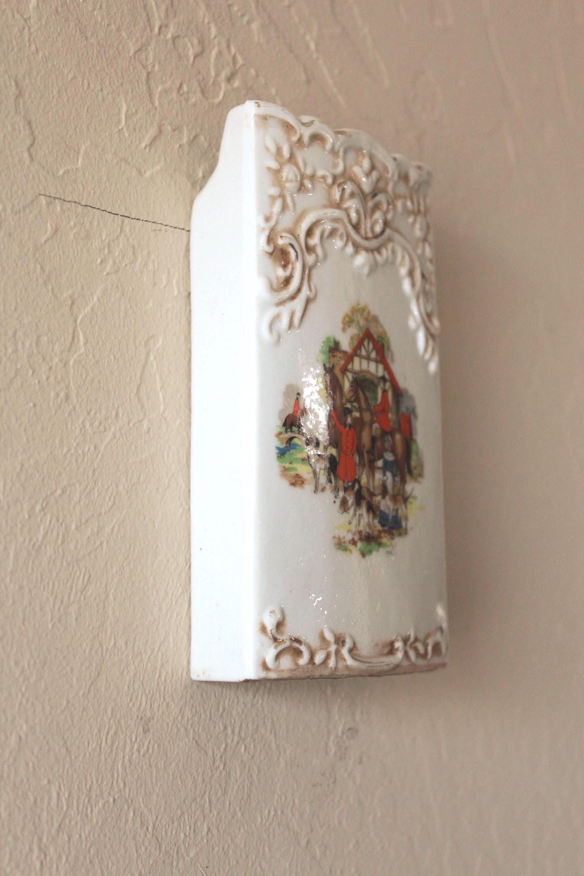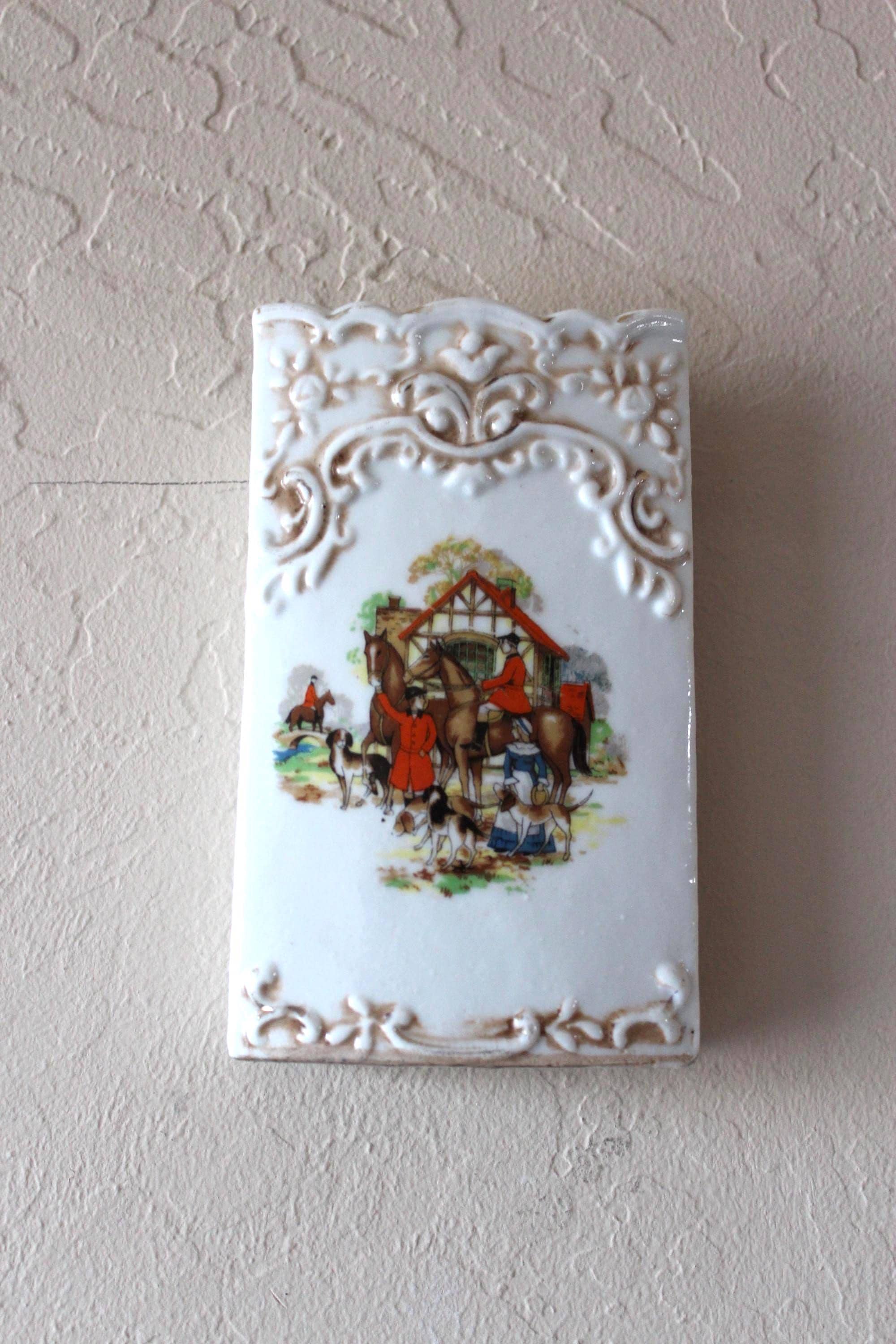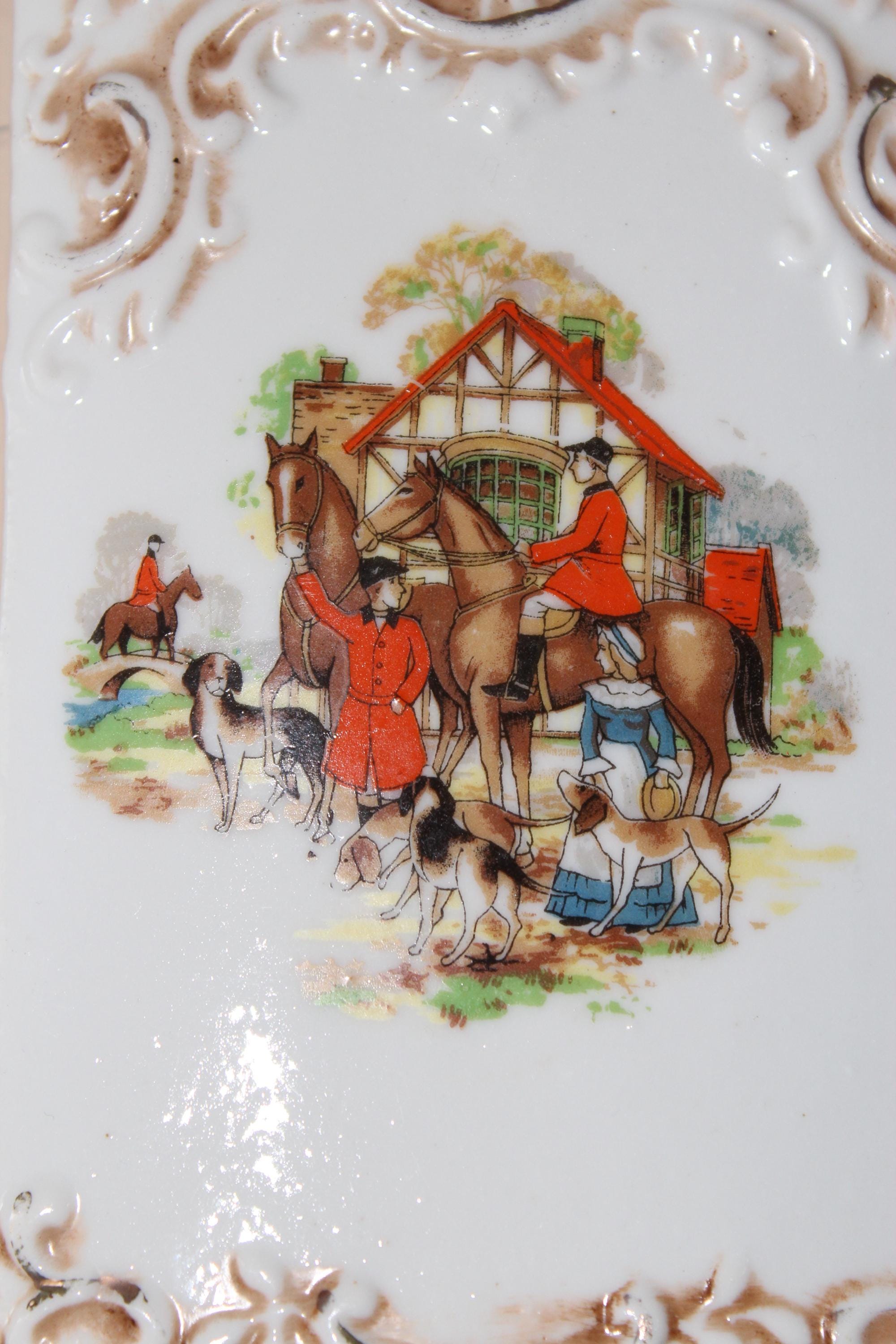 Please review photos and message for questions or additional photos. What a fun accent piece! Vintage 1940's Wall Pocket Fox Scene 6 Inch by 3.5 inch. It was made in Japan by The Hinode and is marked on the back. It has decorative embossed border on the top and bottom, and colorful scene of the horses, hounds, and riders. The graphics are vibrant and in excellent condition. Has manufacture hole on the back for hanging. There are no chips or cracks, and the painted gold upper edge does show expected vintage wear.