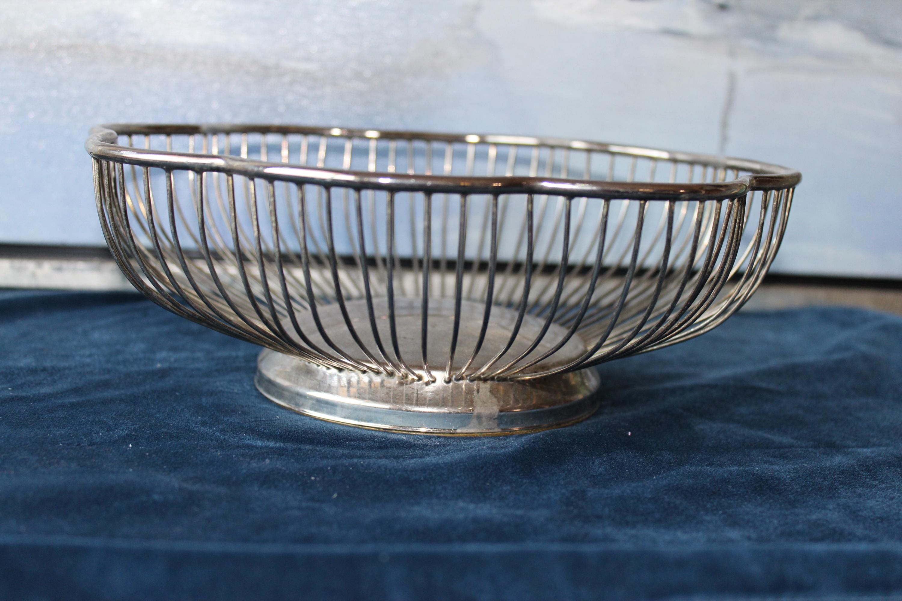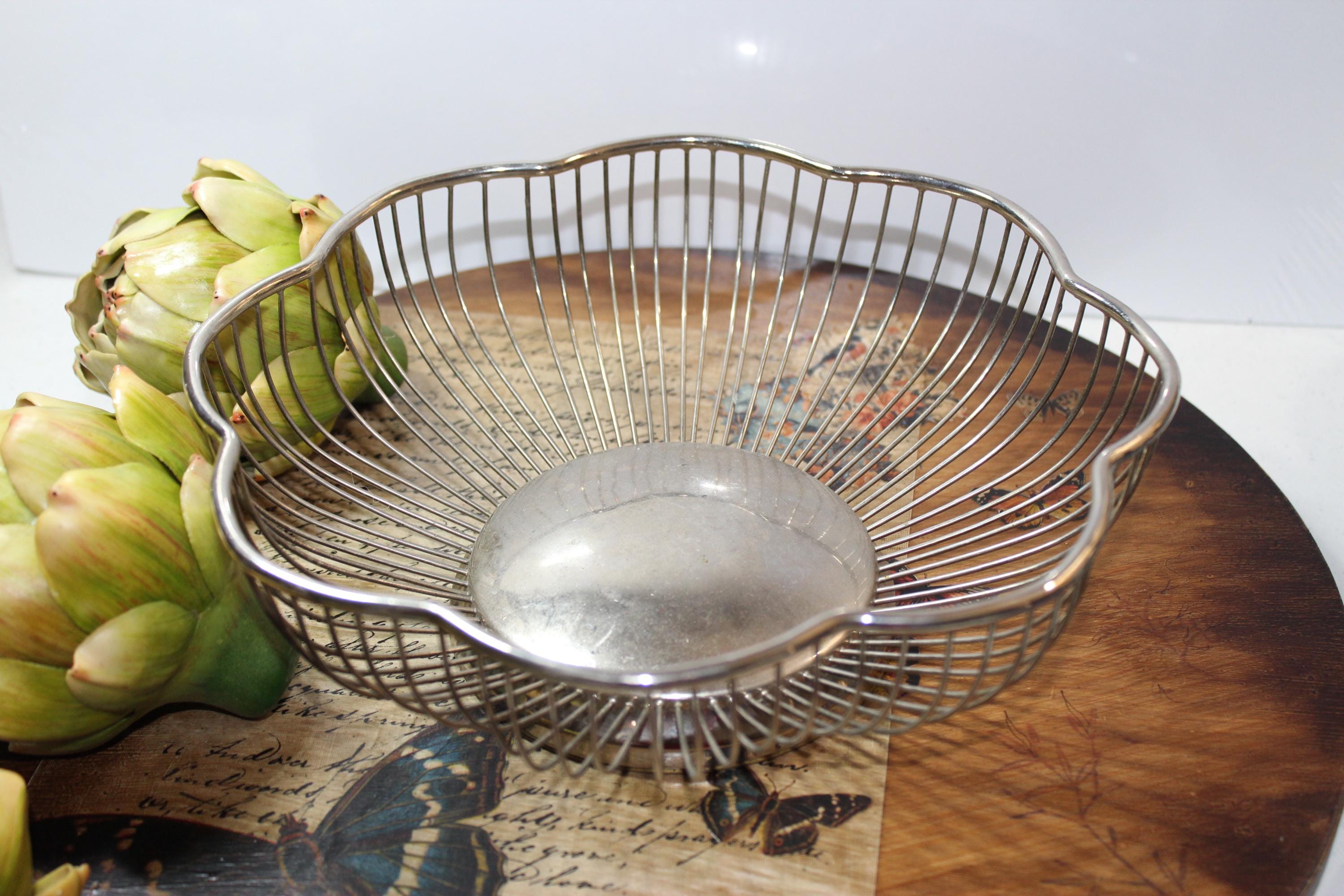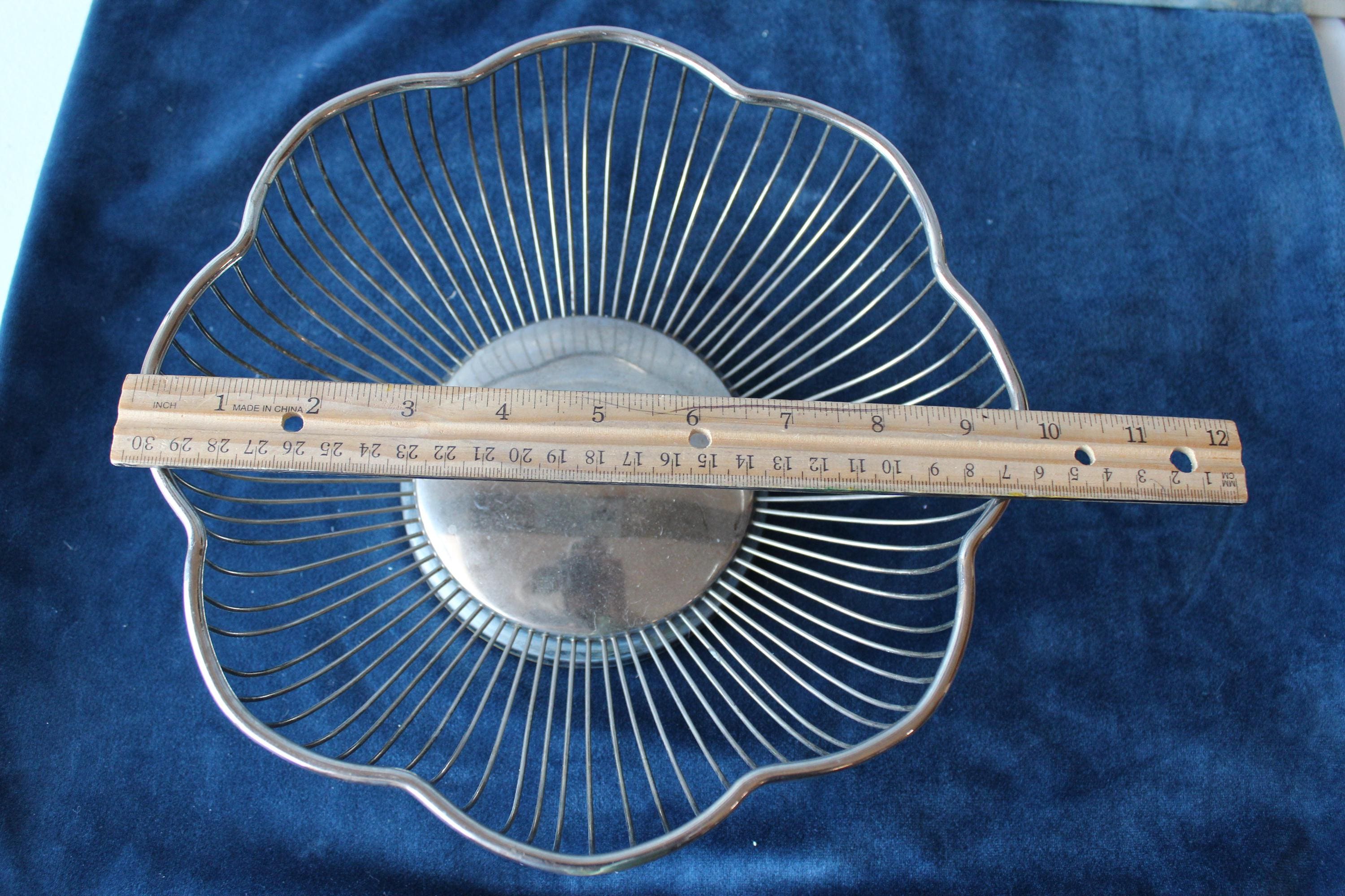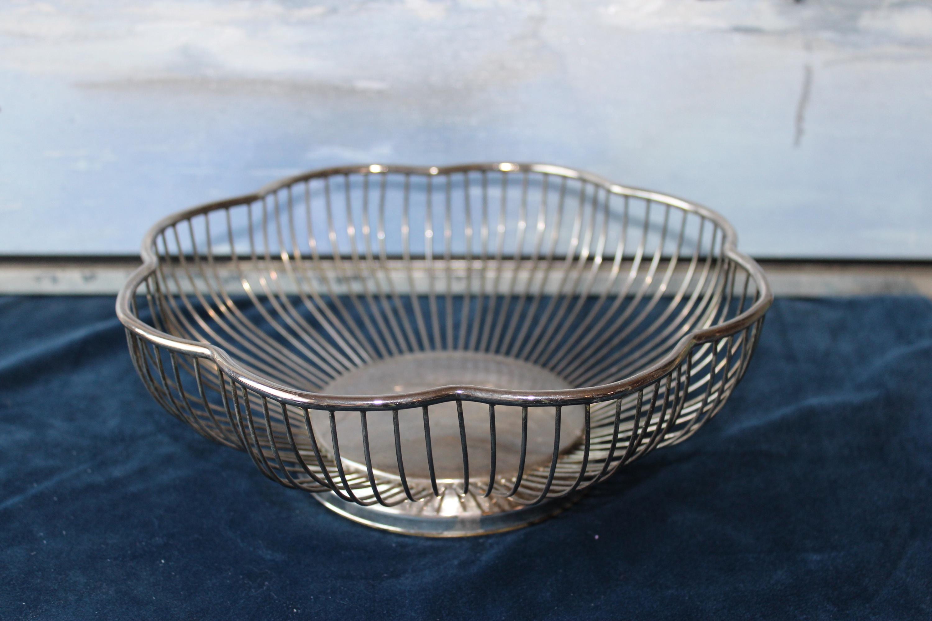 Silver Plated over brass, scalloped round wire bowl suitable for serving or holding fruit, bread or other items. It can be a wonderful decorative centerpiece or as a functioning server. Suitable for nearly any decor, this is a very versatile addition. It has expected patina for its vintage age.