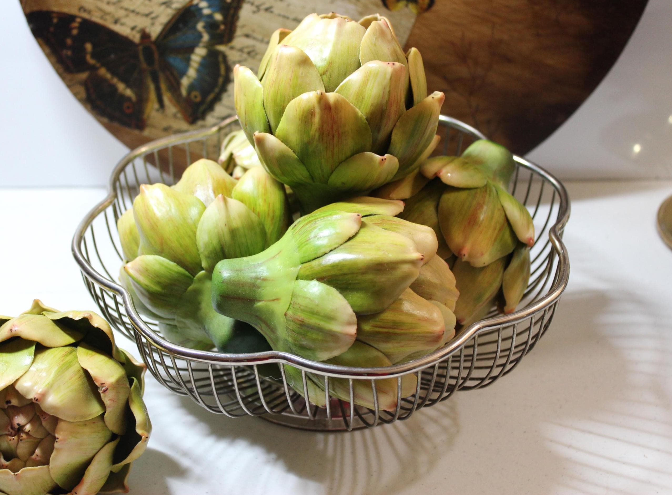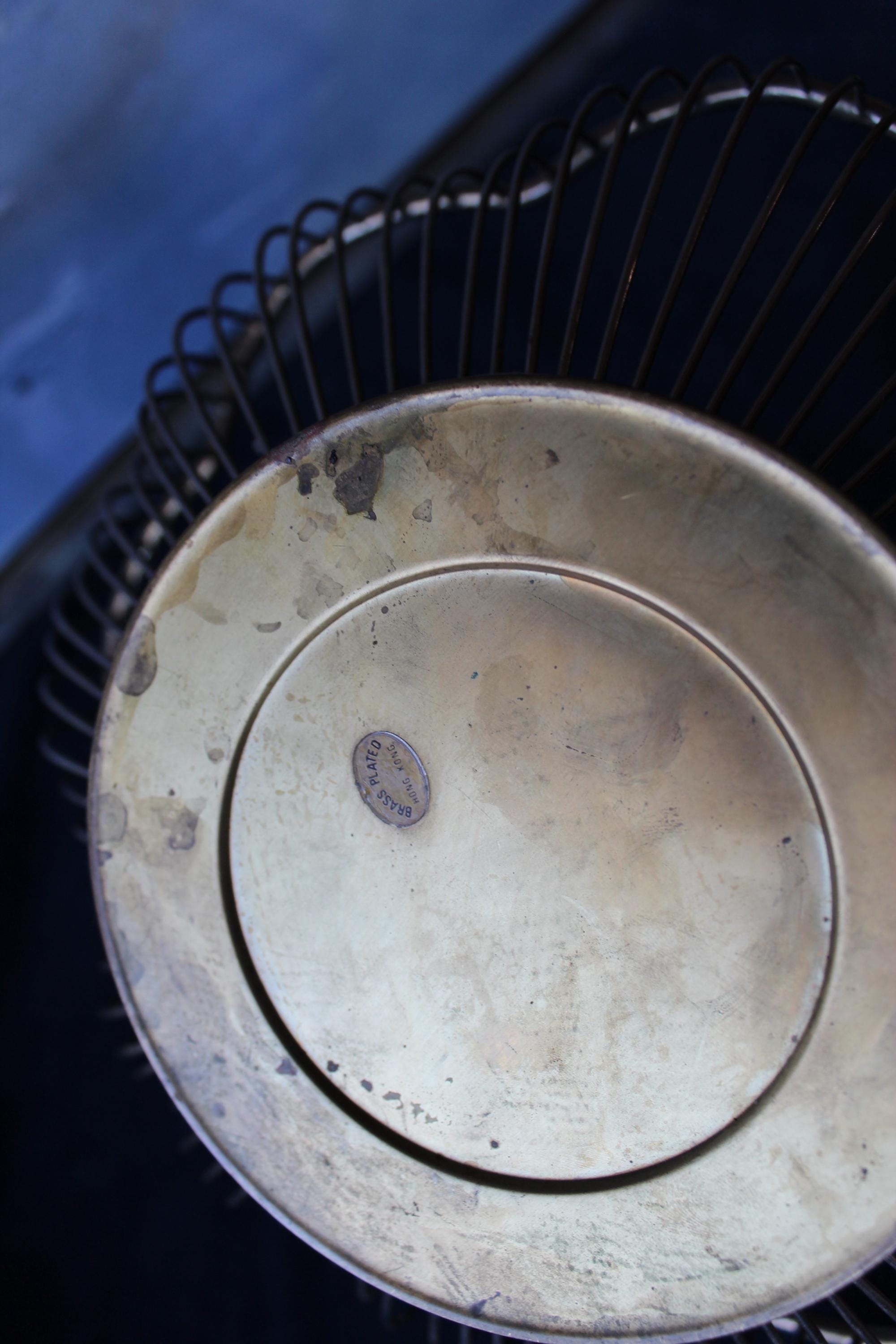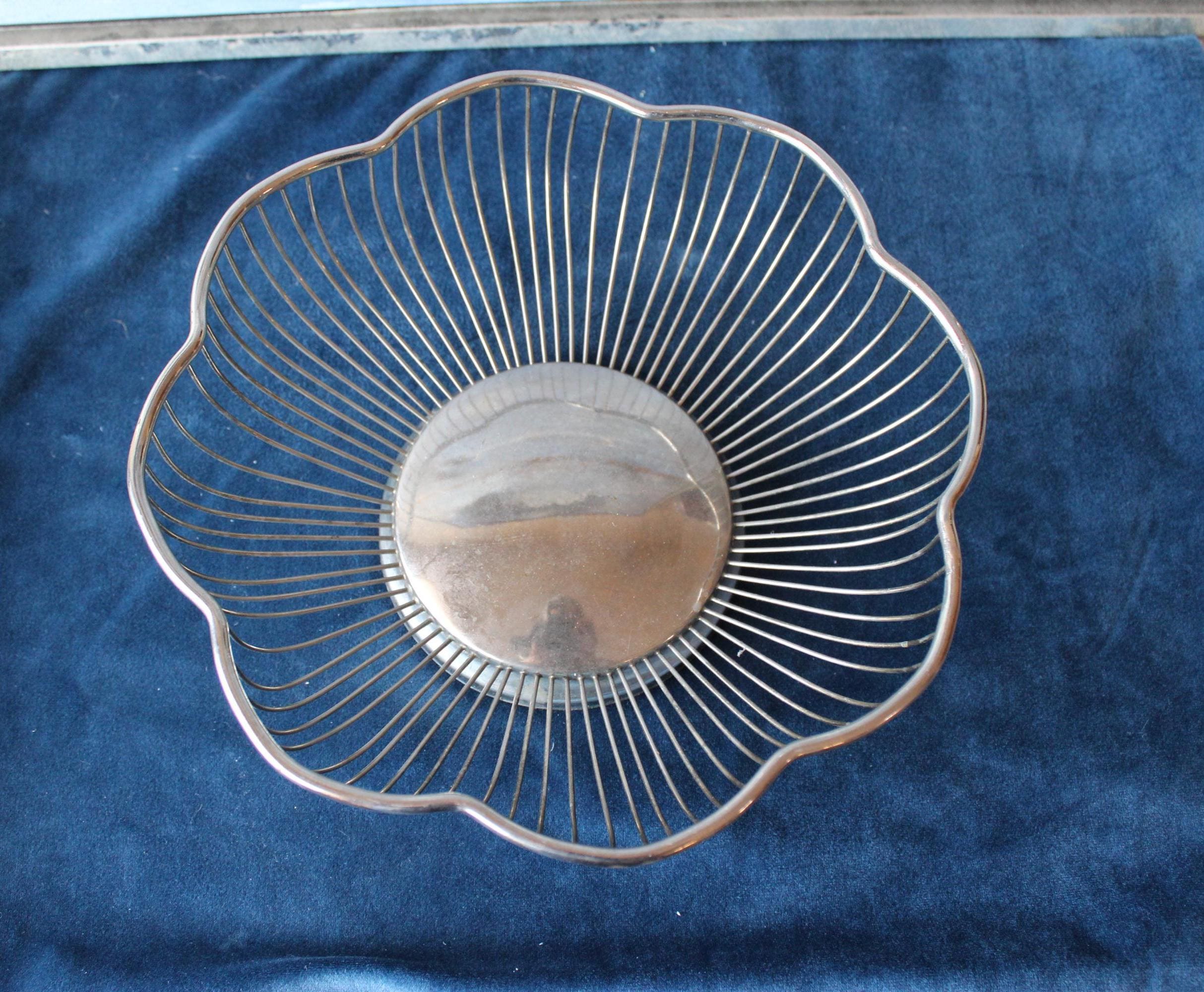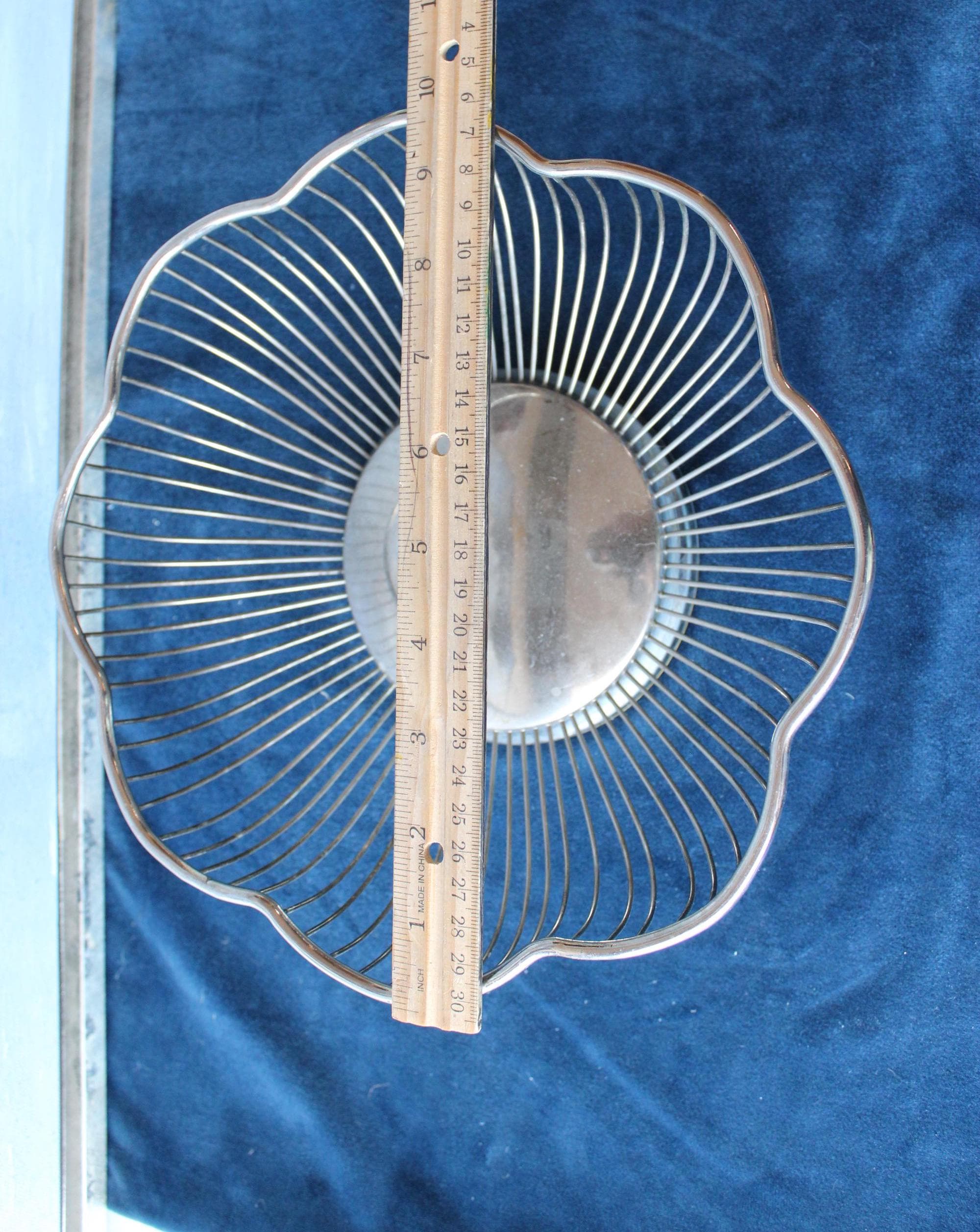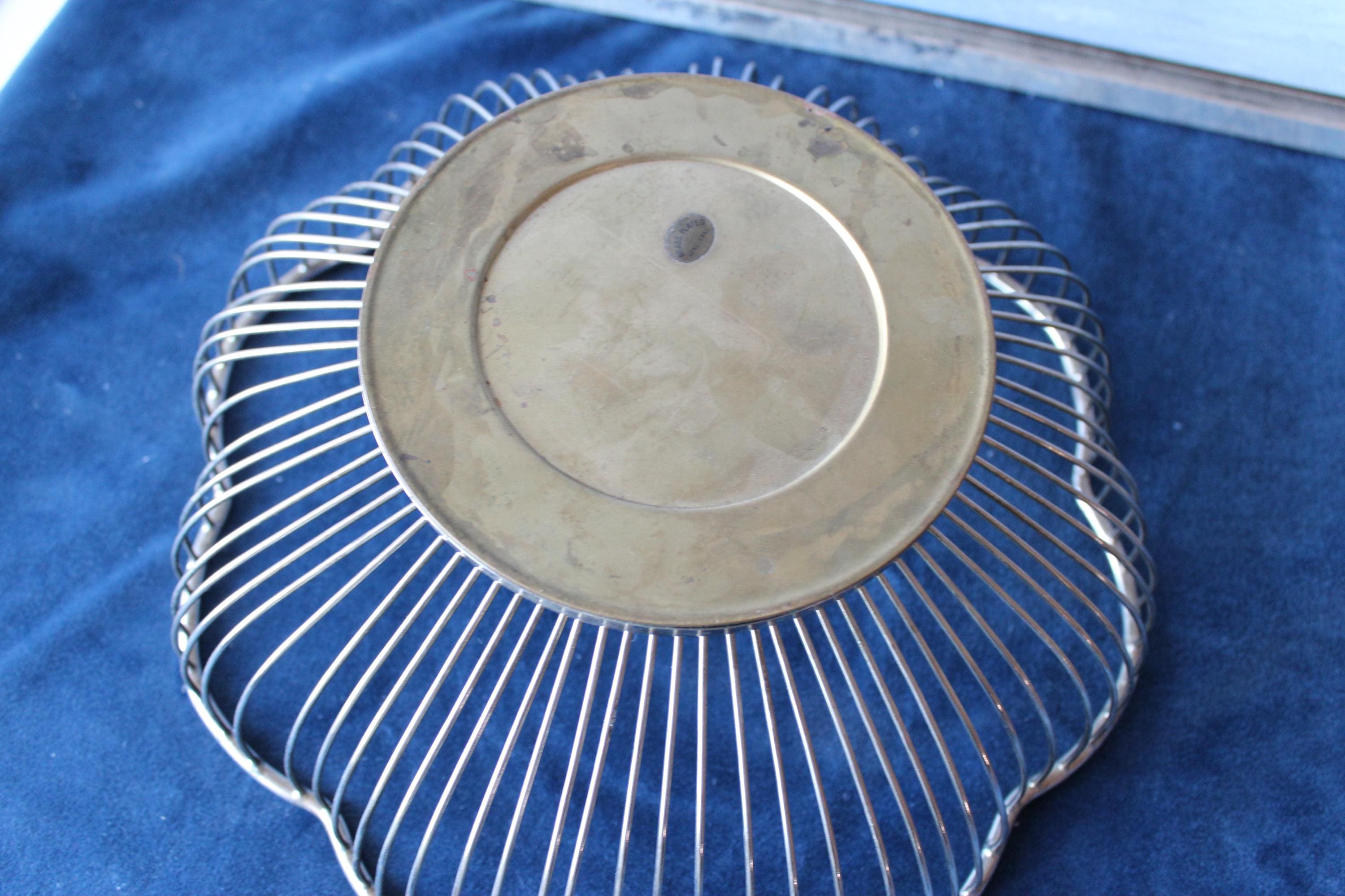 Silver Plated over brass, scalloped round wire bowl suitable for serving or holding fruit, bread or other items. It can be a wonderful decorative centerpiece or as a functioning server. Suitable for nearly any decor, this is a very versatile addition. It has expected patina for its vintage age.