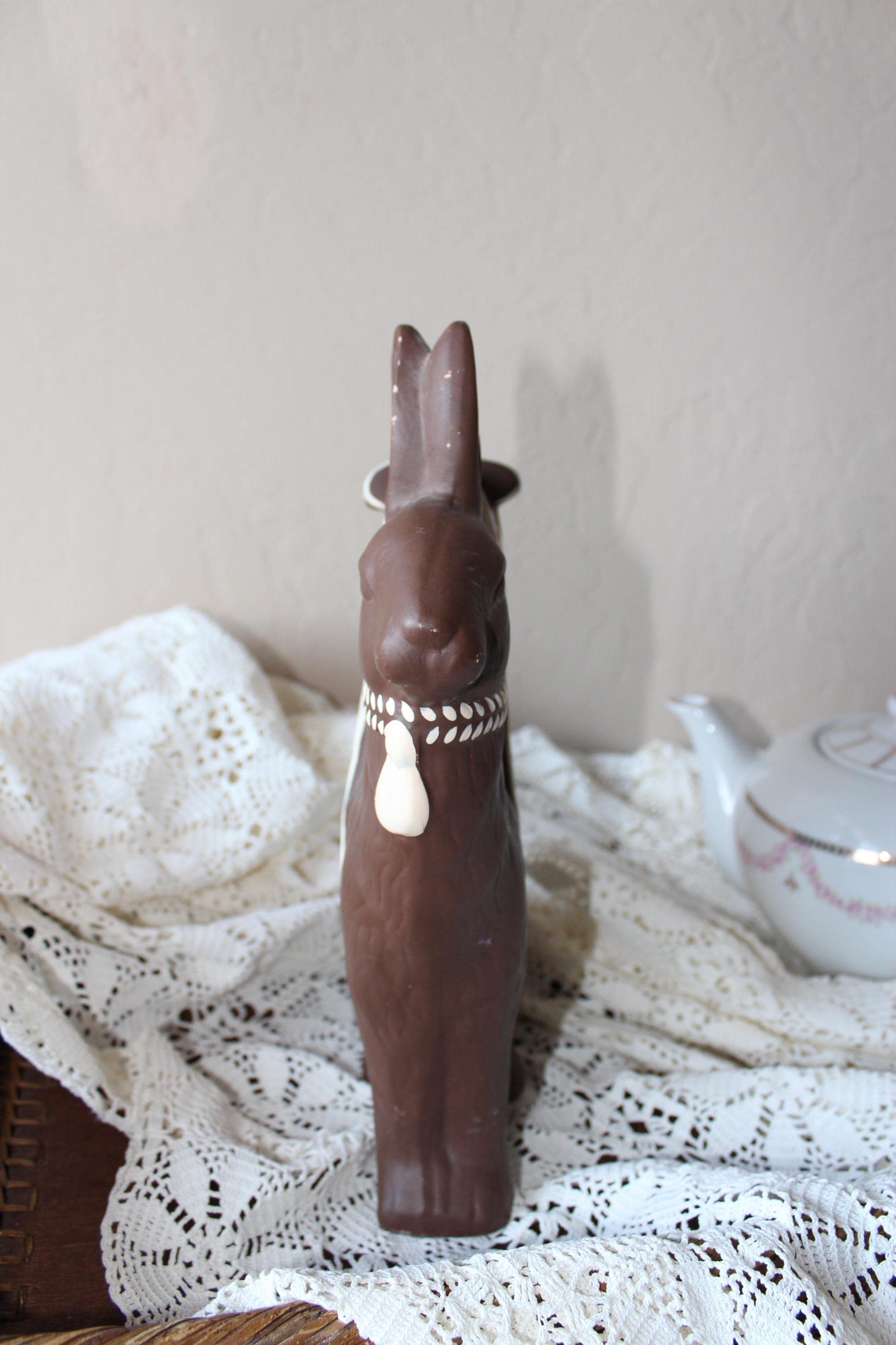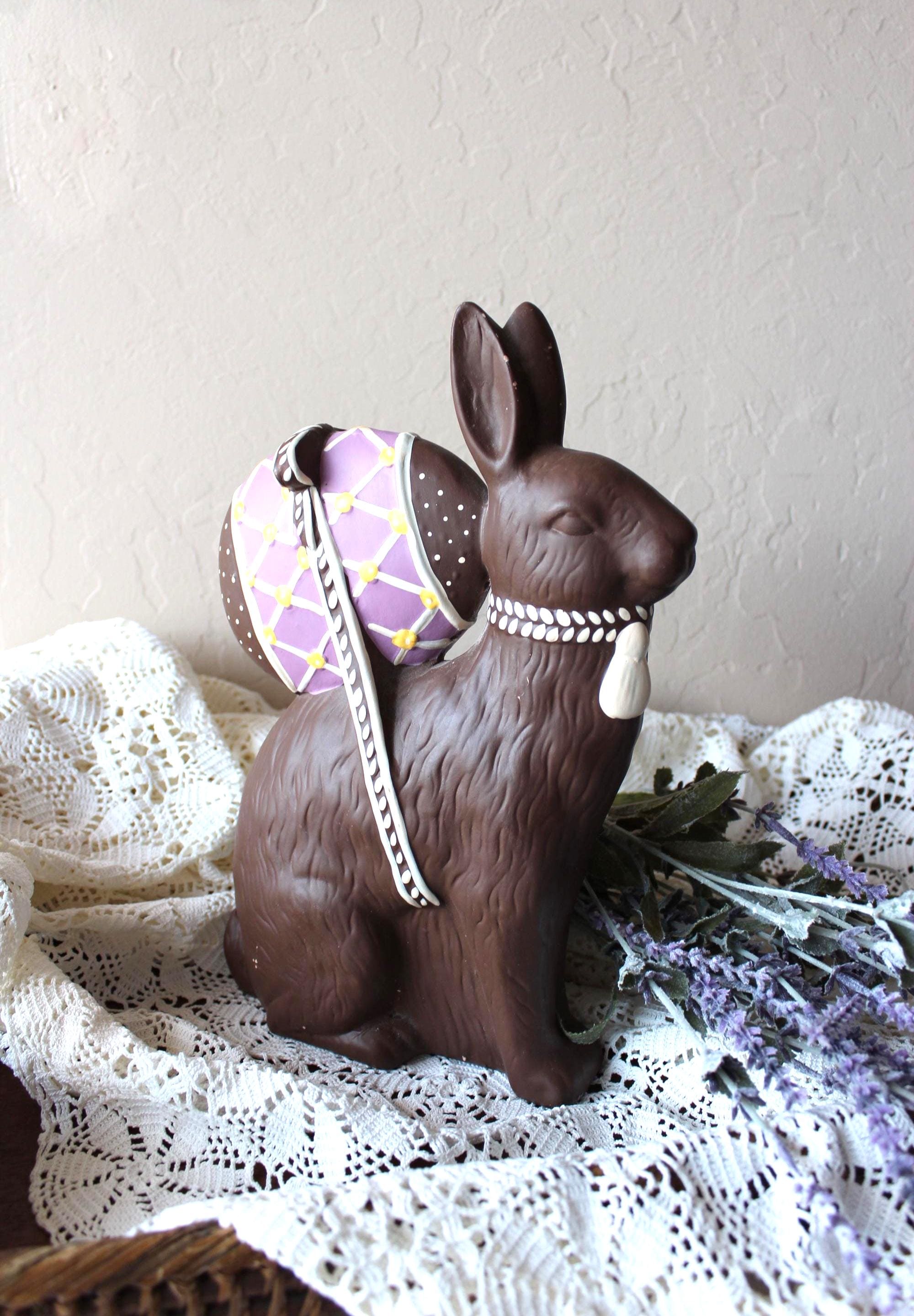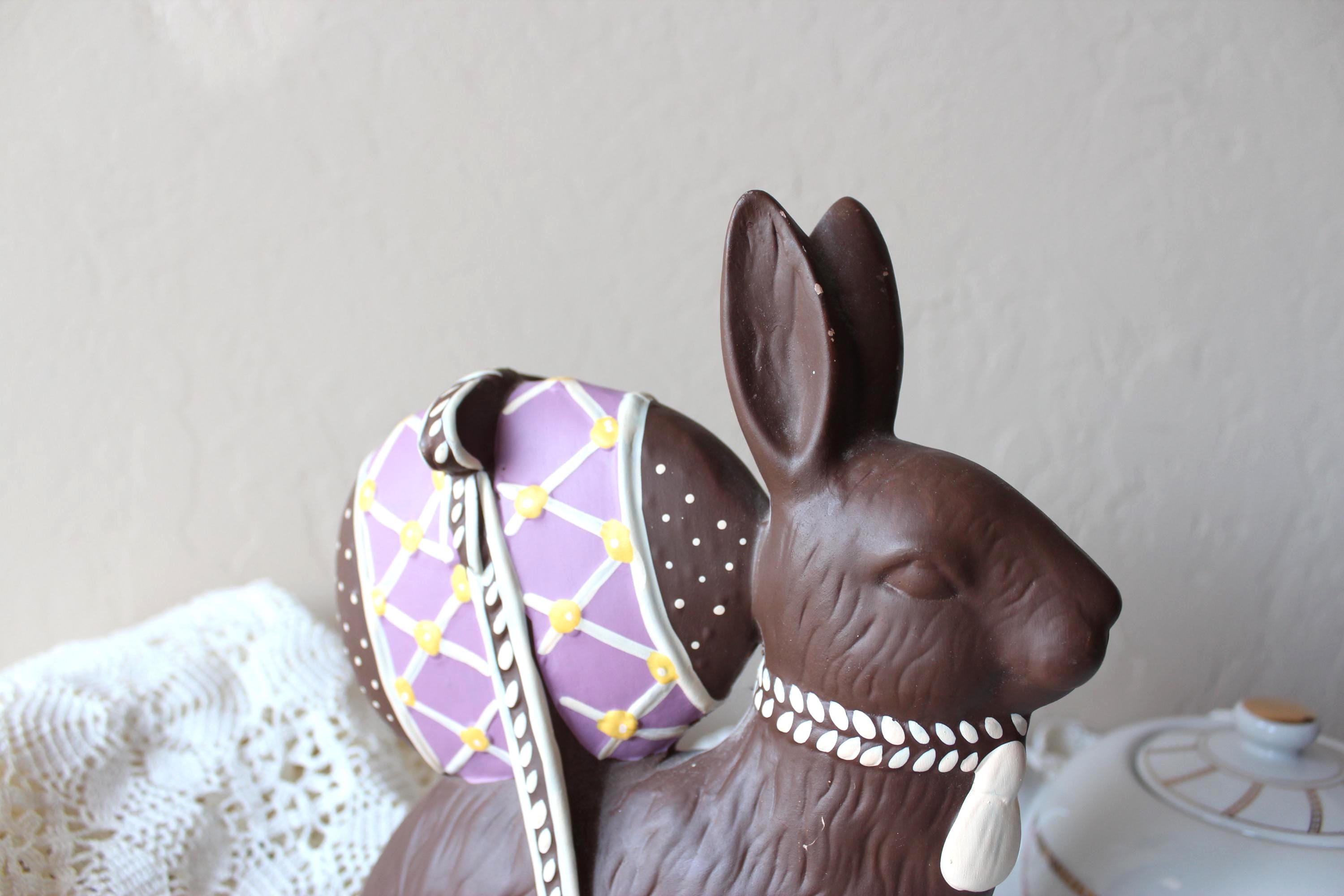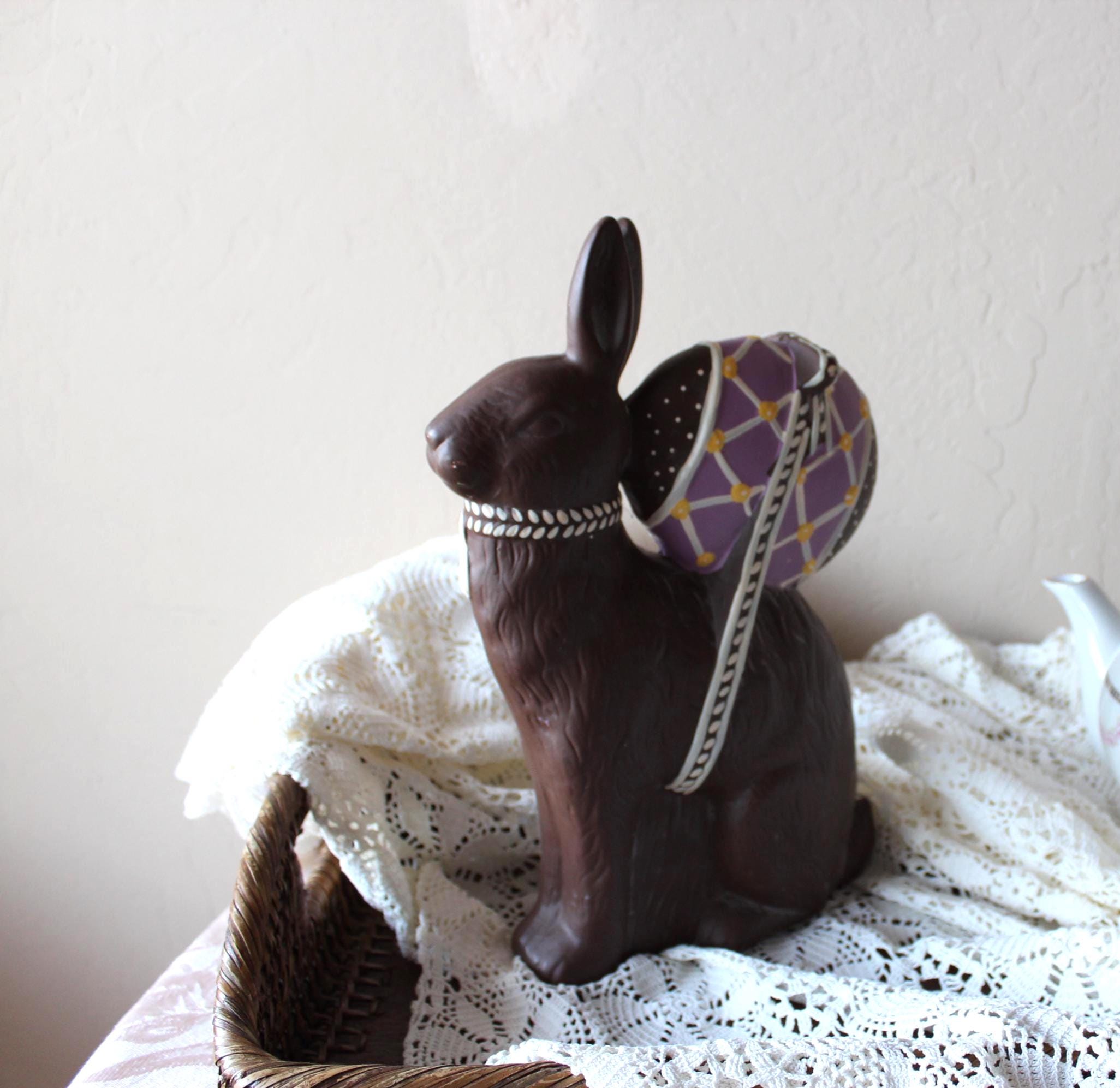 Delightful vintage faux chocolate ceramic bunny is 11 inches tall and 7 inches wide. She has a matte glaze which looks like a real chocolate bunny. She is shaped just like the real thing too (see photos). She has a lovely Easter egg that is also faux chocolate and is decorated with lilac and daffodil yellow. She does have a few spots of wear on her, as is expected for a bunny of this age. She is beautifully vintage and evocative of happy memories. Please review all photos and message me with any questions before purchase.
