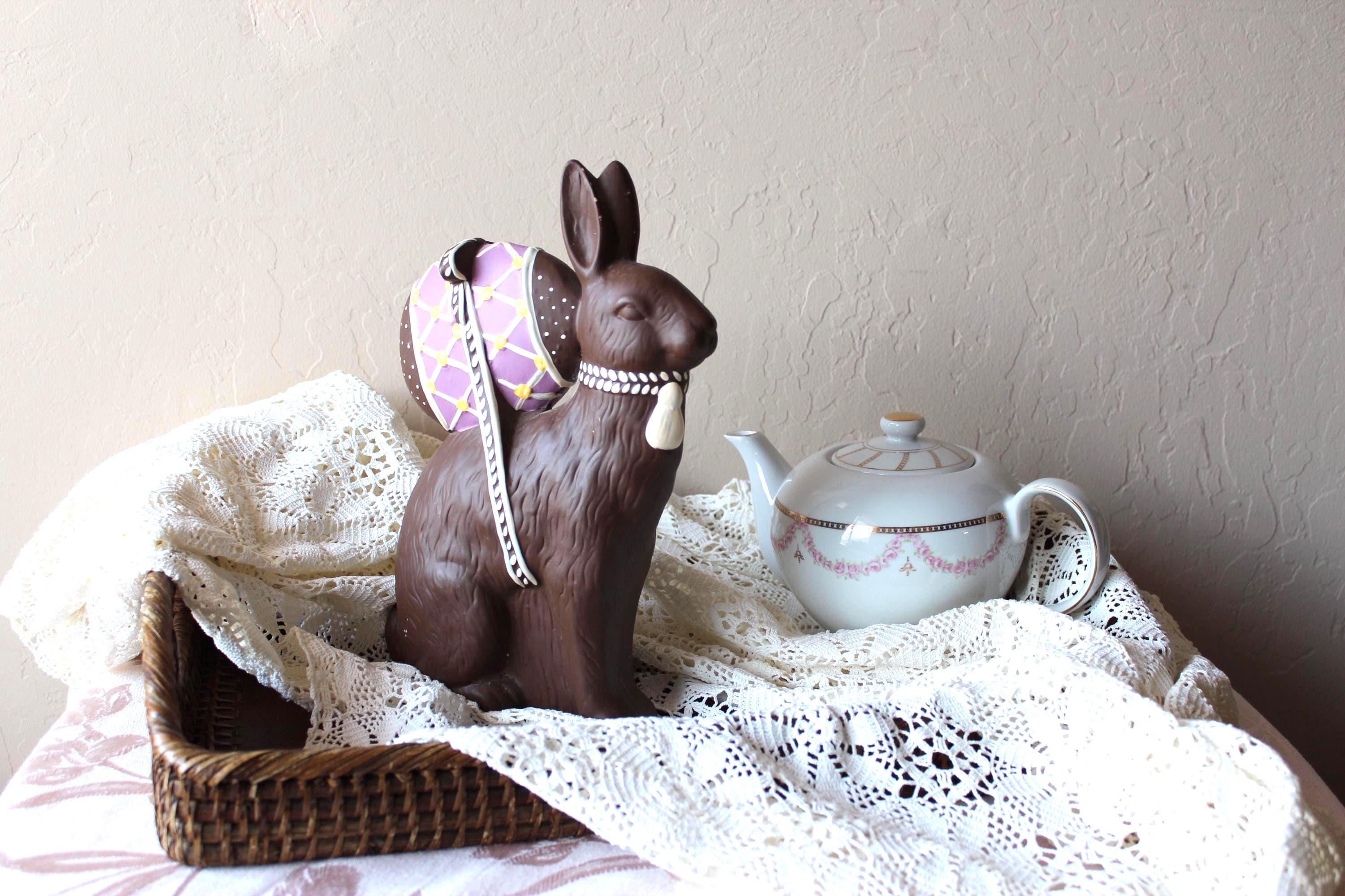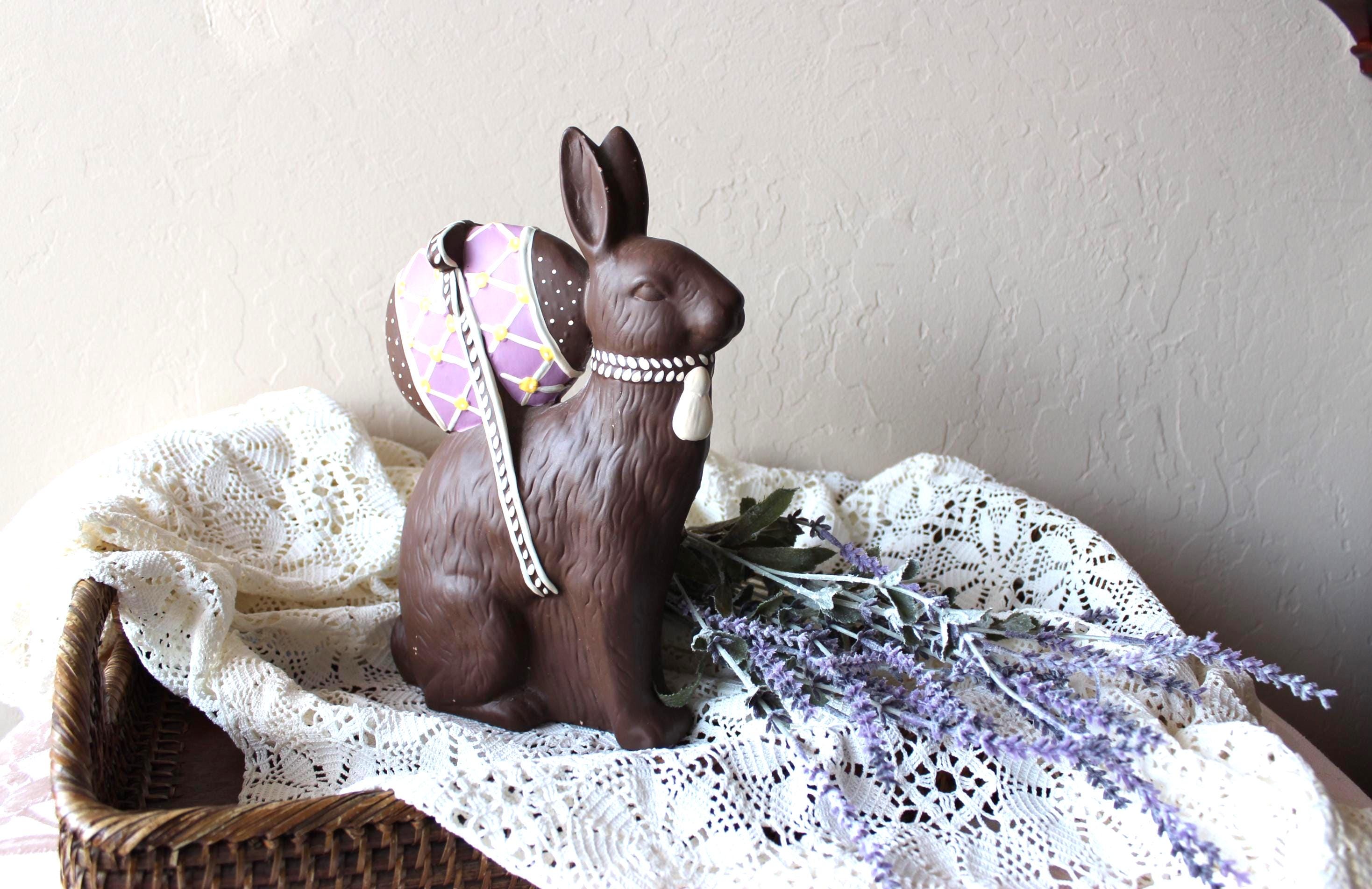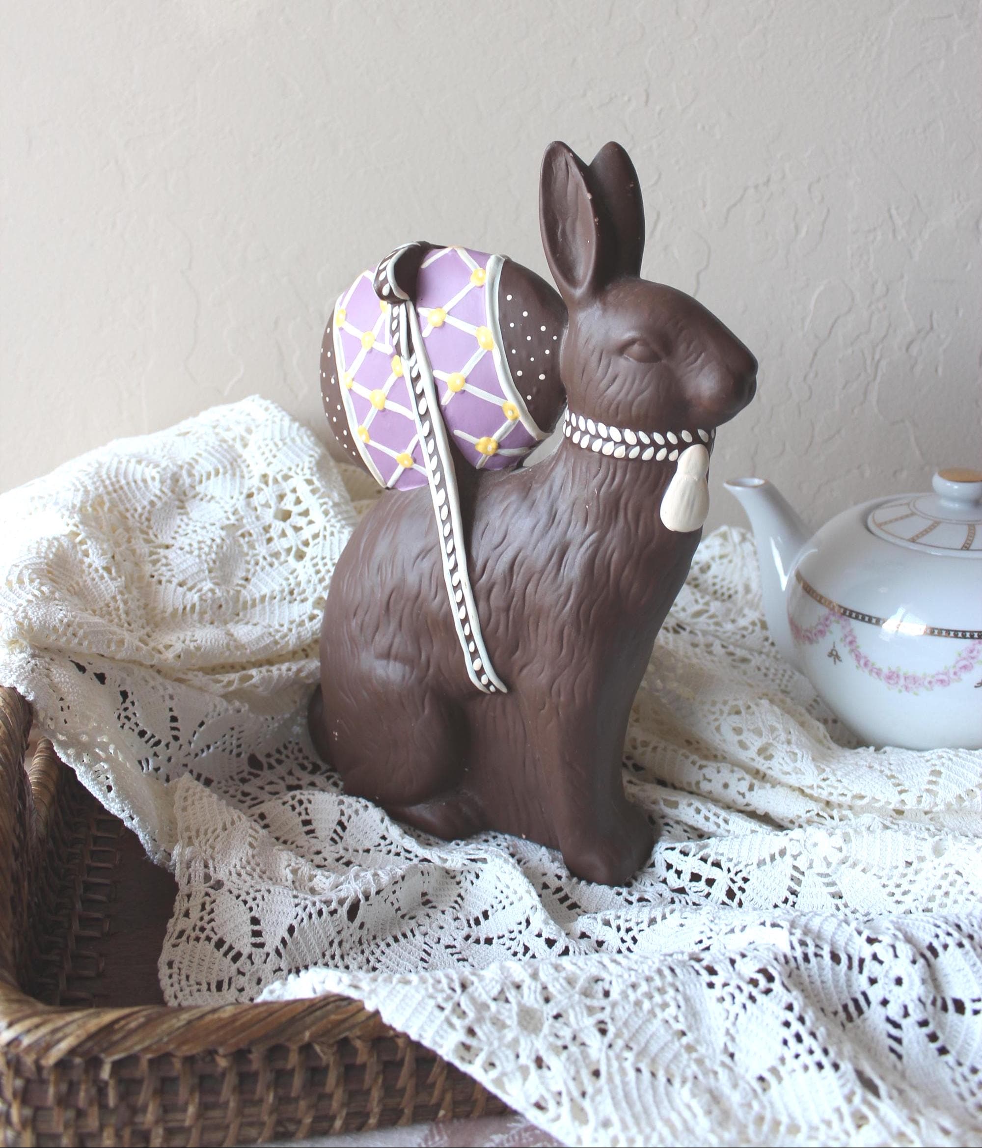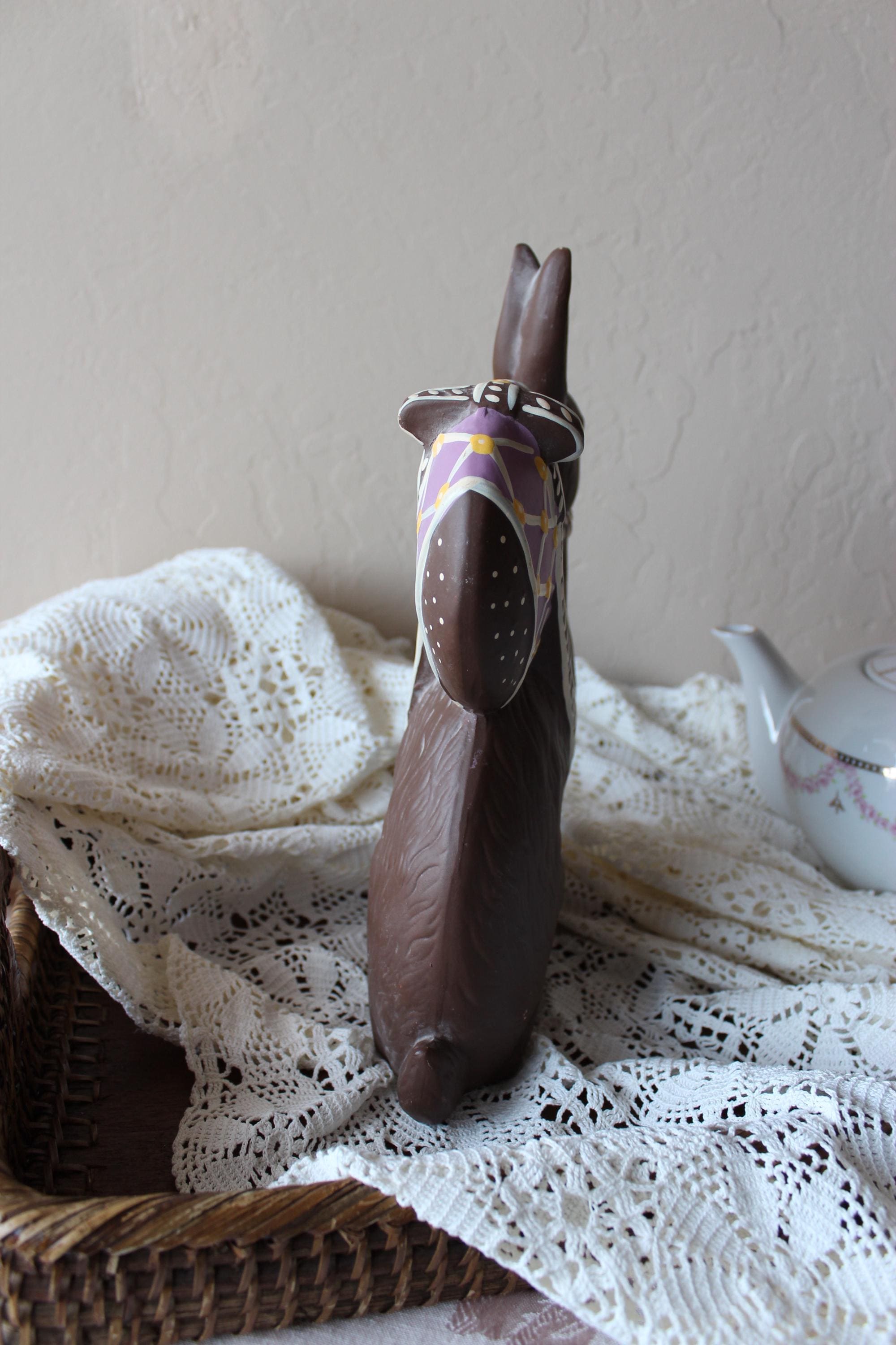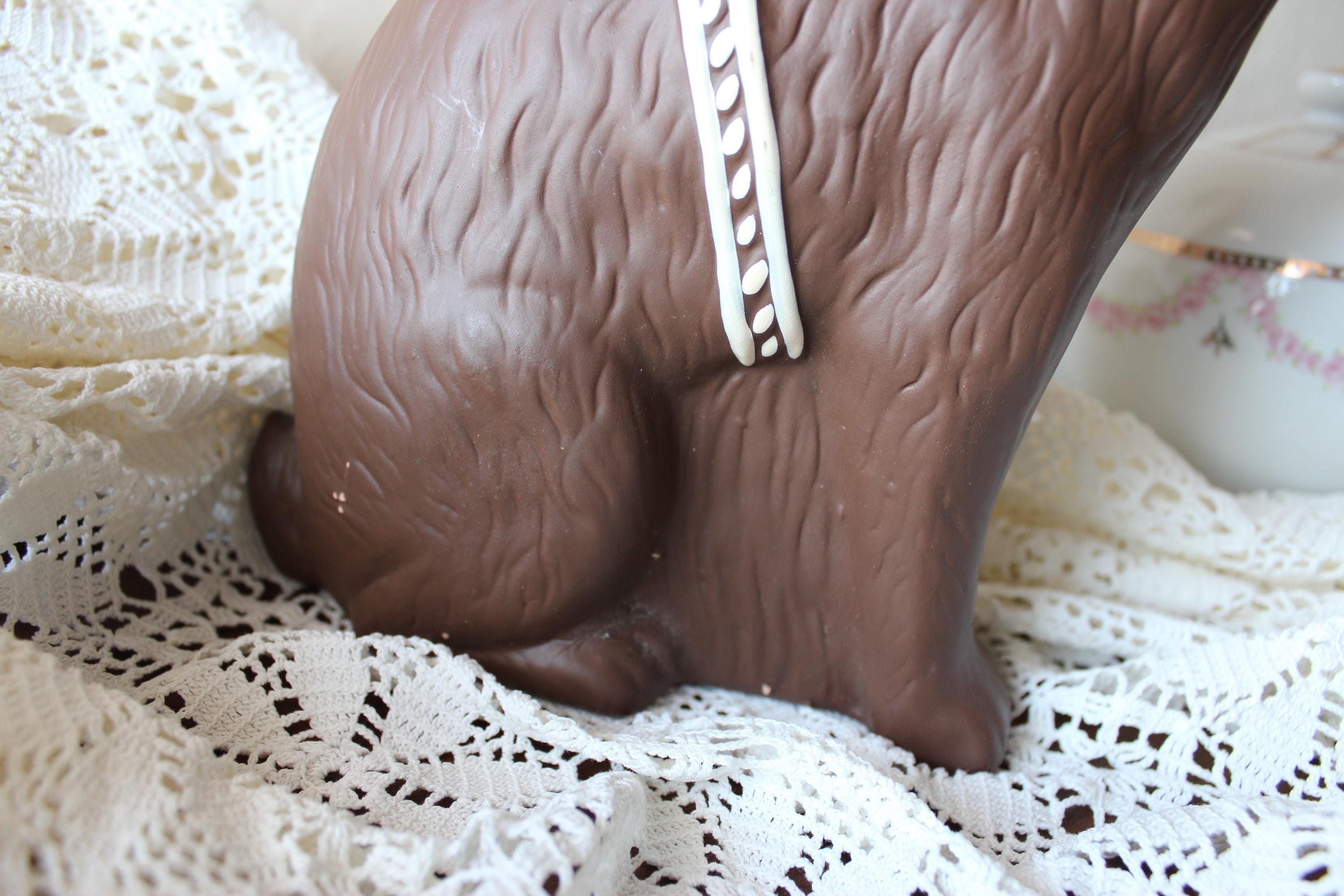 Delightful vintage faux chocolate ceramic bunny is 11 inches tall and 7 inches wide. She has a matte glaze which looks like a real chocolate bunny. She is shaped just like the real thing too (see photos). She has a lovely Easter egg that is also faux chocolate and is decorated with lilac and daffodil yellow. She does have a few spots of wear on her, as is expected for a bunny of this age. She is beautifully vintage and evocative of happy memories. Please review all photos and message me with any questions before purchase.
