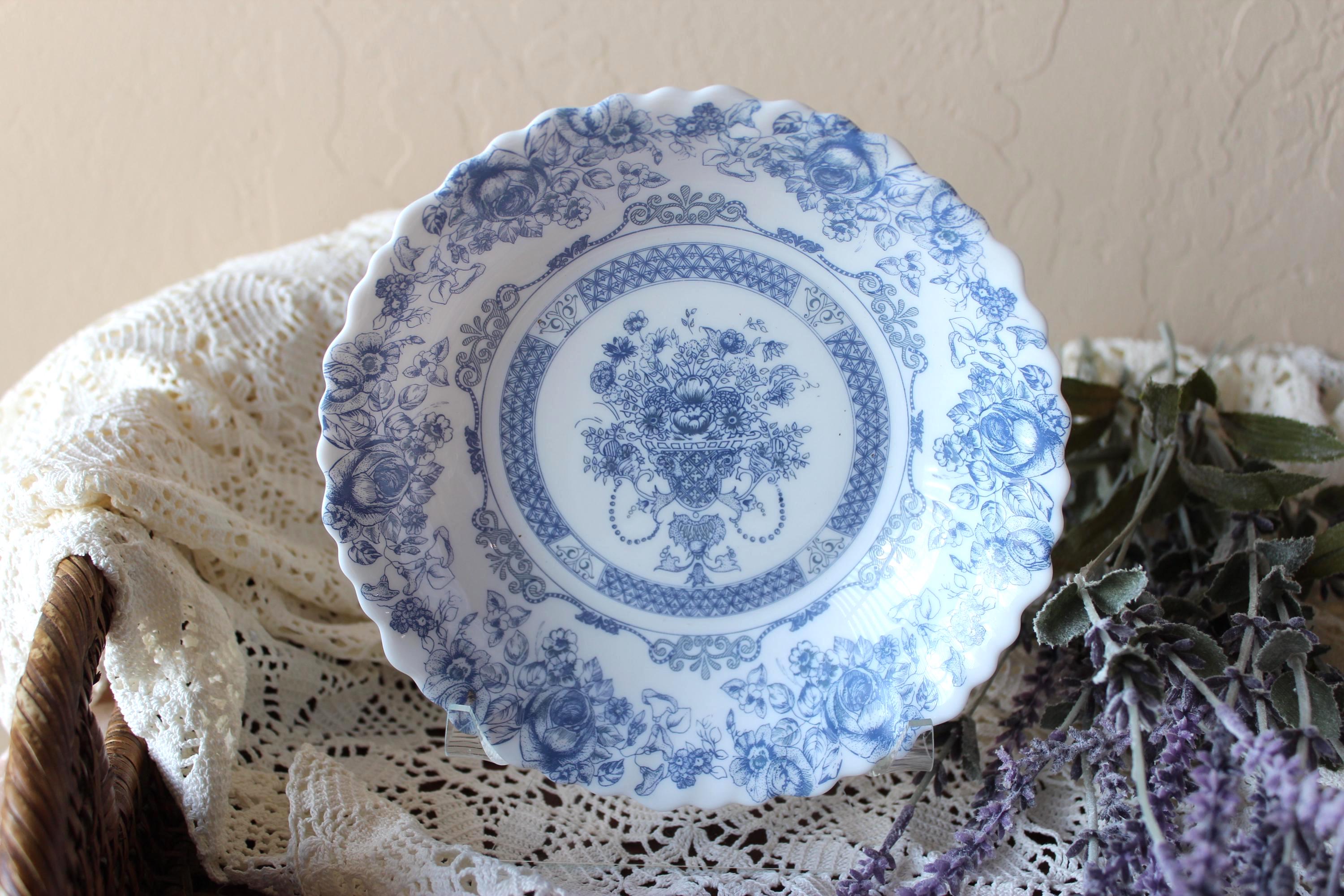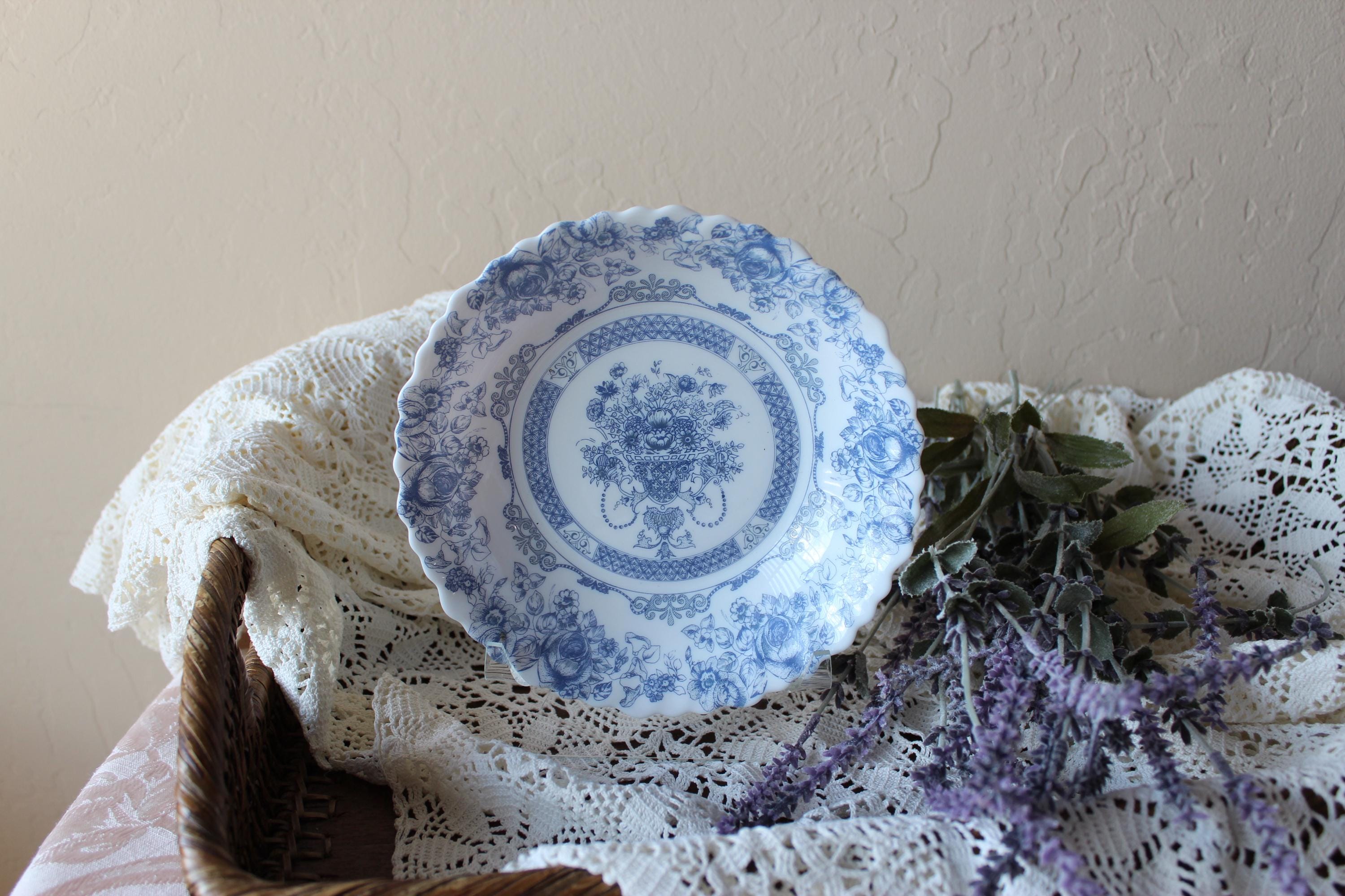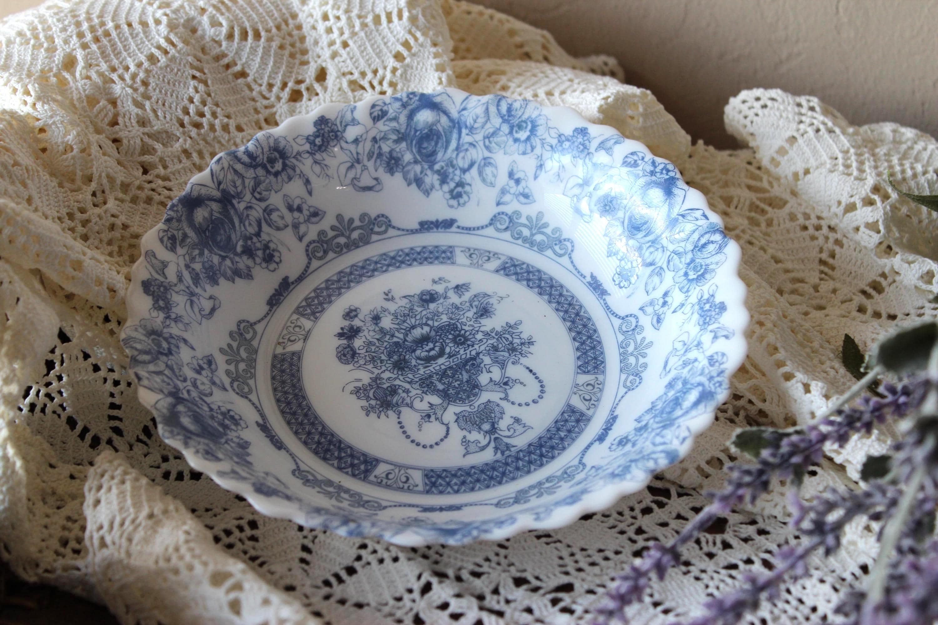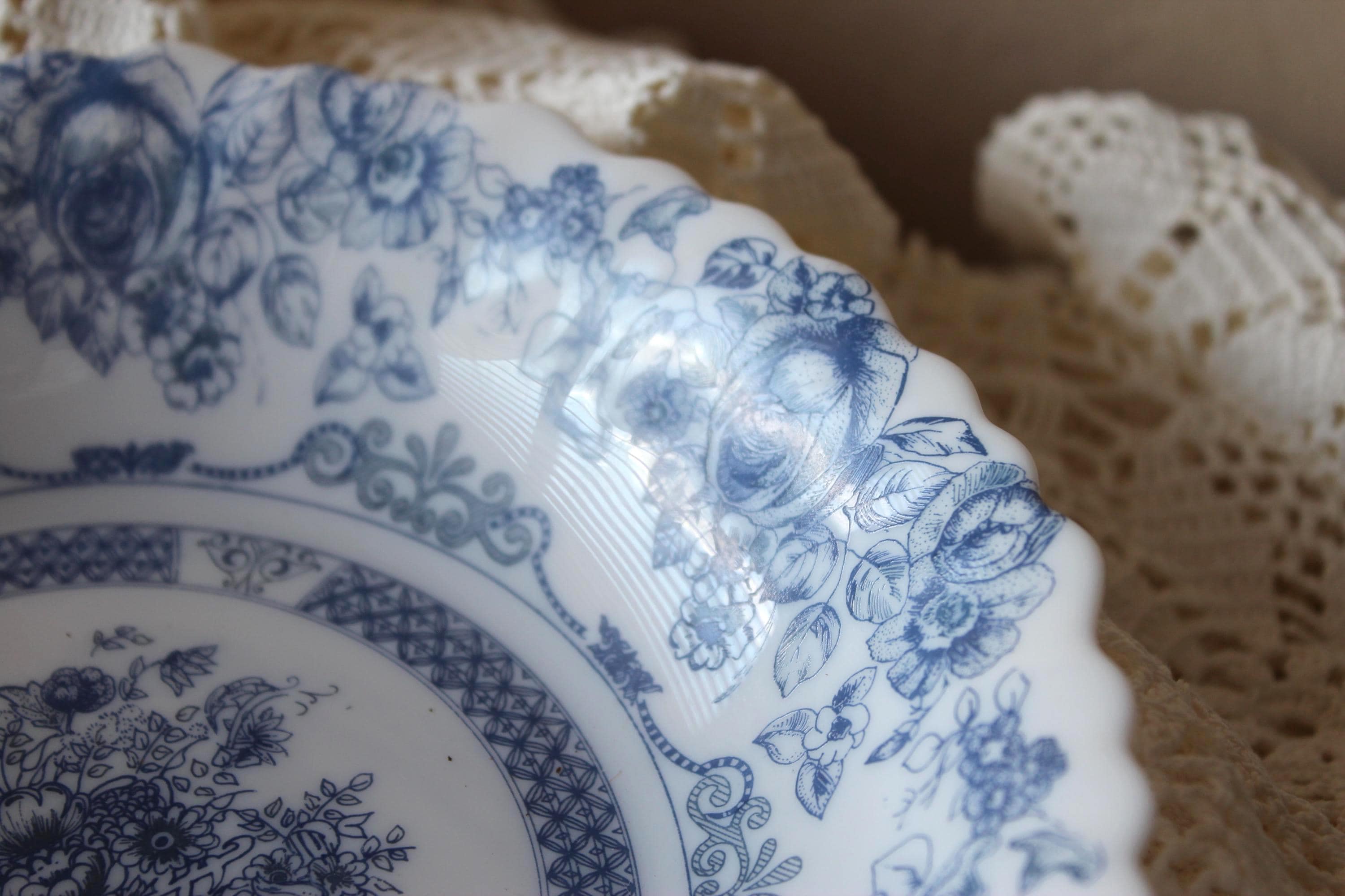 Vintage Honorine by Arcopal opal glass soup plate, 7 Inch in diameter and 1.5 inches deep. It is in the ARPHON pattern and is blue floral with a blue band and urn. The back of the bowl has a swirl pattern. Please review all photos. This is made in France. Excellent pre-owned condition.