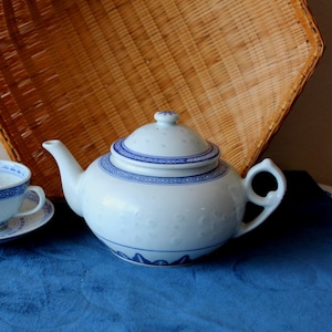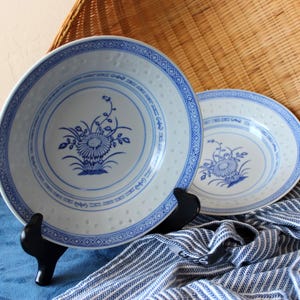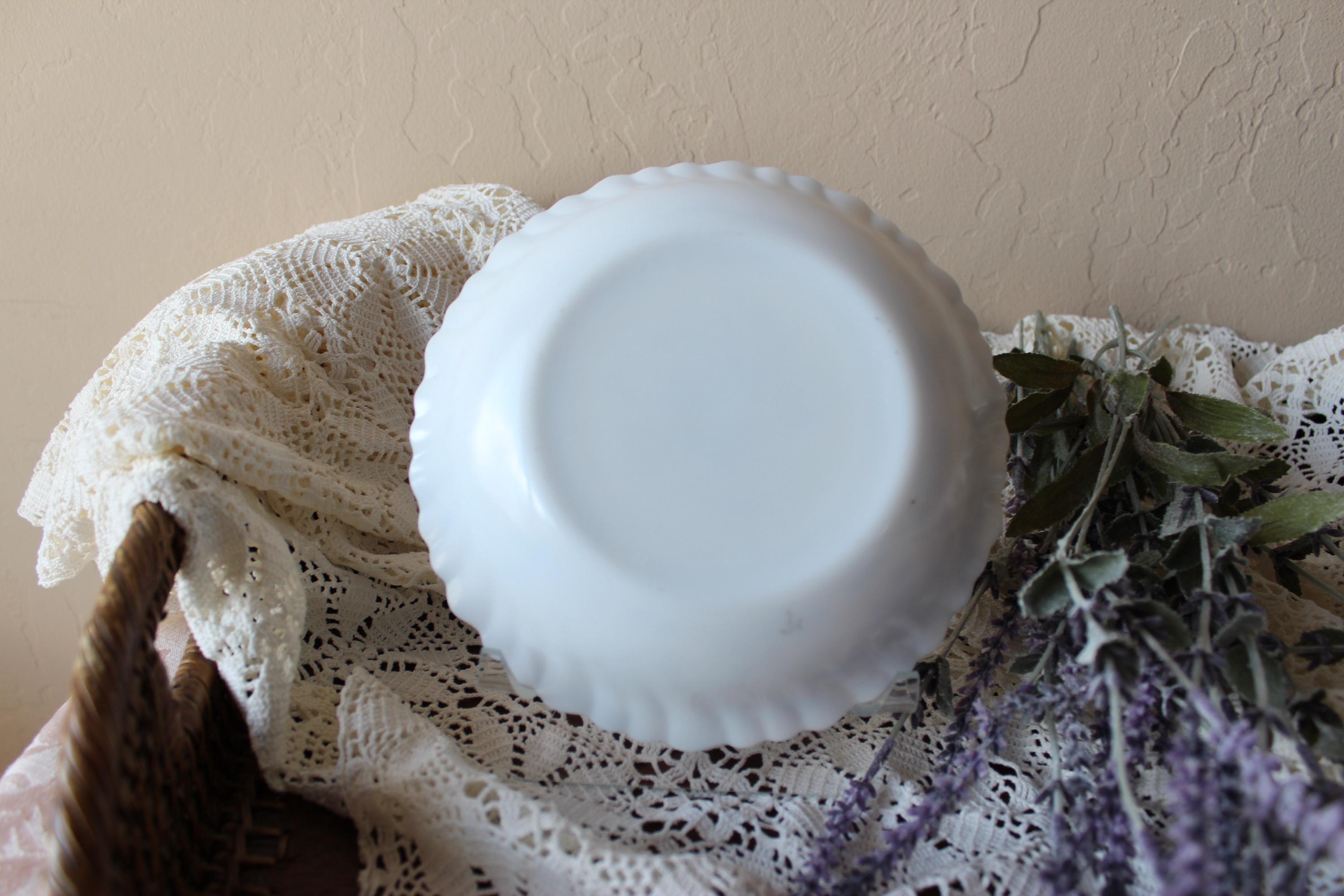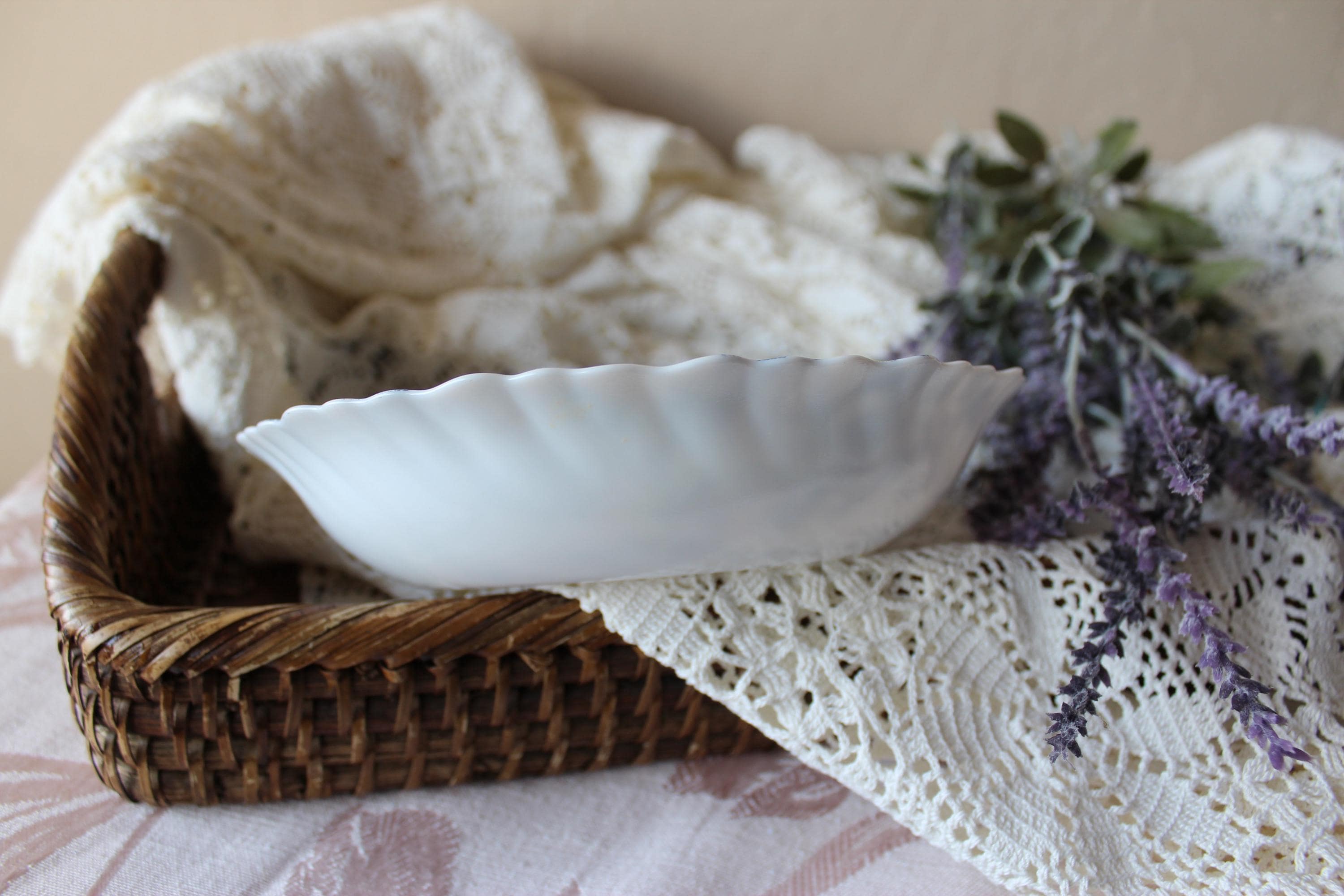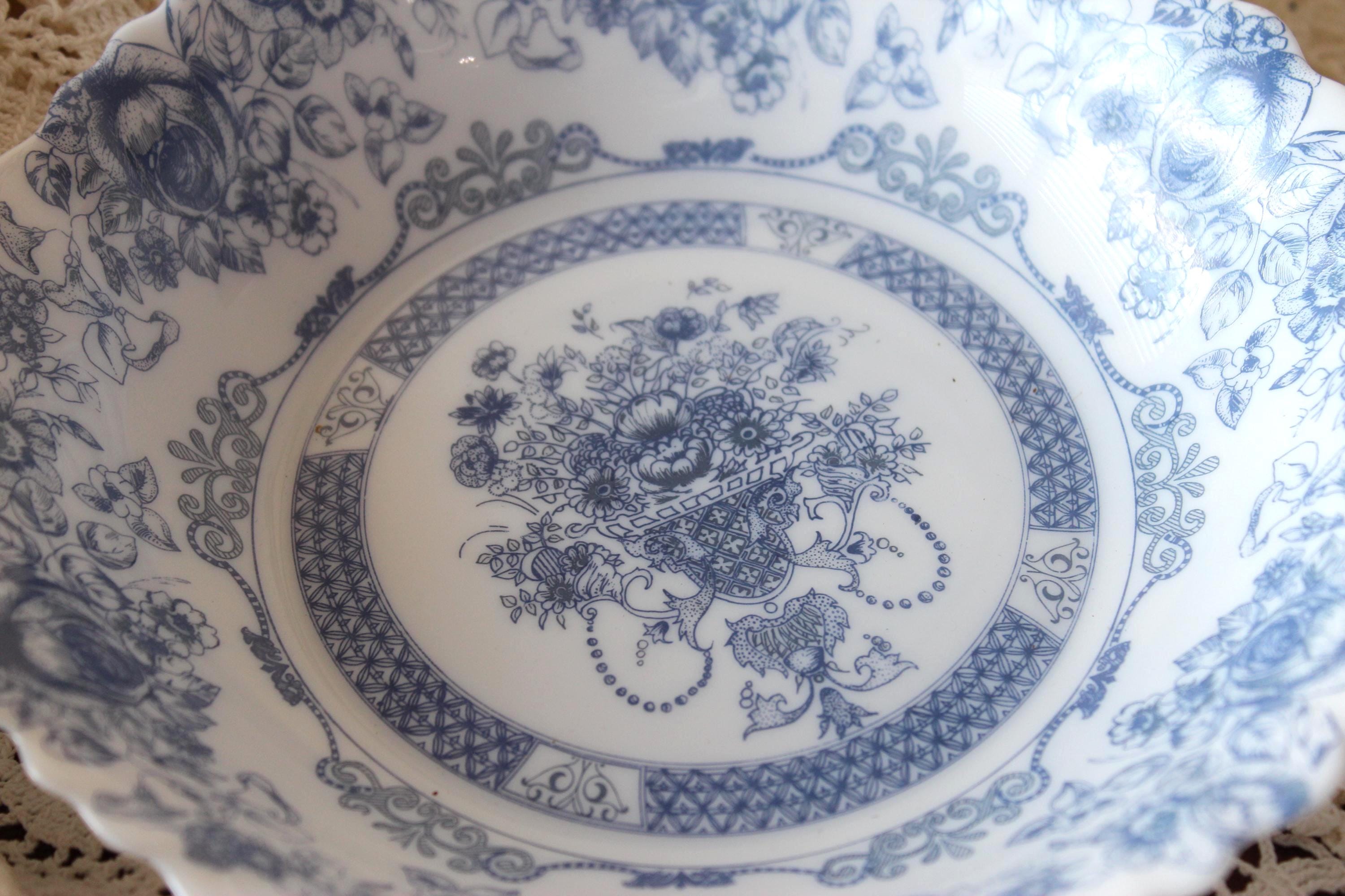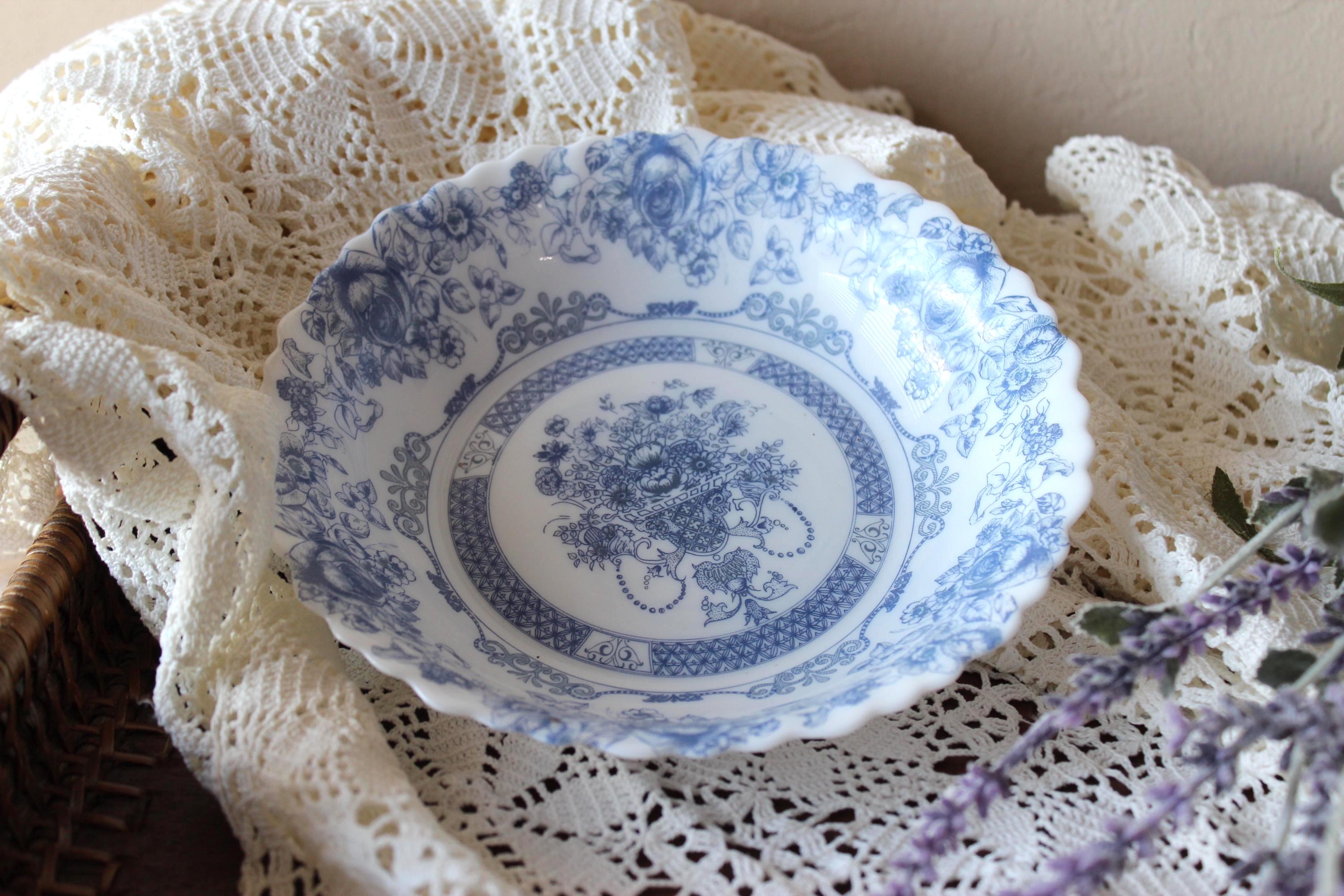 Vintage Honorine by Arcopal opal glass soup plate, 7 Inch in diameter and 1.5 inches deep. It is in the ARPHON pattern and is blue floral with a blue band and urn. The back of the bowl has a swirl pattern. Please review all photos. This is made in France. Excellent pre-owned condition.