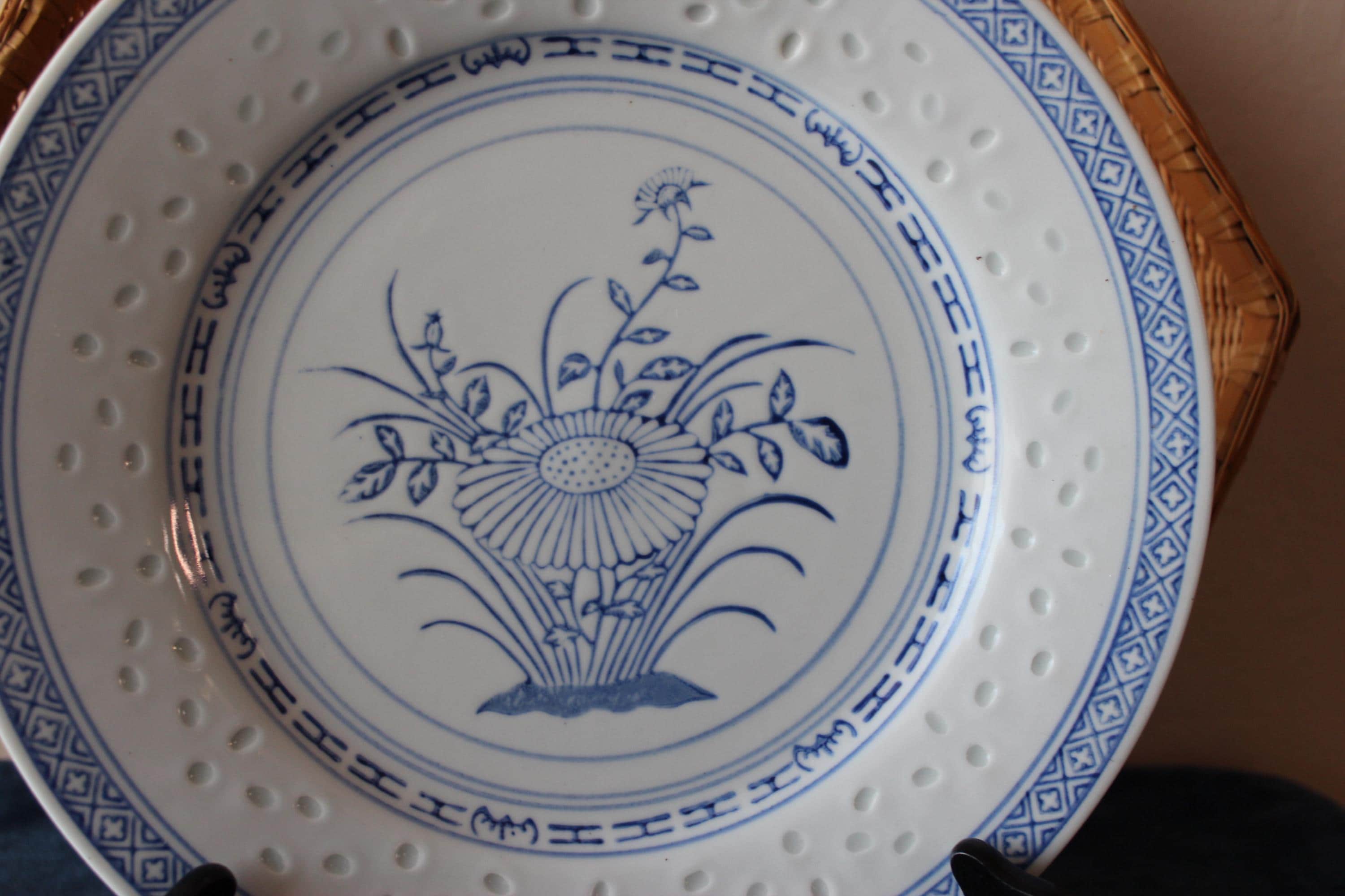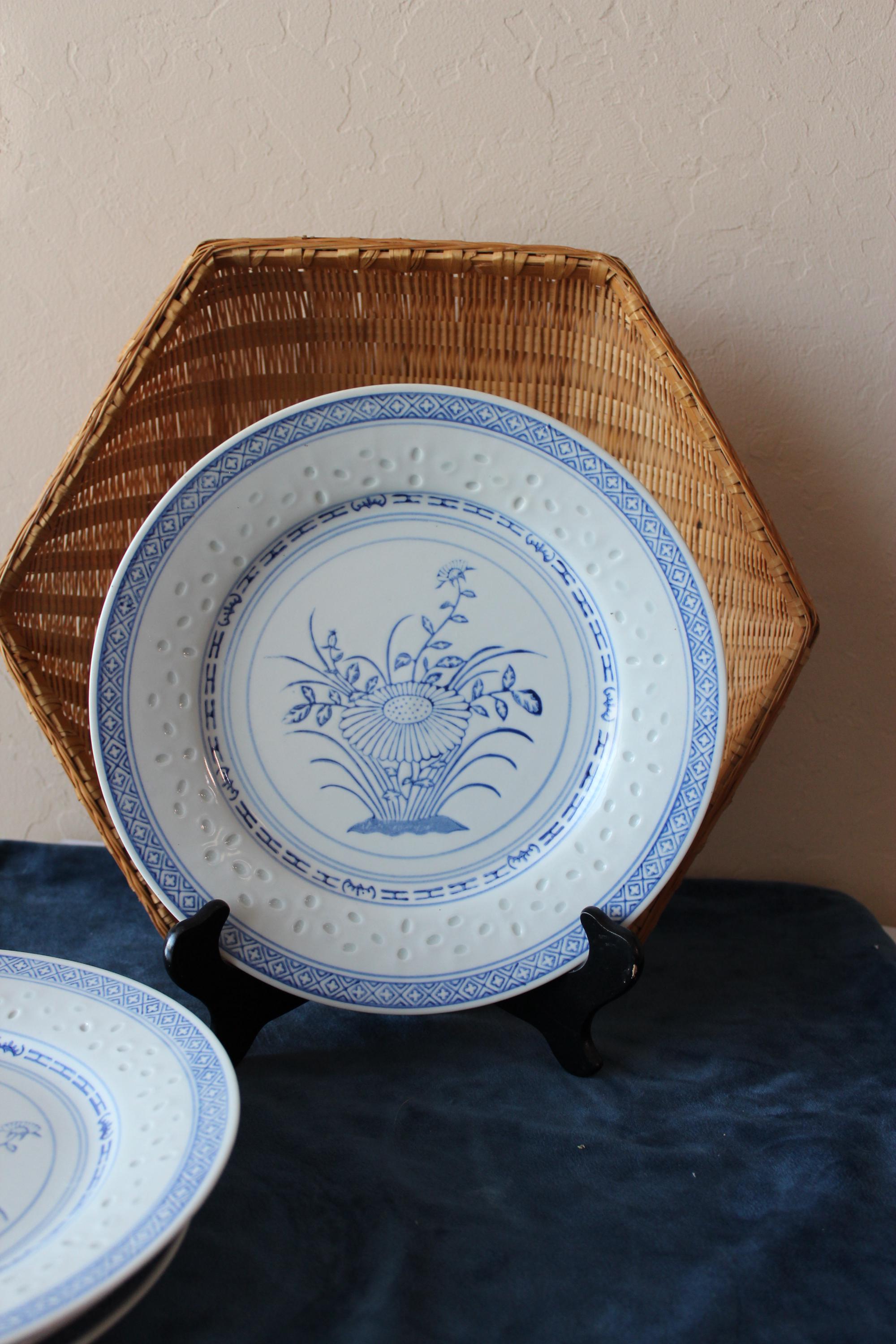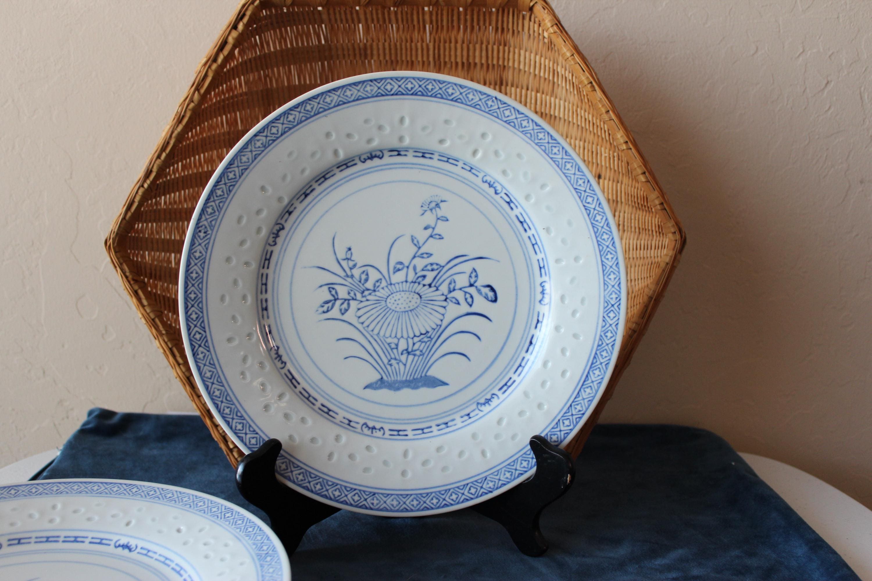 Vintage Set of Two, 10 inch plates, Rice Flower by Tienshan. Also is called Linglong pattern. The rice grain cut outs are translucent against the light (see photo). These are beautiful blue and white on fine porcelain, made in Jingdezhen China. Excellent pre-owned condition.