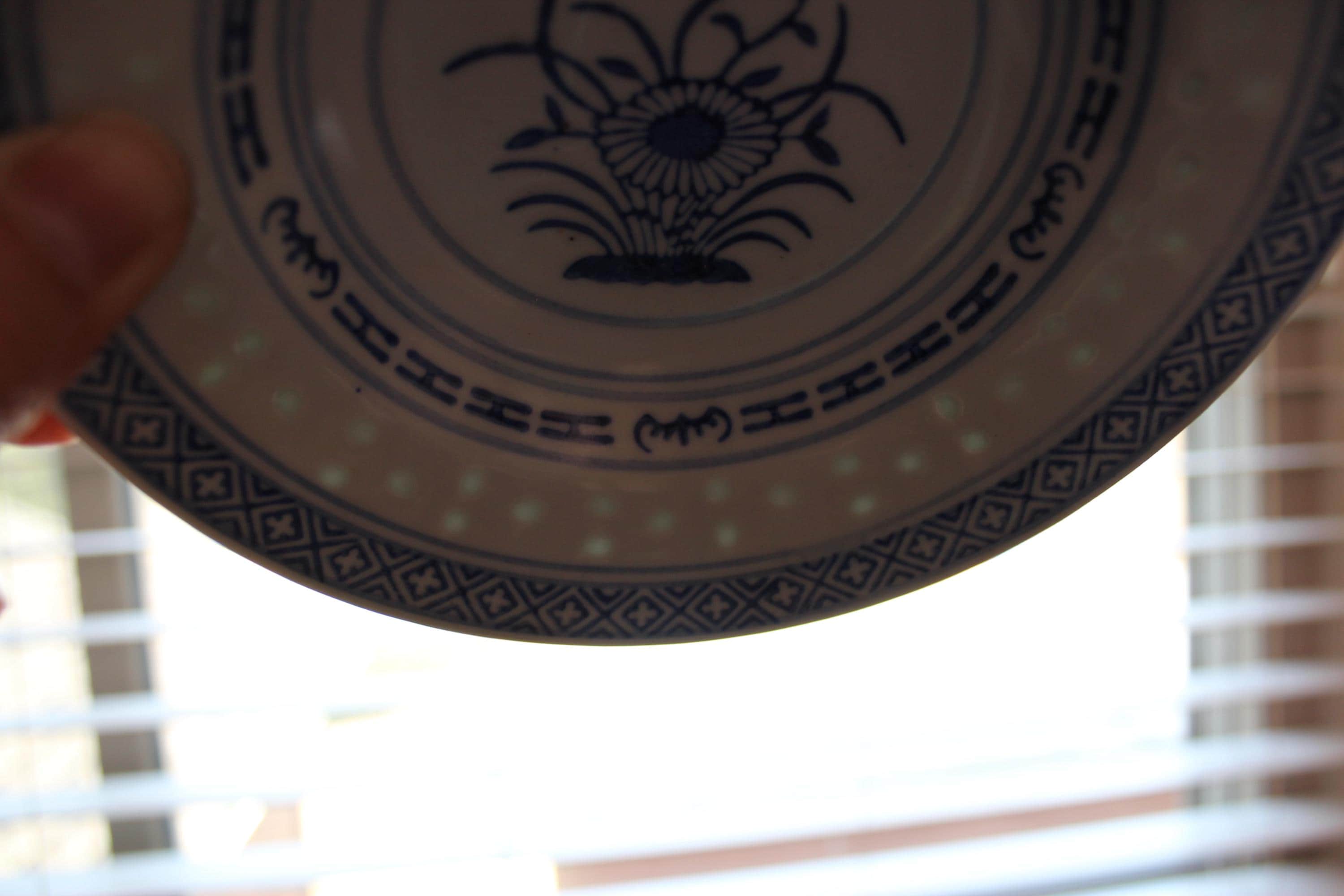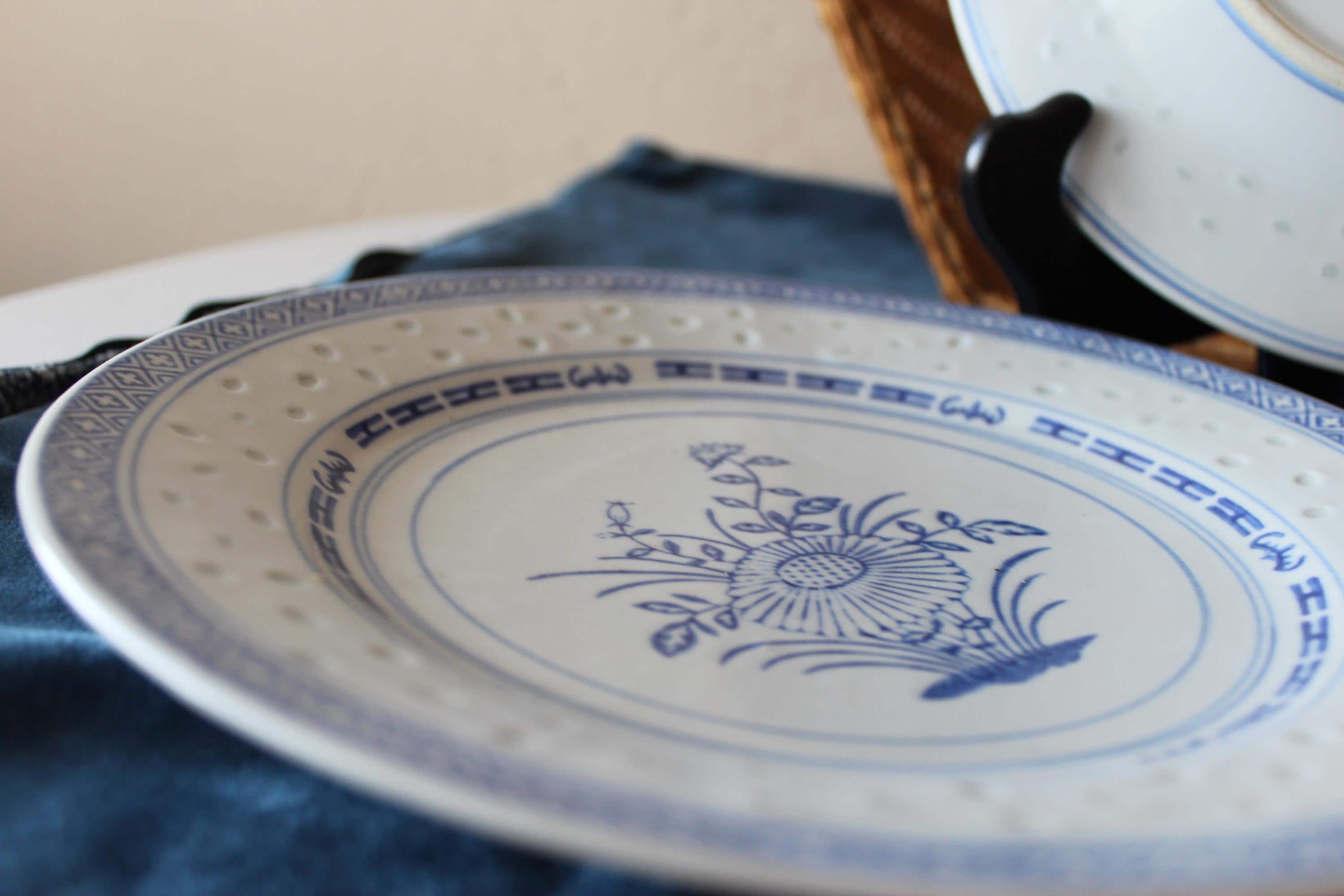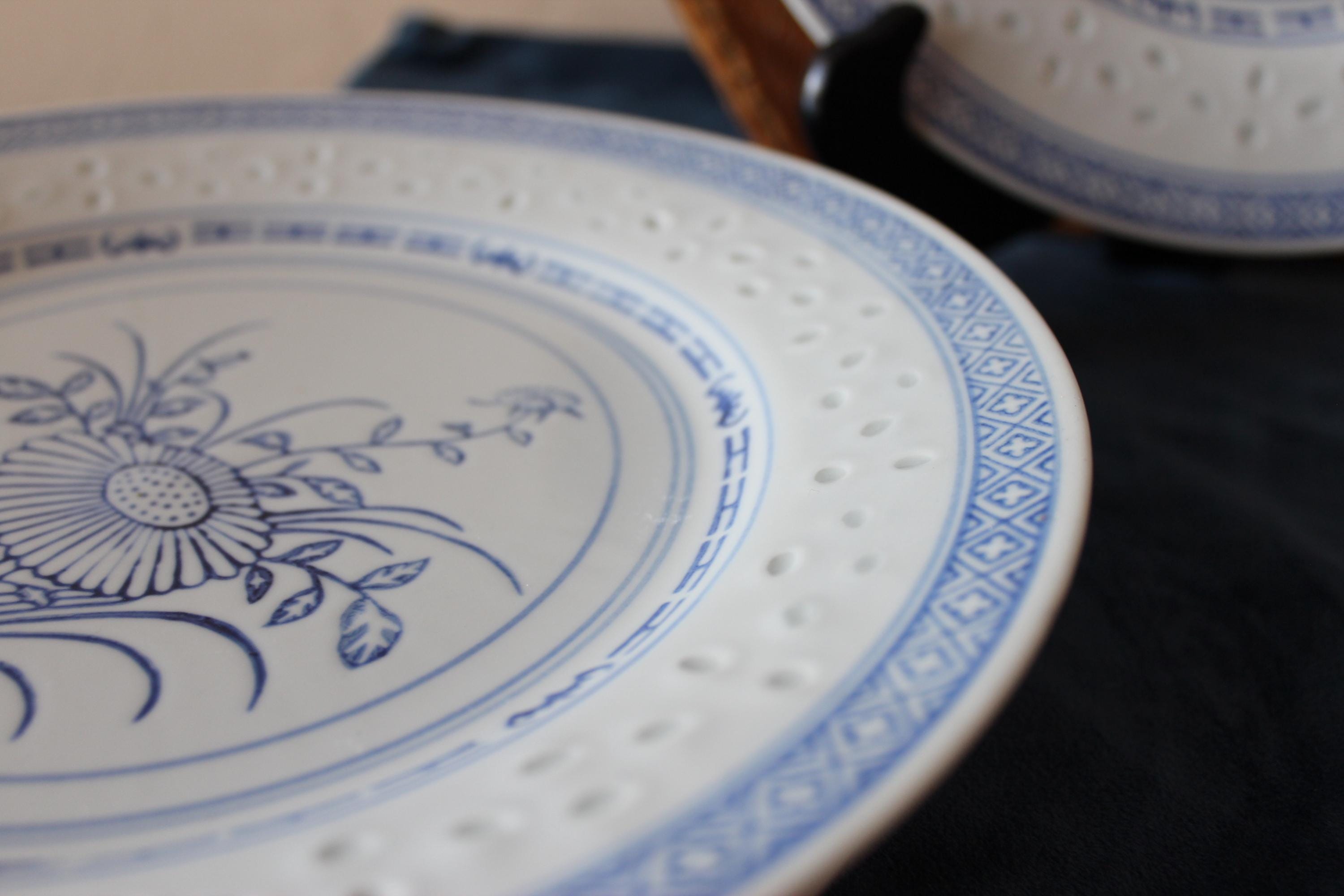 Vintage Set of Two, 10 inch plates, Rice Flower by Tienshan. Also is called Linglong pattern. The rice grain cut outs are translucent against the light (see photo). These are beautiful blue and white on fine porcelain, made in Jingdezhen China. Excellent pre-owned condition.