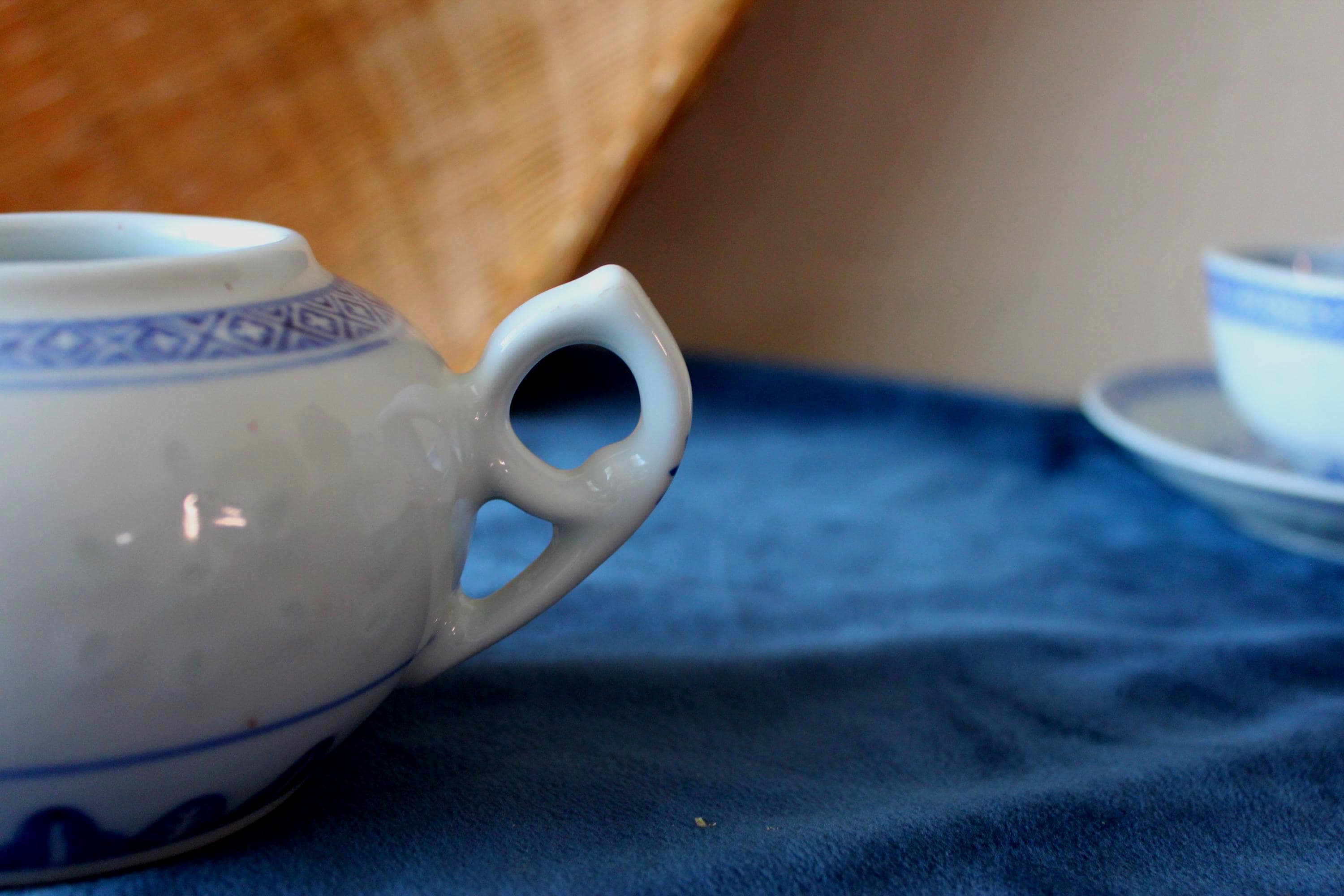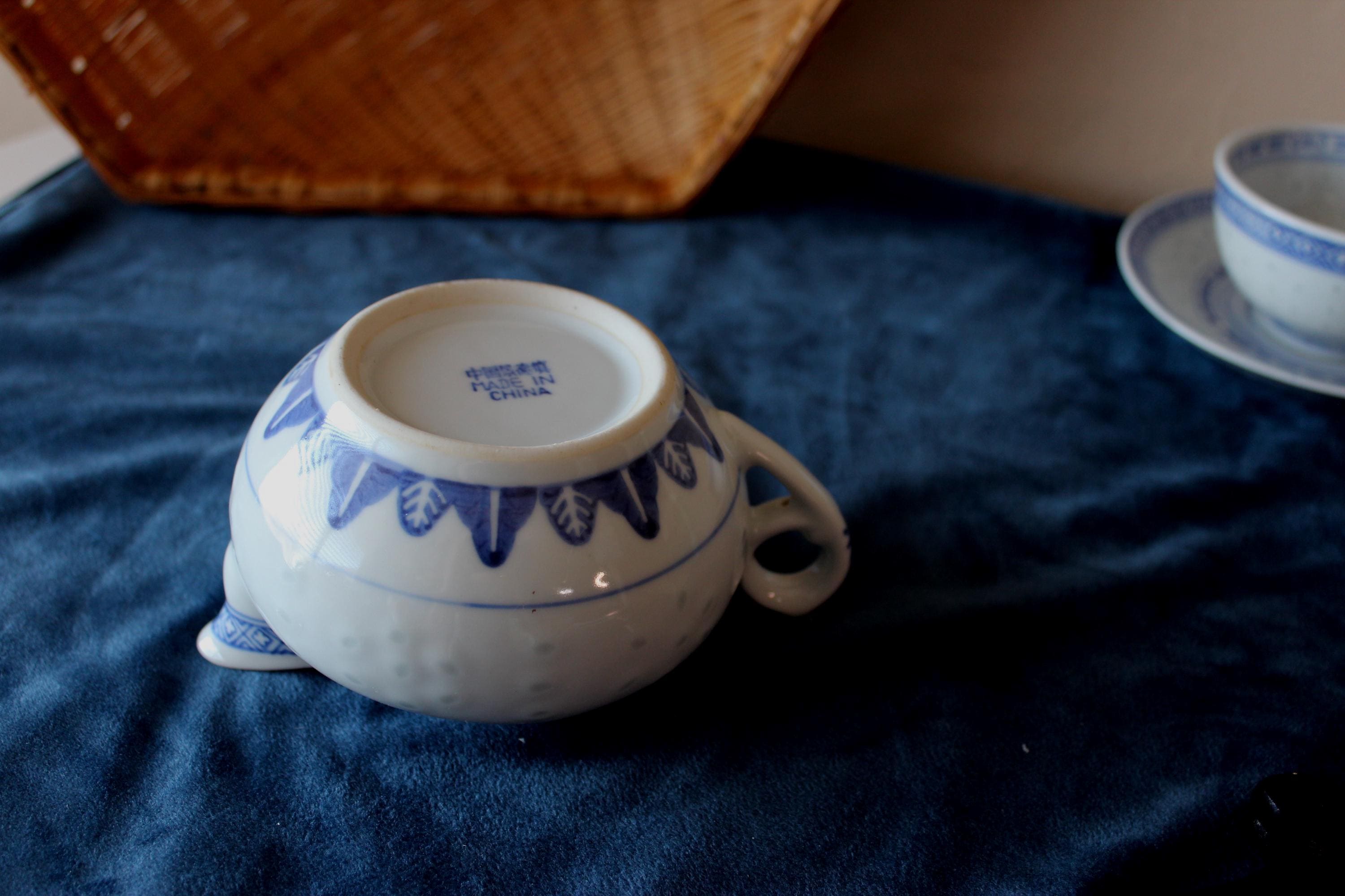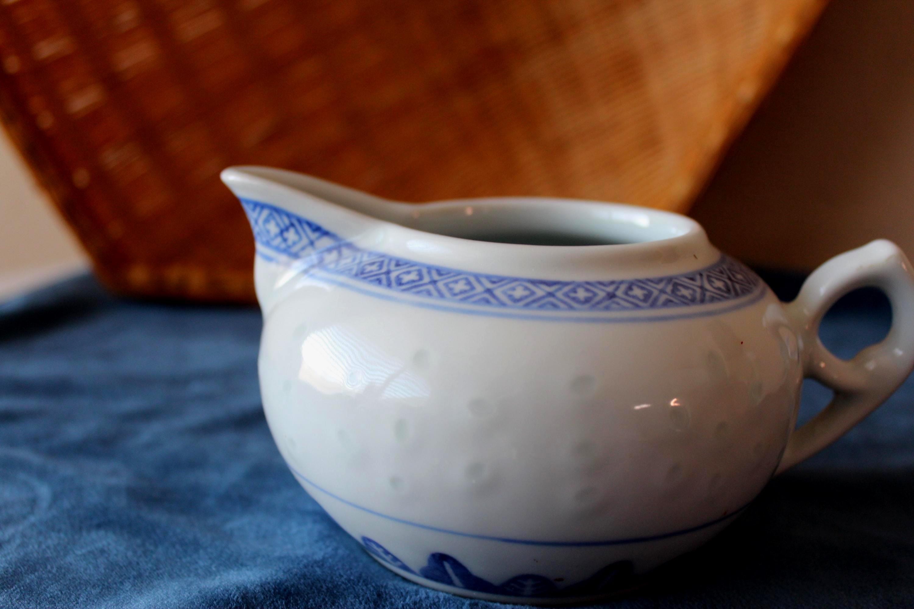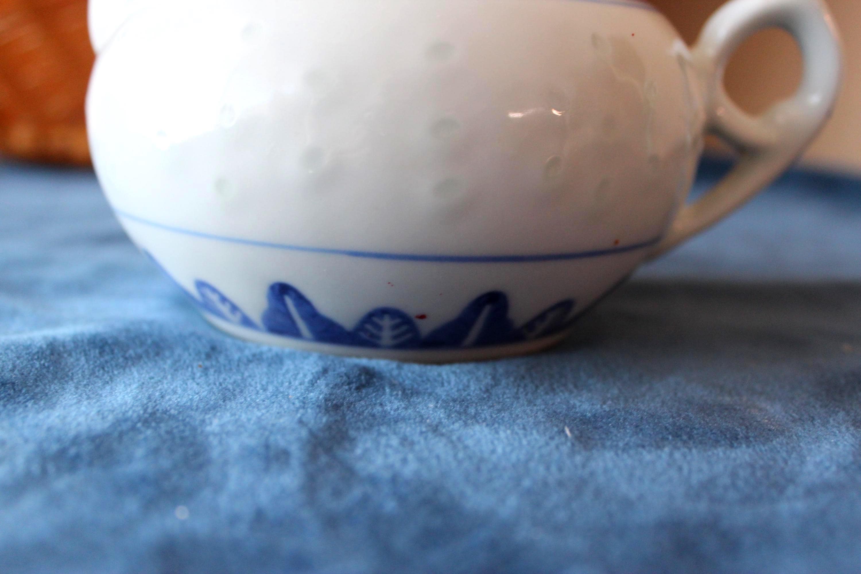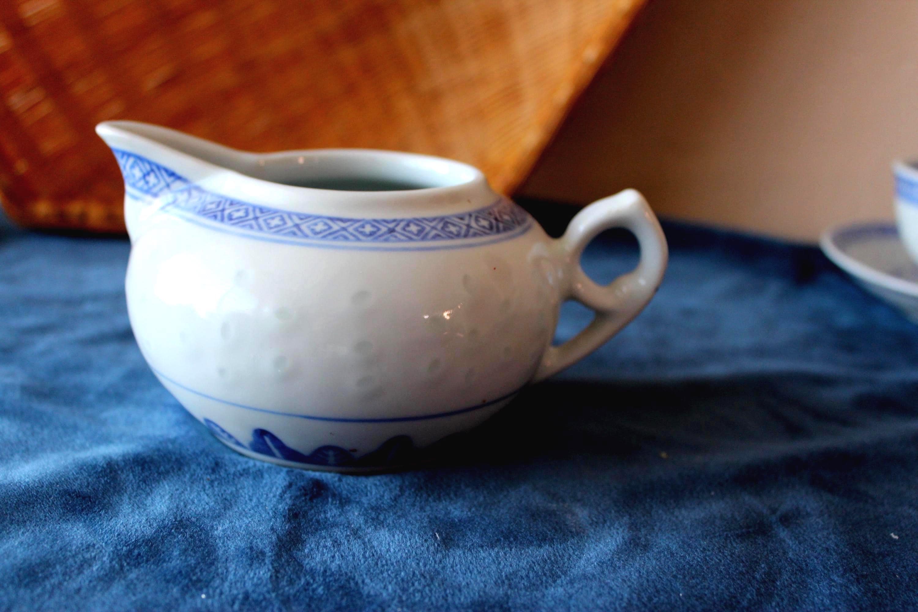 5 3/4 x3 inches high. Vintage creamer pitcher Rice Flower by Tienshan. Also is called Linglong pattern. The rice grain cut outs are translucent against the light. Beautiful blue and white on fine porcelain, made in Jingdezhen China. Excellent pre-owned condition