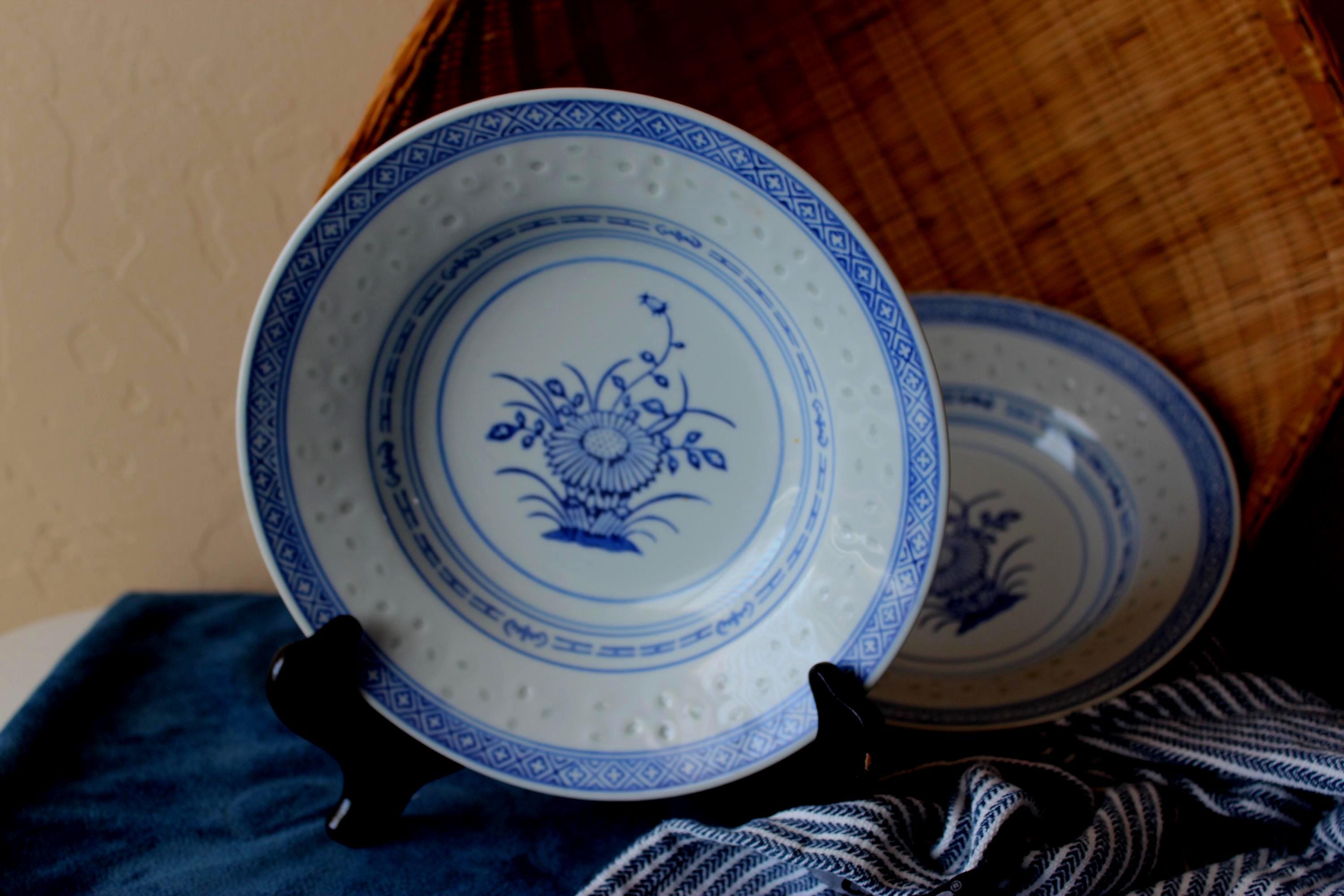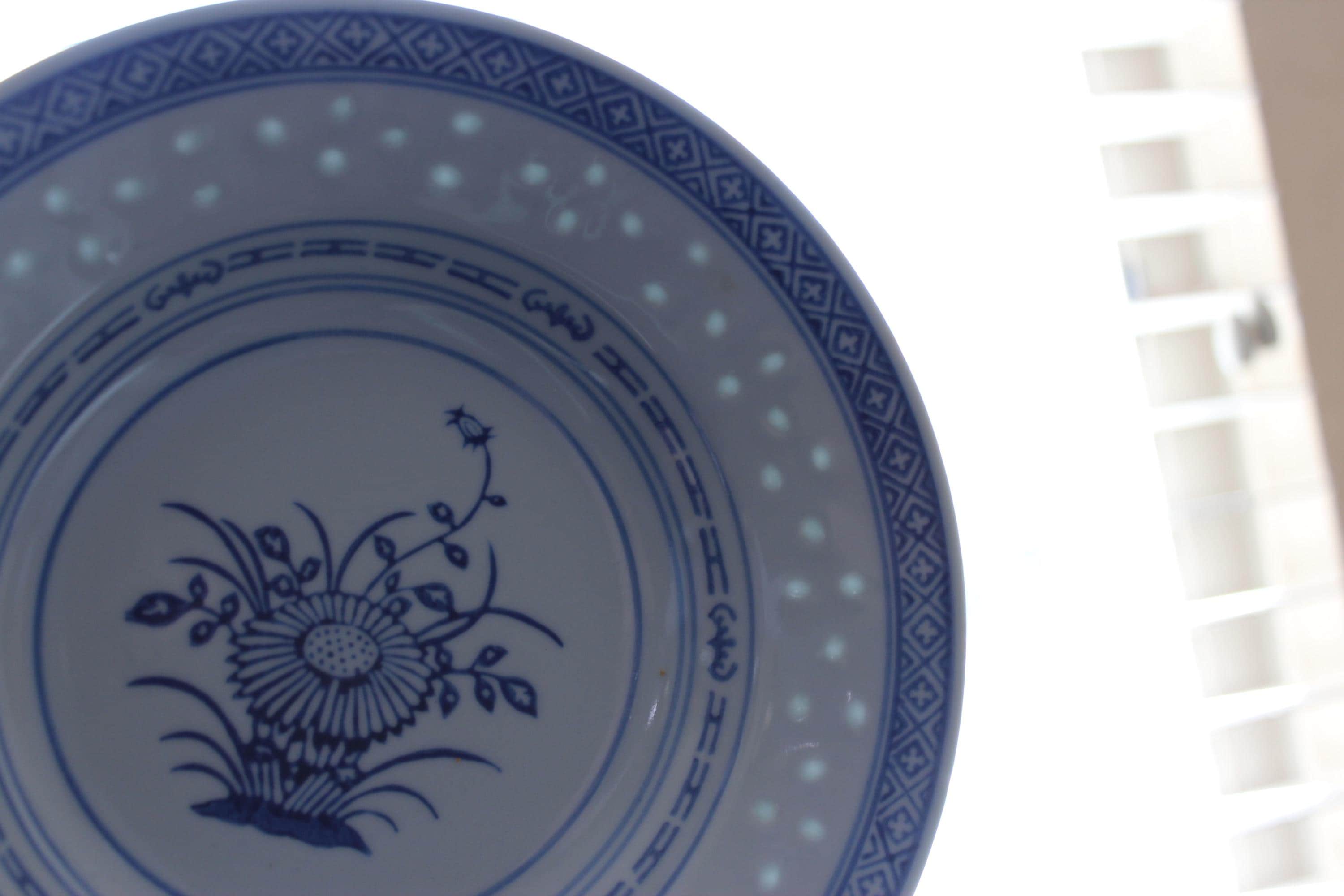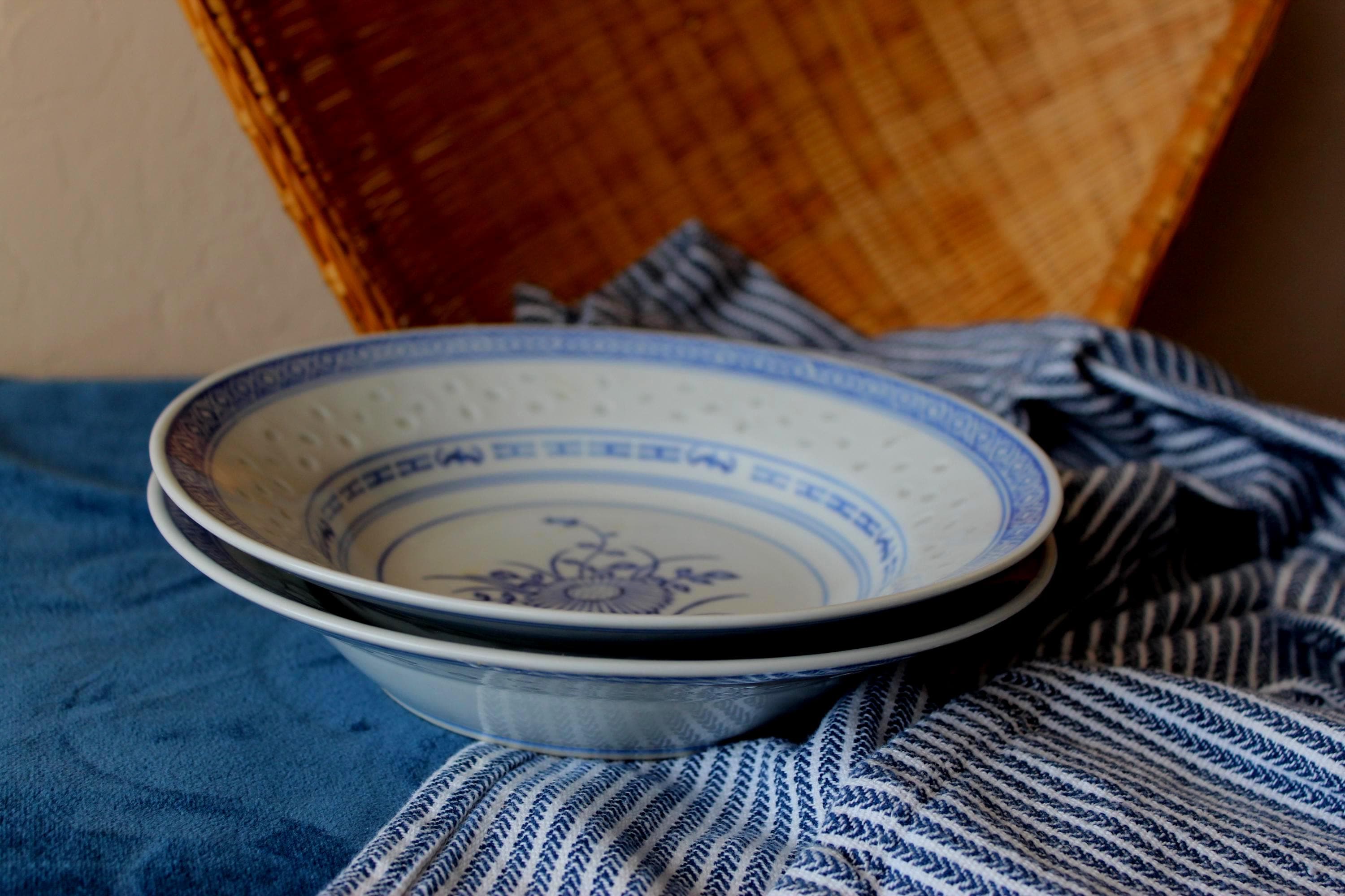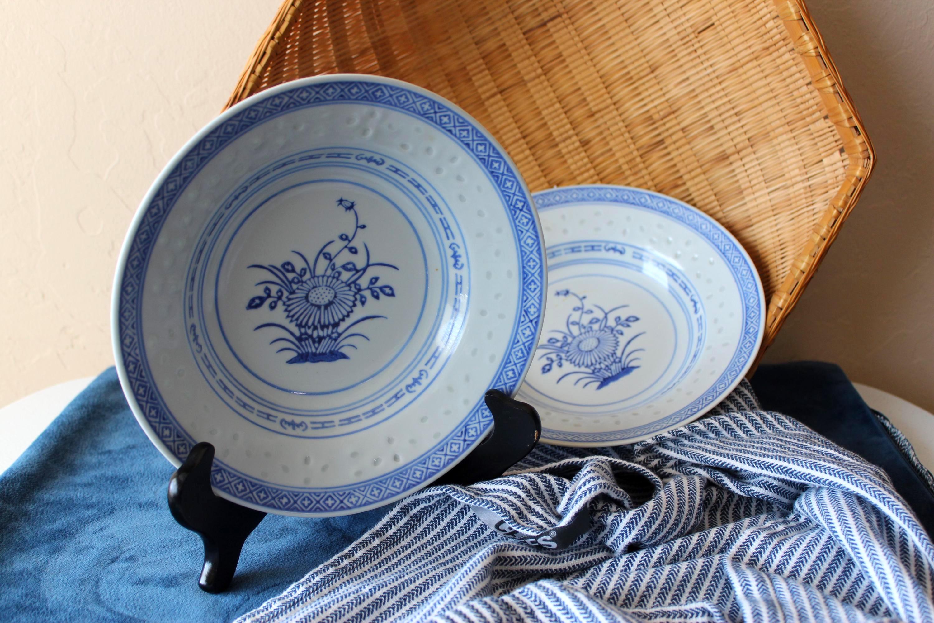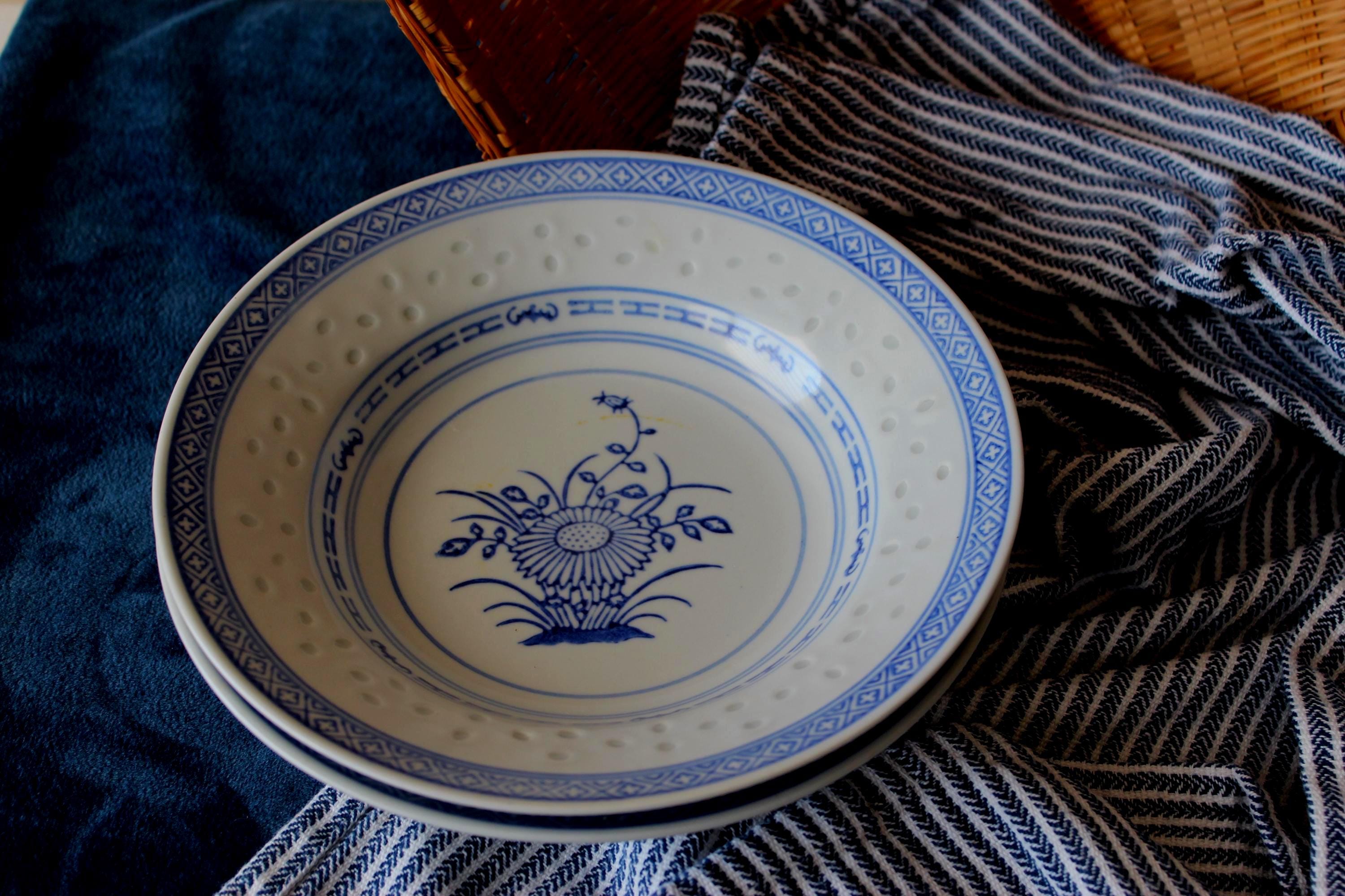 Vintage Set of Two 8 inch soup bowls, Rice Flower by Tienshan. Also is called Linglong pattern. The rice grain cut outs are translucent against the light (see photo). These are beautiful blue and white on fine porcelain, made in Jingdezhen China. Excellent pre-owned condition.