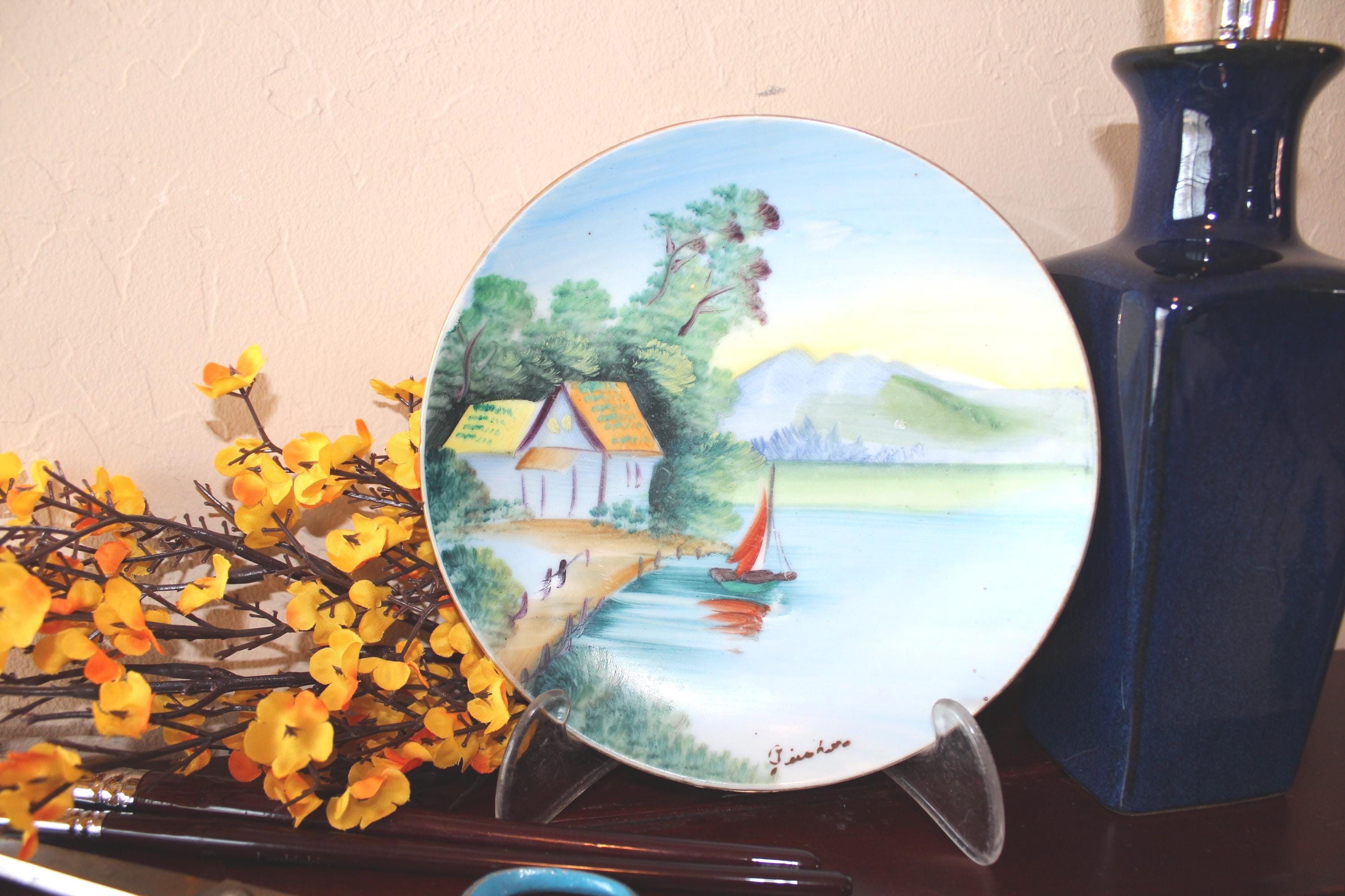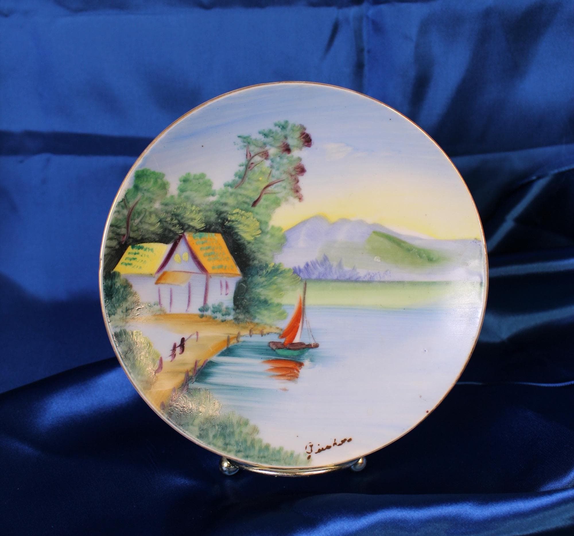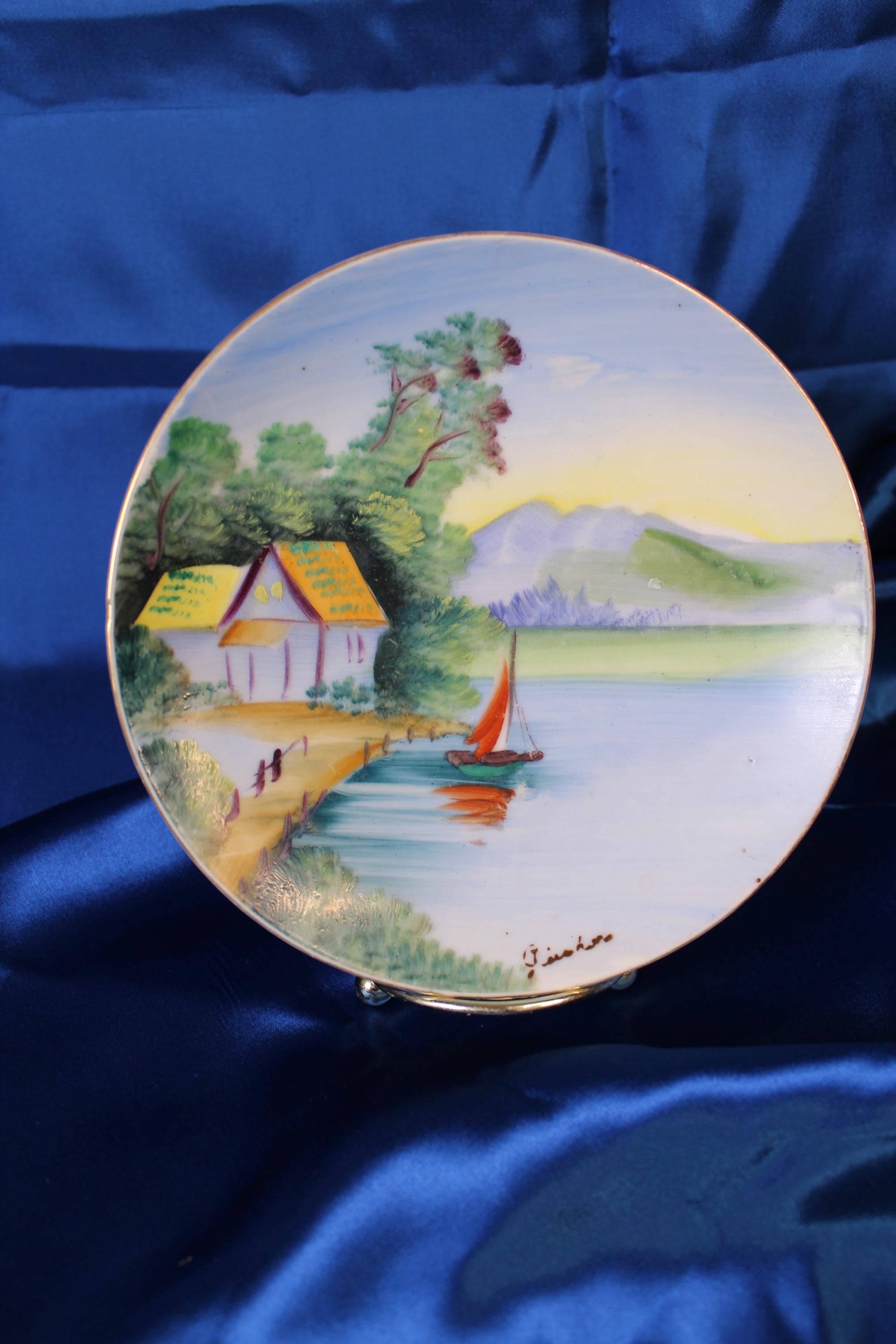 Vintage mid century hand painted decorative plate. Signed by artist. It is a colorful lakeside view of a cottage and sailboat and mountains in the background. Excellent condition. It has manufactured holes in the back for hanging, or can be set in an easel or a plate shelf. It measures 6 inches in diameter.