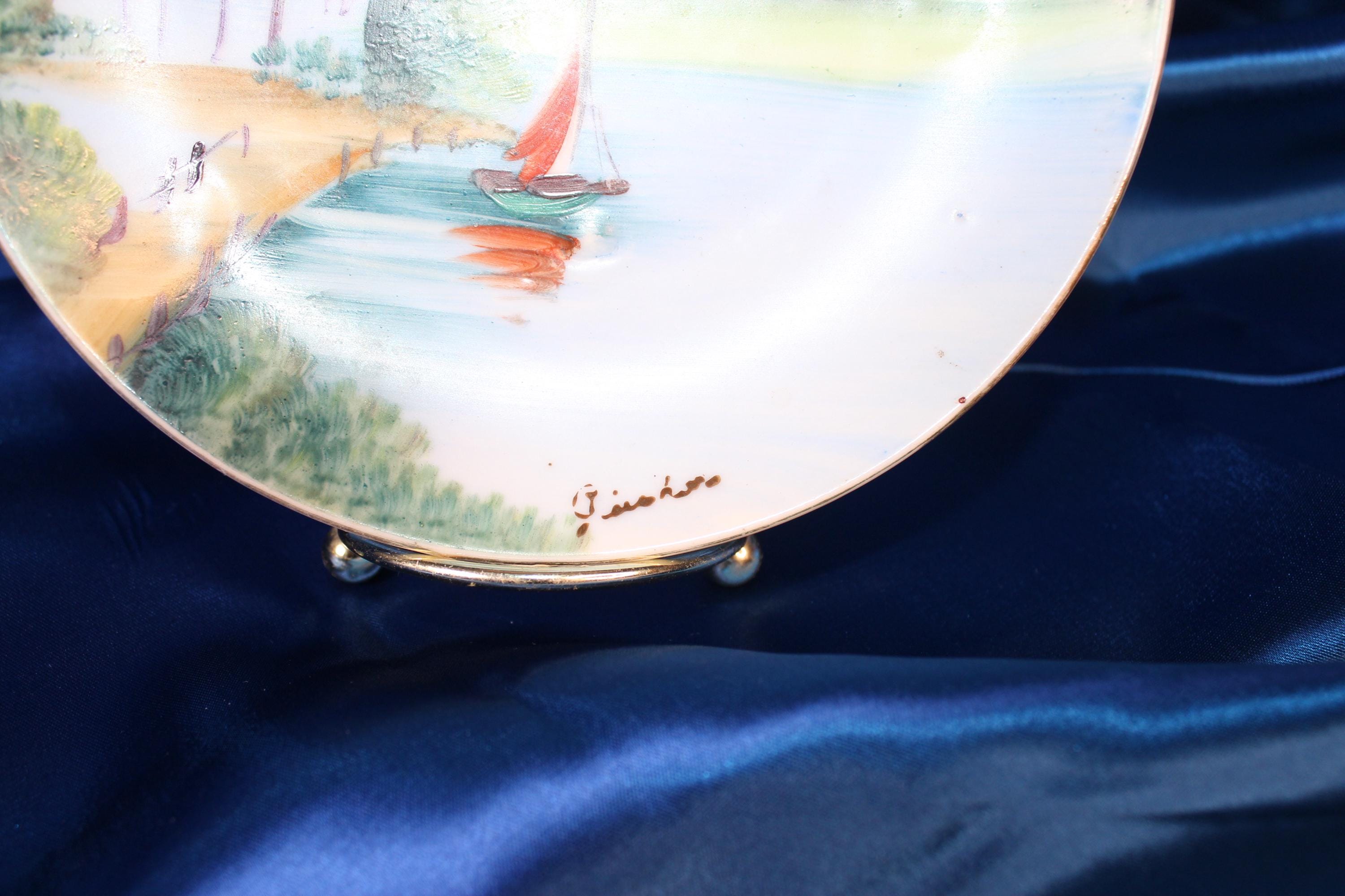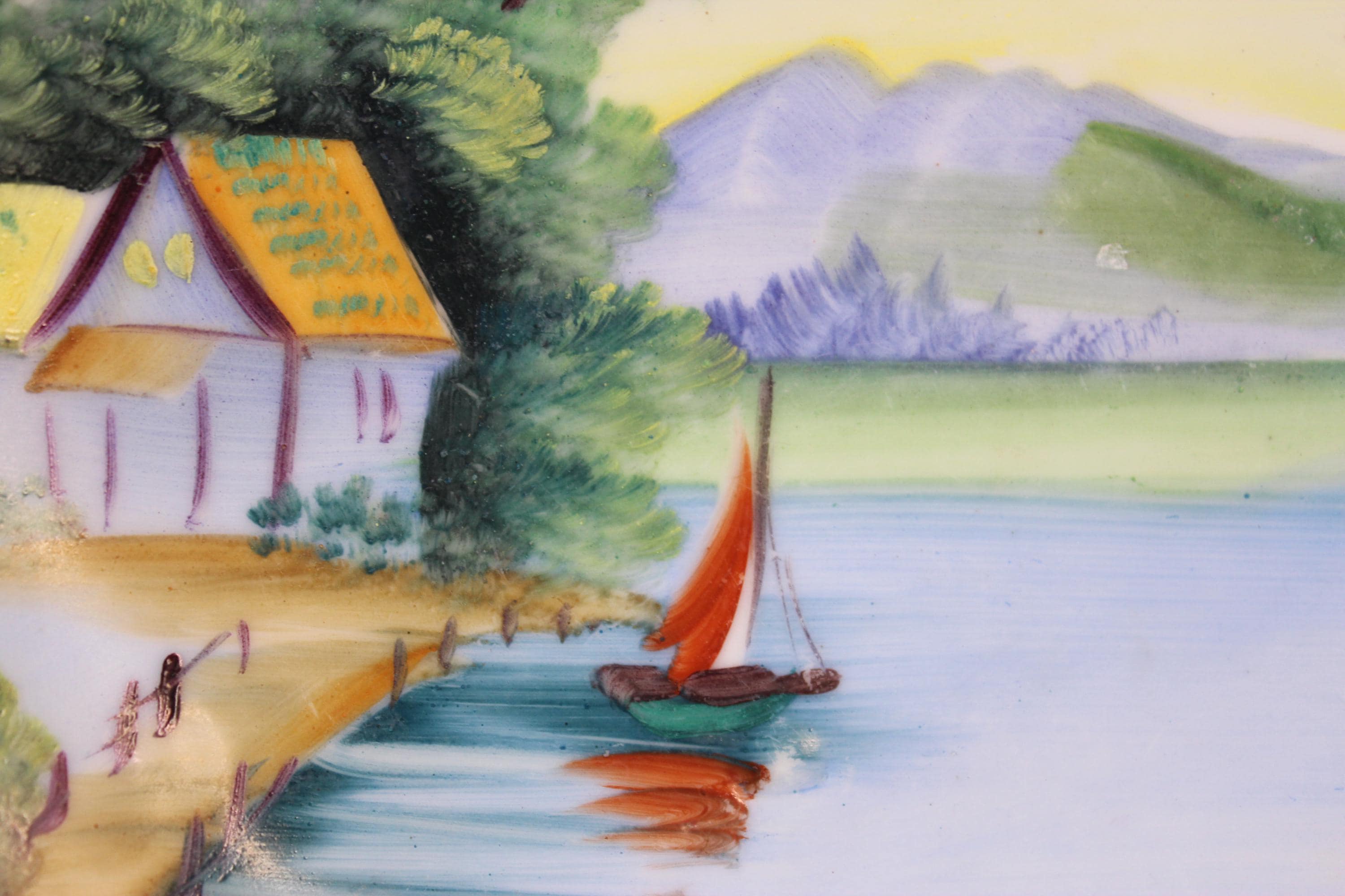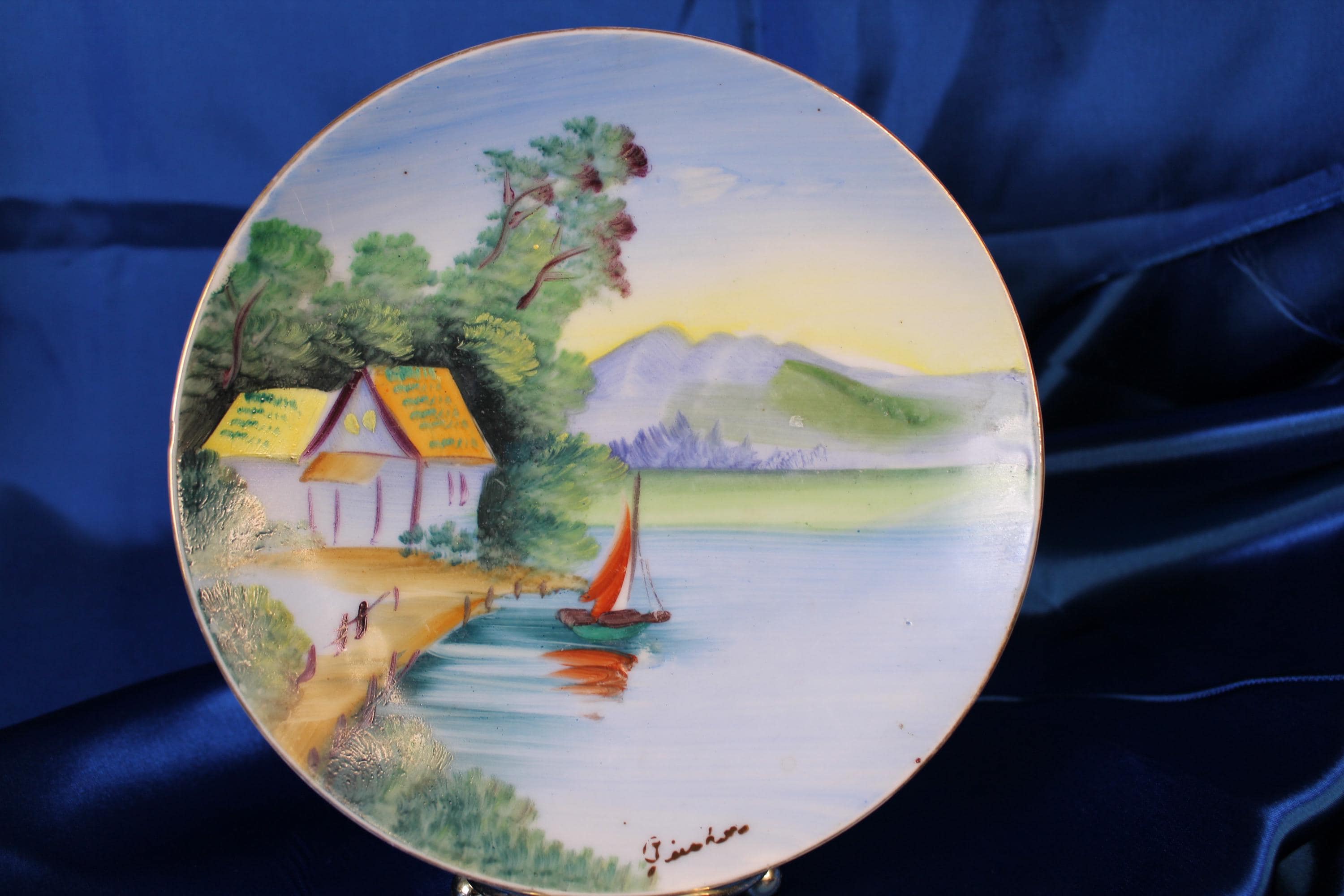 Vintage mid century hand painted decorative plate. Signed by artist. It is a colorful lakeside view of a cottage and sailboat and mountains in the background. Excellent condition. It has manufactured holes in the back for hanging, or can be set in an easel or a plate shelf. It measures 6 inches in diameter.