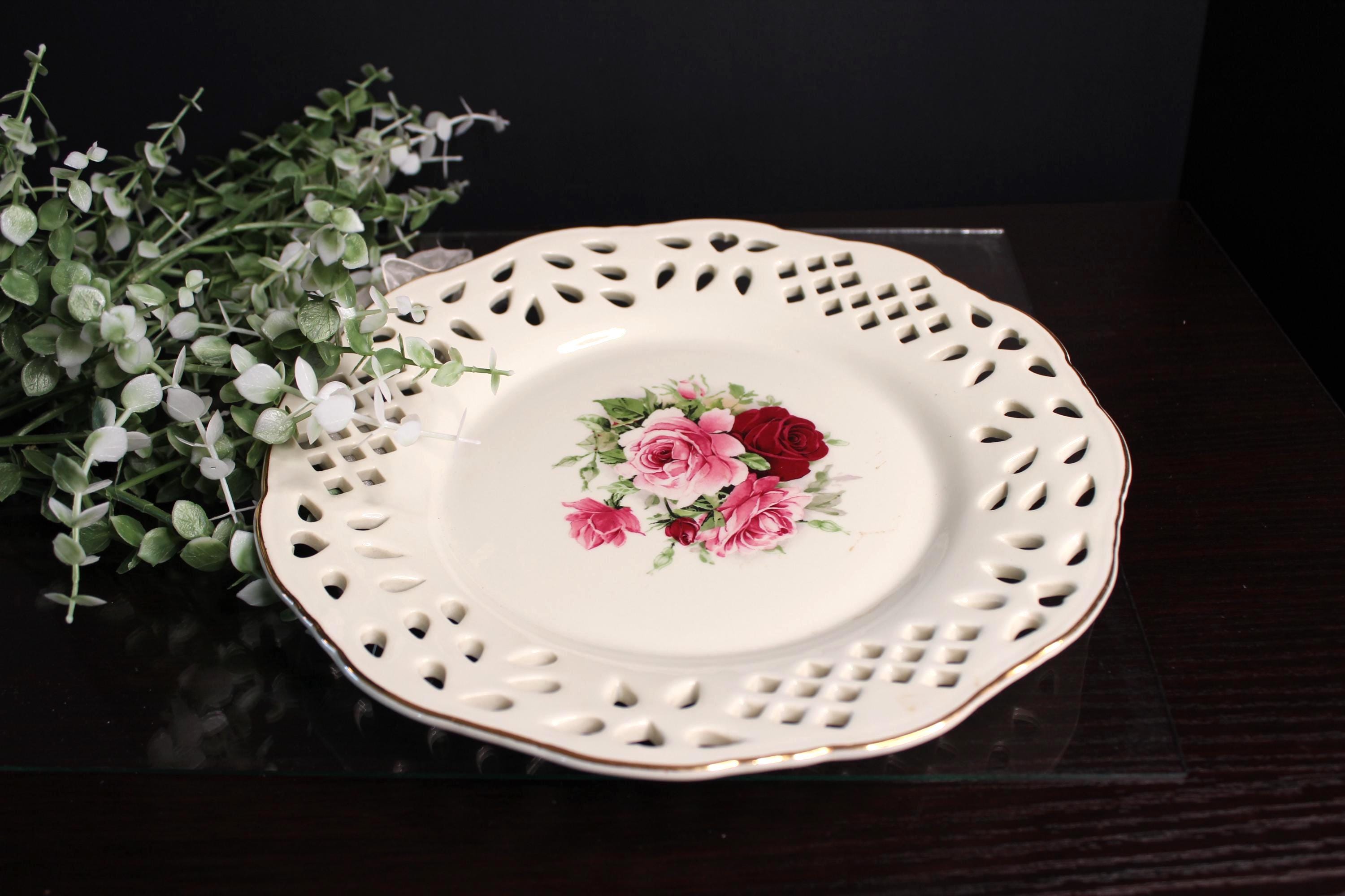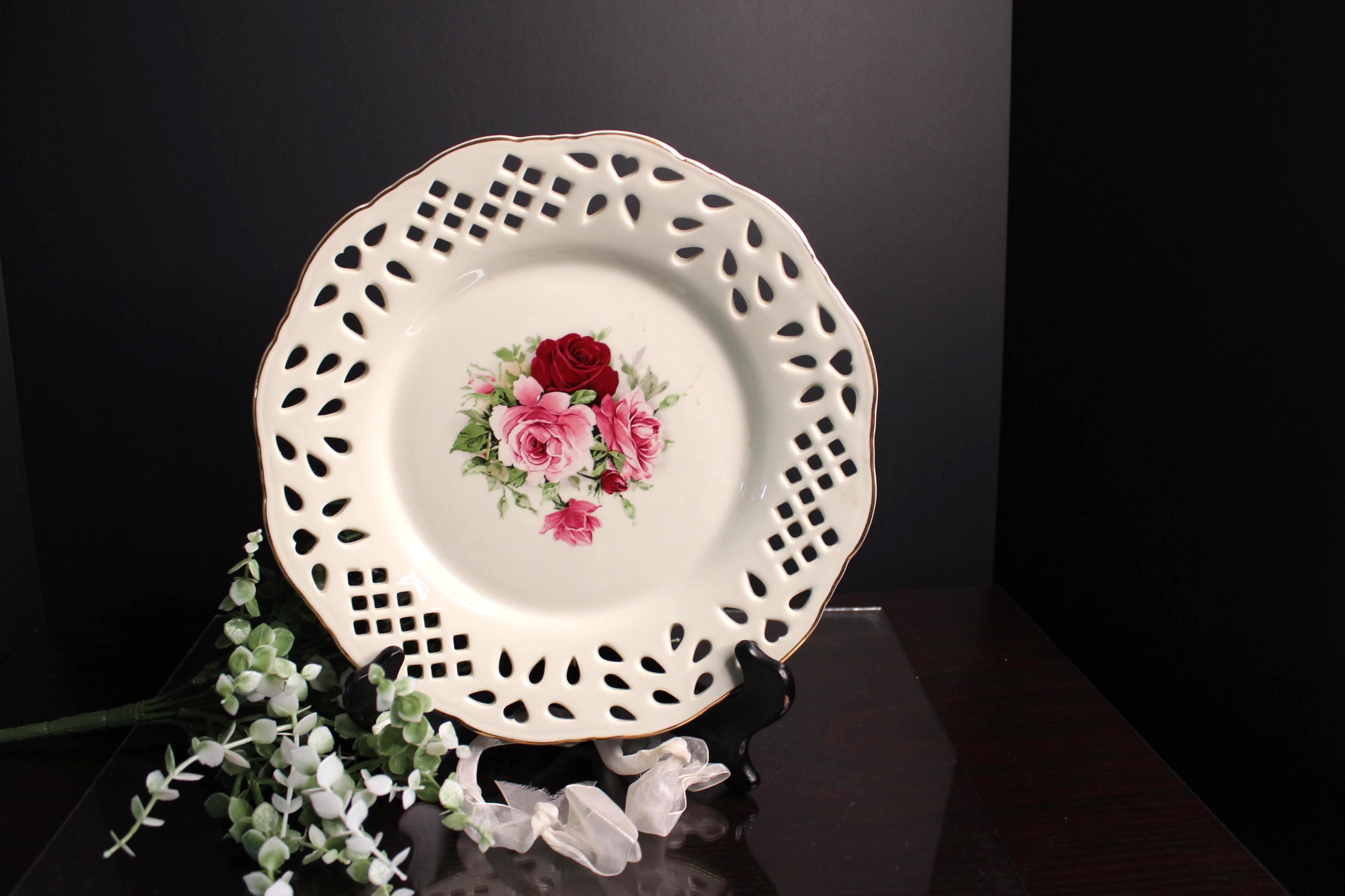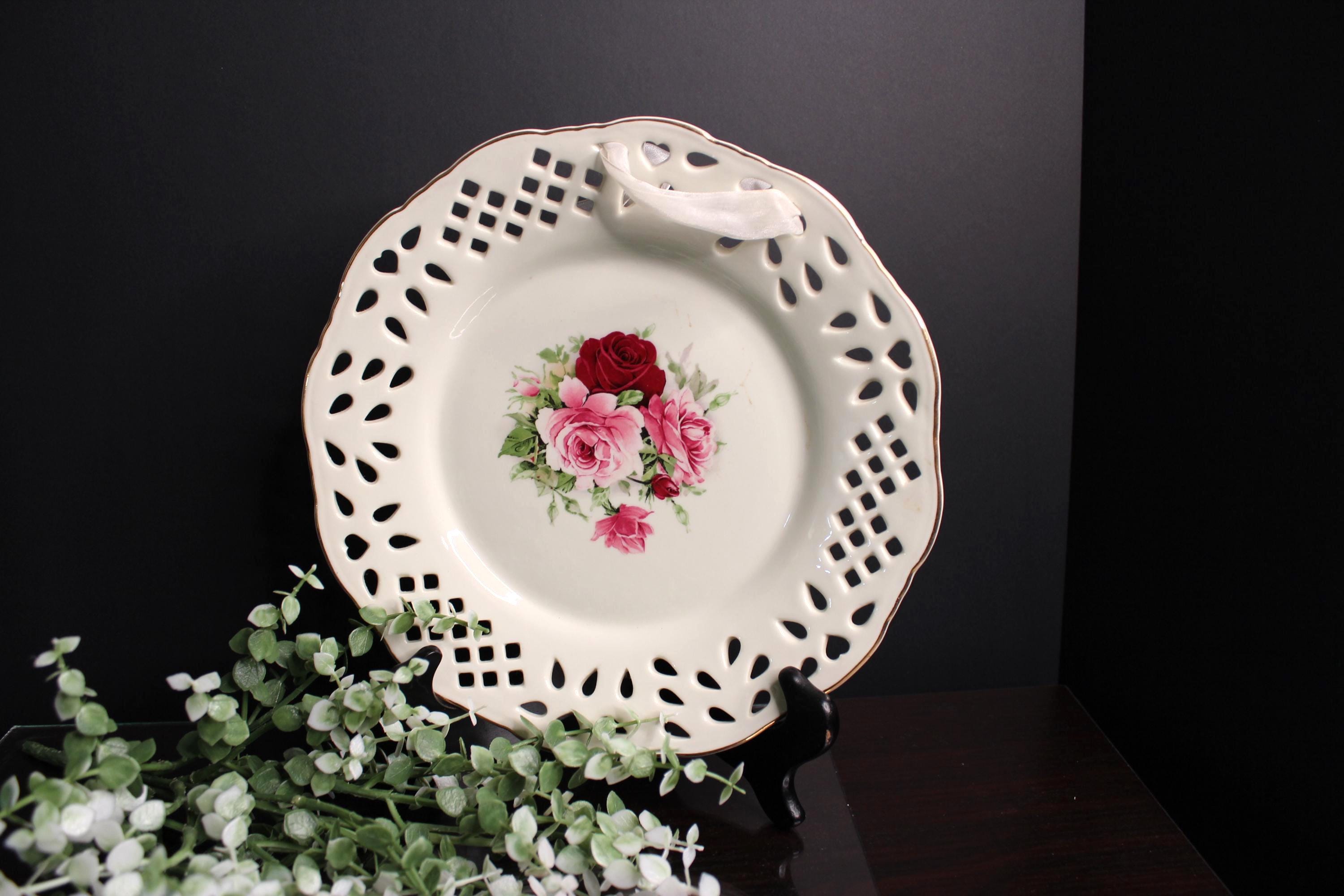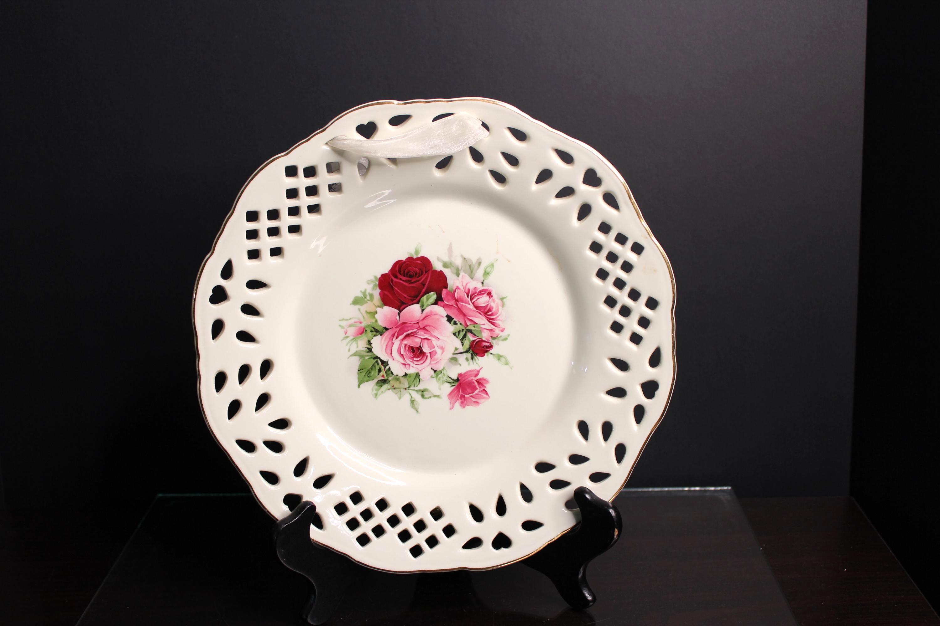 Vintage Decorative Plate, Red and Pink Roses by Baum Bros 10.5 Inch. Can be hung with a ribbon or a plate holder or is just as gorgeous on an easel or plate shelf. It has a scalloped edge with decorative cutouts around the border. It is edged in gold. The gorgeous deep red and vibrant pinks in the roses are complemented by the greenery in the background. This is in excellent condition, no chips, cracks, or crazing. Lovely in many types of decor.