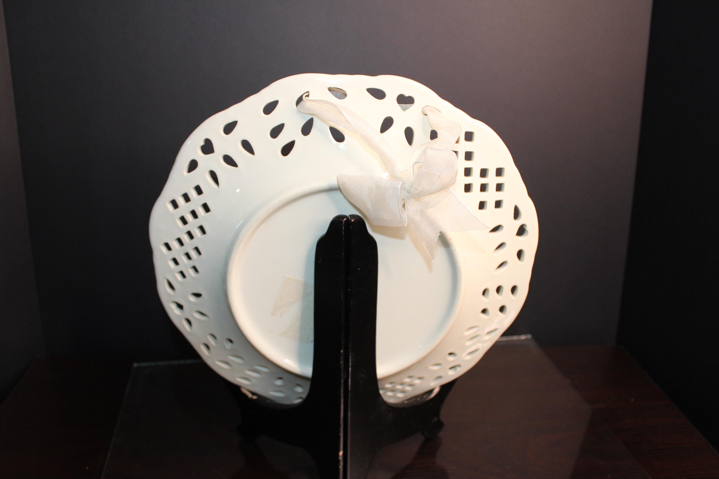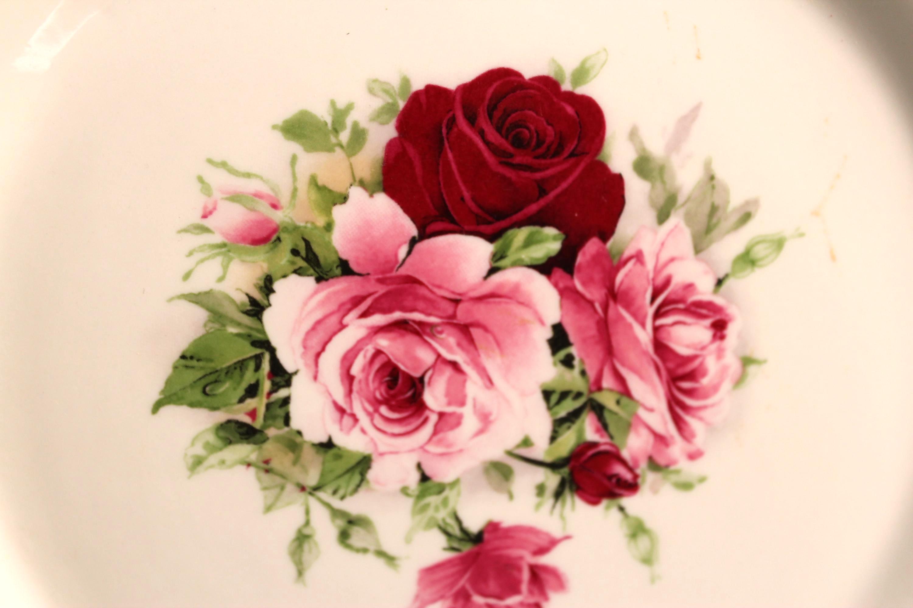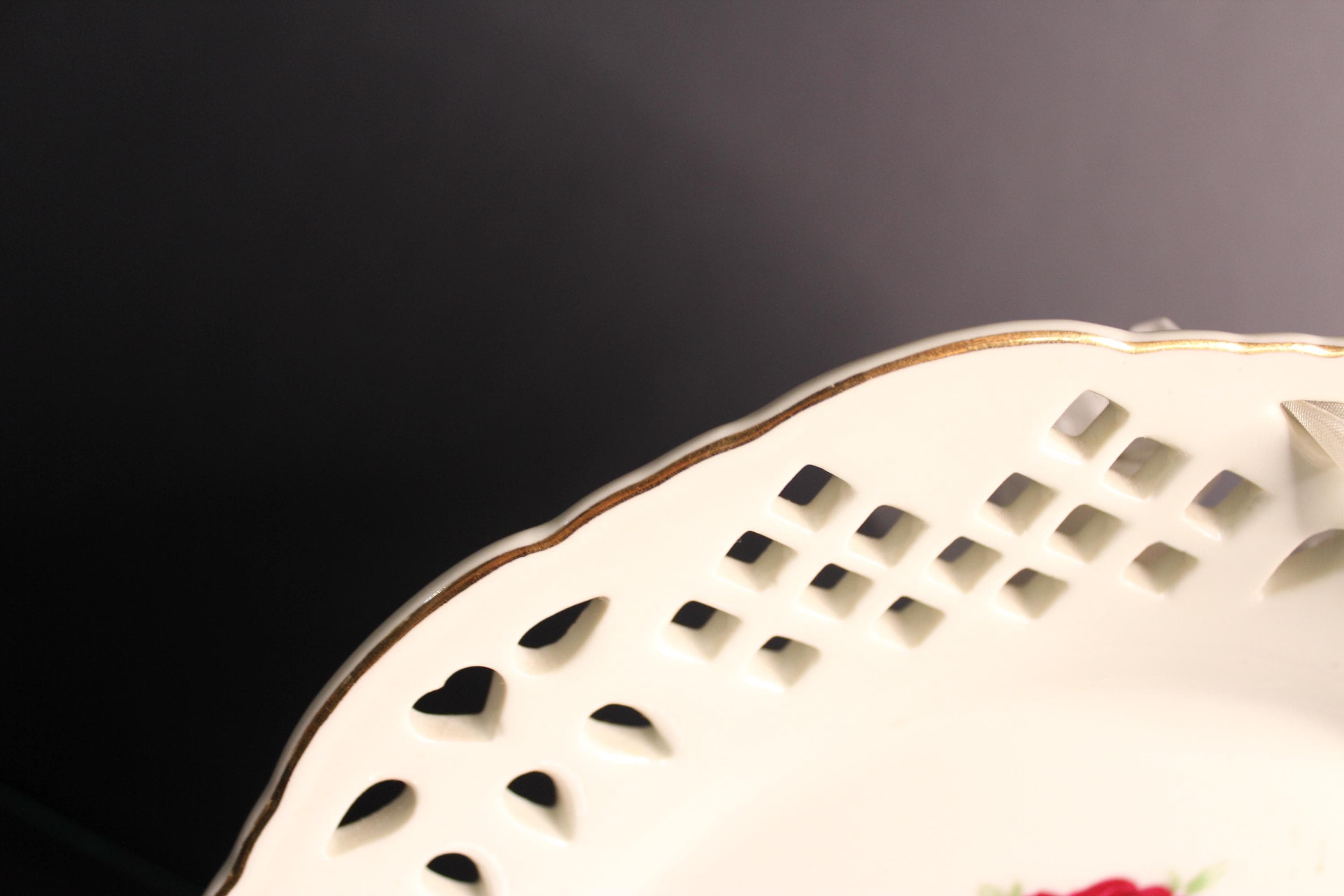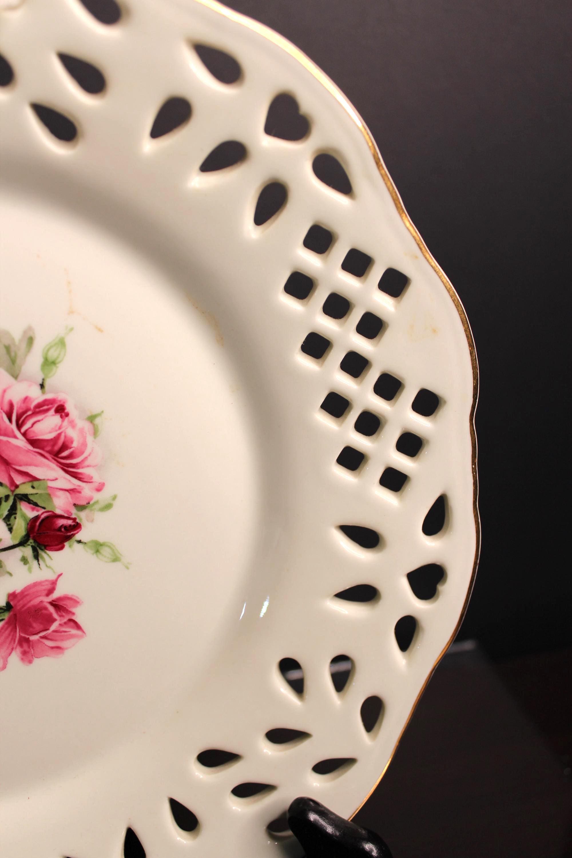 Vintage Decorative Plate, Red and Pink Roses by Baum Bros 10.5 Inch. Can be hung with a ribbon or a plate holder or is just as gorgeous on an easel or plate shelf. It has a scalloped edge with decorative cutouts around the border. It is edged in gold. The gorgeous deep red and vibrant pinks in the roses are complemented by the greenery in the background. This is in excellent condition, no chips, cracks, or crazing. Lovely in many types of decor.