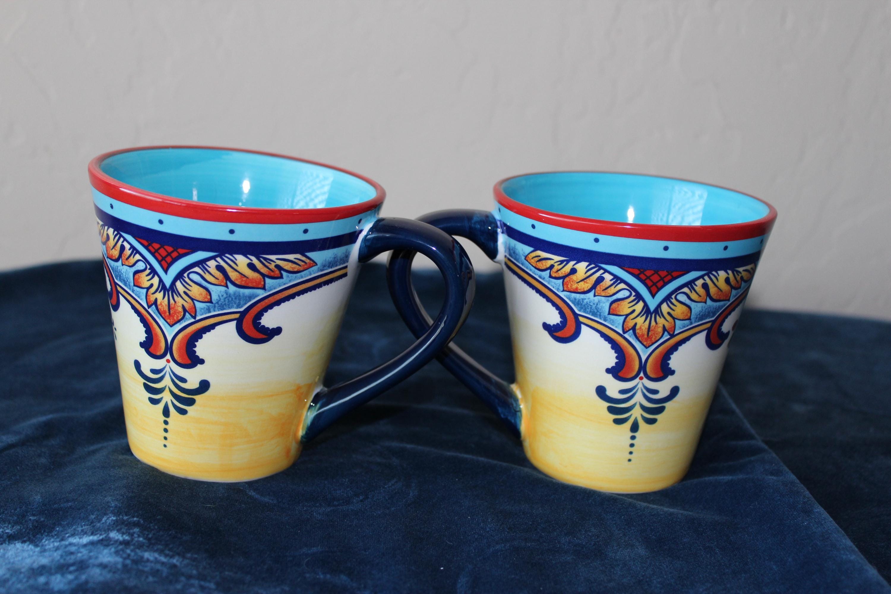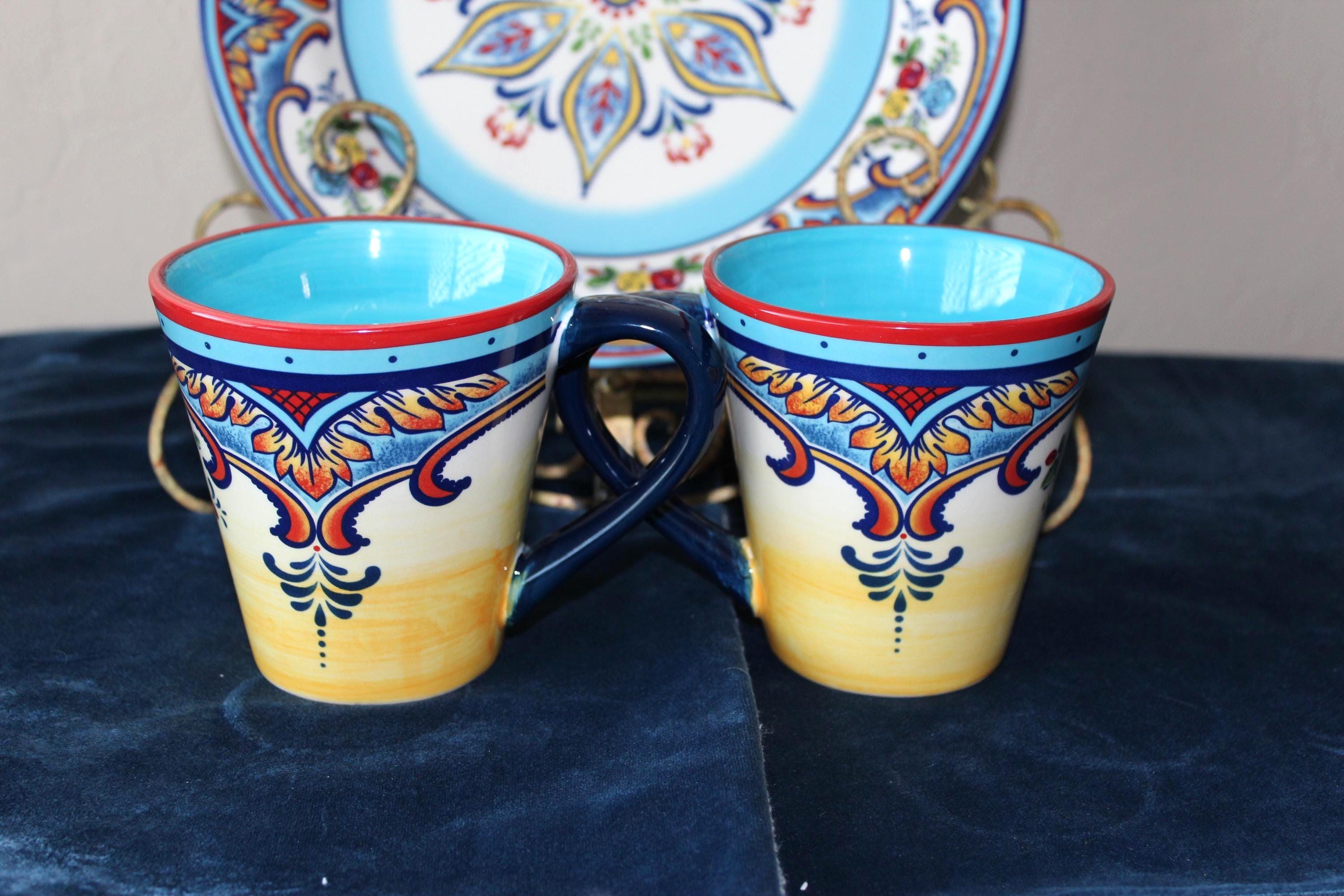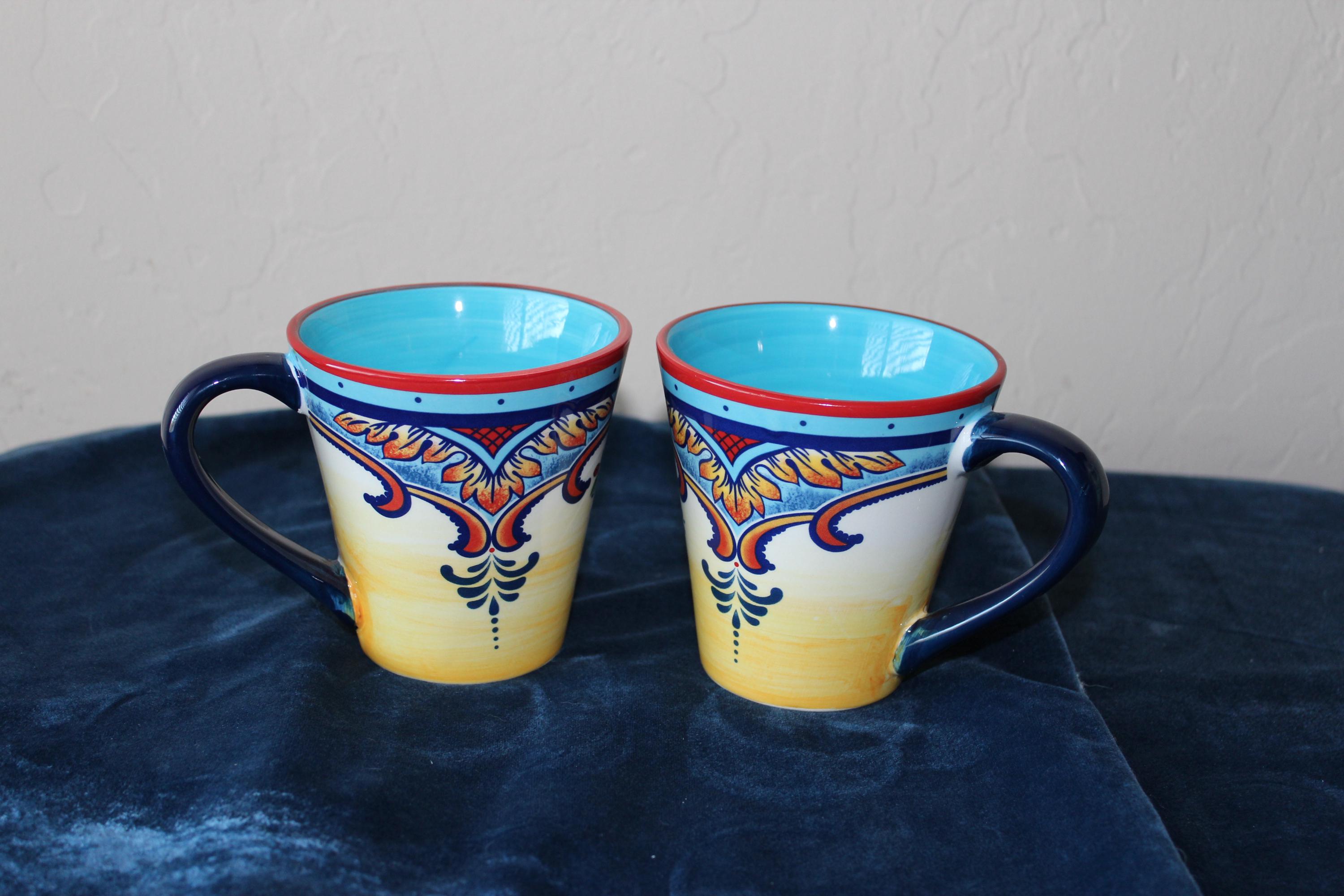 These roomy durable ceramic stoneware mugs are in the lovely Zanzibar pattern. It is a set of two mugs for your favorite beverages. They are in excellent pre-owned condition. No chips, cracks or crazing. The handles are spacious and are ergonomic. The colors are vibrant and lovely inside and out of the mugs. Fully functional and beautiful for display.