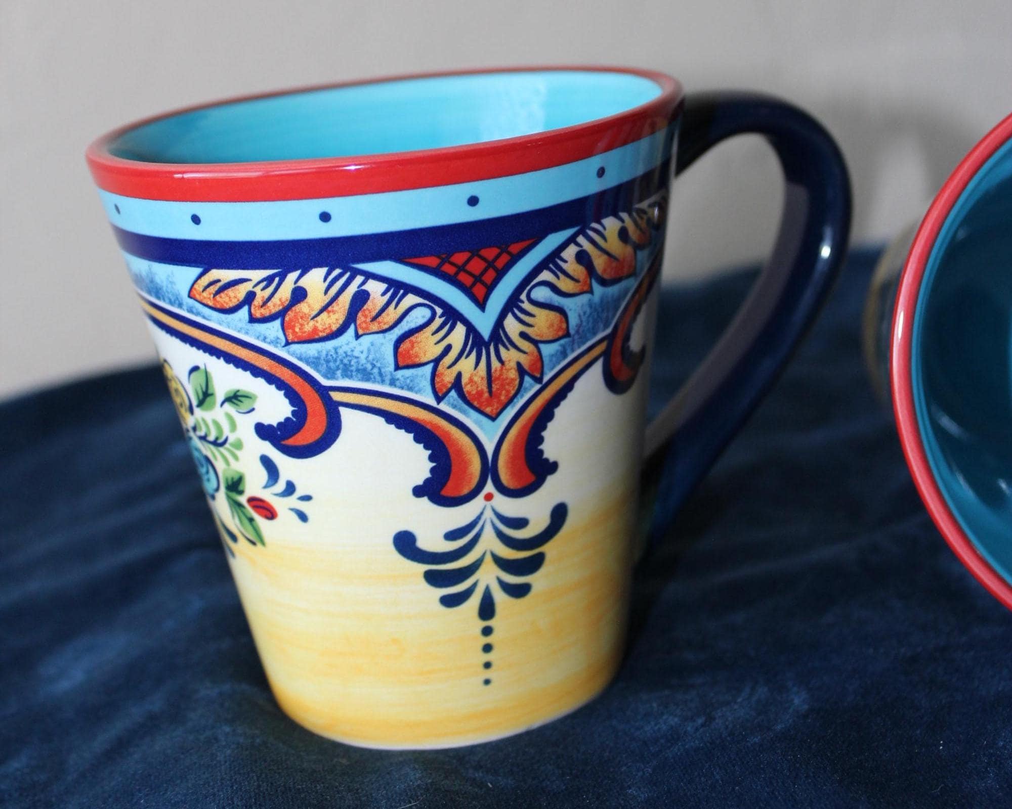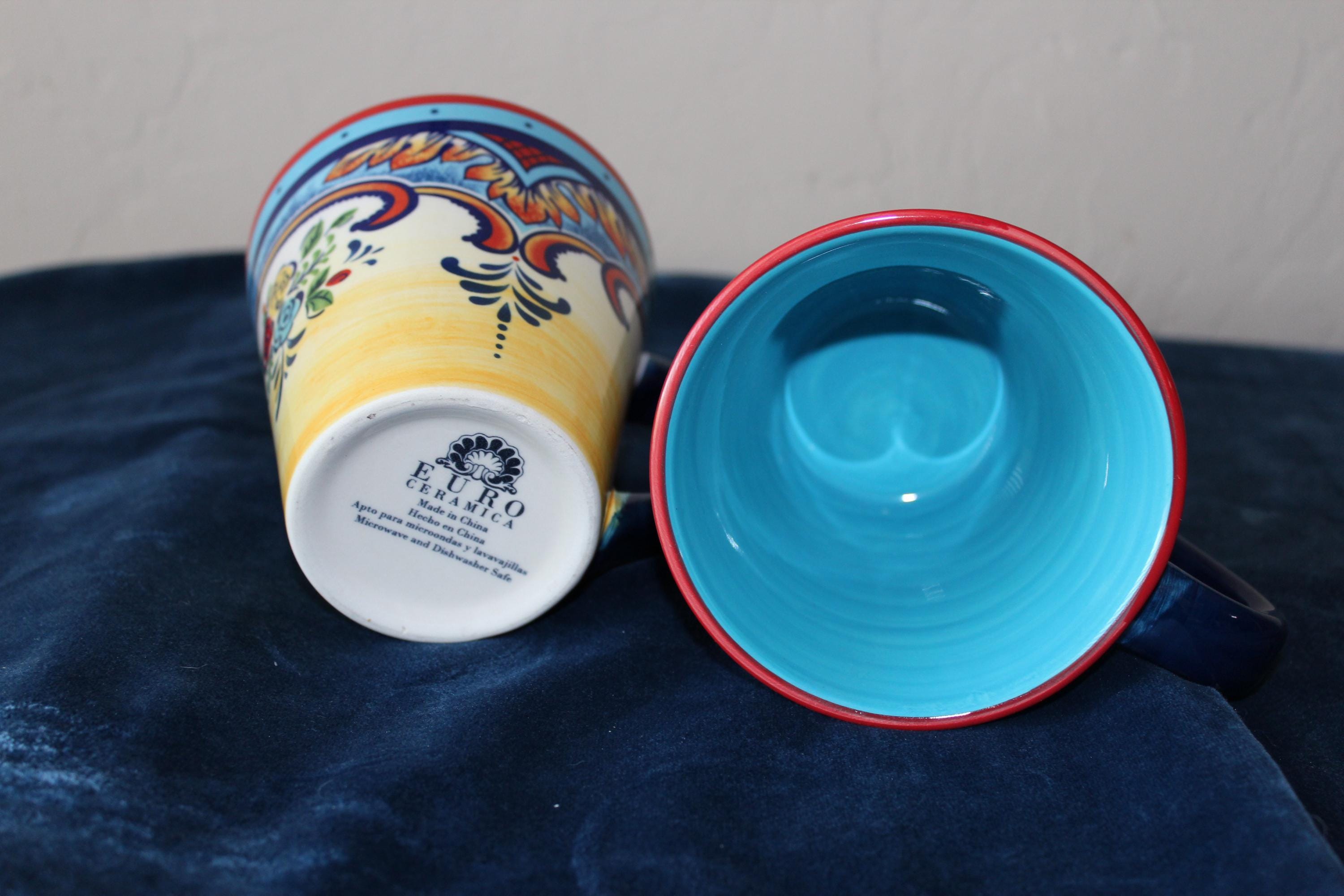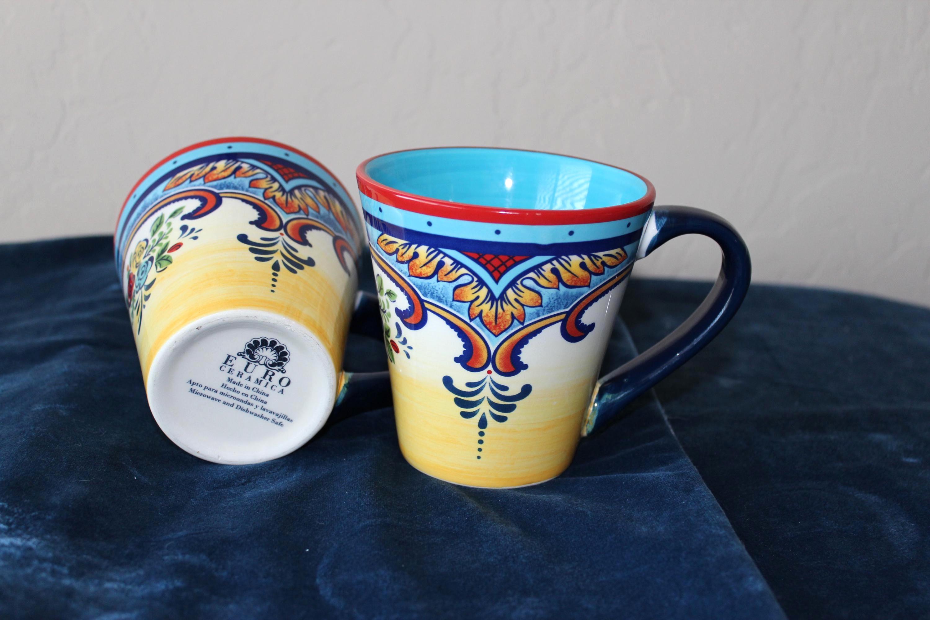 These roomy durable ceramic stoneware mugs are in the lovely Zanzibar pattern. It is a set of two mugs for your favorite beverages. They are in excellent pre-owned condition. No chips, cracks or crazing. The handles are spacious and are ergonomic. The colors are vibrant and lovely inside and out of the mugs. Fully functional and beautiful for display.
