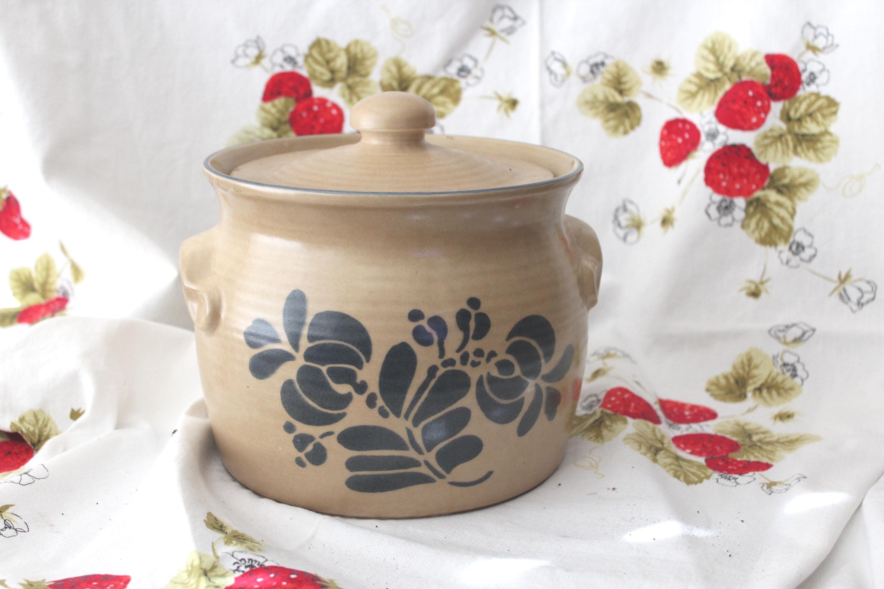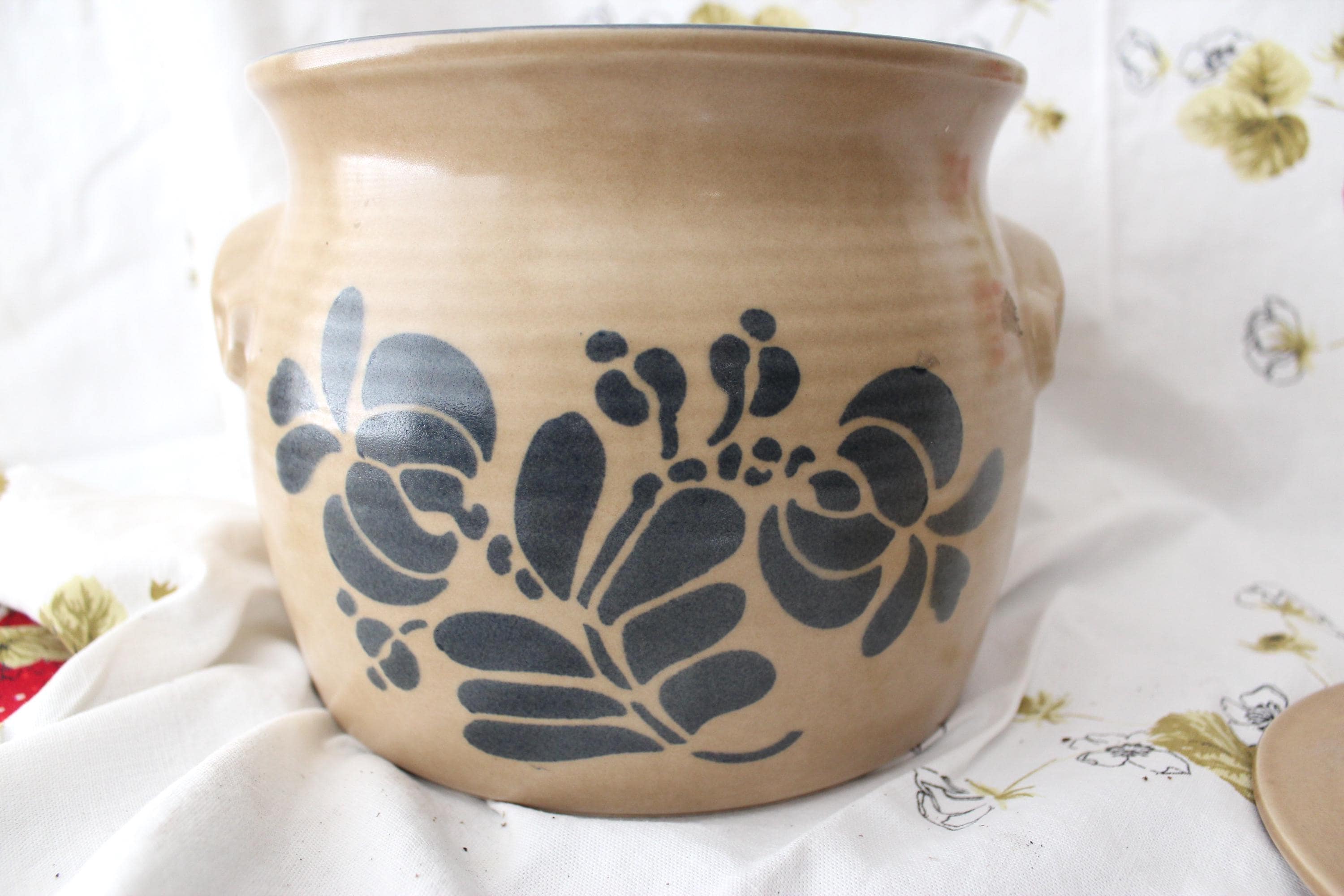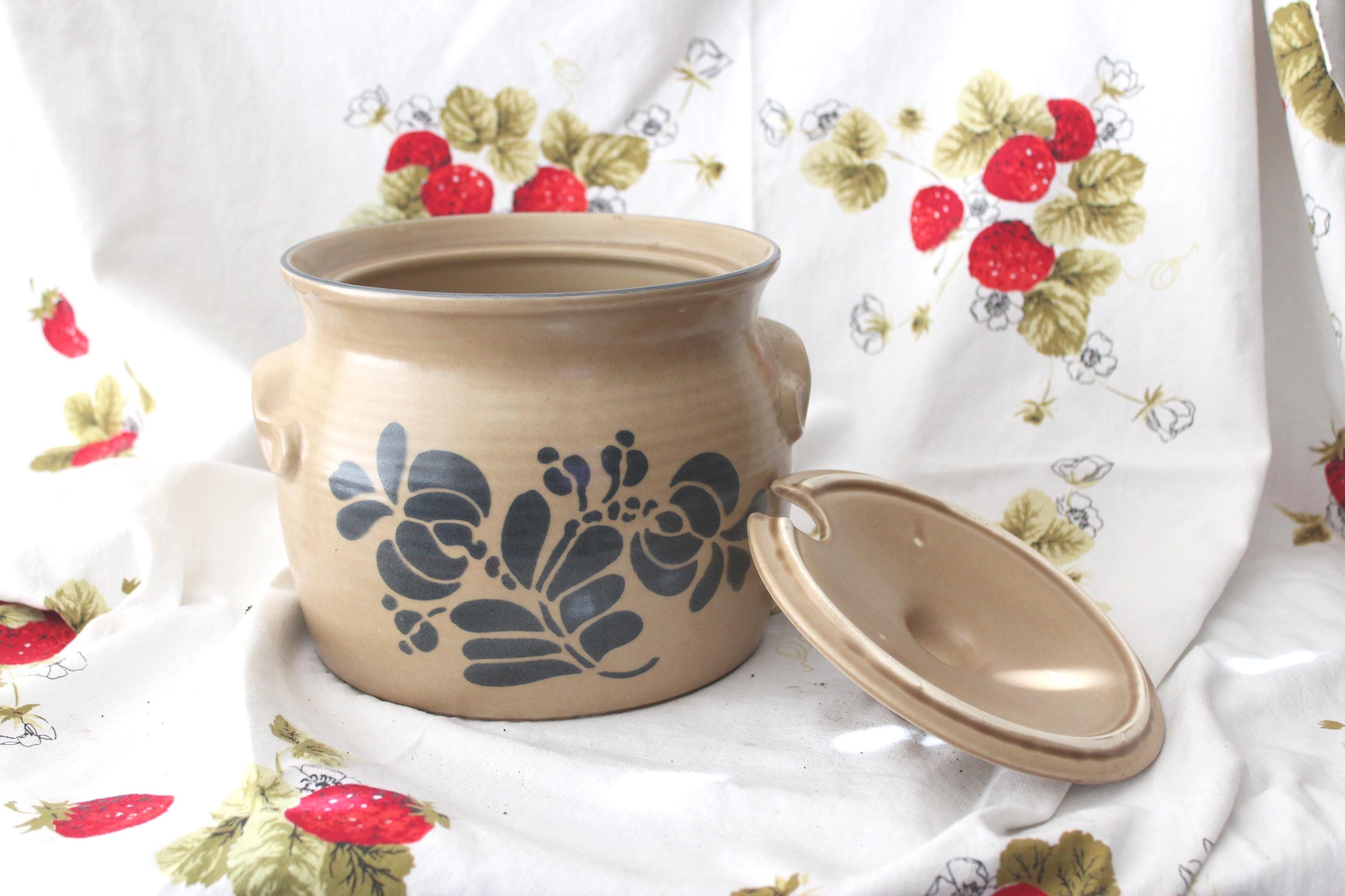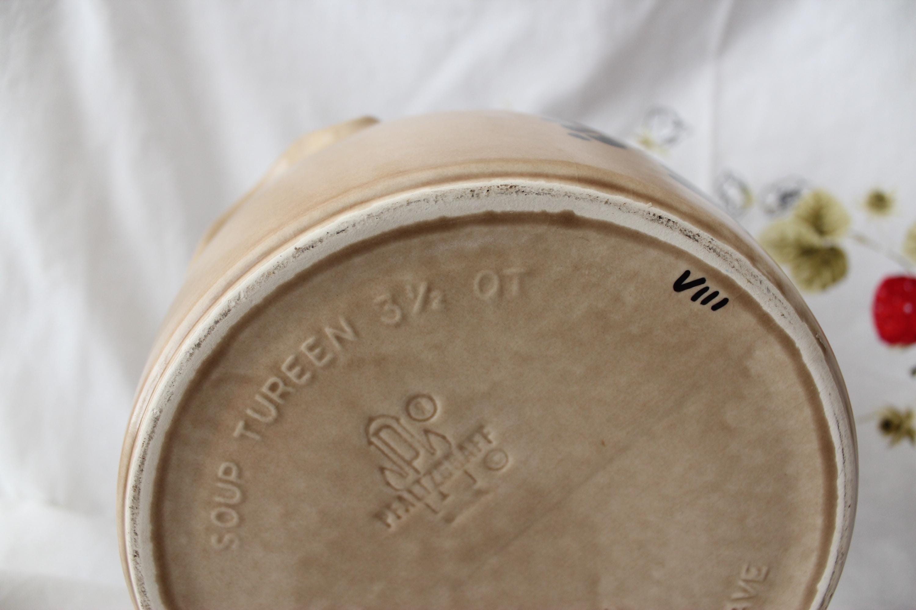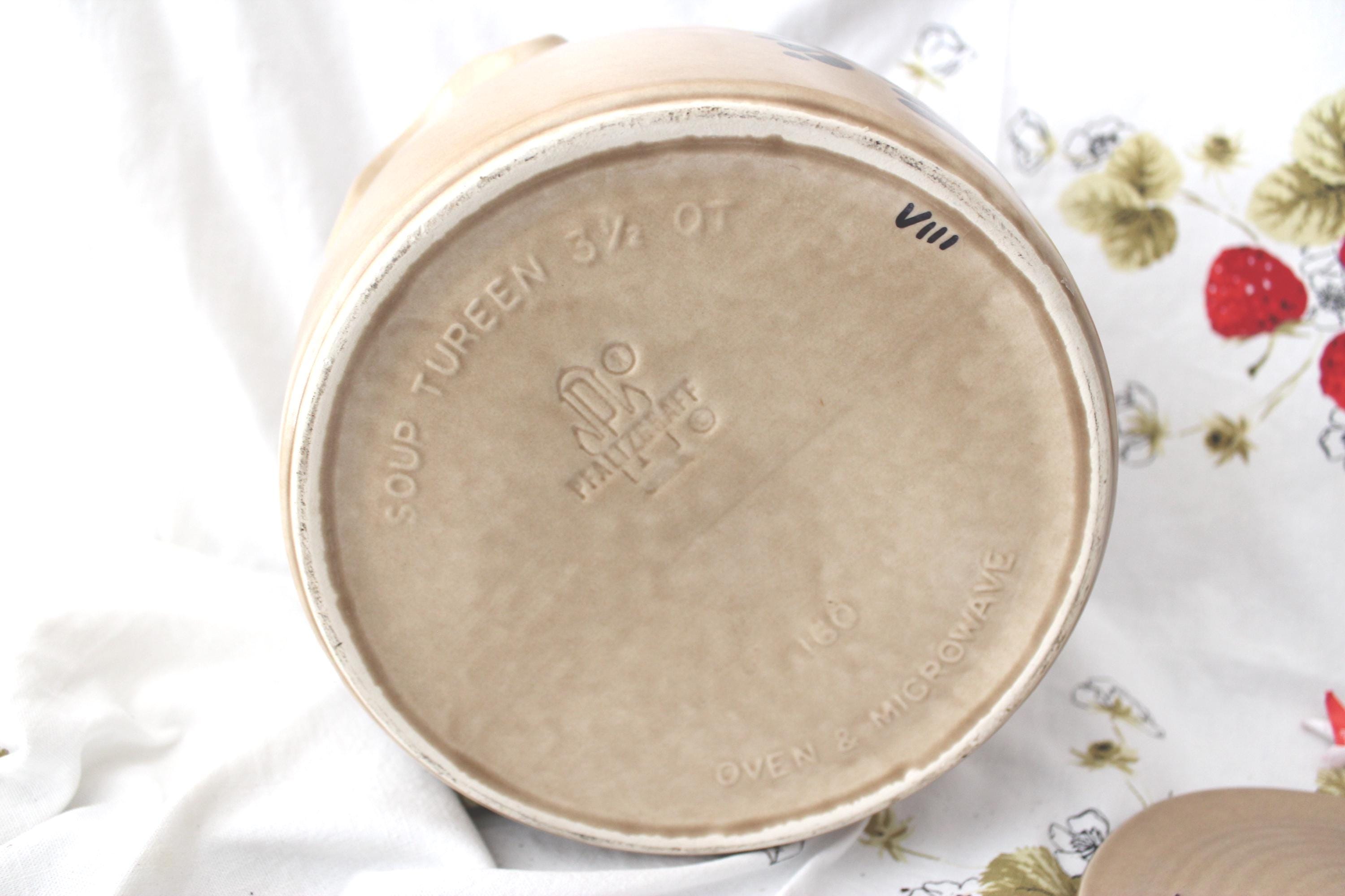 Iconic vintage Folk Art soup tureen pottery by Pfalzgraff. It is a spacious 3.5 qt capacity. It has double molded handles. It measures 7.5 inches tall and 8.5 inches wide. It is lovely as a decorative piece, but is also fully functional as intended. The ever popular tan and cobalt blue pattern is beautiful in most decor. It is vintage with no cracks or chips but does exhibit crazing as expected for age.