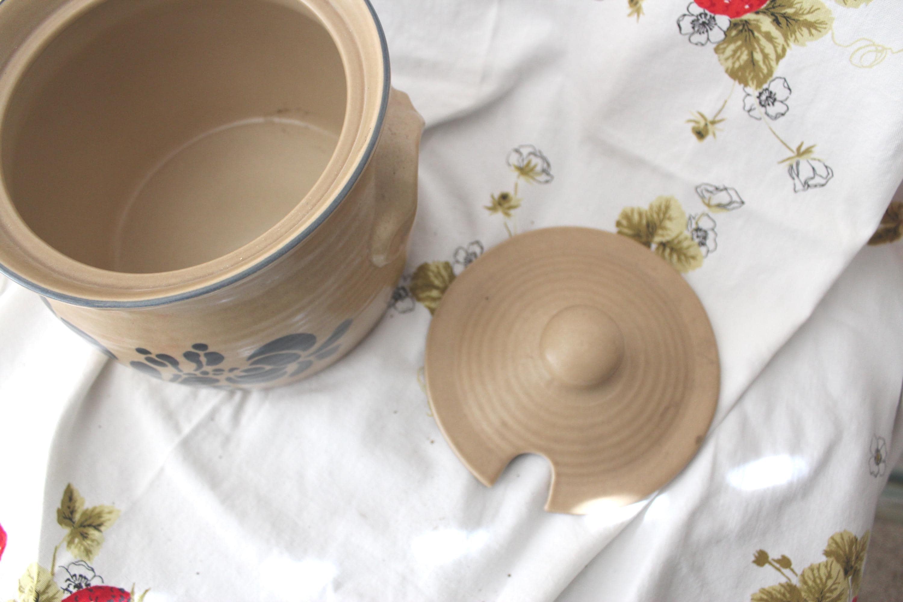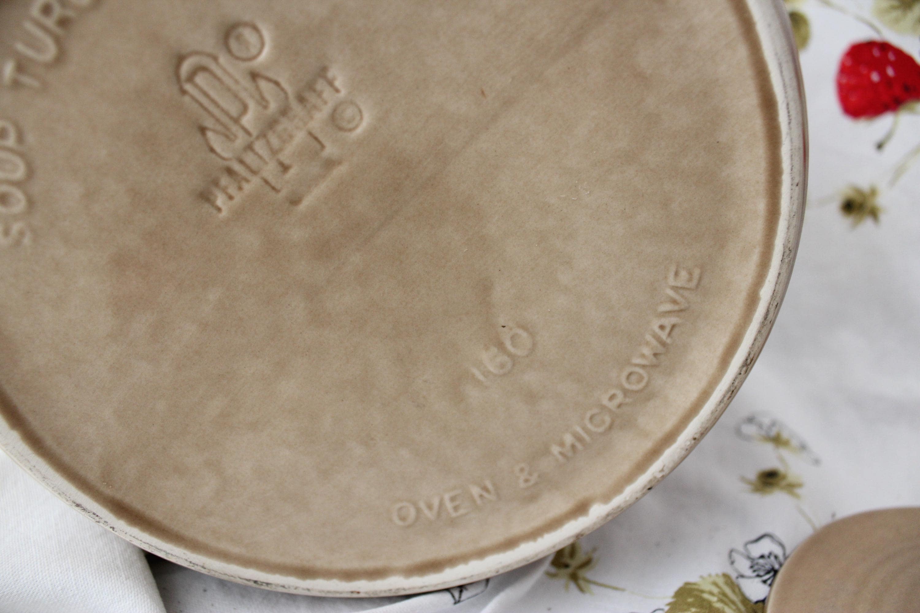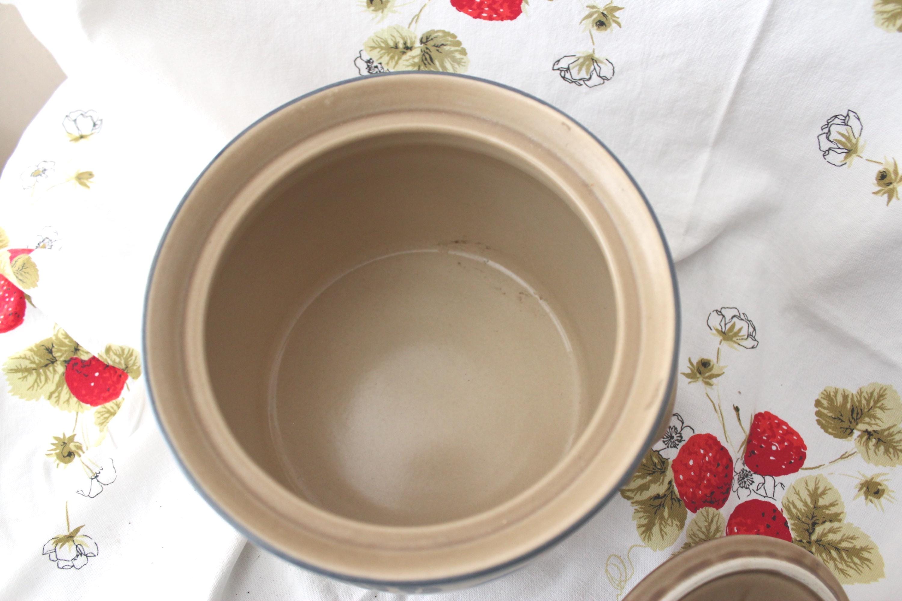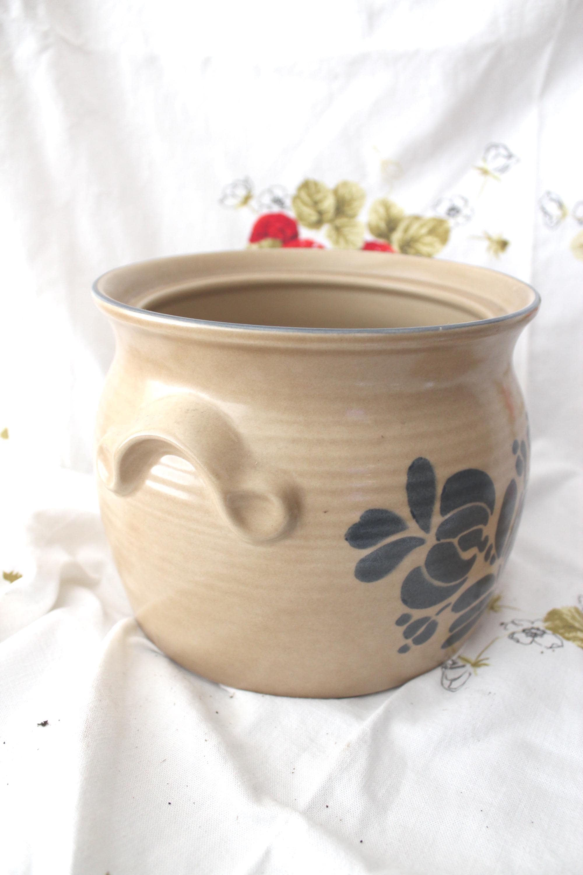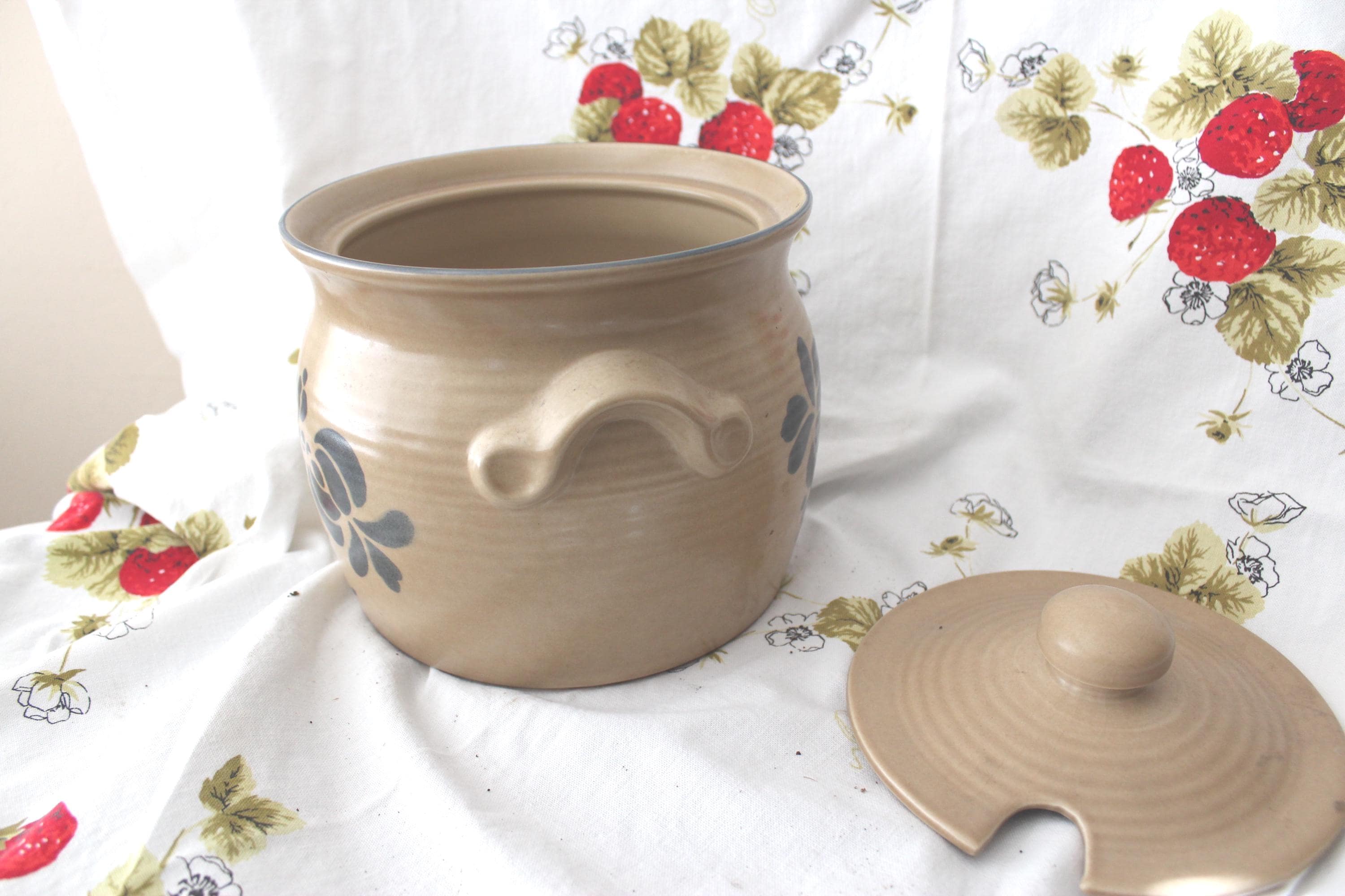 Iconic vintage Folk Art soup tureen pottery by Pfalzgraff. It is a spacious 3.5 qt capacity. It has double molded handles. It measures 7.5 inches tall and 8.5 inches wide. It is lovely as a decorative piece, but is also fully functional as intended. The ever popular tan and cobalt blue pattern is beautiful in most decor. It is vintage with no cracks or chips but does exhibit crazing as expected for age.