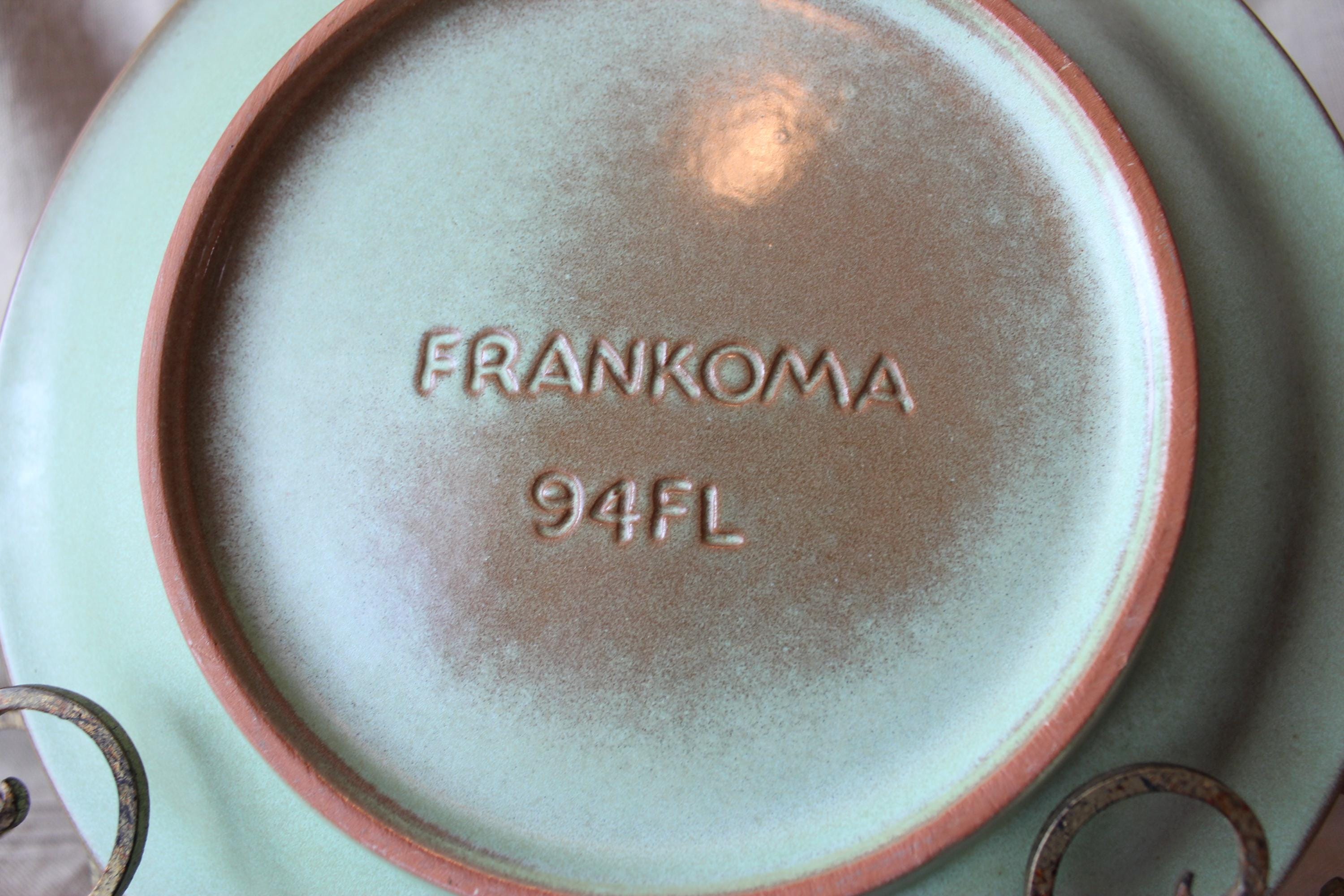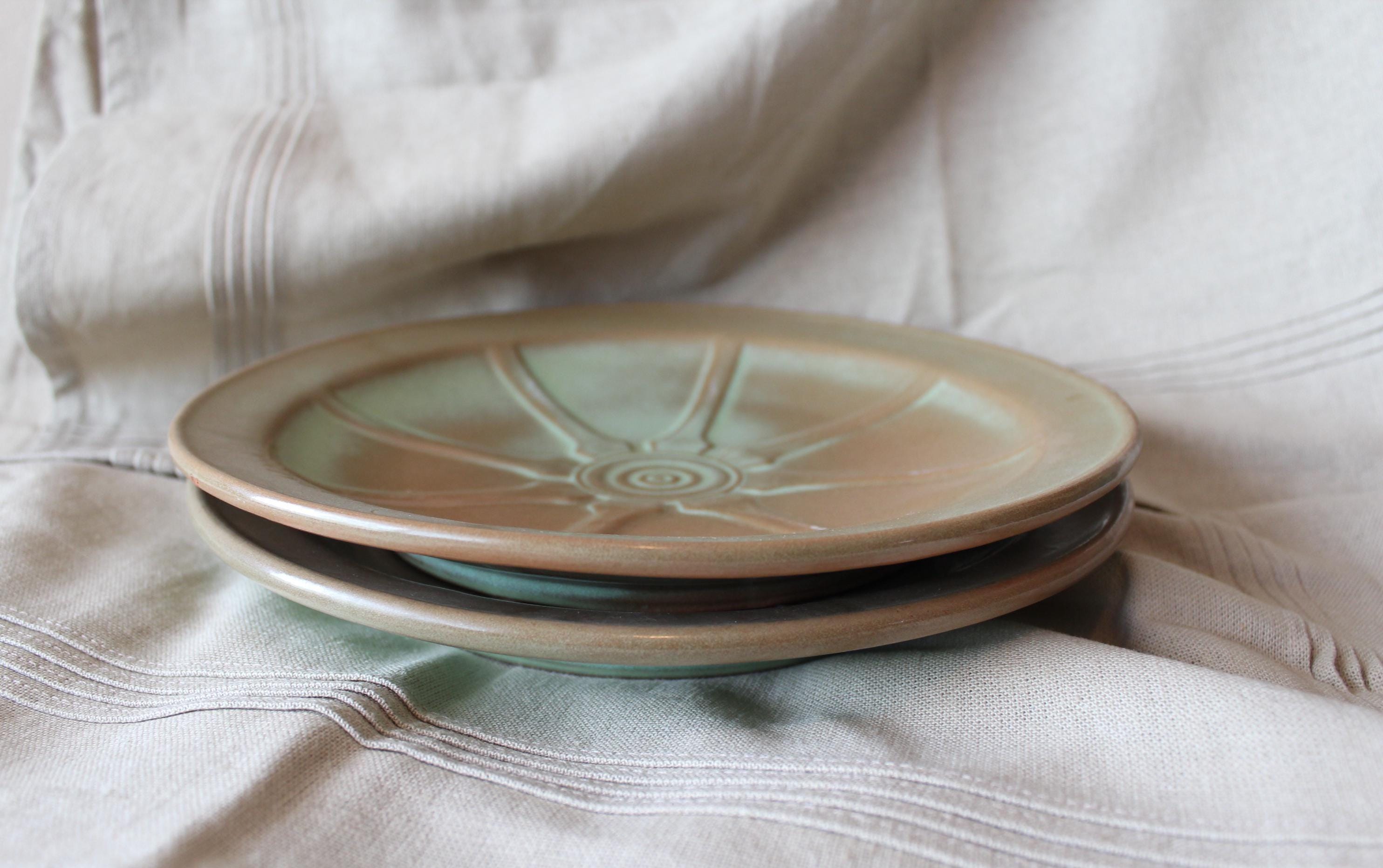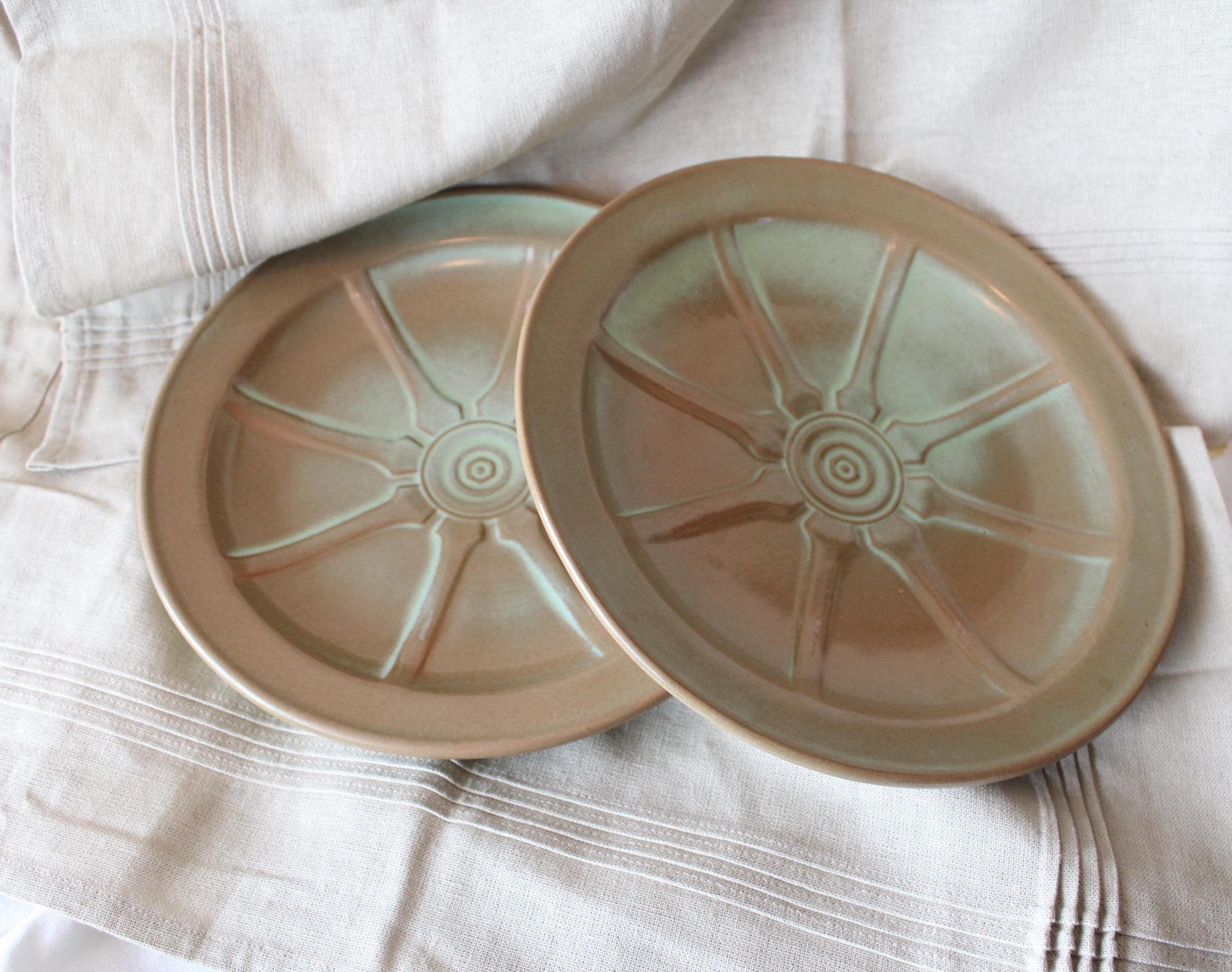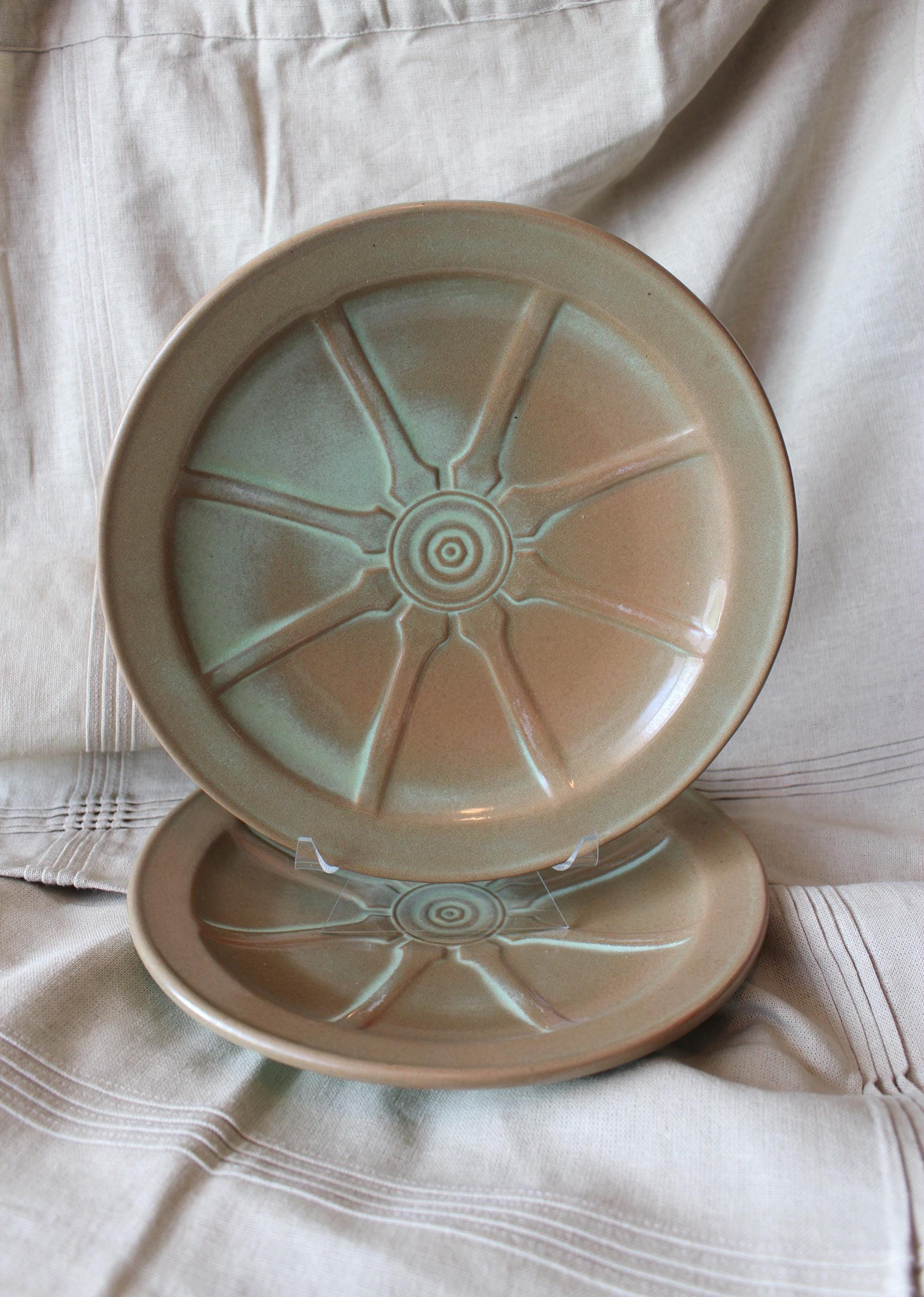 Pristine condition, set of two Wagon Wheel pattern 94FL Frankoma dinner plates, 10.5 inch. These are done in the iconic Prairie Green glaze, which varies on each piece with sage green and light brown patterns. Very earthy colors and the pottery is distinctly shaped with the raised wagon wheel sun burst pattern. Frankoma pottery is made with the Sapulpa, Oklahoma Red Clay. The Frankoma 94FL stamp is embossed on the back of each plate.