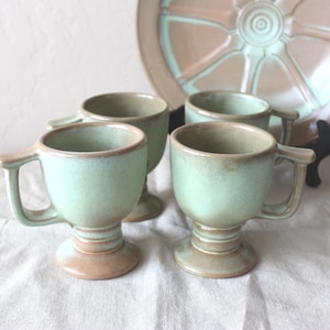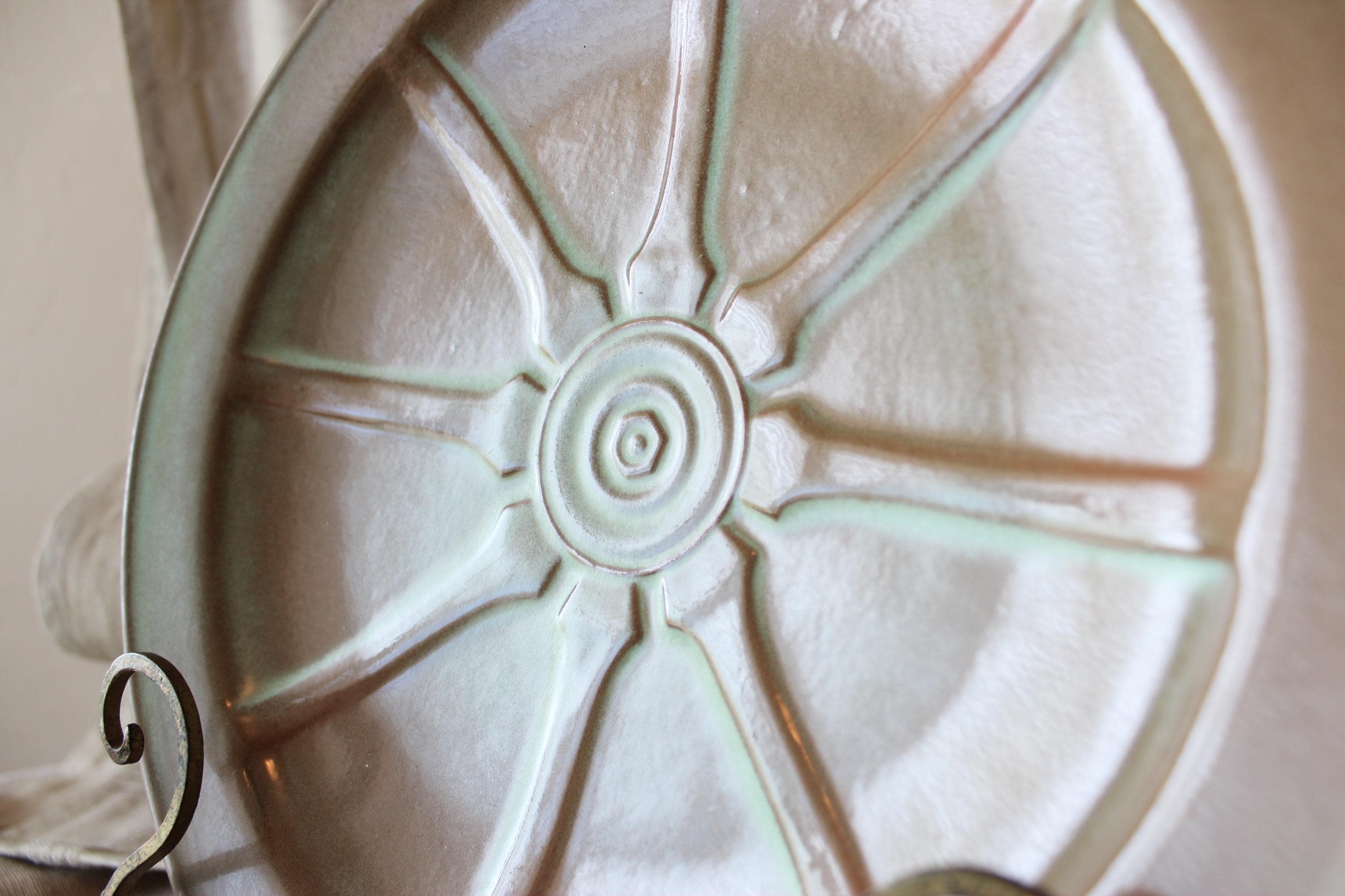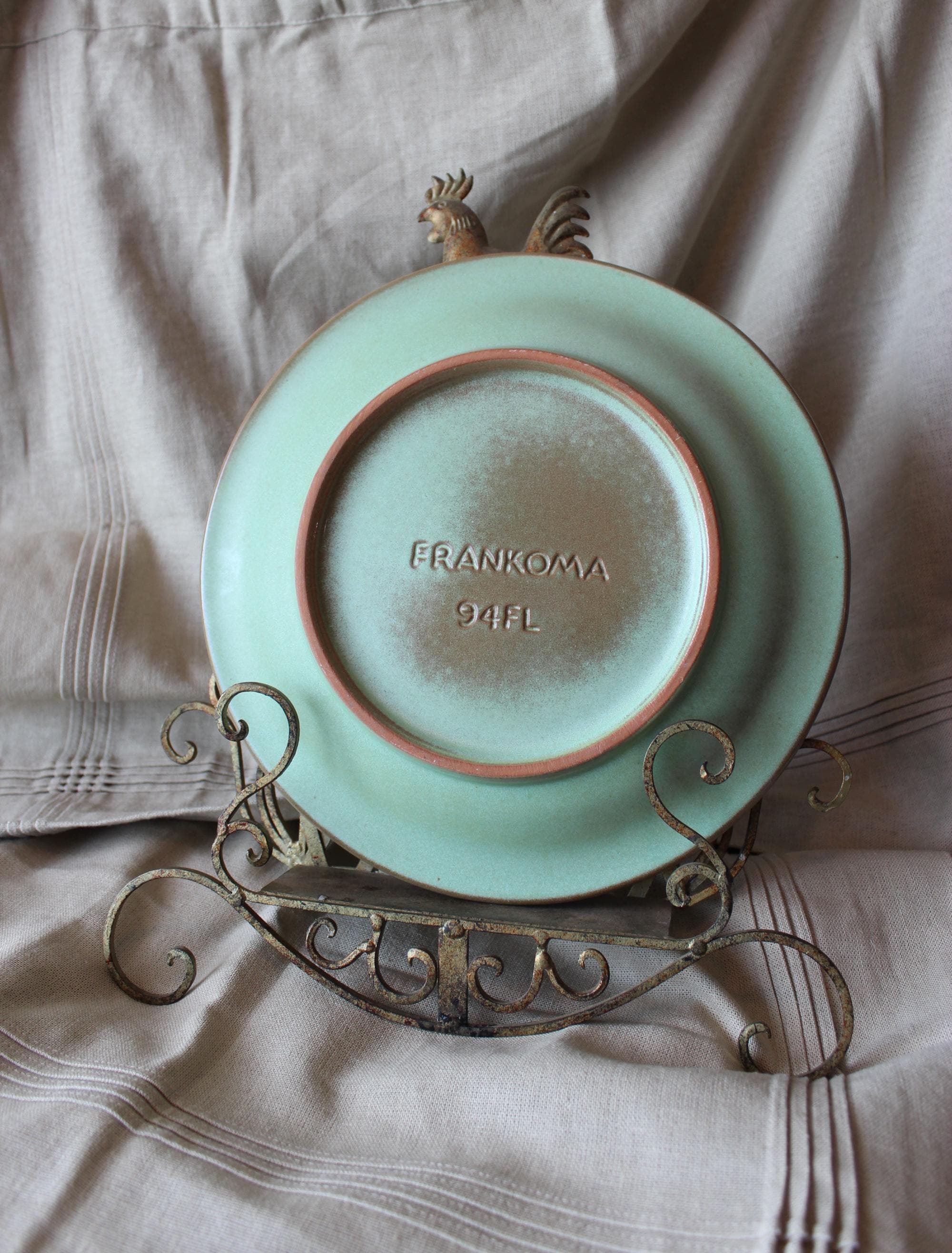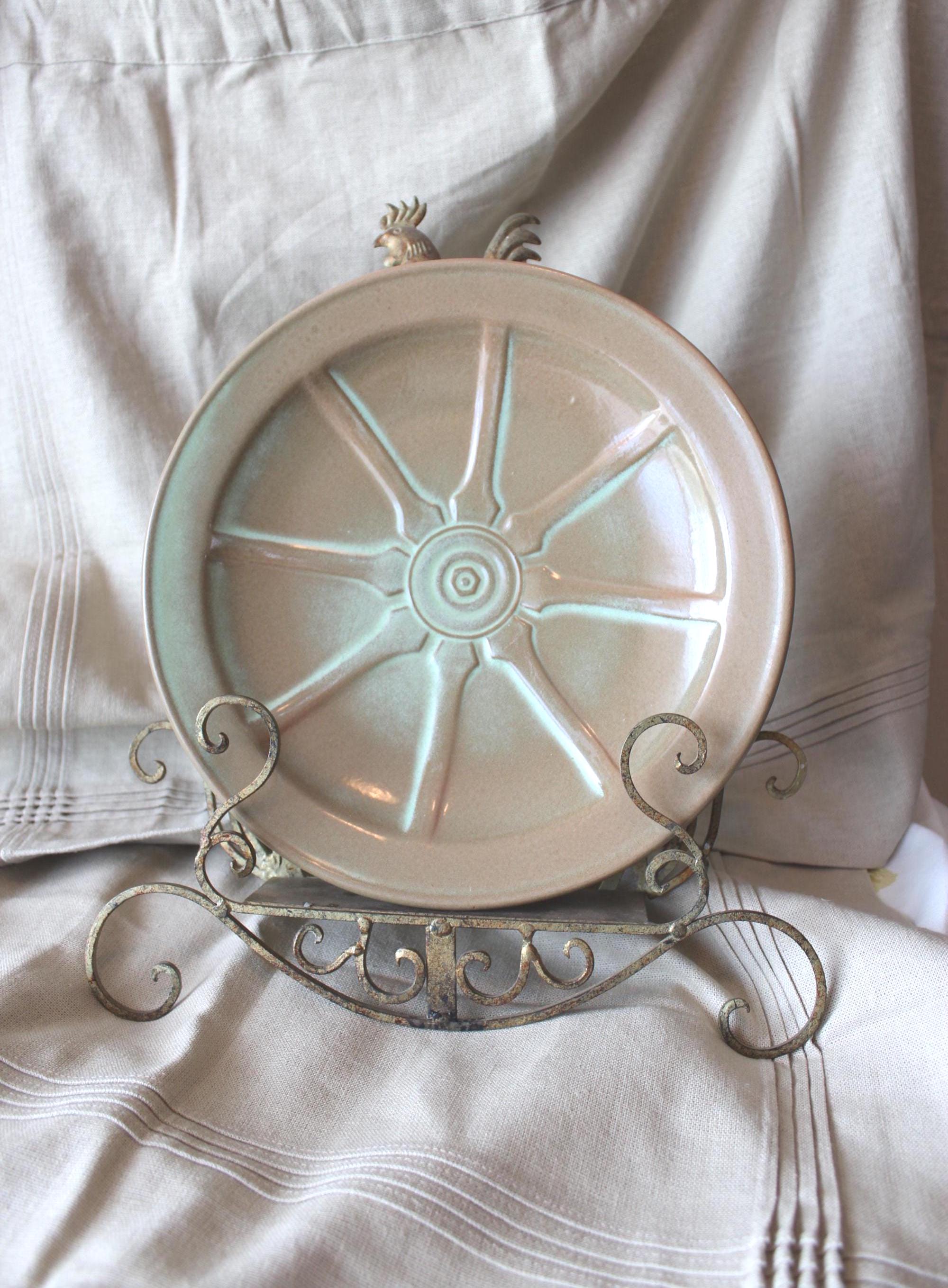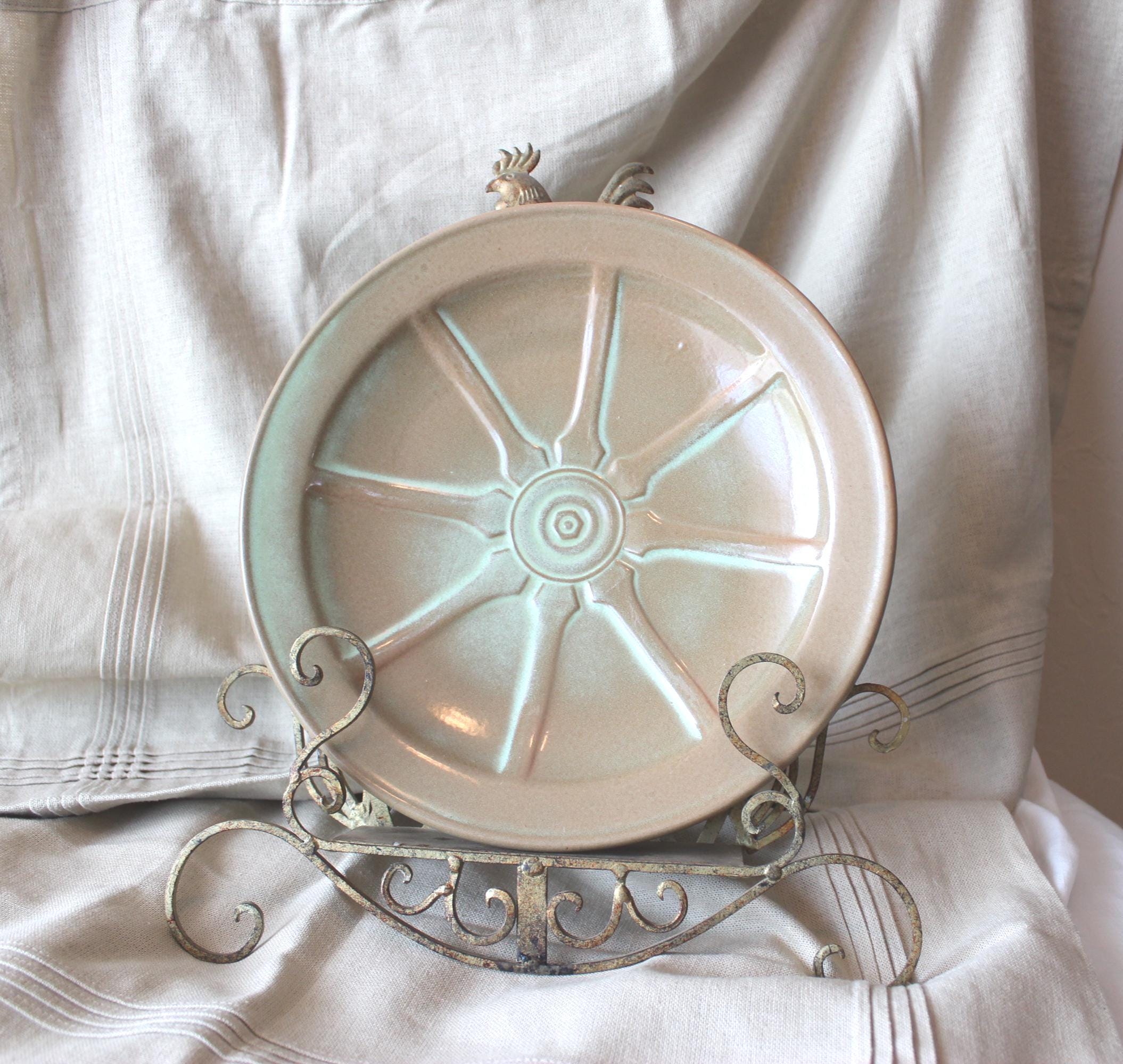Pristine condition, set of two Wagon Wheel pattern 94FL Frankoma dinner plates, 10.5 inch. These are done in the iconic Prairie Green glaze, which varies on each piece with sage green and light brown patterns. Very earthy colors and the pottery is distinctly shaped with the raised wagon wheel sun burst pattern. Frankoma pottery is made with the Sapulpa, Oklahoma Red Clay. The Frankoma 94FL stamp is embossed on the back of each plate.