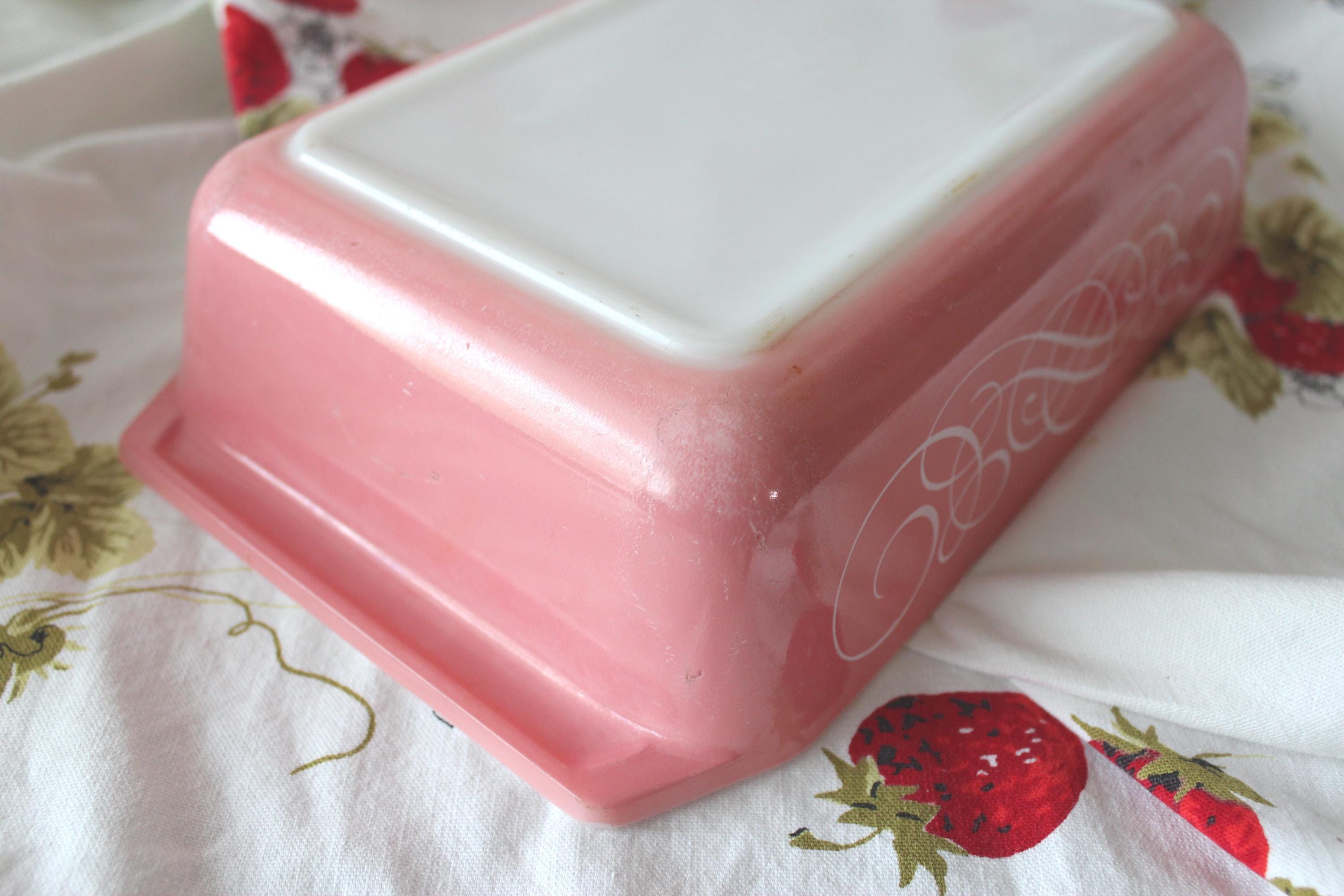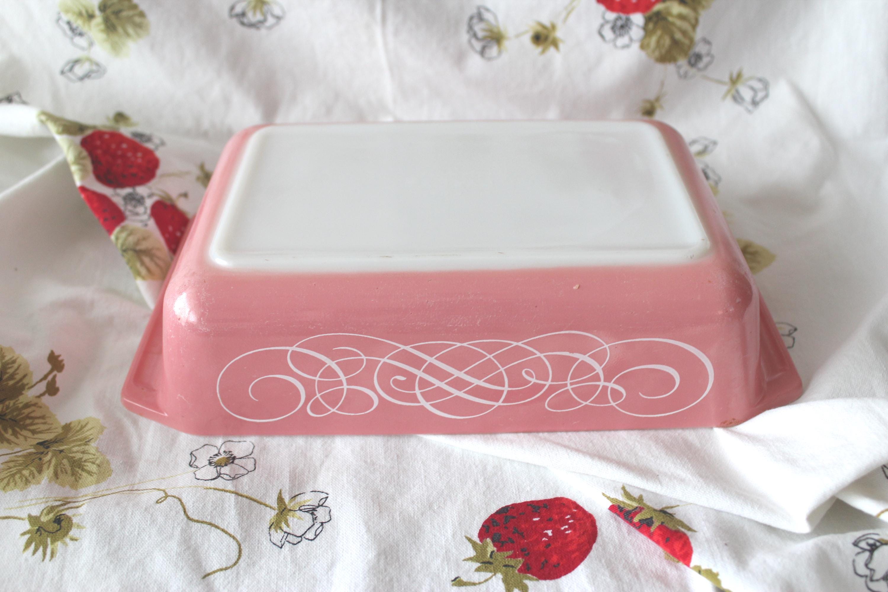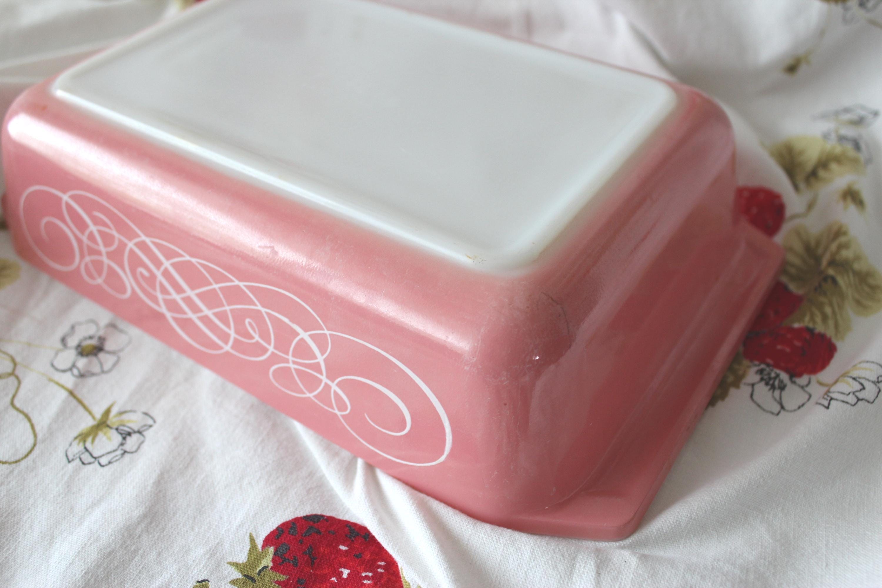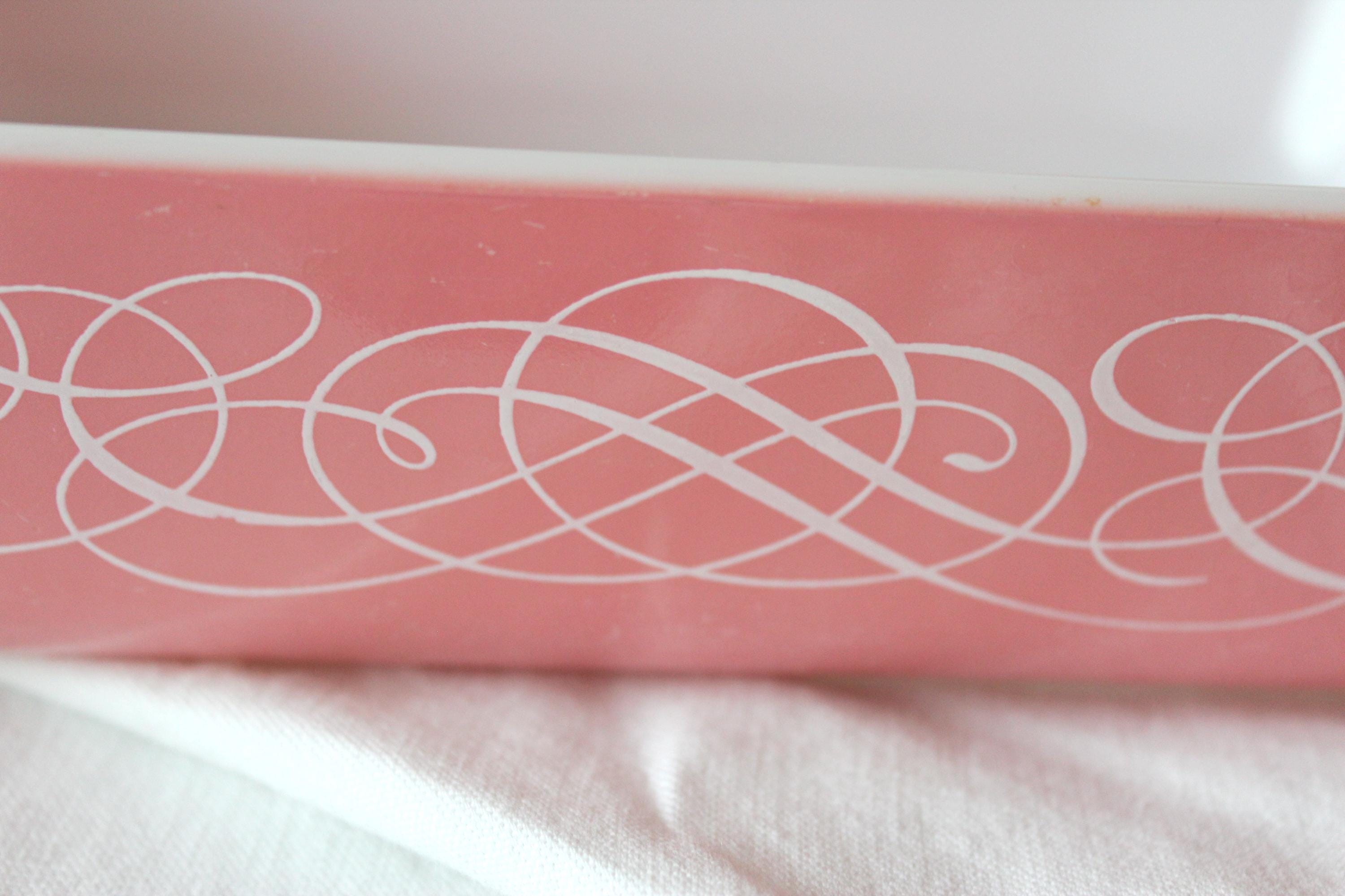 Beautiful vintage used condition, rare Pink Scroll 1950's PYREX dish. There are no cracks or chips. Has some signs of normal wear on bottom and sides of casserole, and one small scratch on one end as in the photo. The delightful pink color is vibrant, shiny, and beautiful. It measures 11 x 6.75 x 2.5. Be sure to review all photos and message with any questions, please.