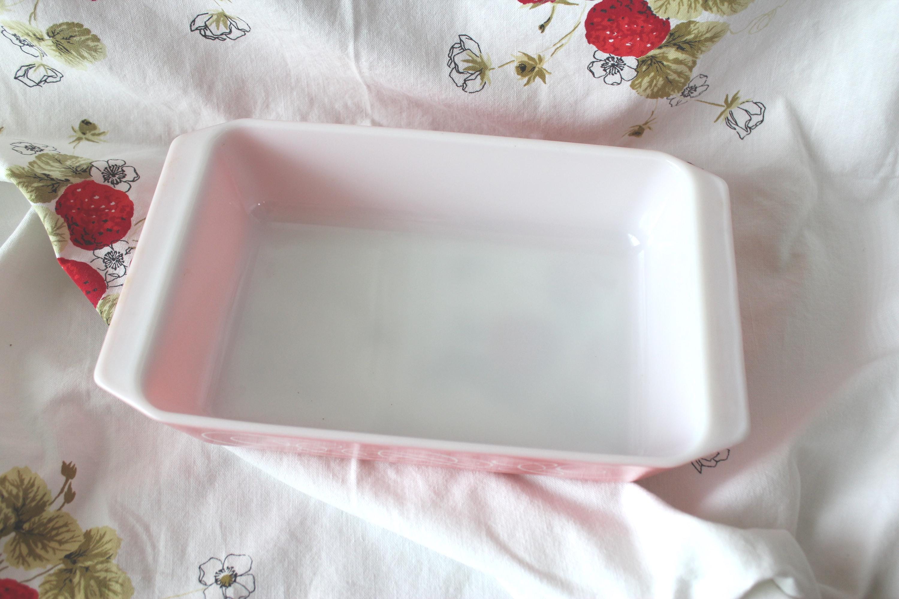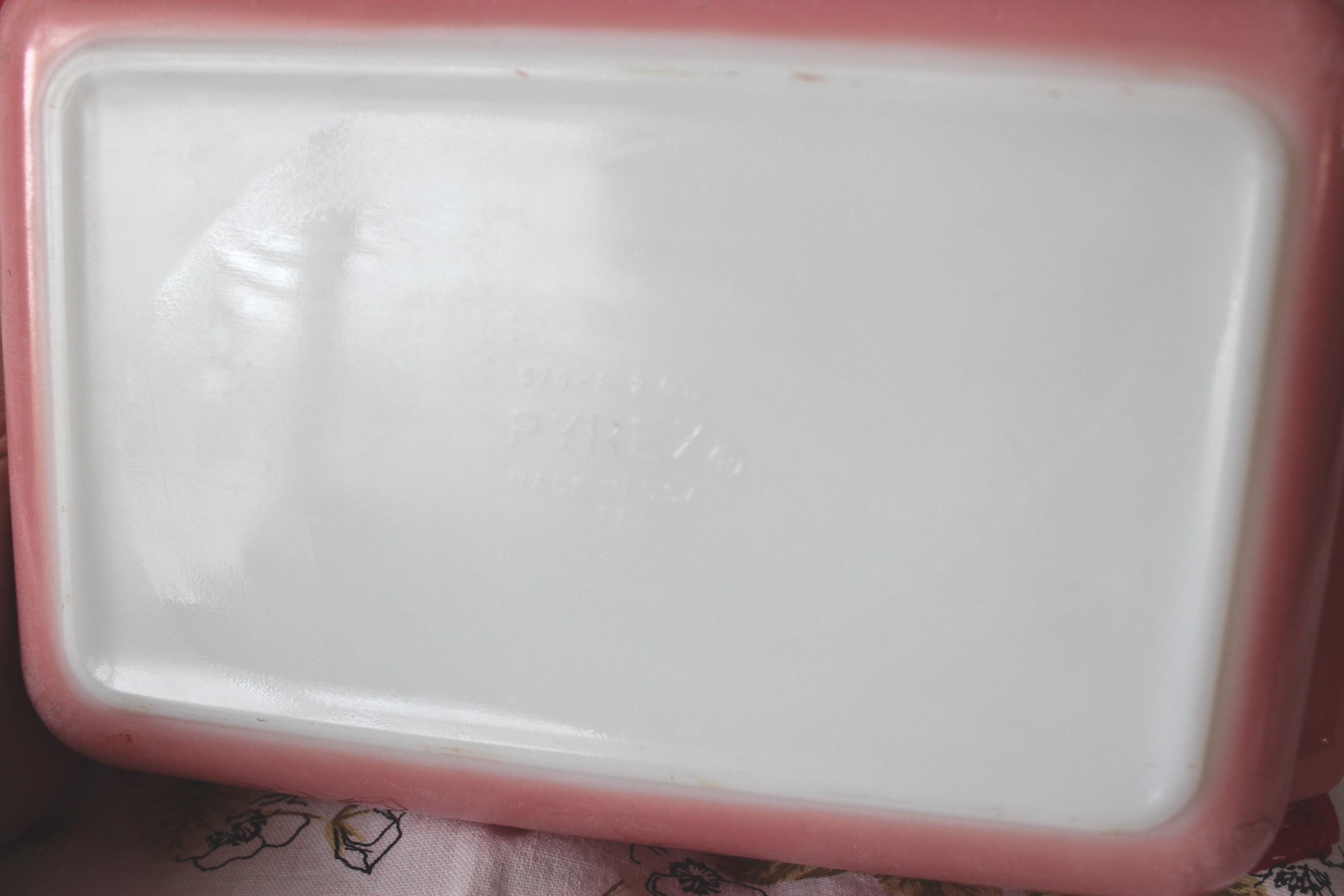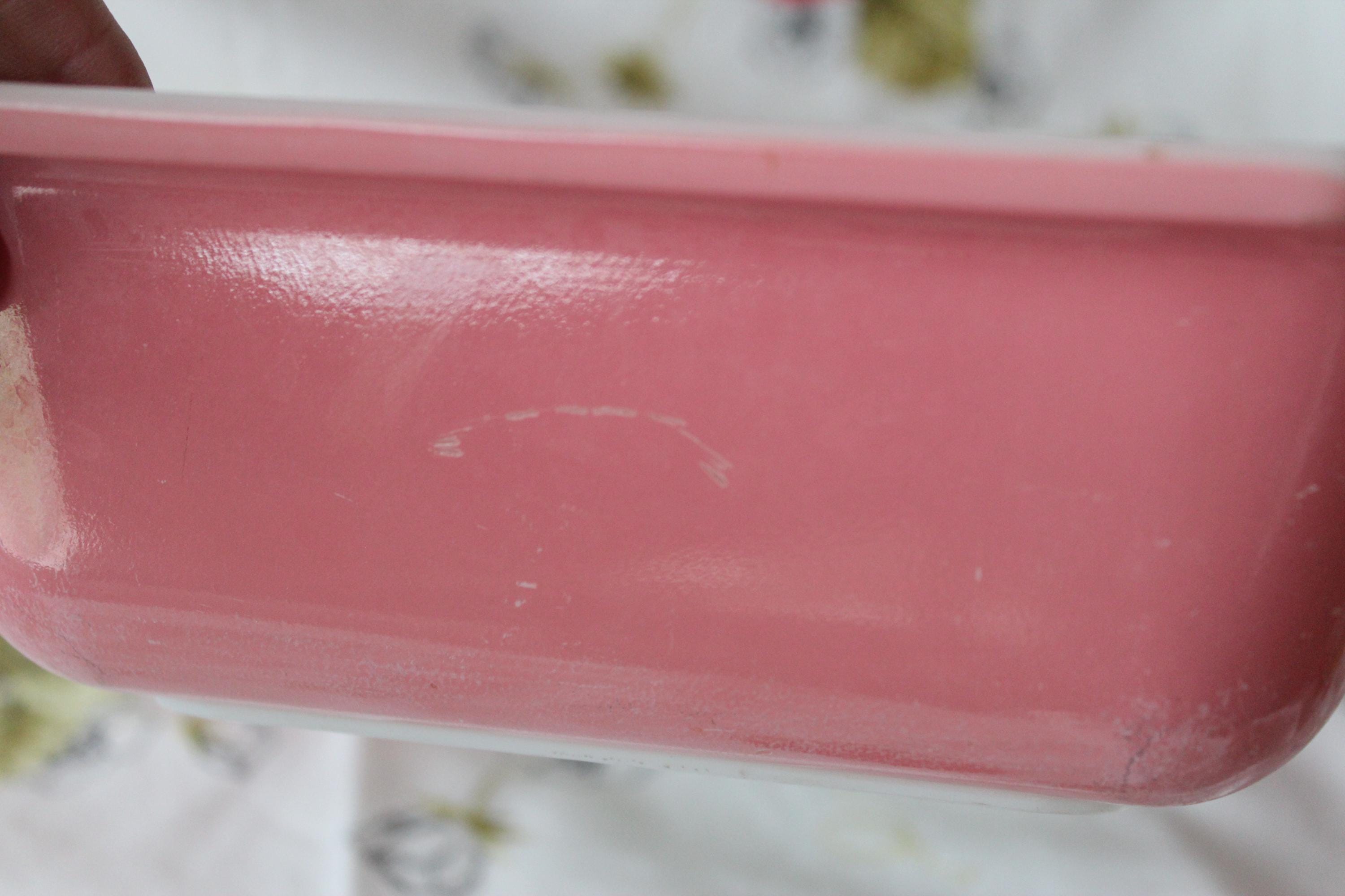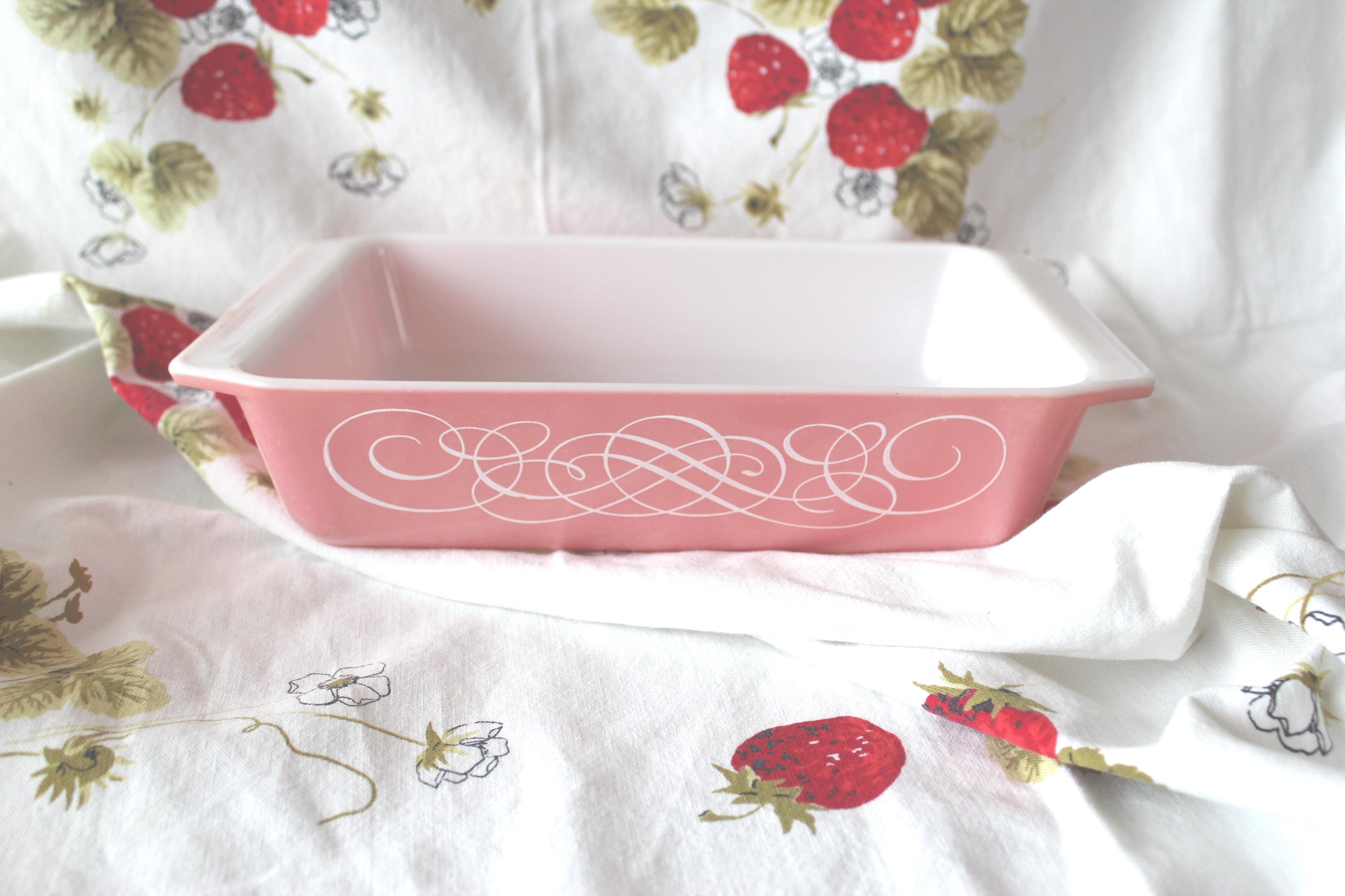 Beautiful vintage used condition, rare Pink Scroll 1950's PYREX dish. There are no cracks or chips. Has some signs of normal wear on bottom and sides of casserole, and one small scratch on one end as in the photo. The delightful pink color is vibrant, shiny, and beautiful. It measures 11 x 6.75 x 2.5. Be sure to review all photos and message with any questions, please.