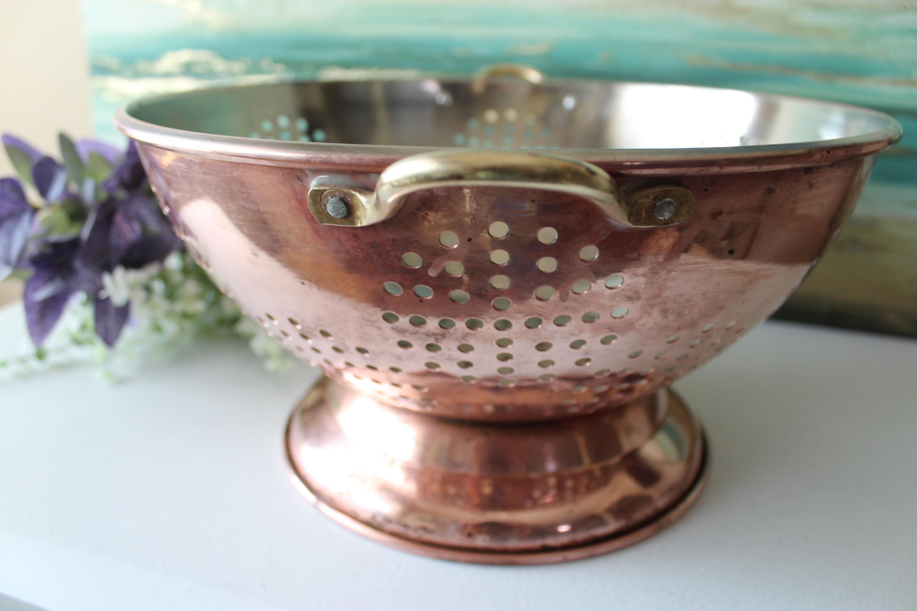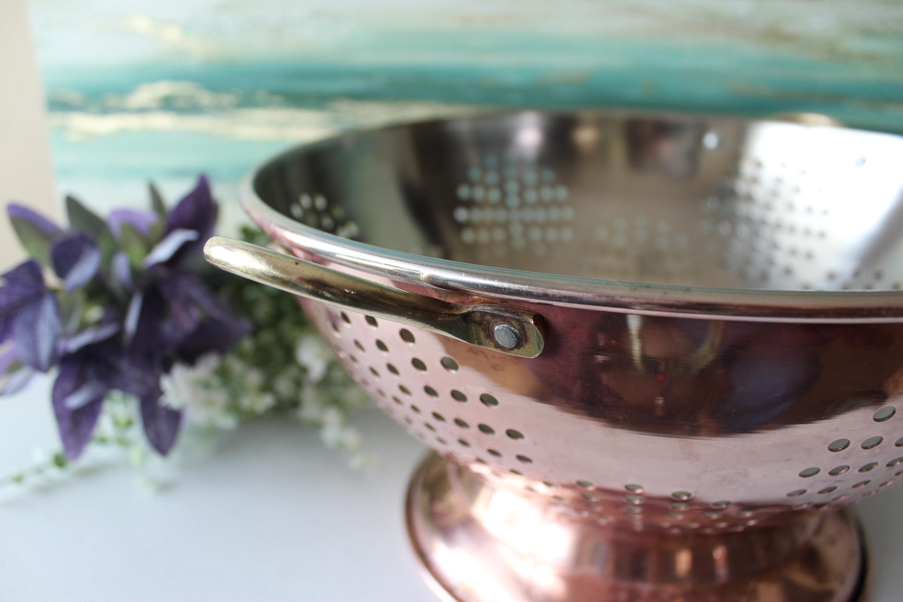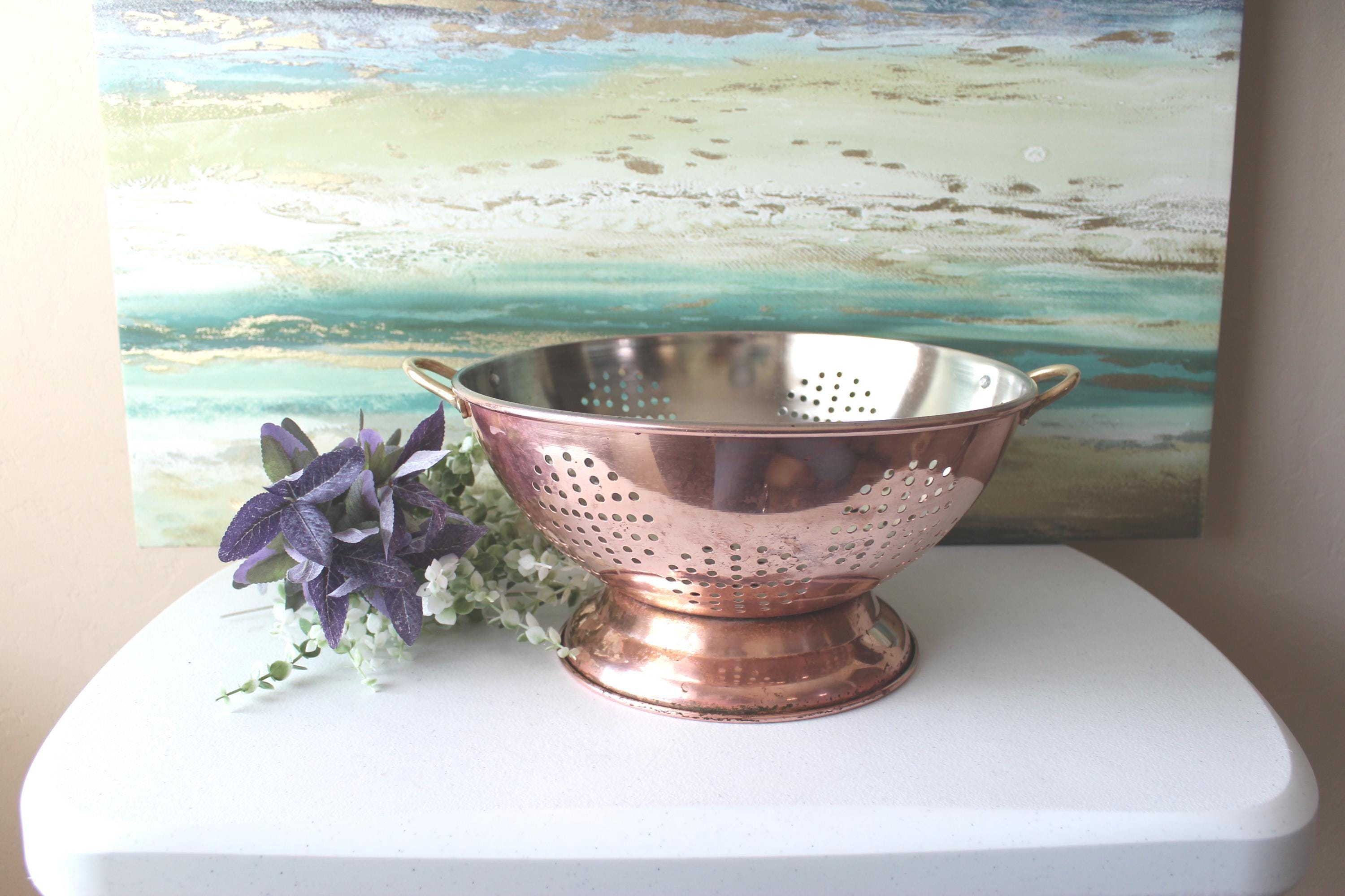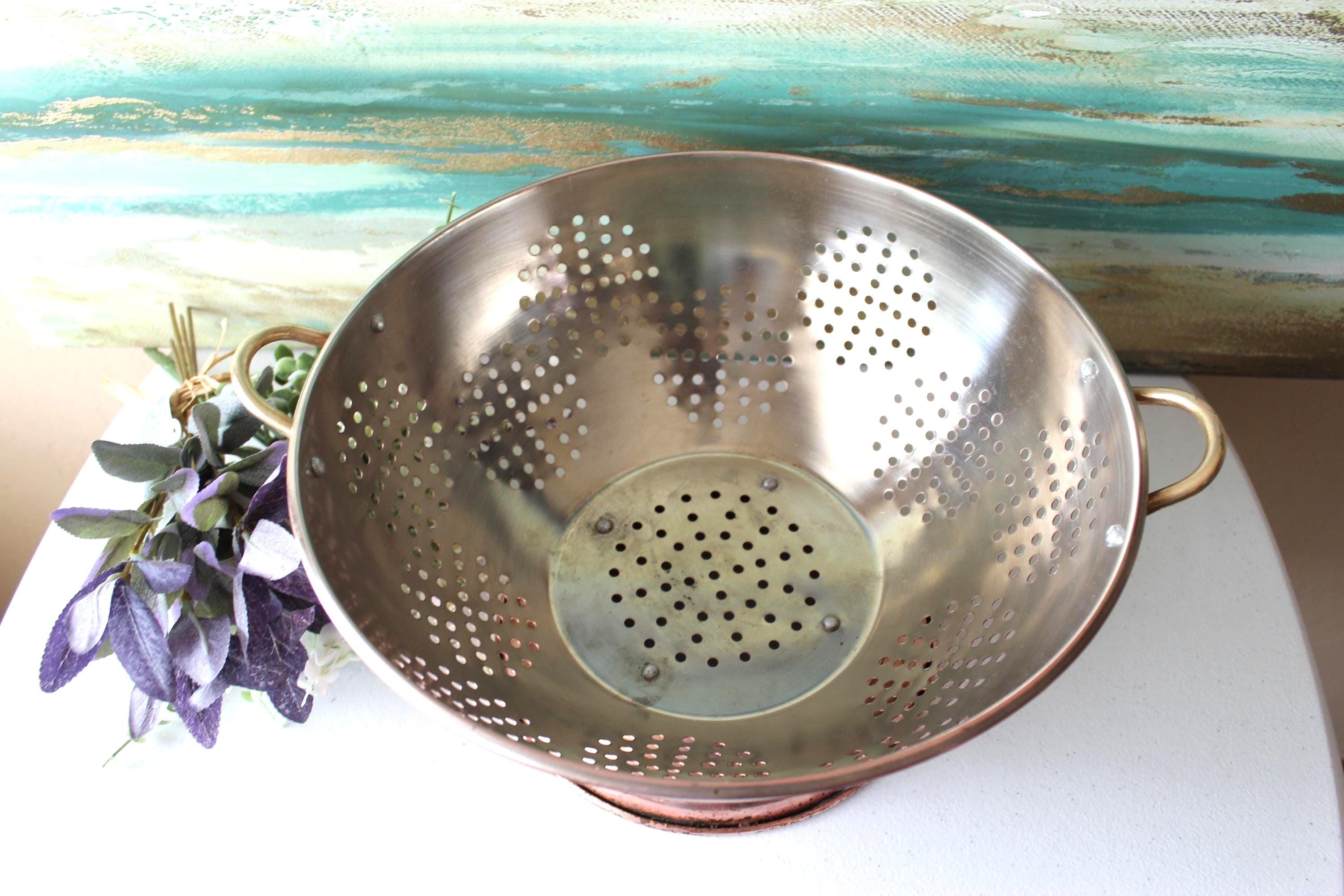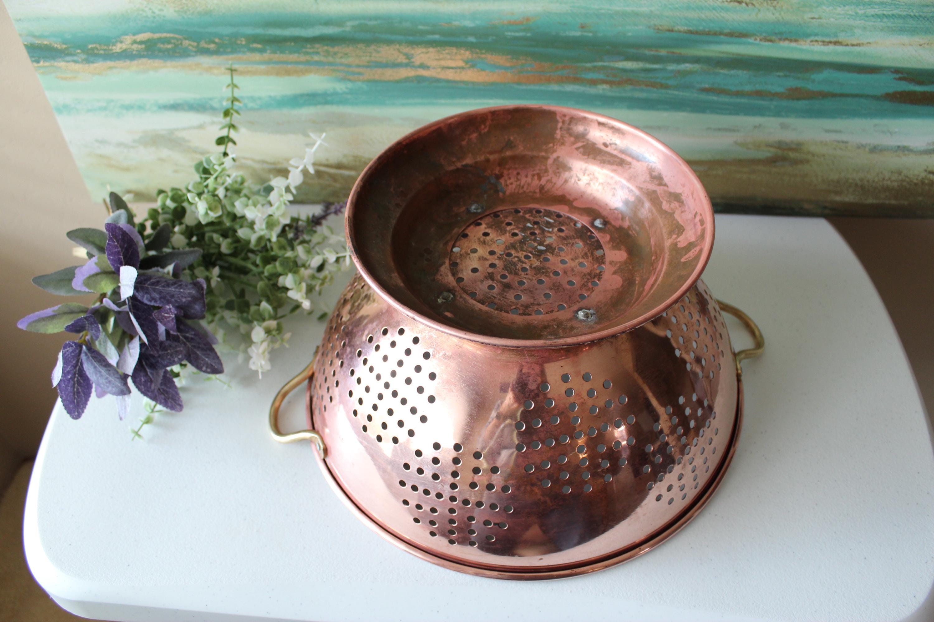 This is a large vintage copper colander WITH PATINA. Please review photos! It has a food grade stainless steel interior and has double brass handles which can also be used to hang this piece. It is a gorgeous addition to decor, but is fully functional and built to last decades. It is a hefty 2.25 lbs. It is a spacious 12 inches across and is 6.25 inches tall. The pedestal adds additional charm and visual interest, while providing stability. I am happy to answer any questions or take additional photos.