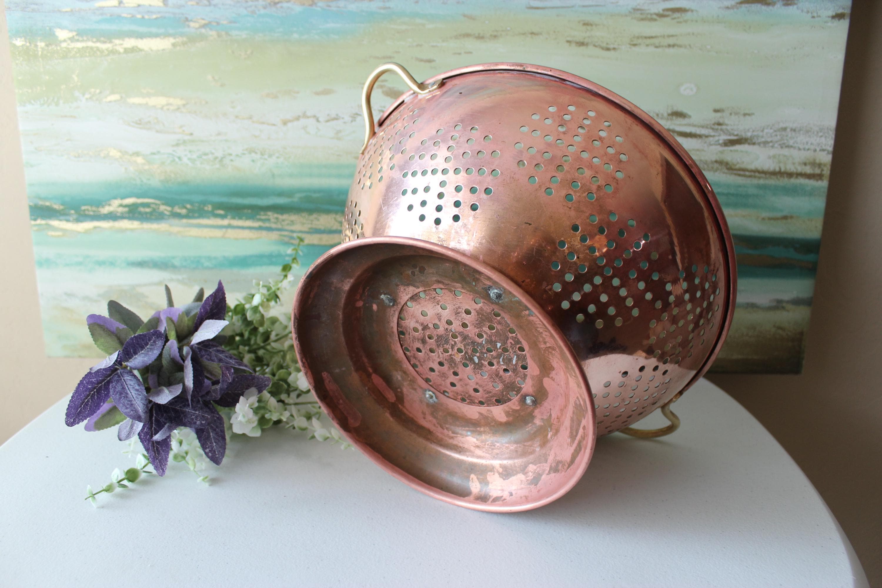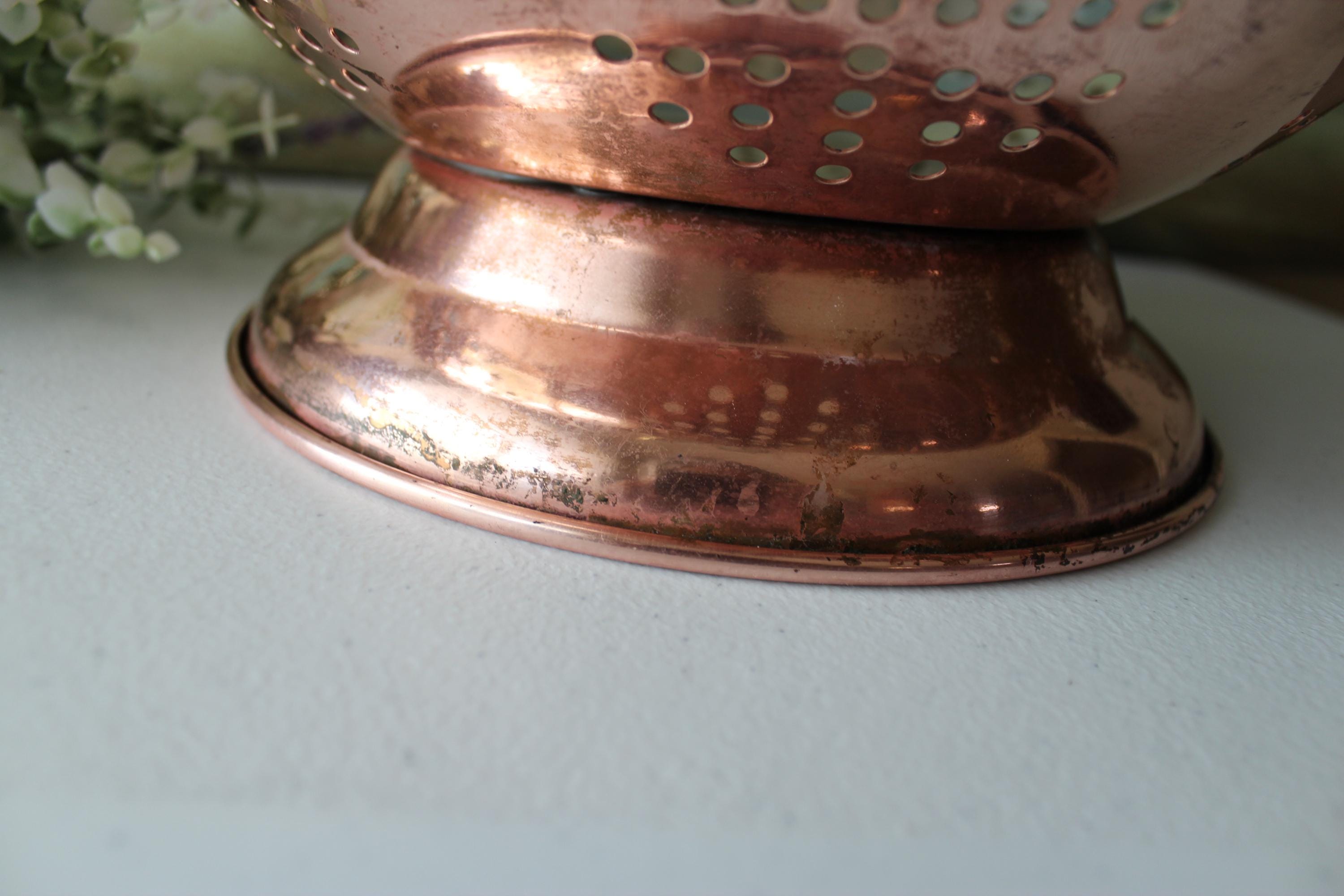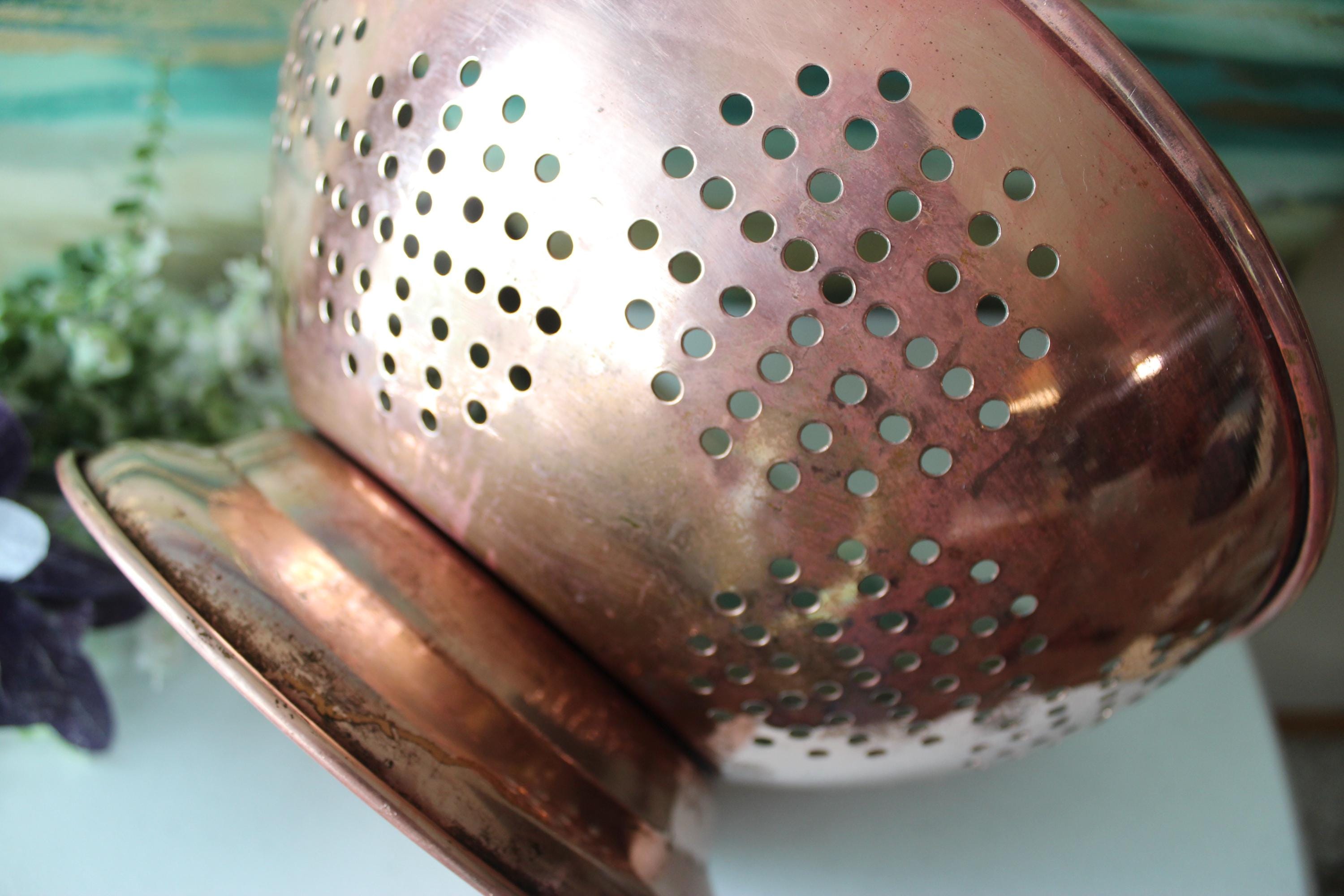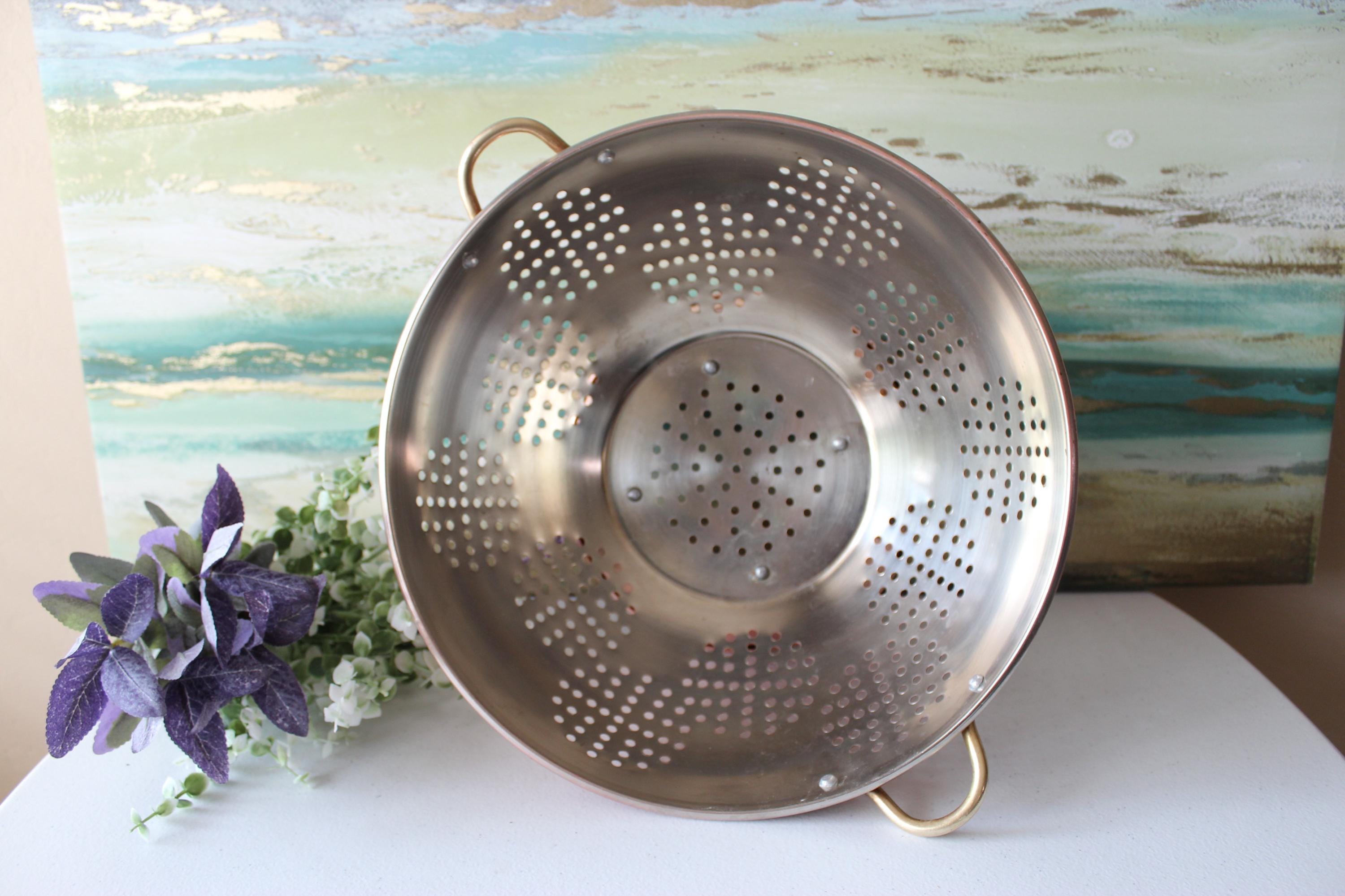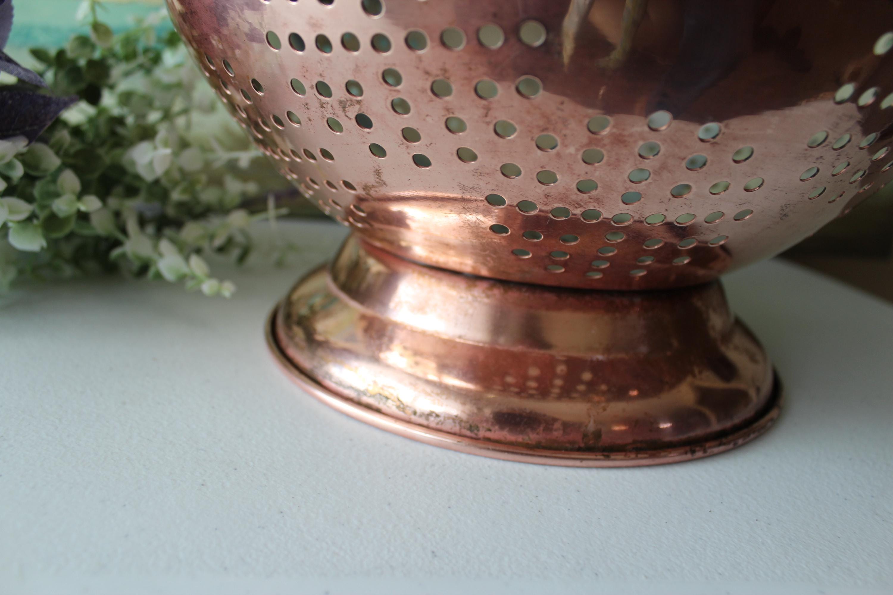 This is a large vintage copper colander WITH PATINA. Please review photos! It has a food grade stainless steel interior and has double brass handles which can also be used to hang this piece. It is a gorgeous addition to decor, but is fully functional and built to last decades. It is a hefty 2.25 lbs. It is a spacious 12 inches across and is 6.25 inches tall. The pedestal adds additional charm and visual interest, while providing stability. I am happy to answer any questions or take additional photos.