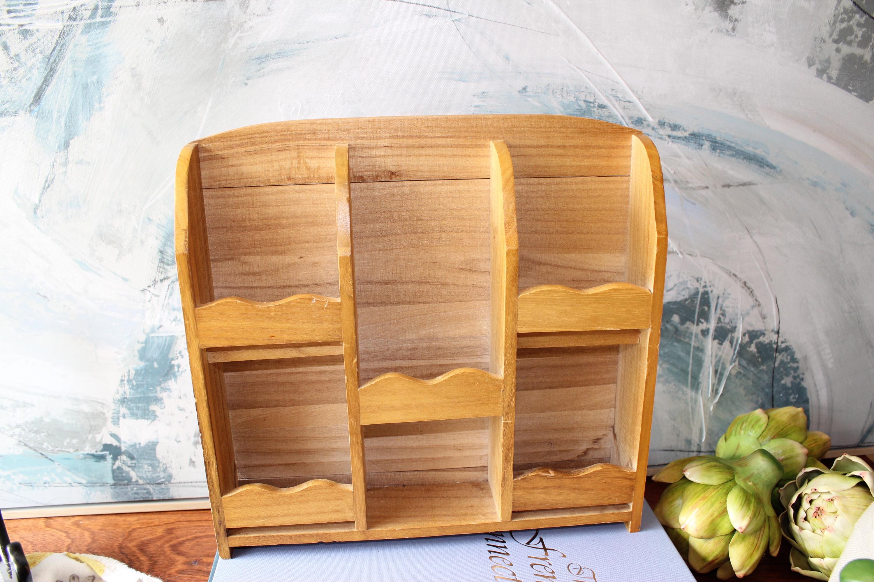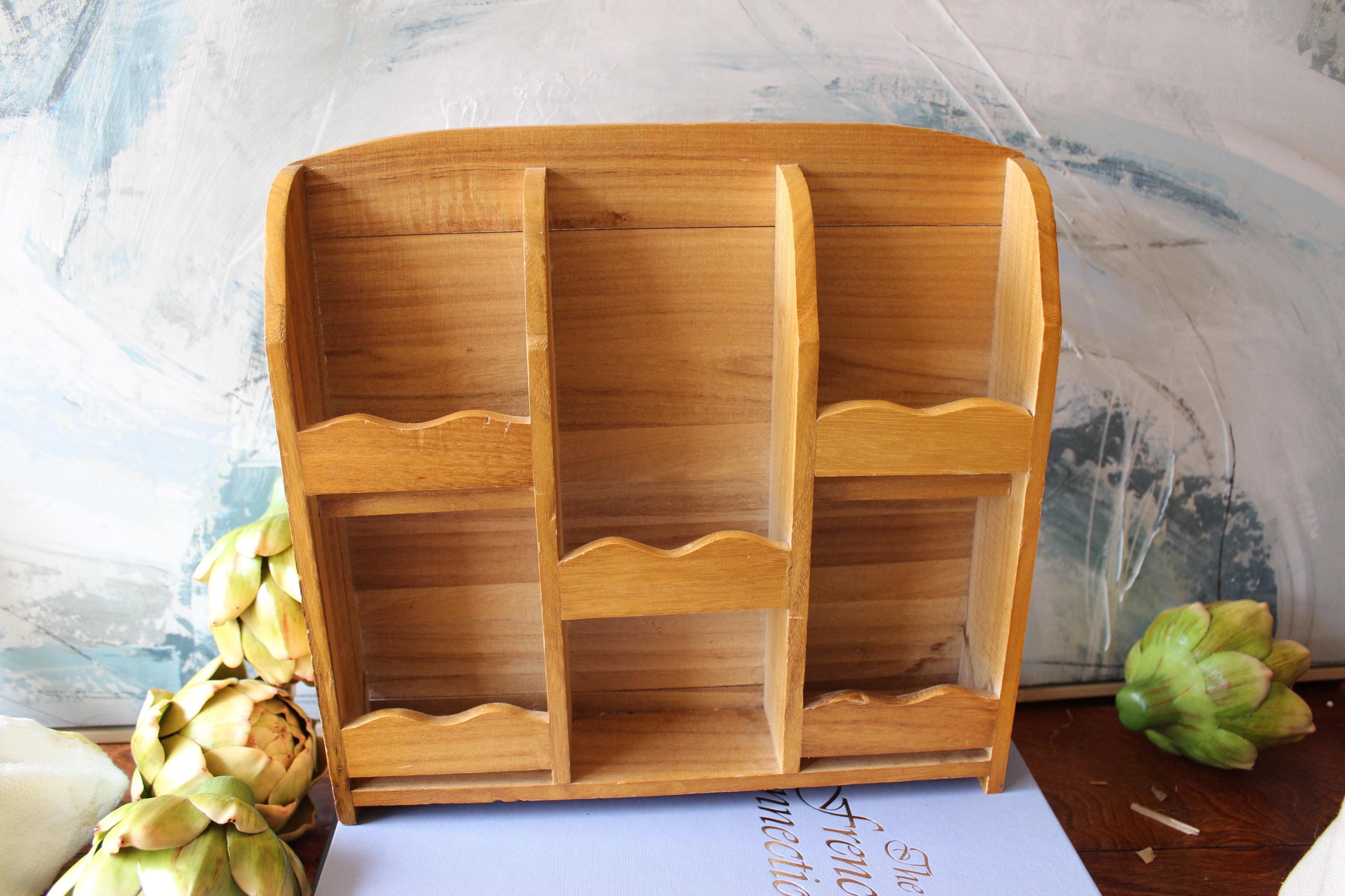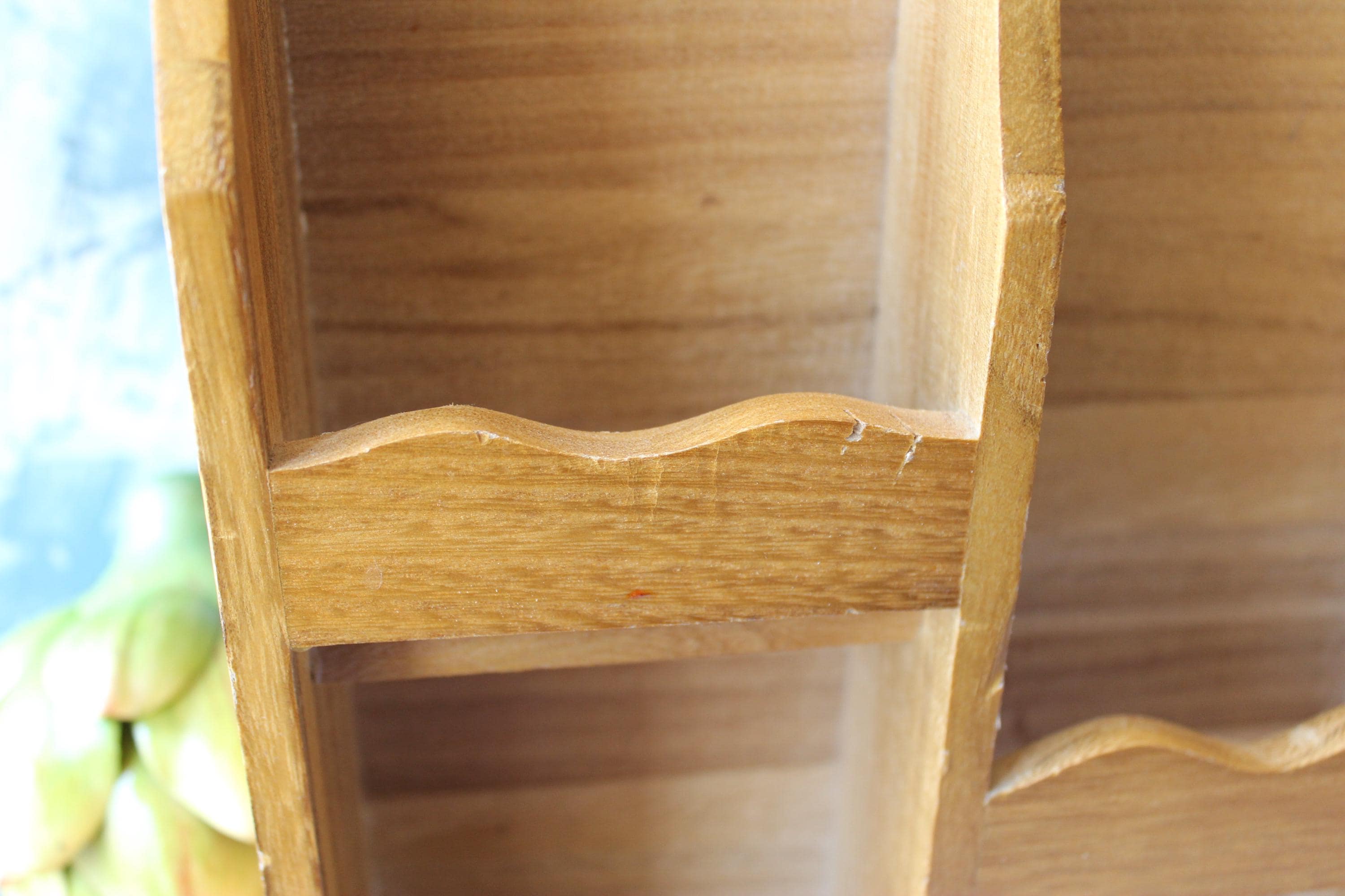 Very cute, versatile vintage spice rack. Please review all photos. Has scalloped rim and five different sections. The center one is the full height of the piece as you can see from the photos. It is in really nice vintage condition. 11 inches tall, 11.5 inches wide, and 2.25 inches deep. The inside sections measure 1 5/8 inches deep and 3.25 inches wide. It is meant to be stood on a counter, but could be hung (you will need to add hardware). It is a light wood with expected wear for age. If you want additional photos please message me I am happy to do so.