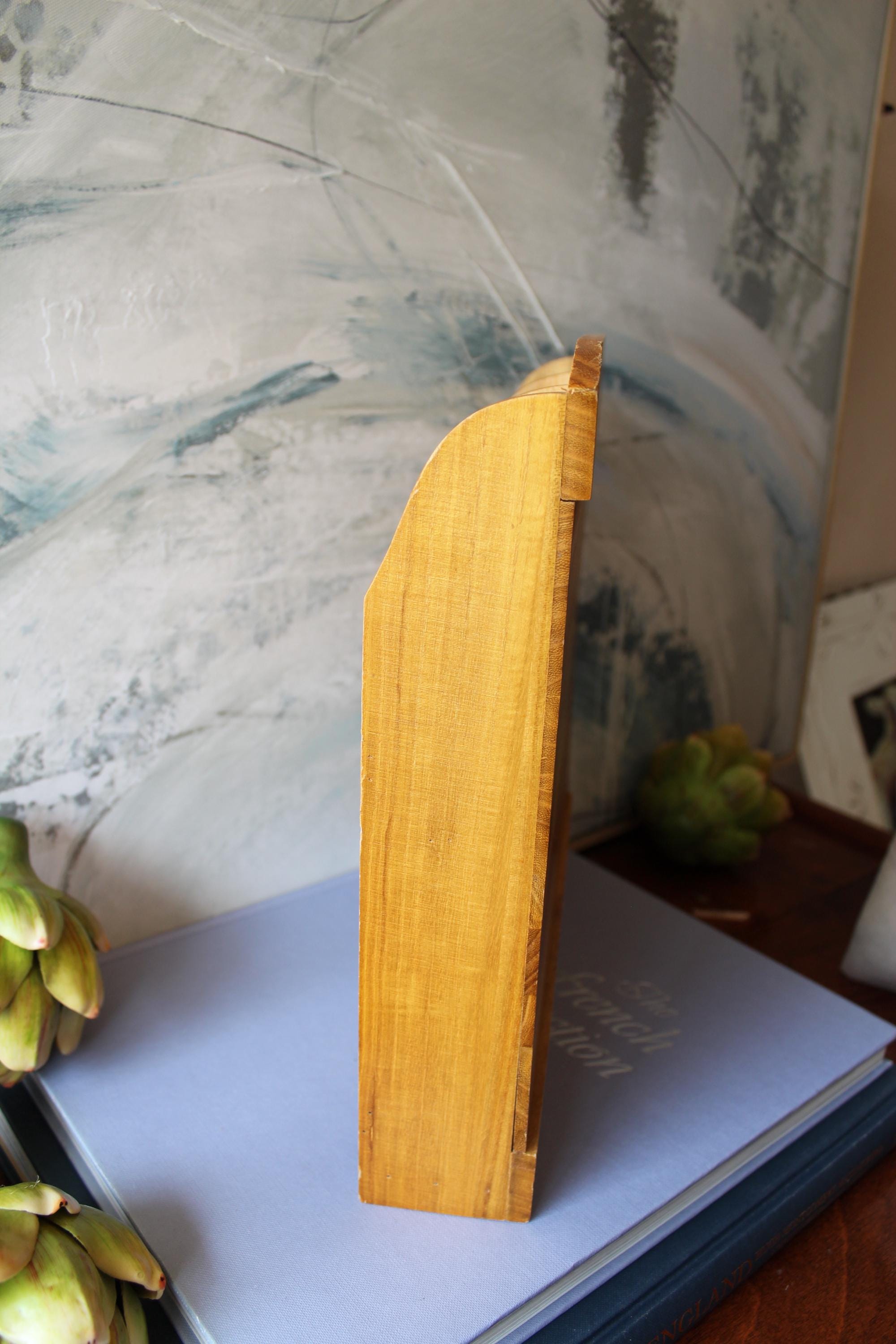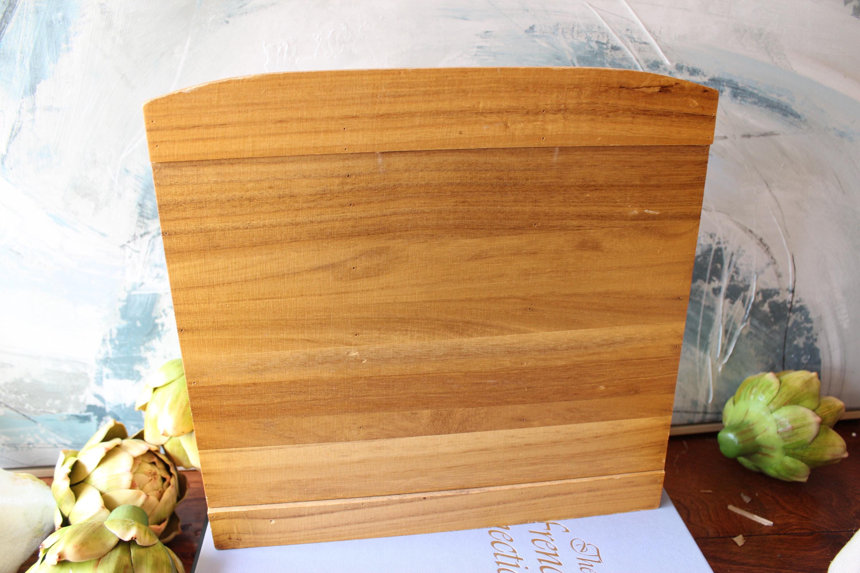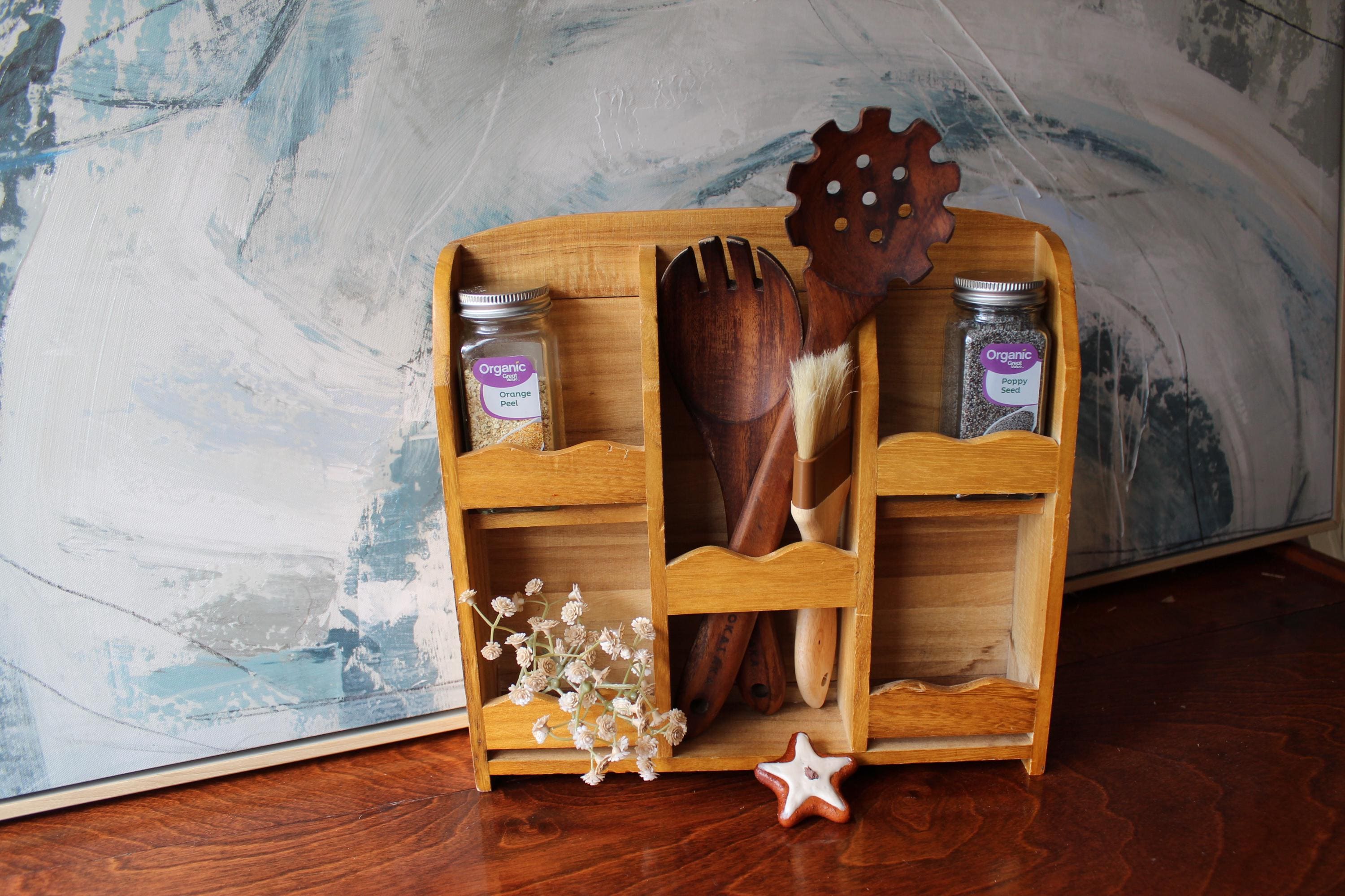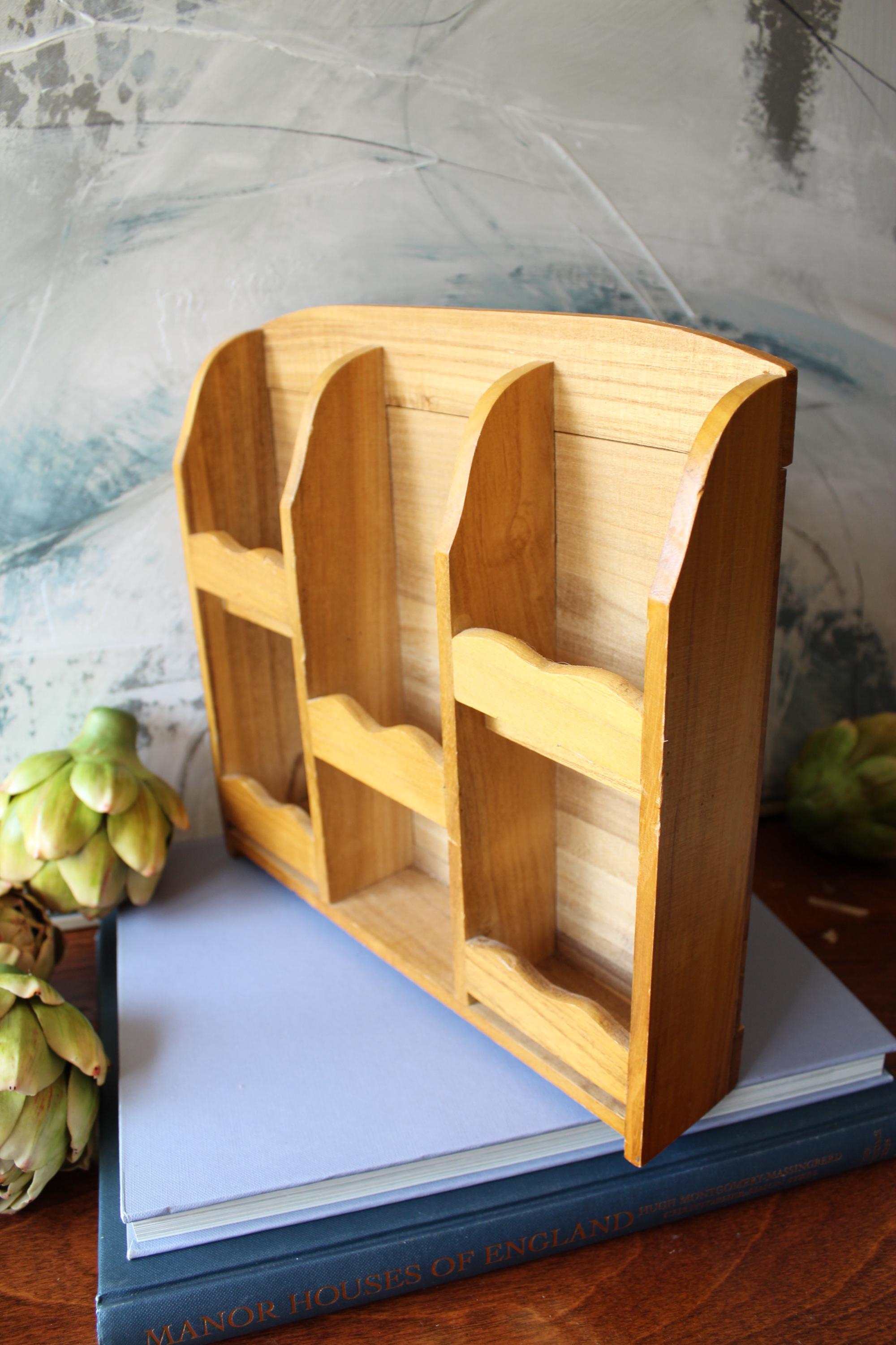 Very cute, versatile vintage spice rack. Please review all photos. Has scalloped rim and five different sections. The center one is the full height of the piece as you can see from the photos. It is in really nice vintage condition. 11 inches tall, 11.5 inches wide, and 2.25 inches deep. The inside sections measure 1 5/8 inches deep and 3.25 inches wide. It is meant to be stood on a counter, but could be hung (you will need to add hardware). It is a light wood with expected wear for age. If you want additional photos please message me I am happy to do so.