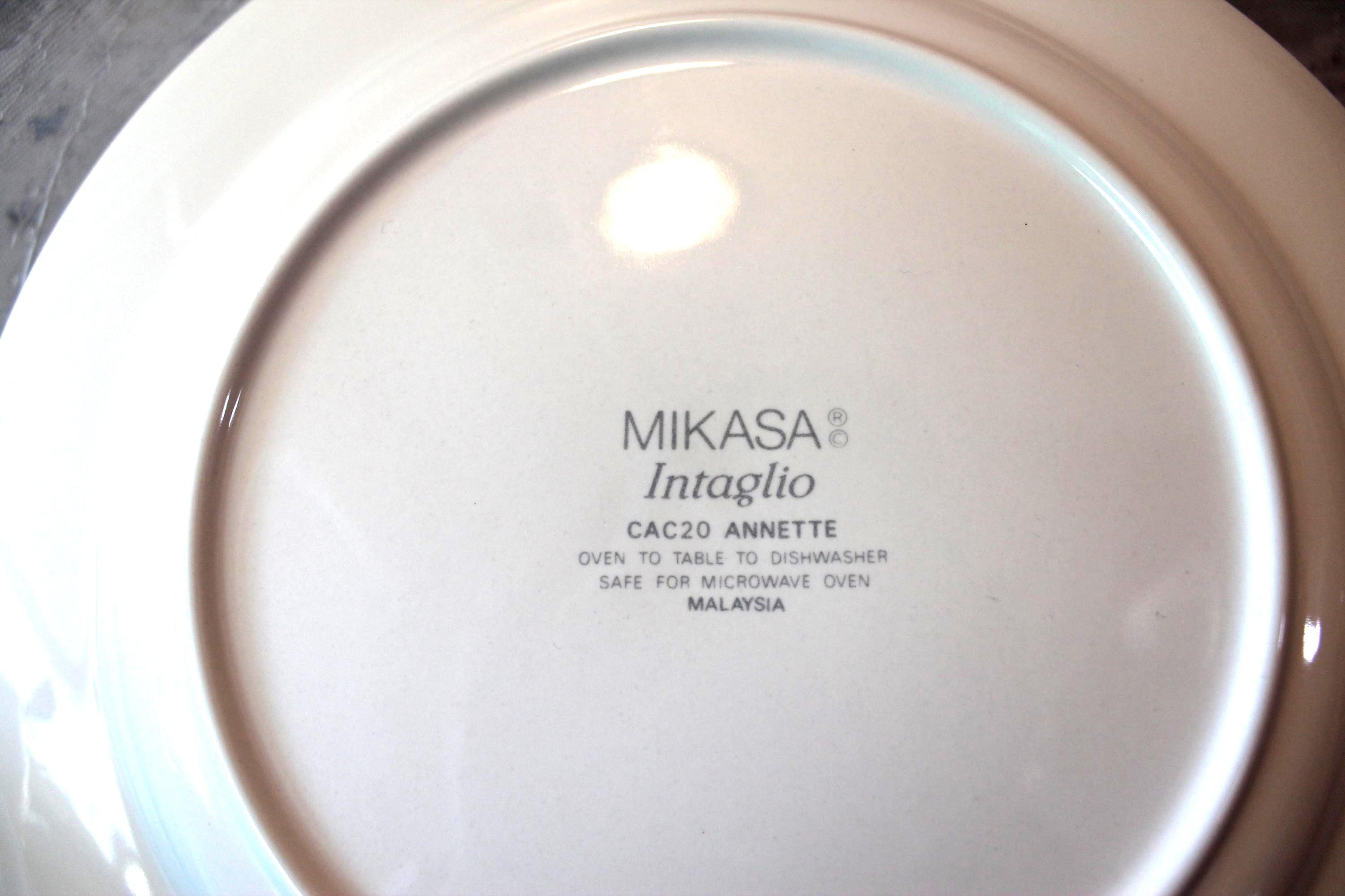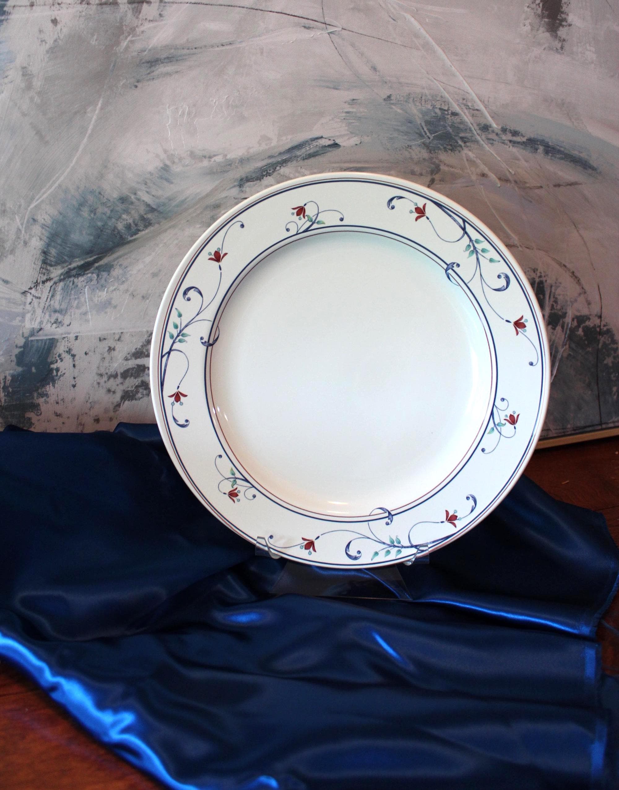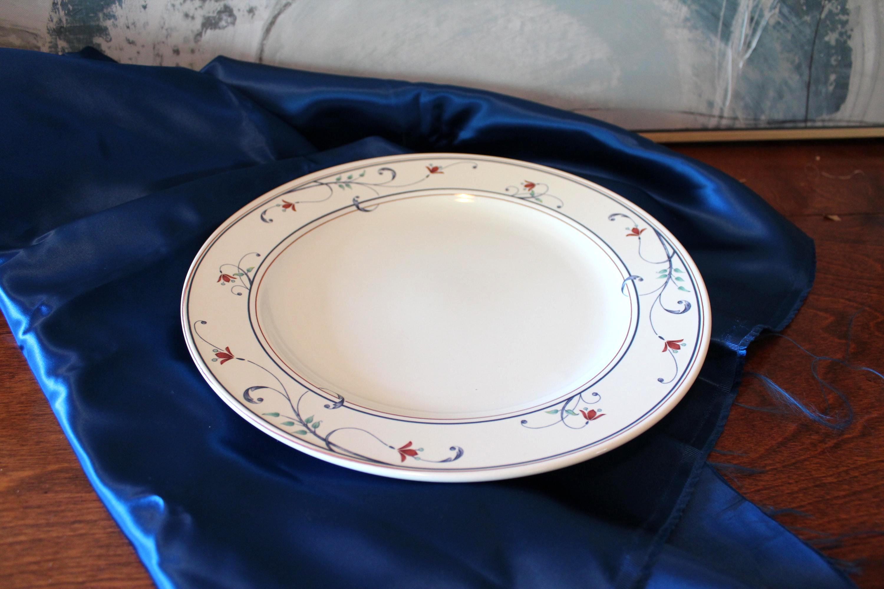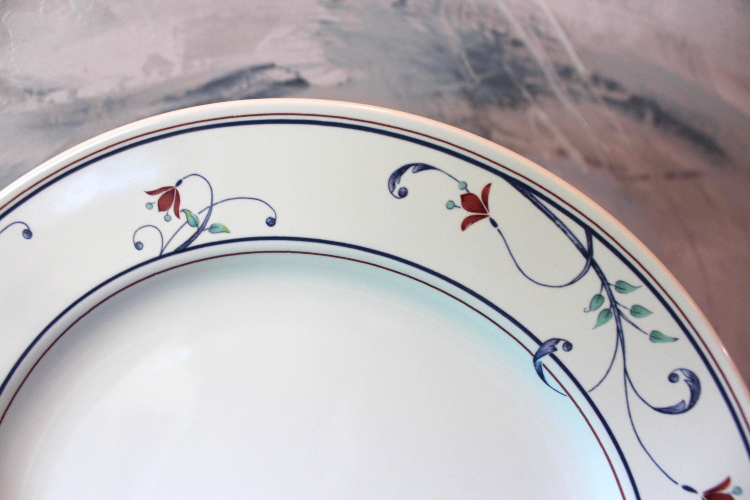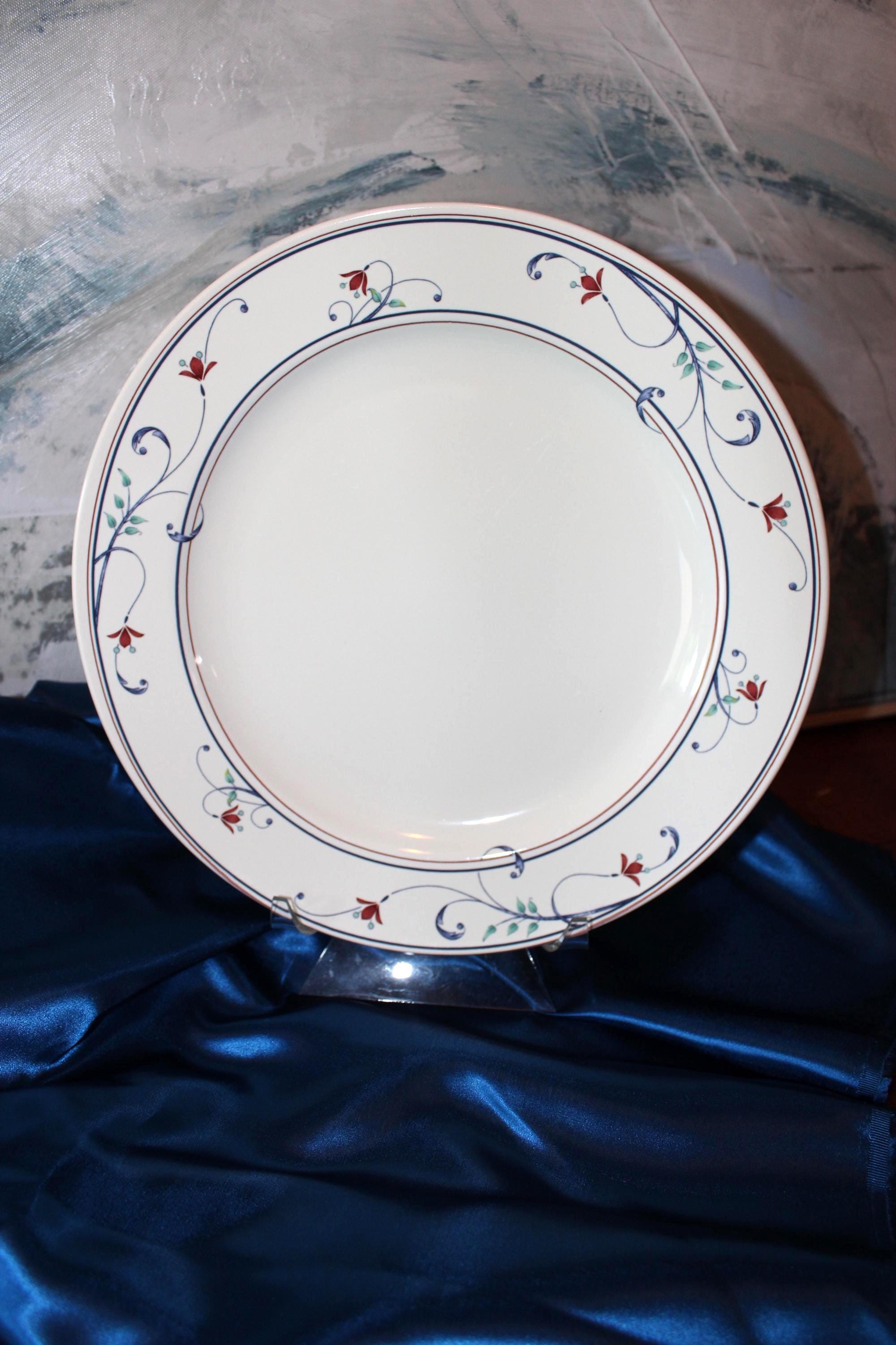 This is a gorgeous large dinner plate by Mikasa, part of the Annette stoneware collection. It has the fine quality Mikasa is distinguished for, and the Annette pattern is both pretty and versatile with red and blue floral and vine design on white backdrop. It is in pristine pre-owned condition. This is practical as well as beautiful for your table setting. It is dishwasher, microwave and oven safe. It measures 11 1/8 inches in diameter.
